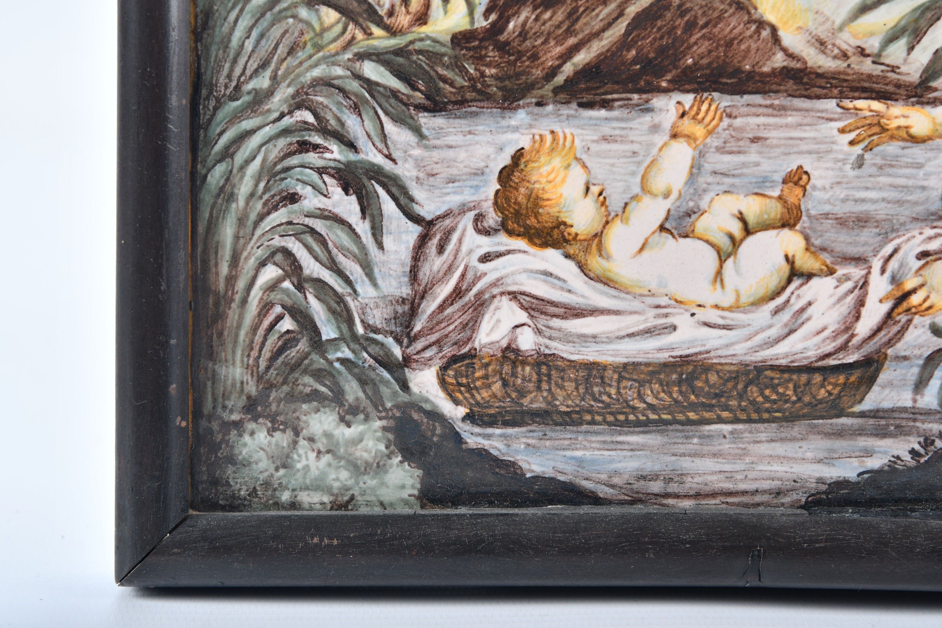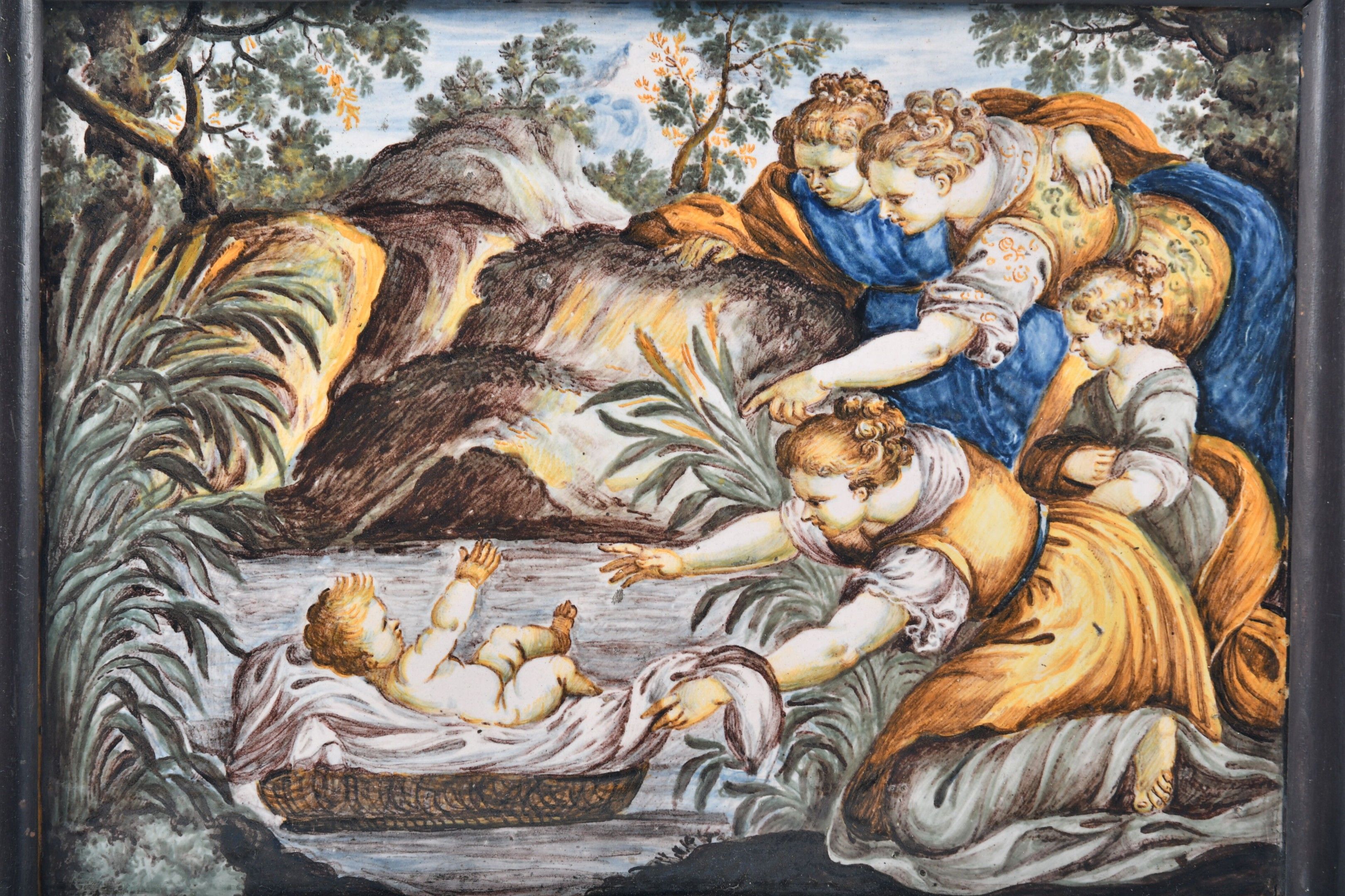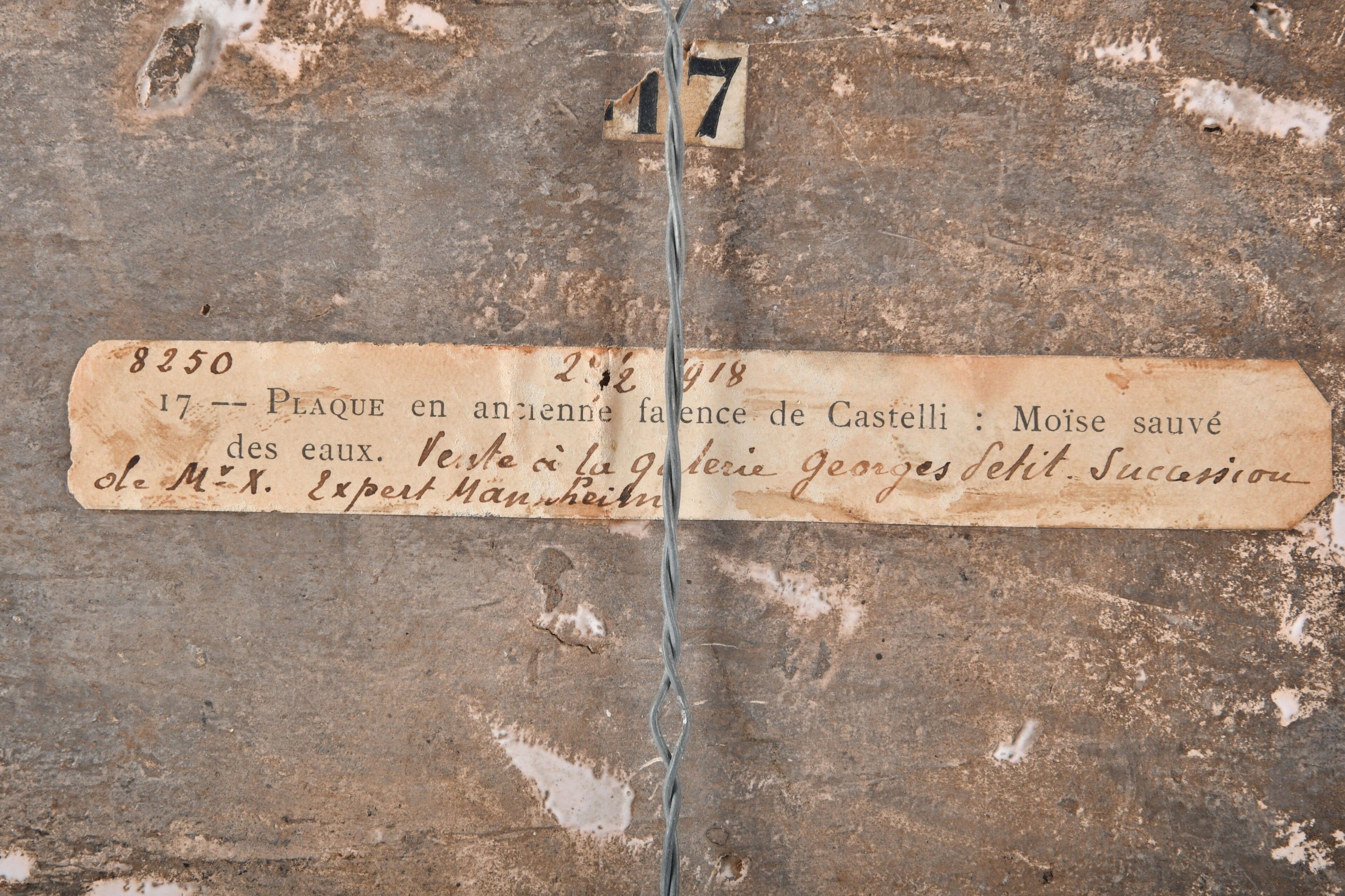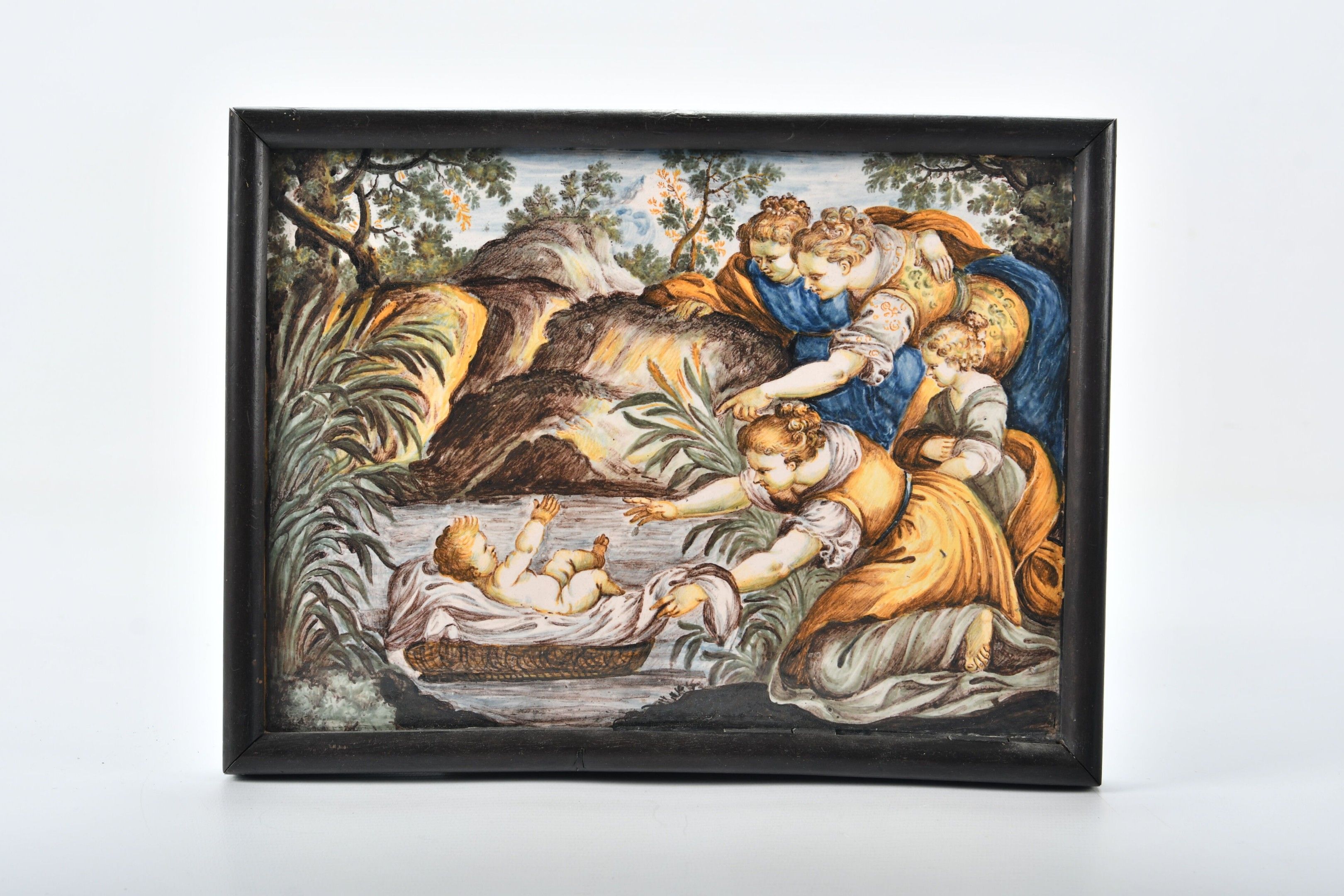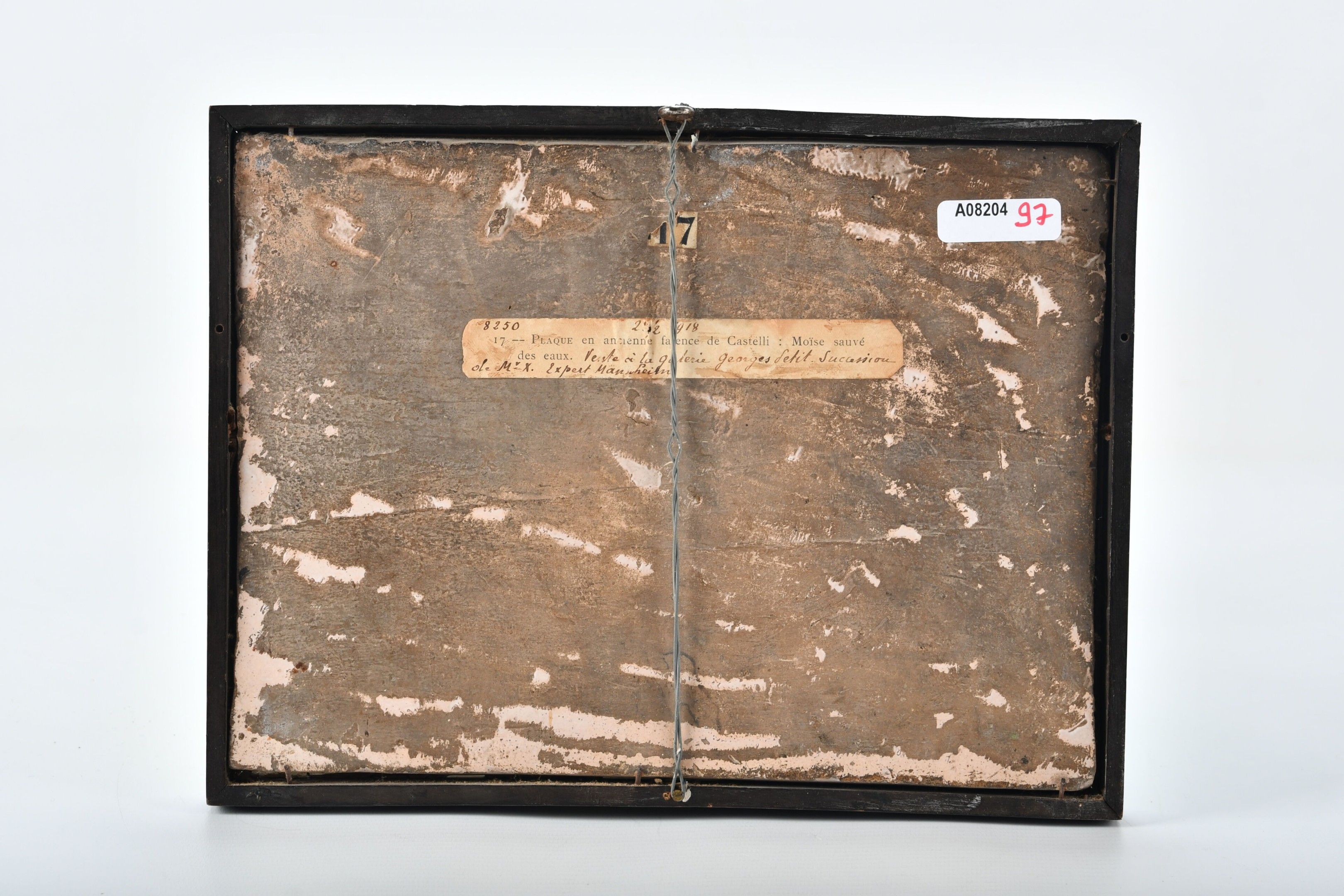 ITALY, CASTELLI. Rectangular earthenware plate with polychrome decoration depicting Moses saved from the waters.