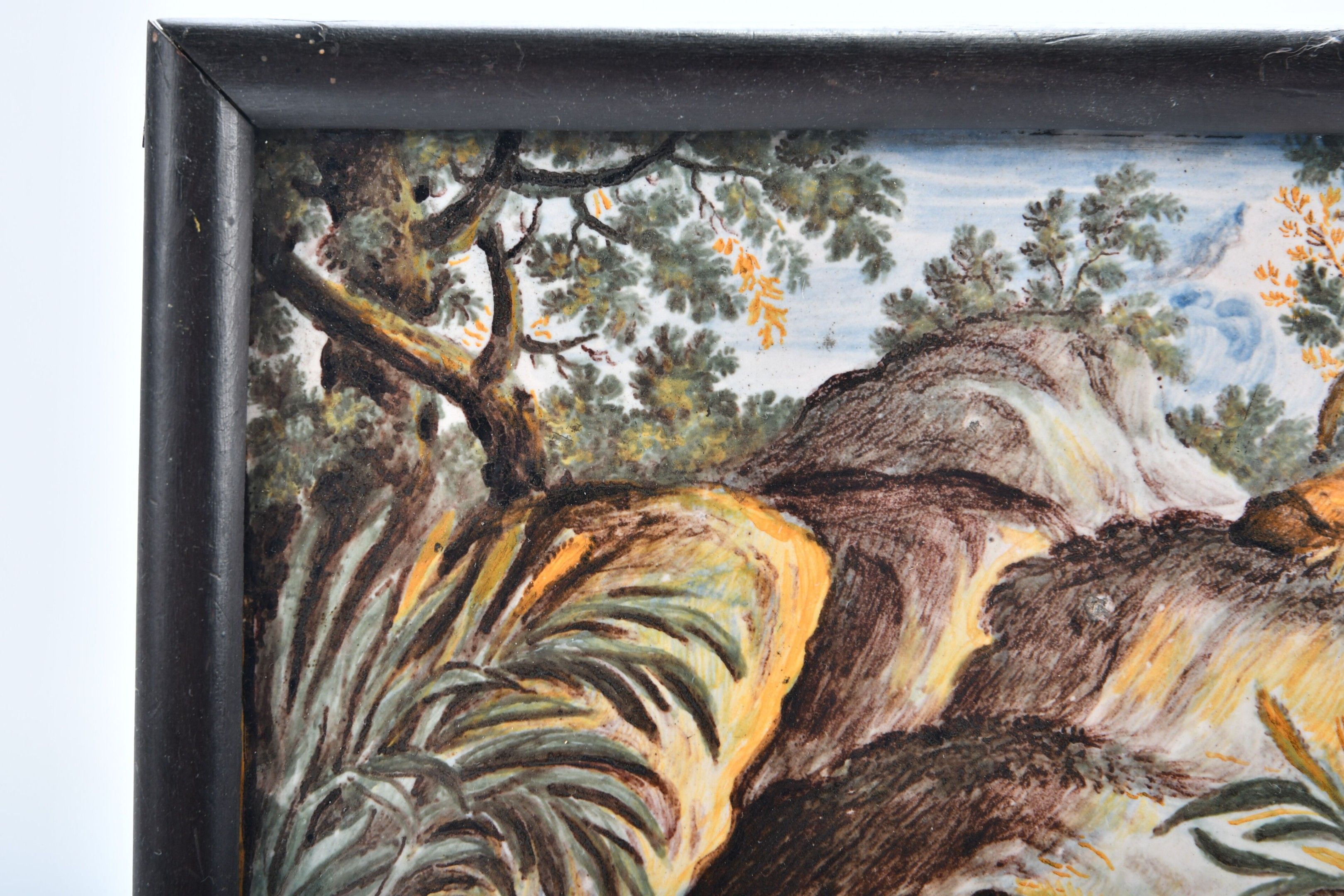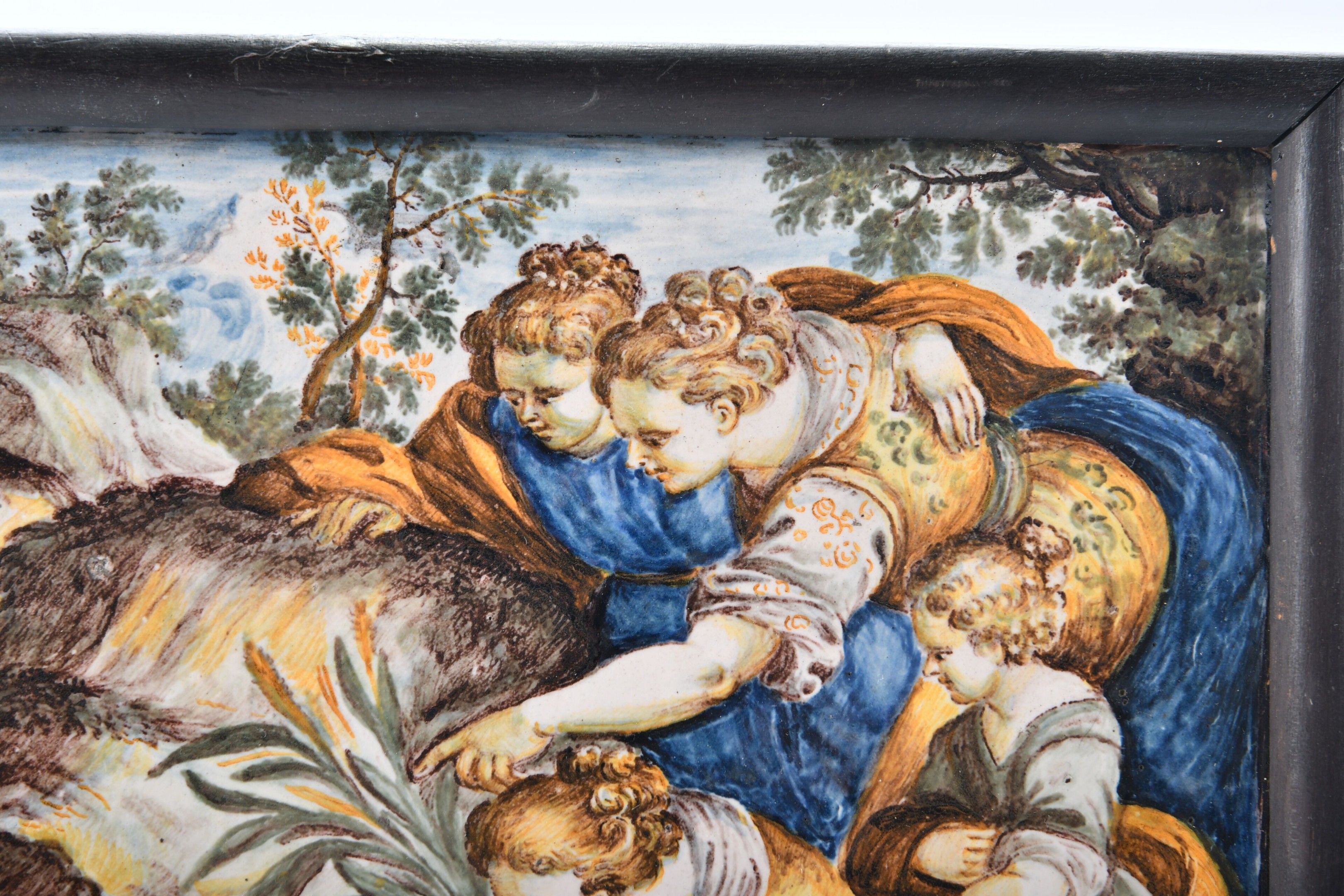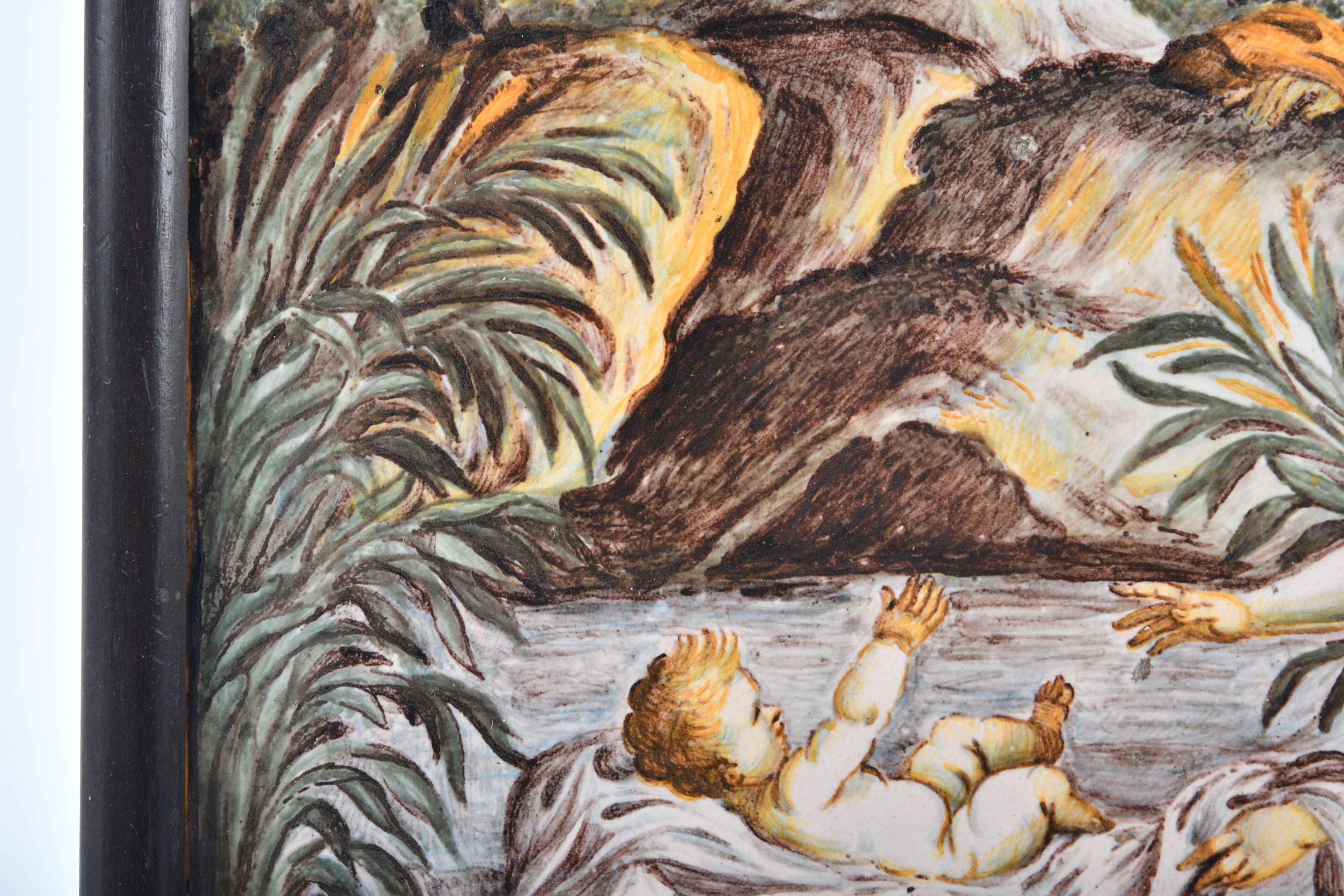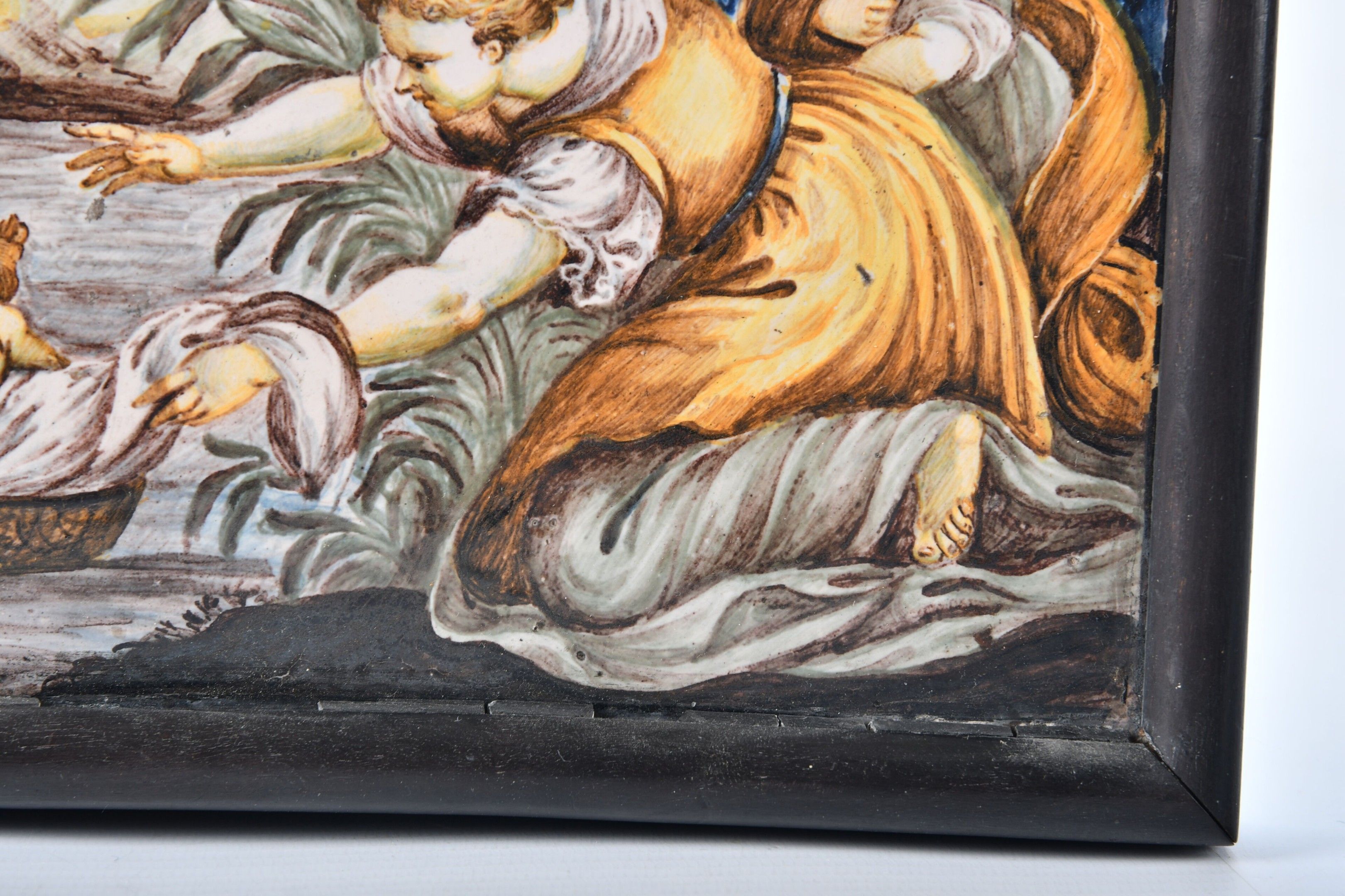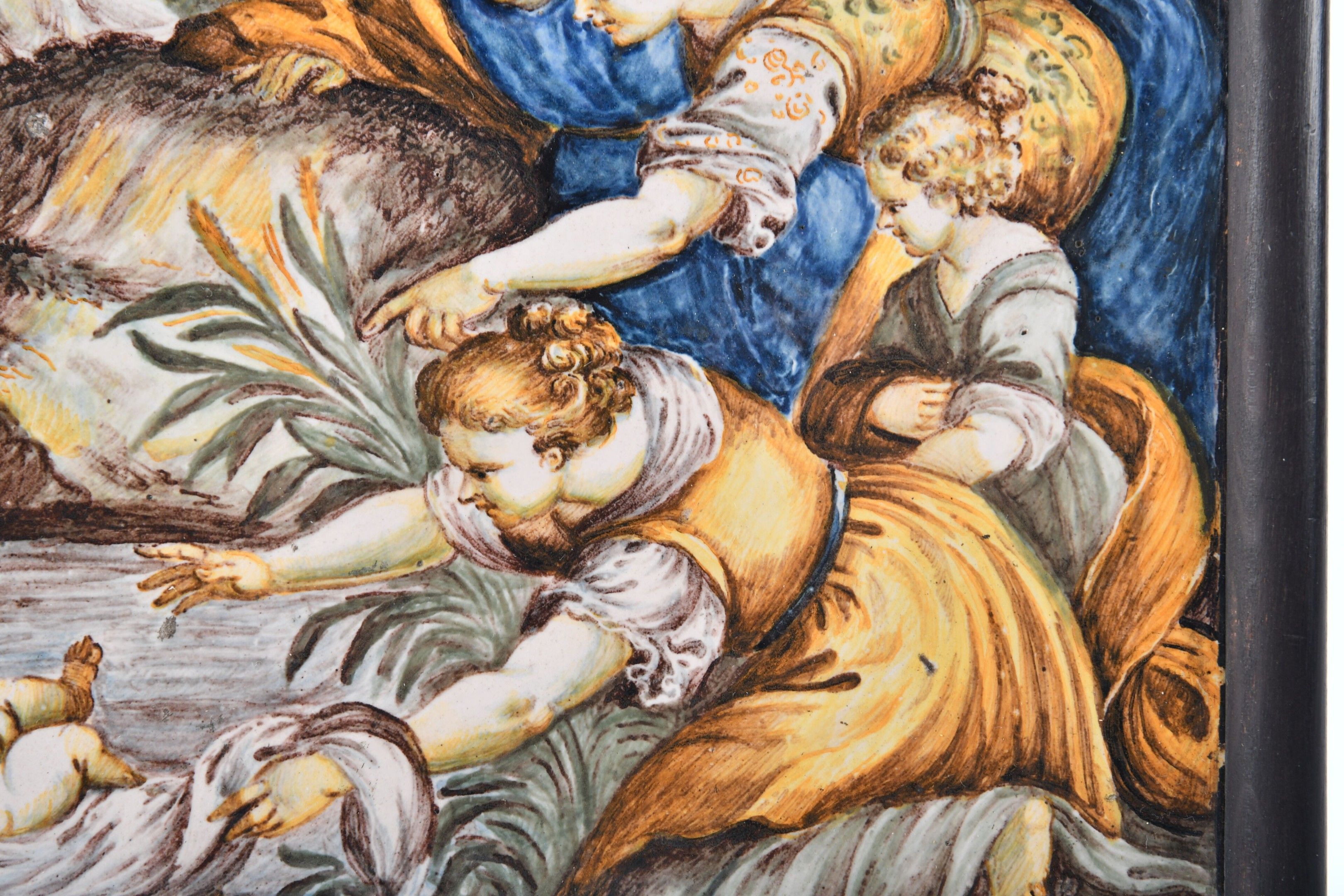 ITALY, CASTELLI. Rectangular earthenware plate with polychrome decoration depicting Moses saved from the waters.