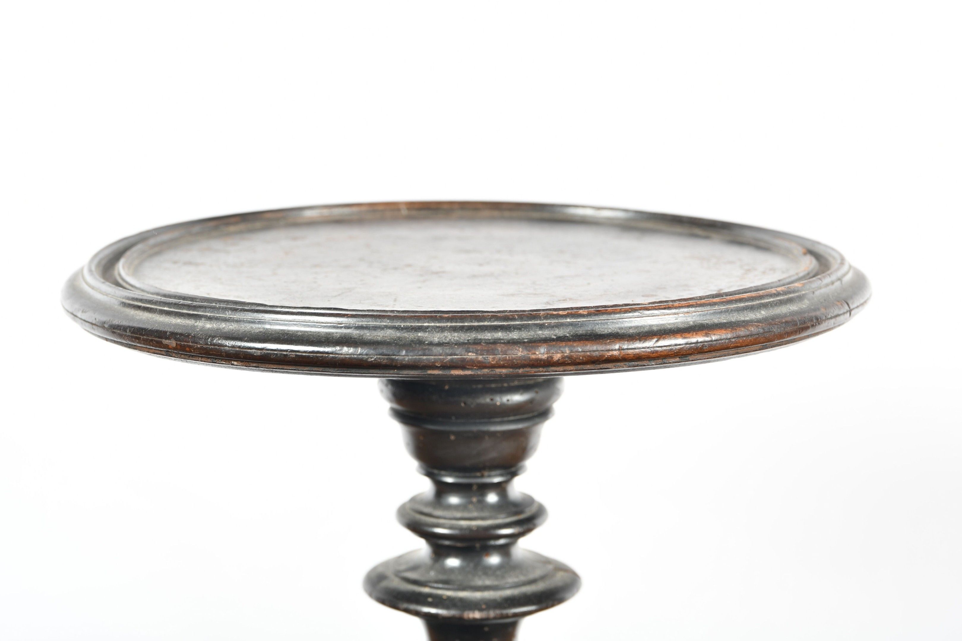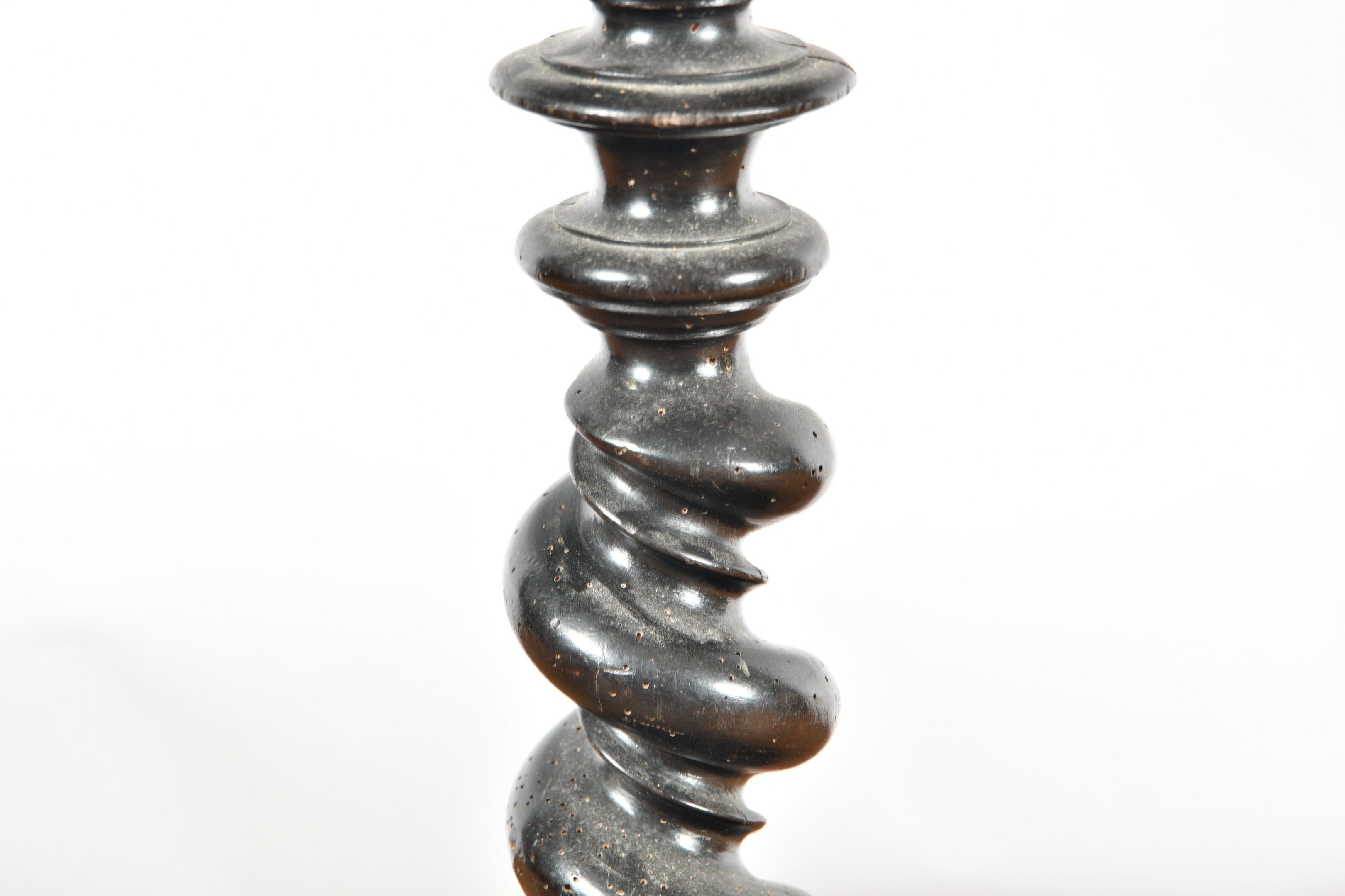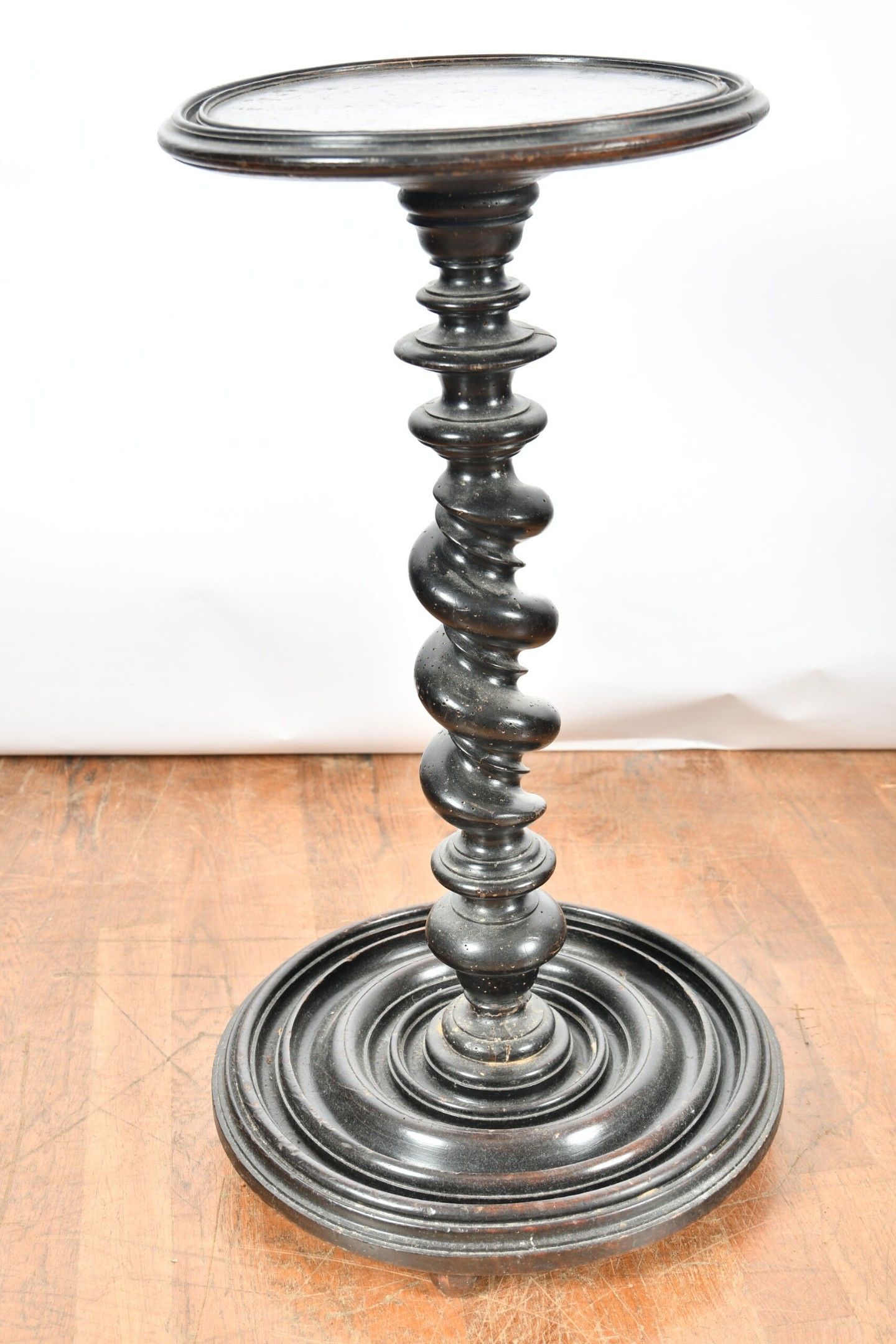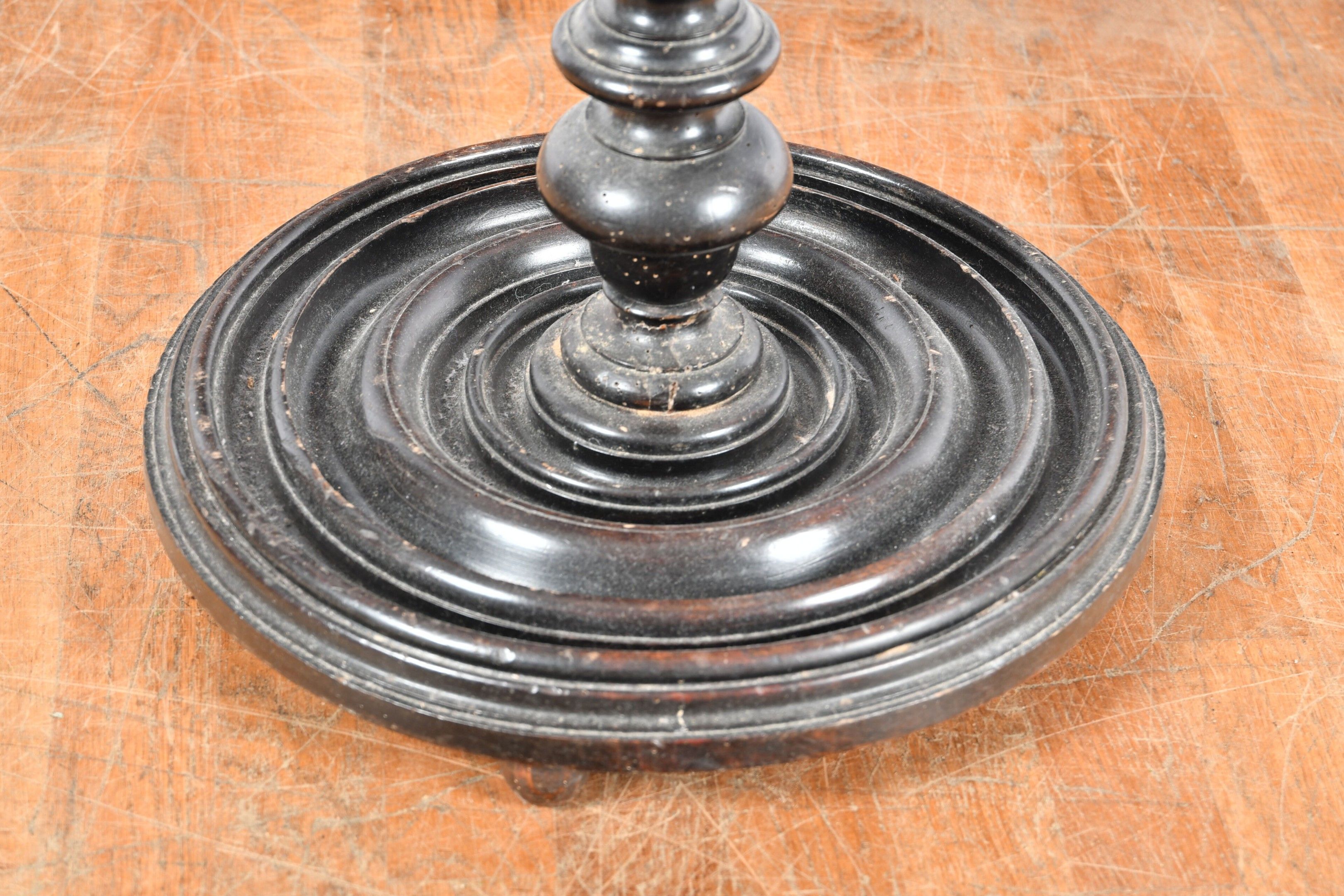 Circular wig stand with twisted shaft and moulded base, blackened wood. 17th century period. Height 77 cm. Wear and worm damage