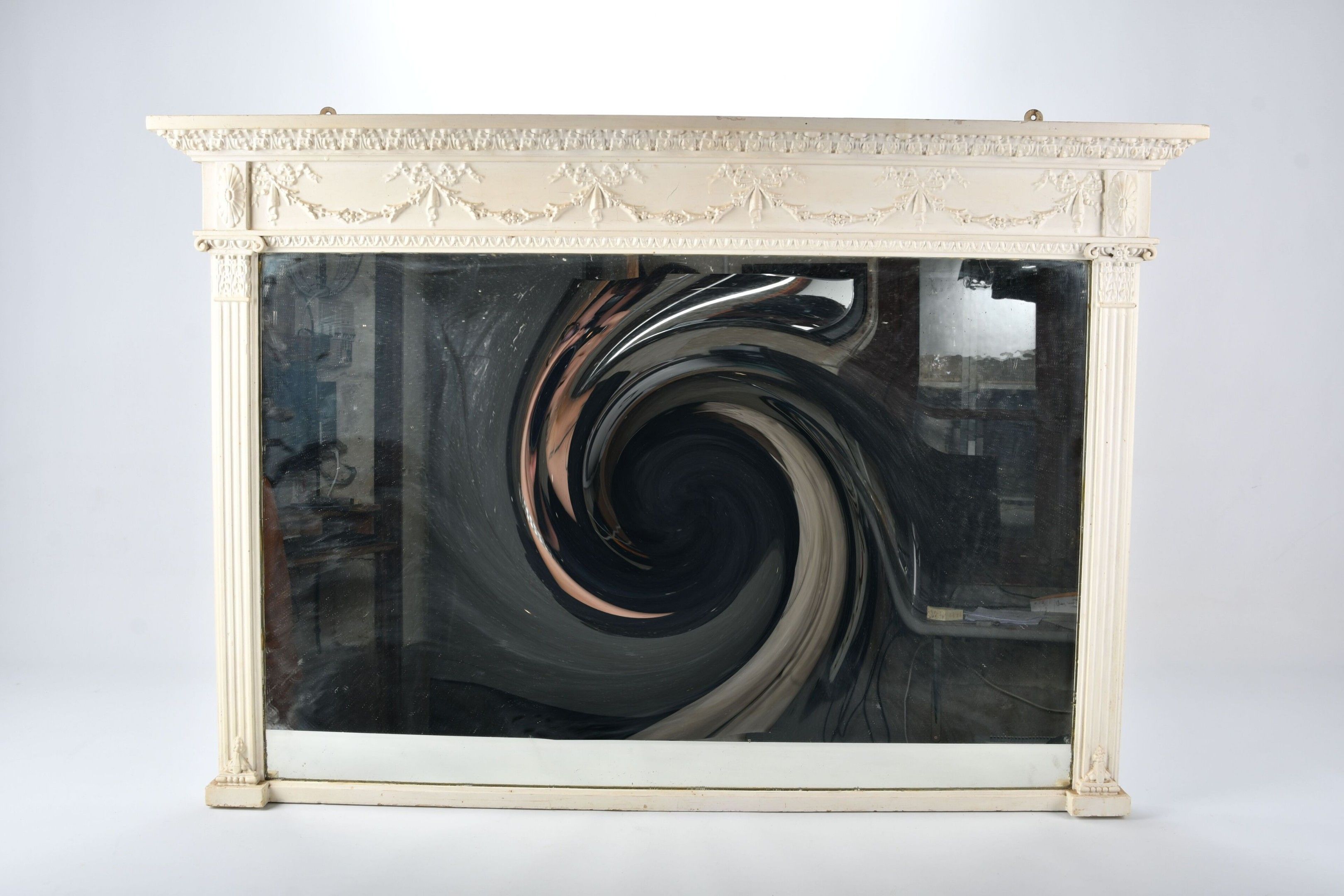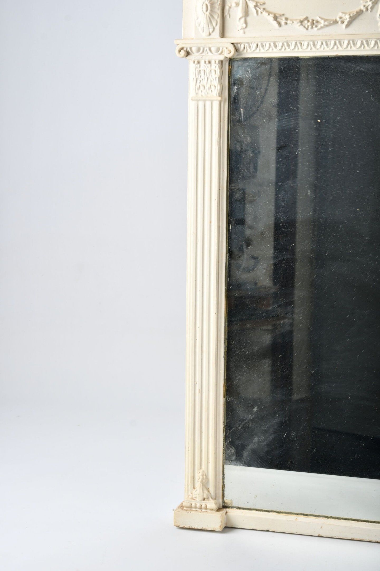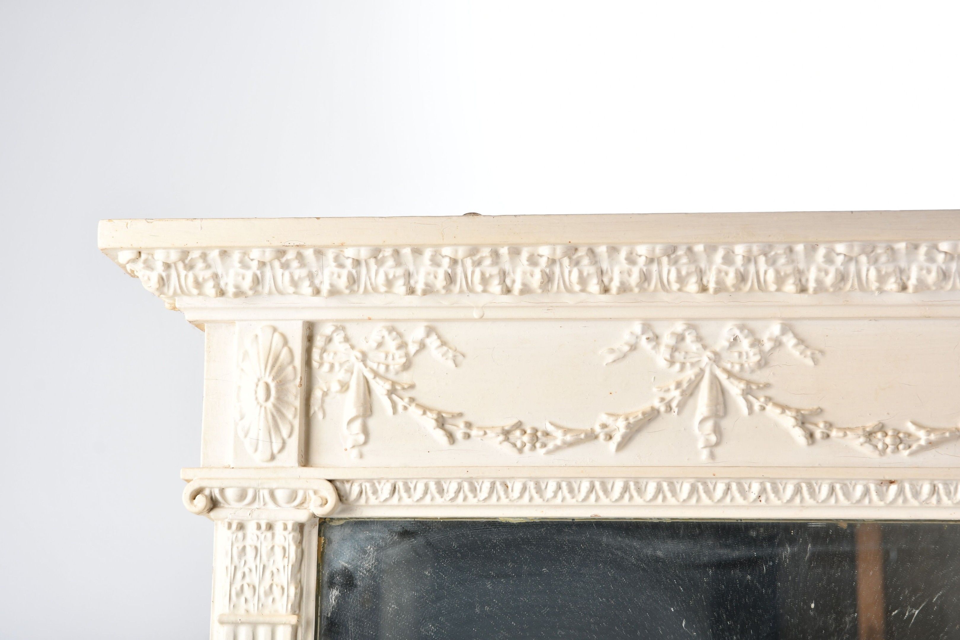 A white lacquered and carved wooden TRUMEAU decorated with a frieze of plants linked by ribbon bows. Pilaster feet. Louis XVI style; late 19th century. 82 x 118 cm. Re-lacquered