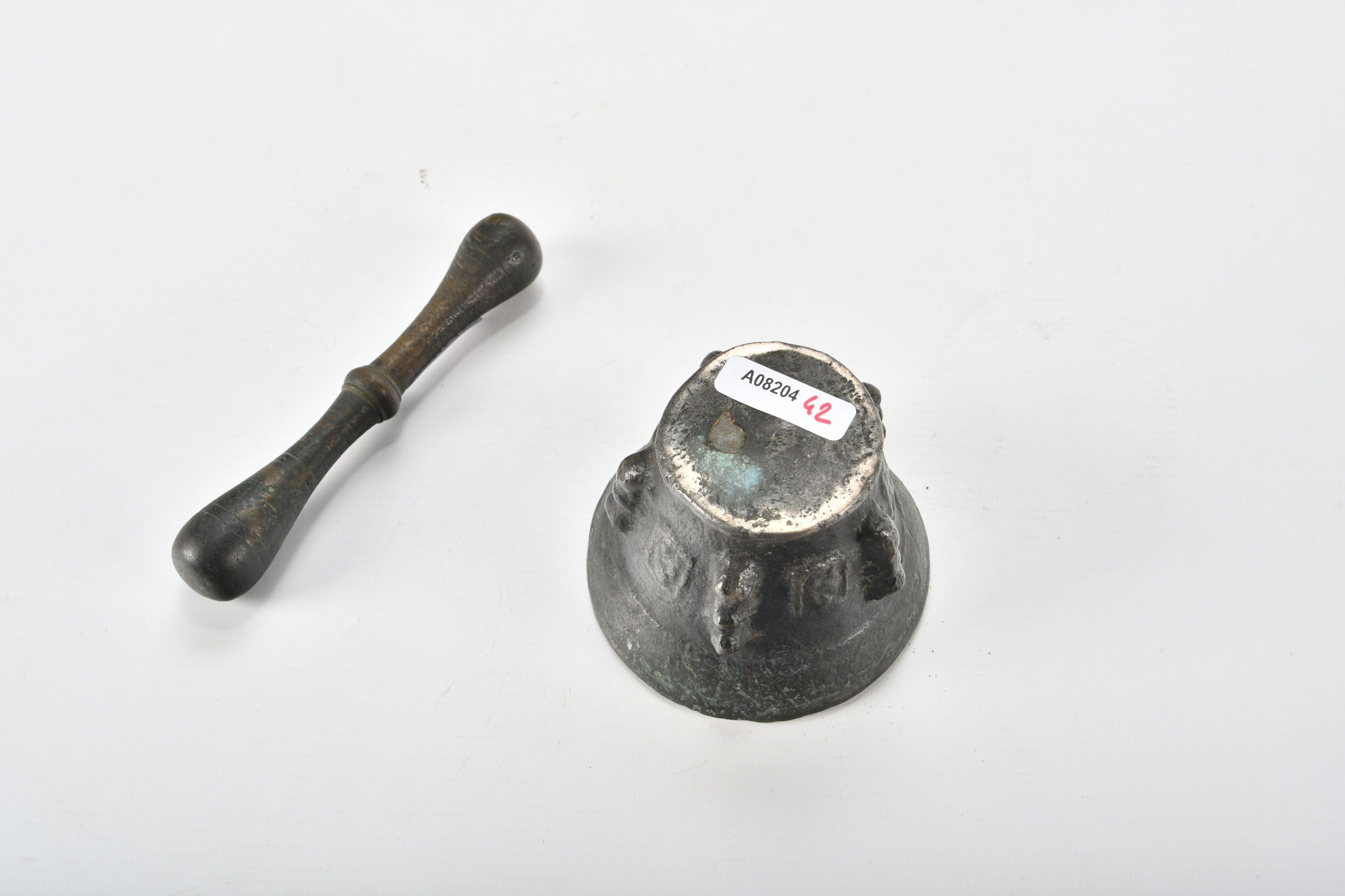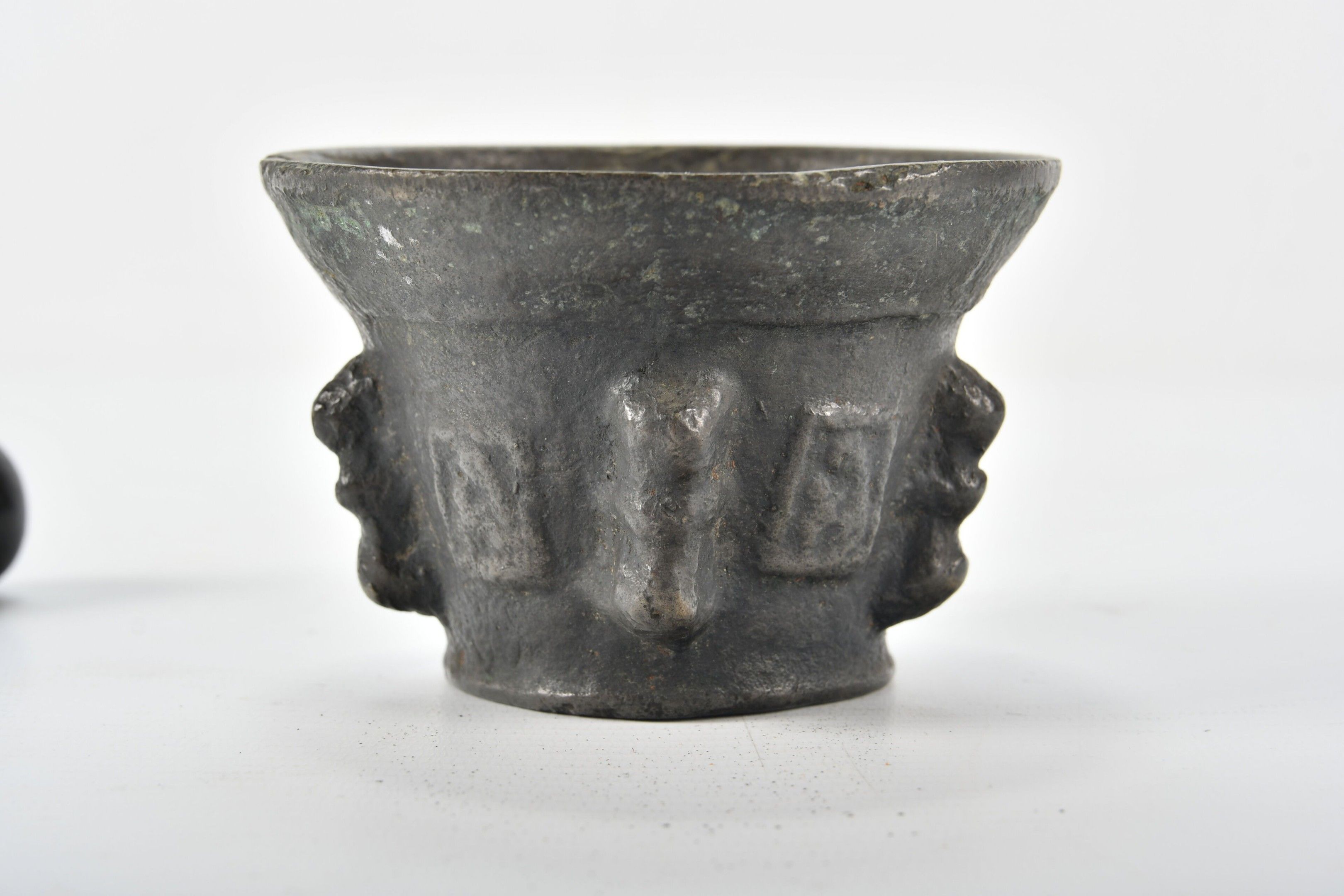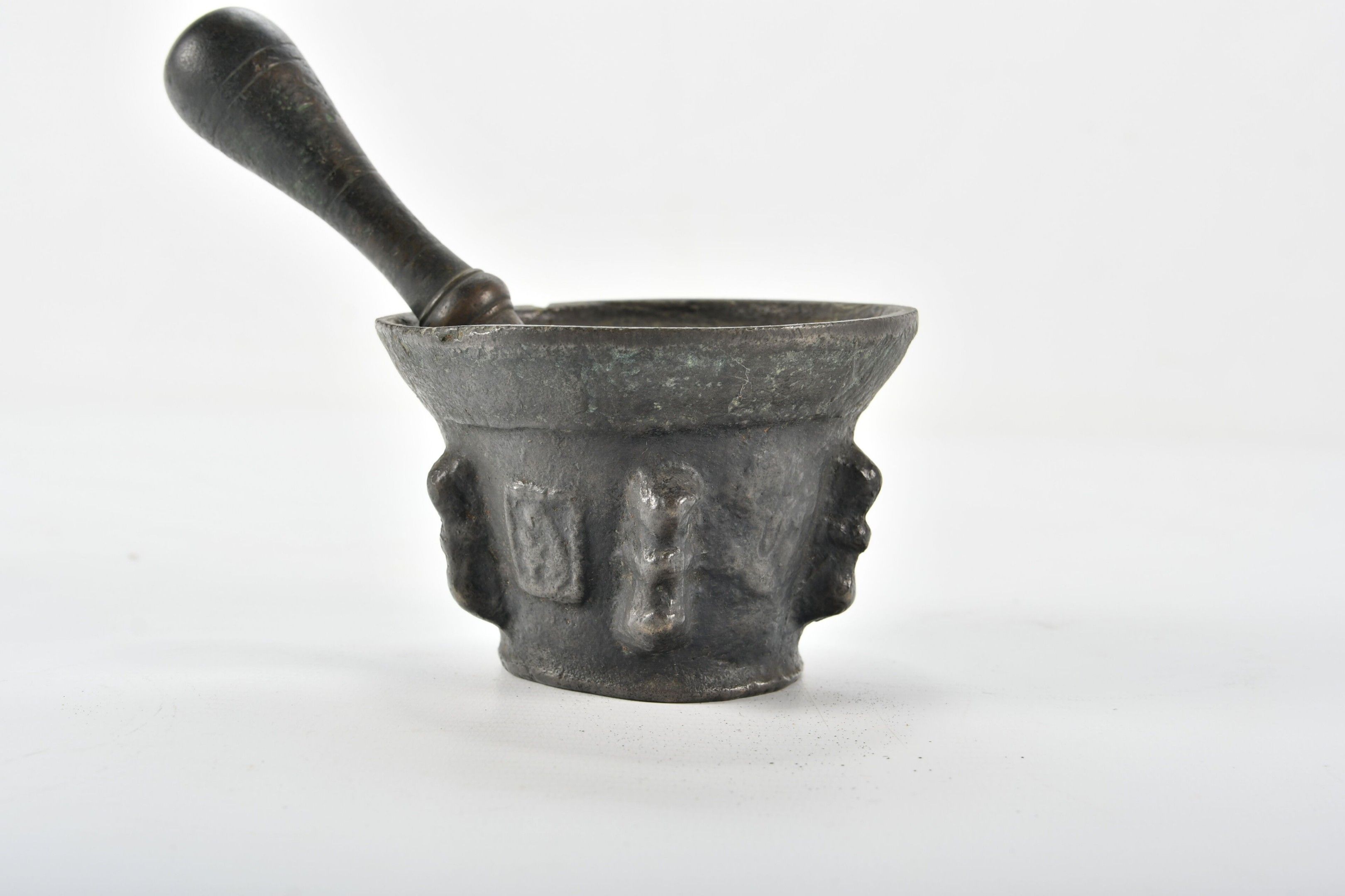 A bronze conical-shaped MORTAR decorated with small bas-reliefs and alternating half-balusters. 17th century period. H.7 - Diam. 10.5 cm. A two-sided pestle, ringed in the centre and engraved with rings. L. 16 cm
