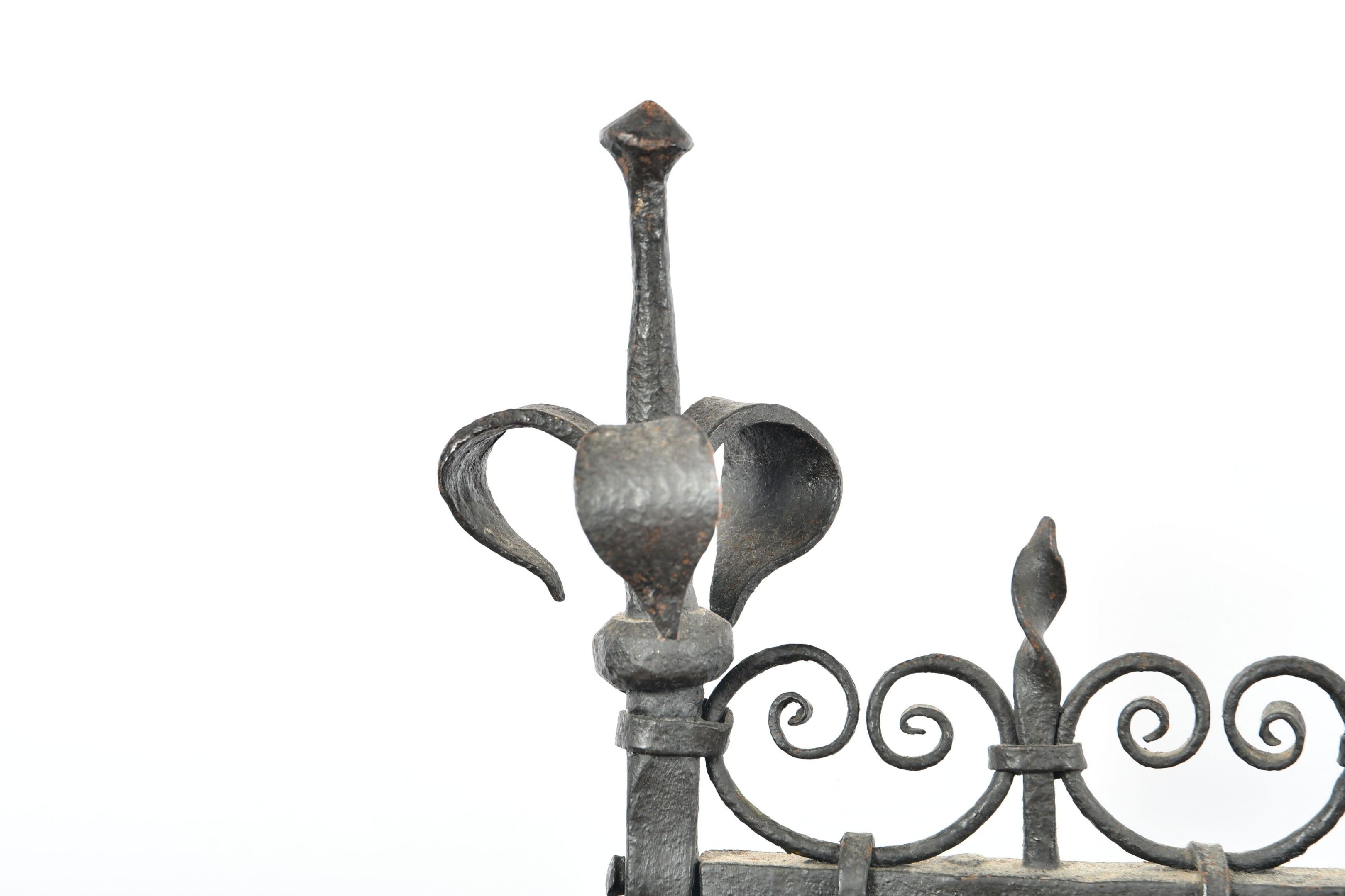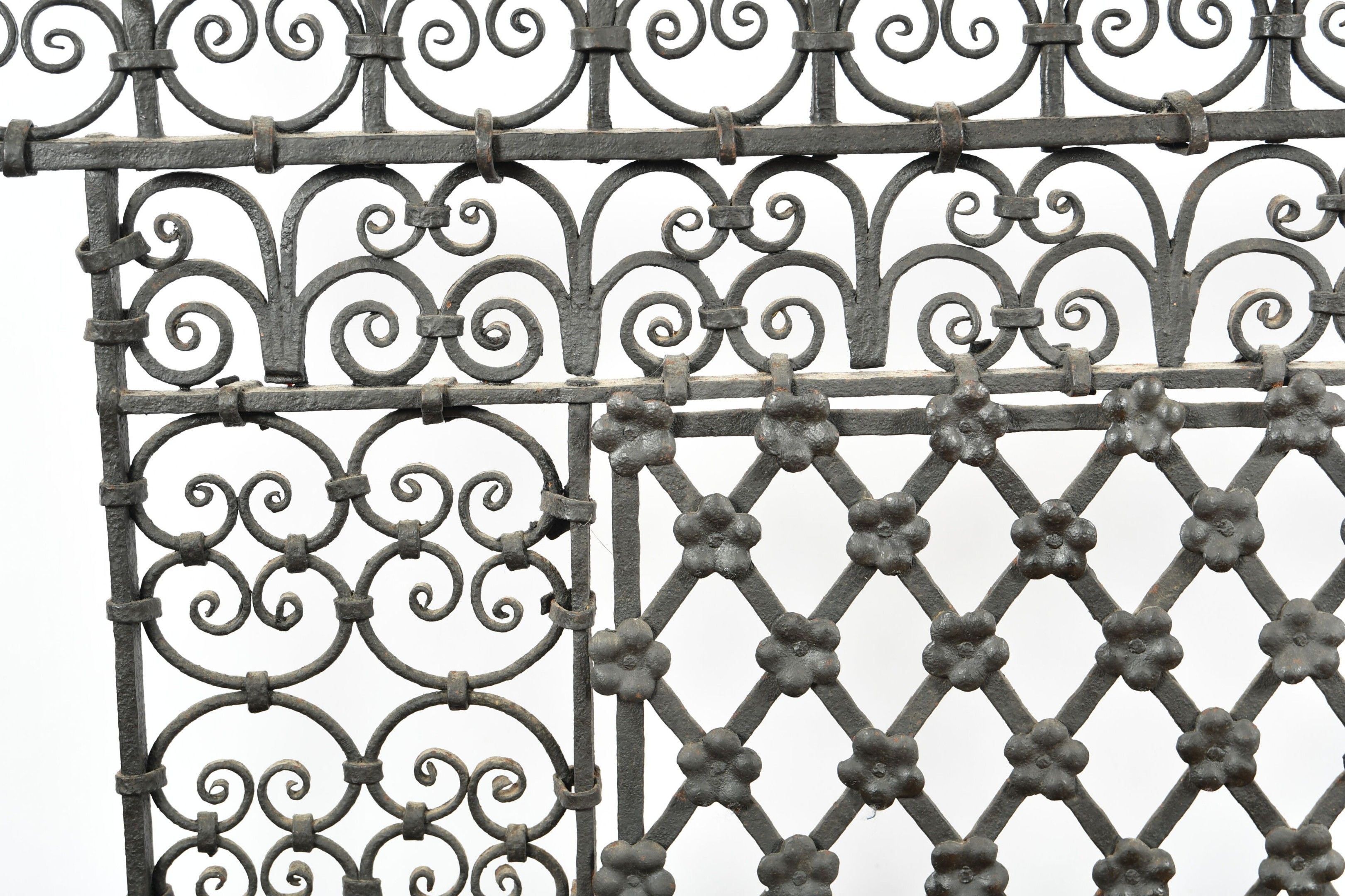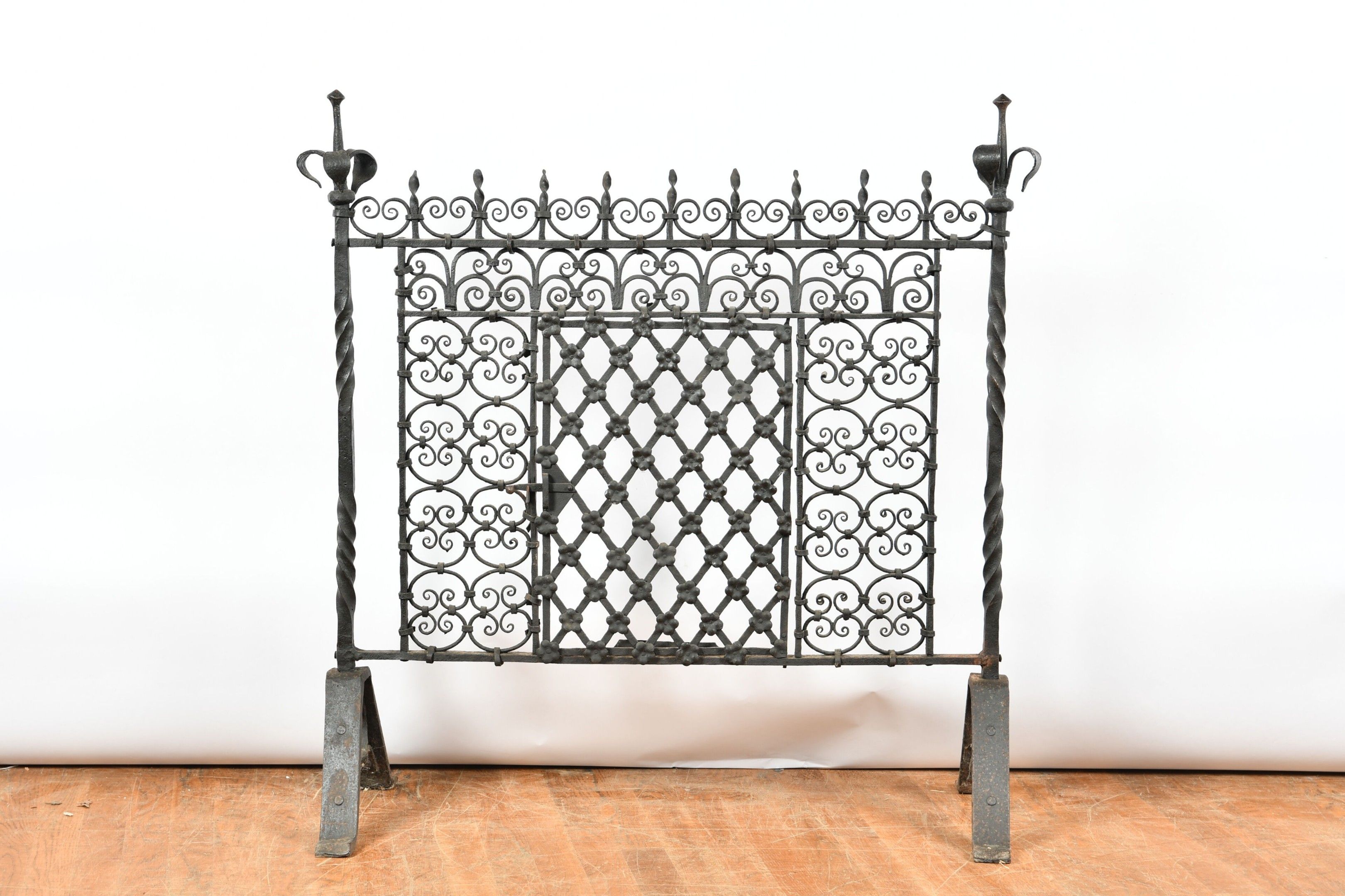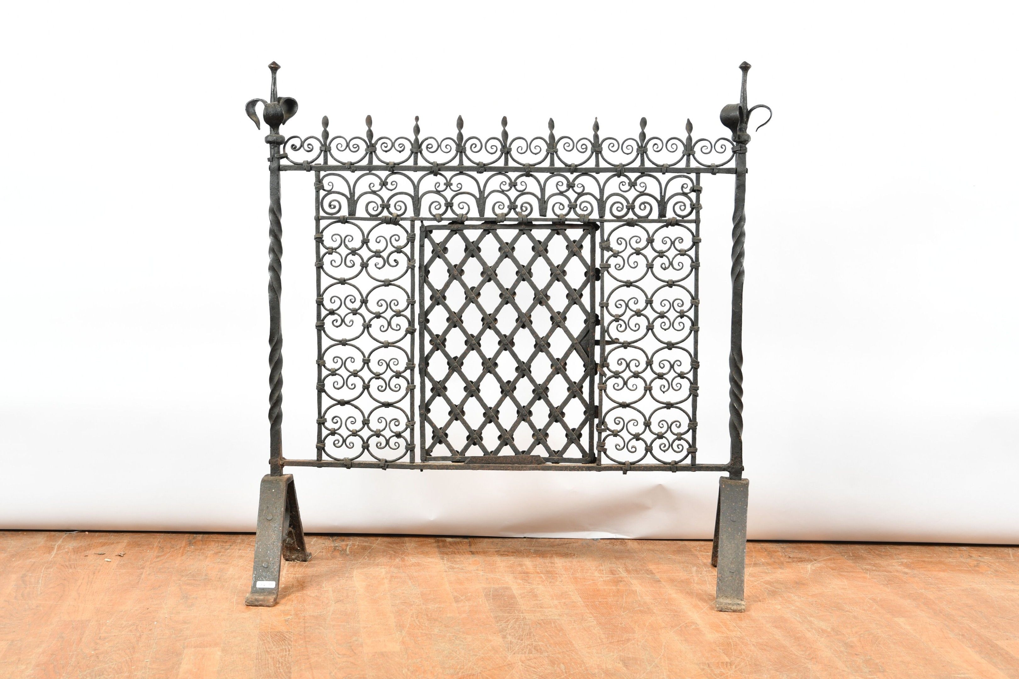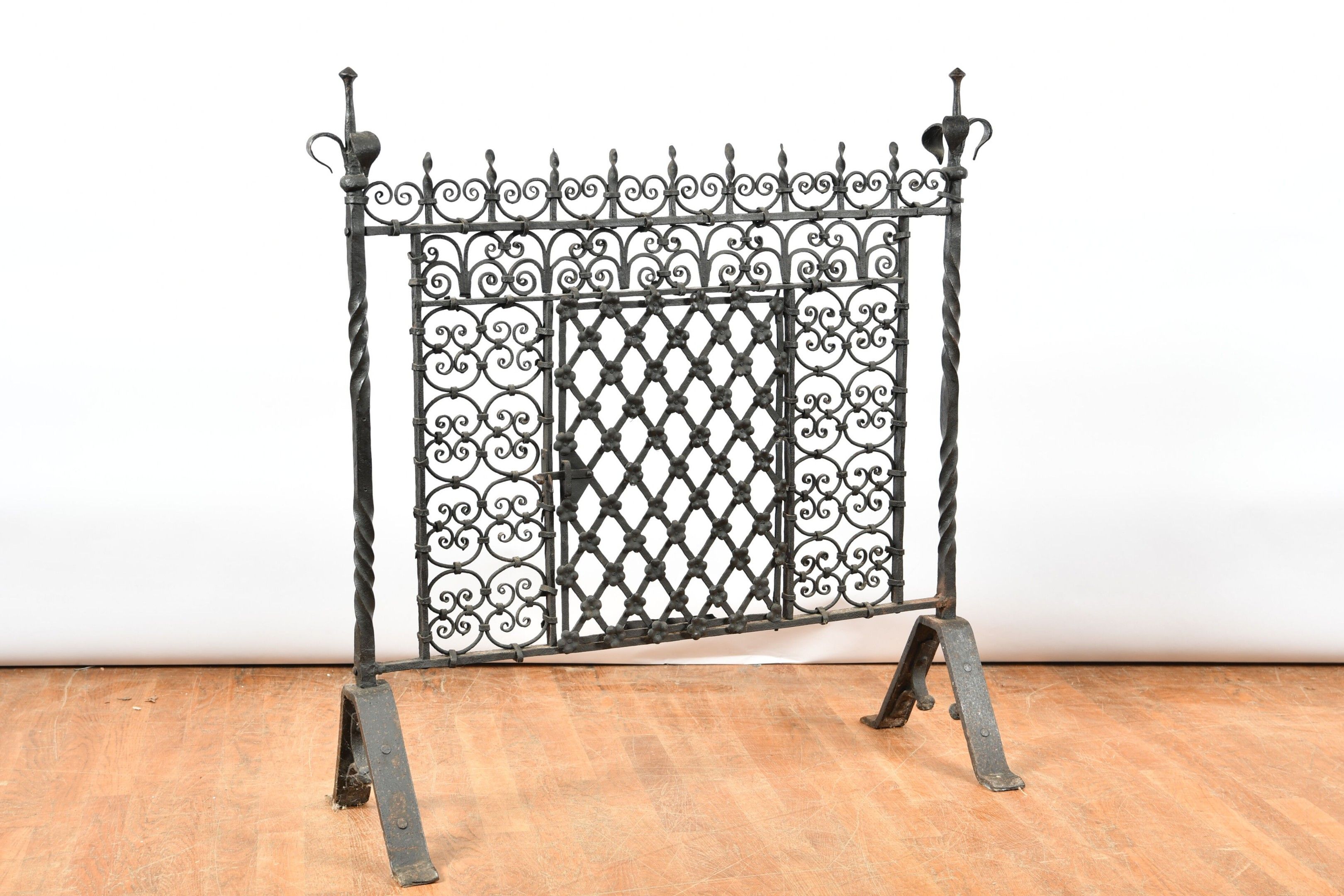 Wrought iron fireplace screen consisting of a grille with a central door of lattice work and flowers, framed by two parts with eight scrolled motifs, topped with a frieze also of scrolls. 16th century. Assembled with a stylish twisted base. H. 111 - W. 108 - D. 43 cm