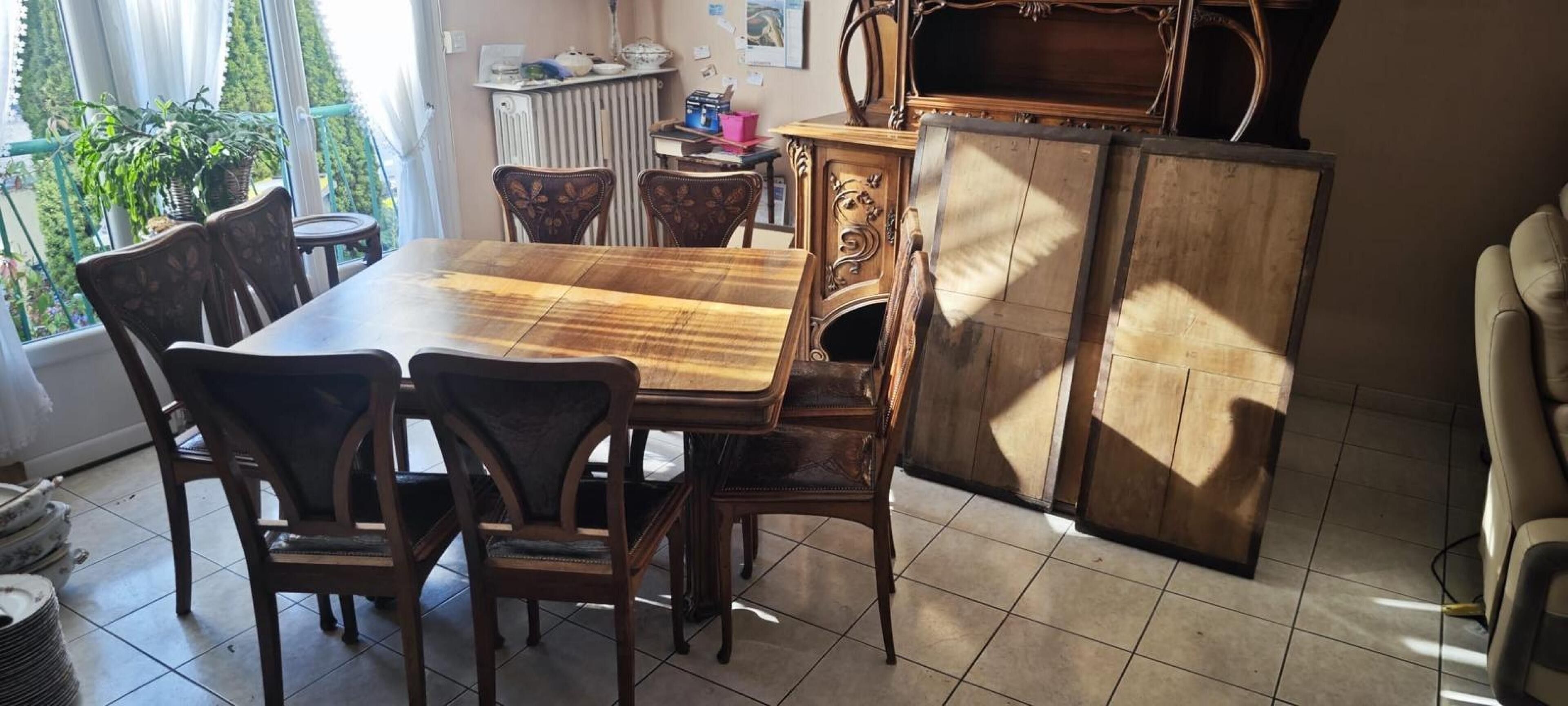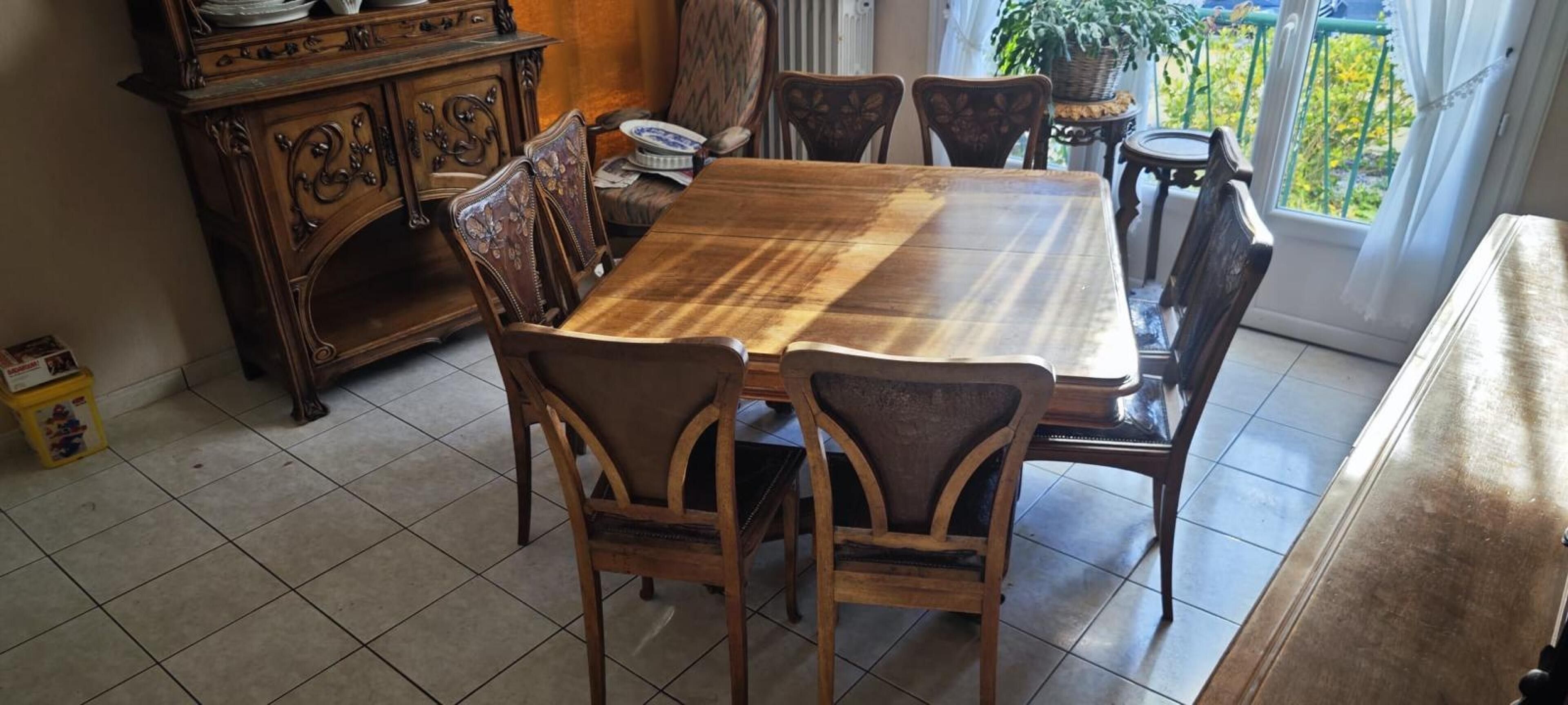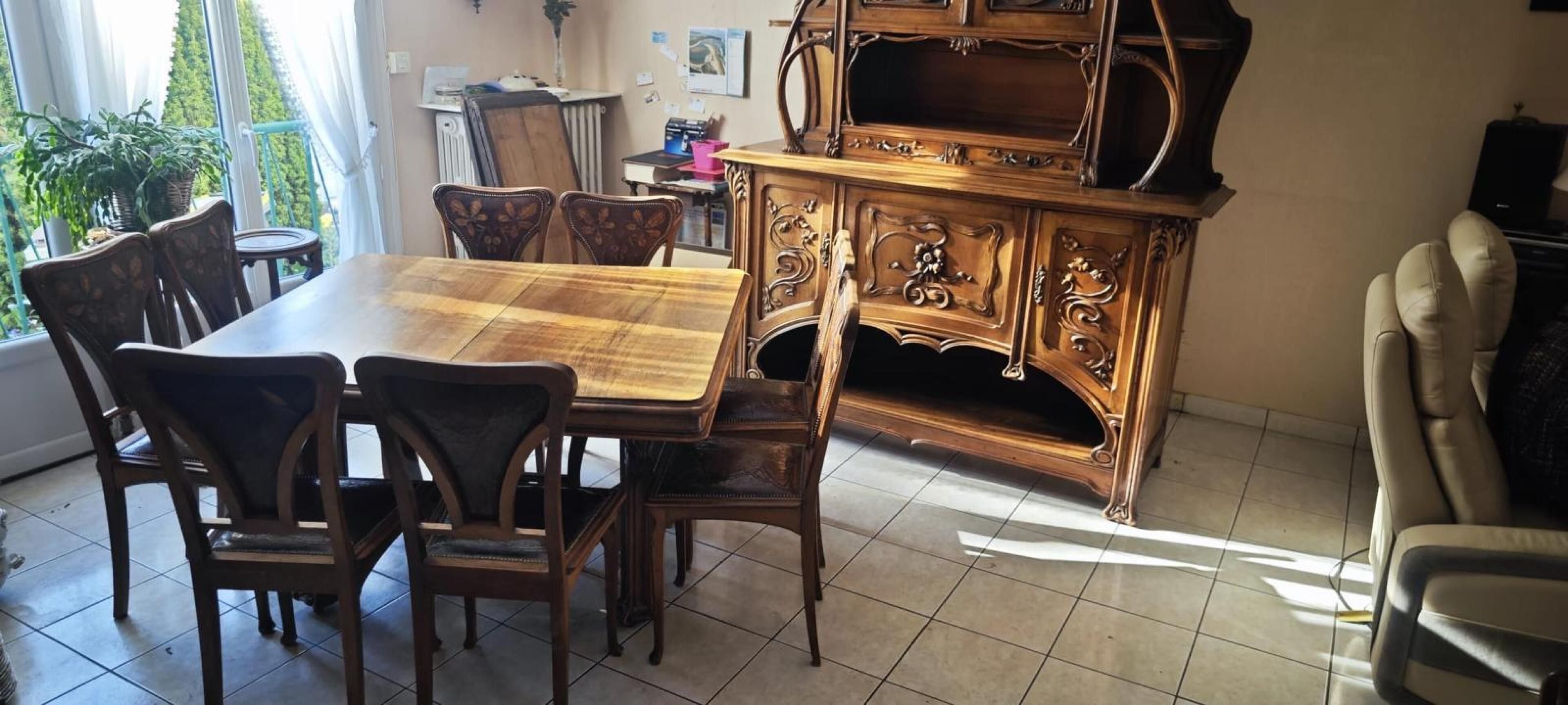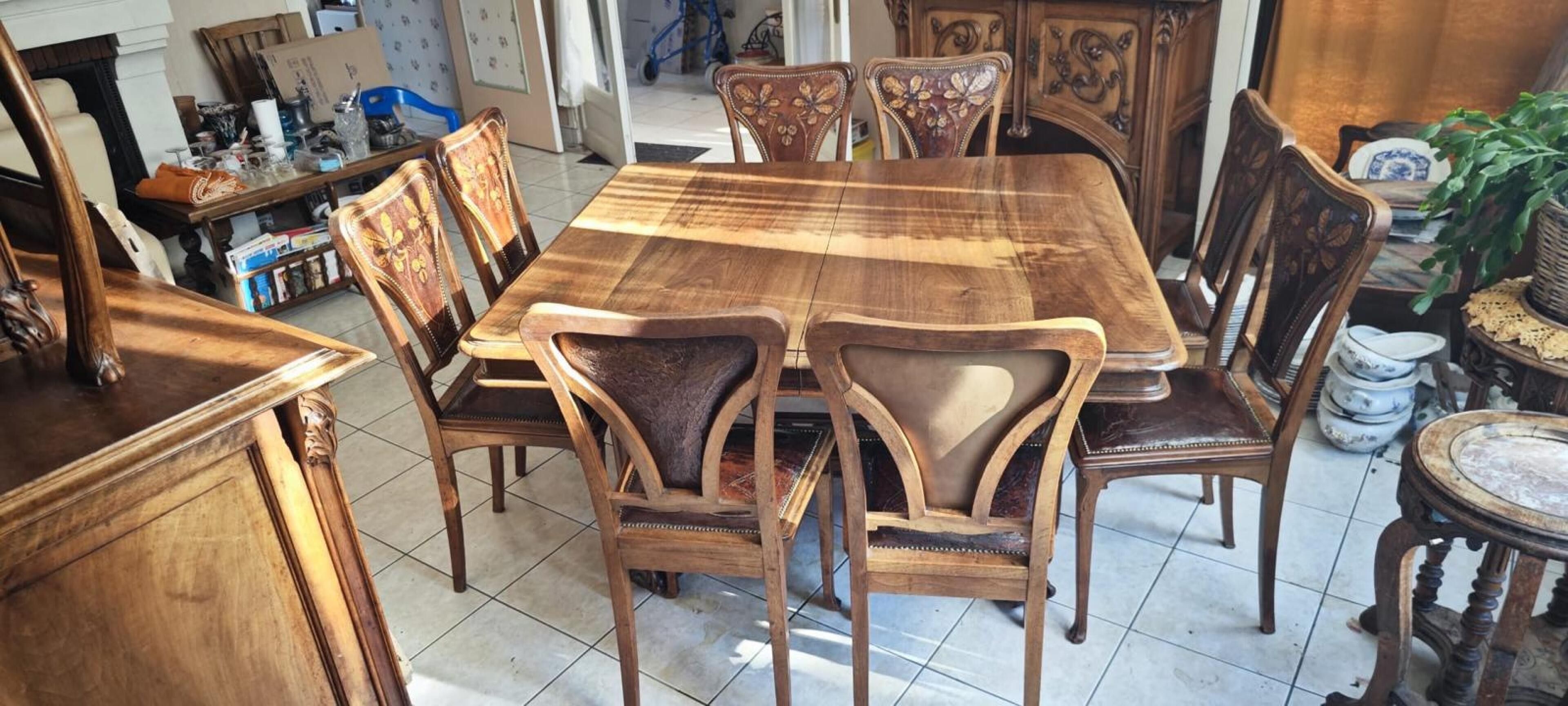 Natural wood DINING ROOM with rich carved plant decoration comprising: two-part dresser; dining room table; suite of eight chairs and small sideboard. Art Nouveau period.