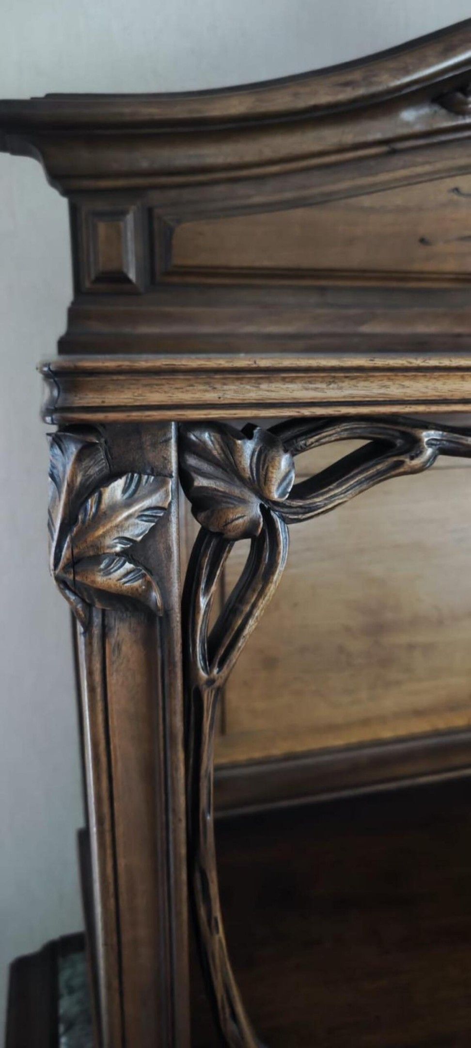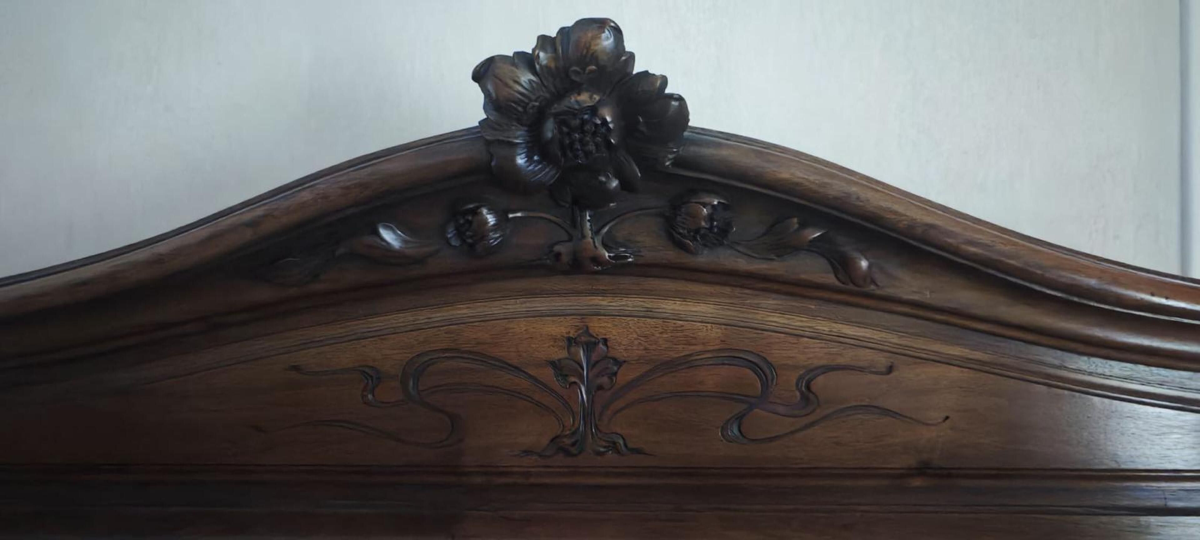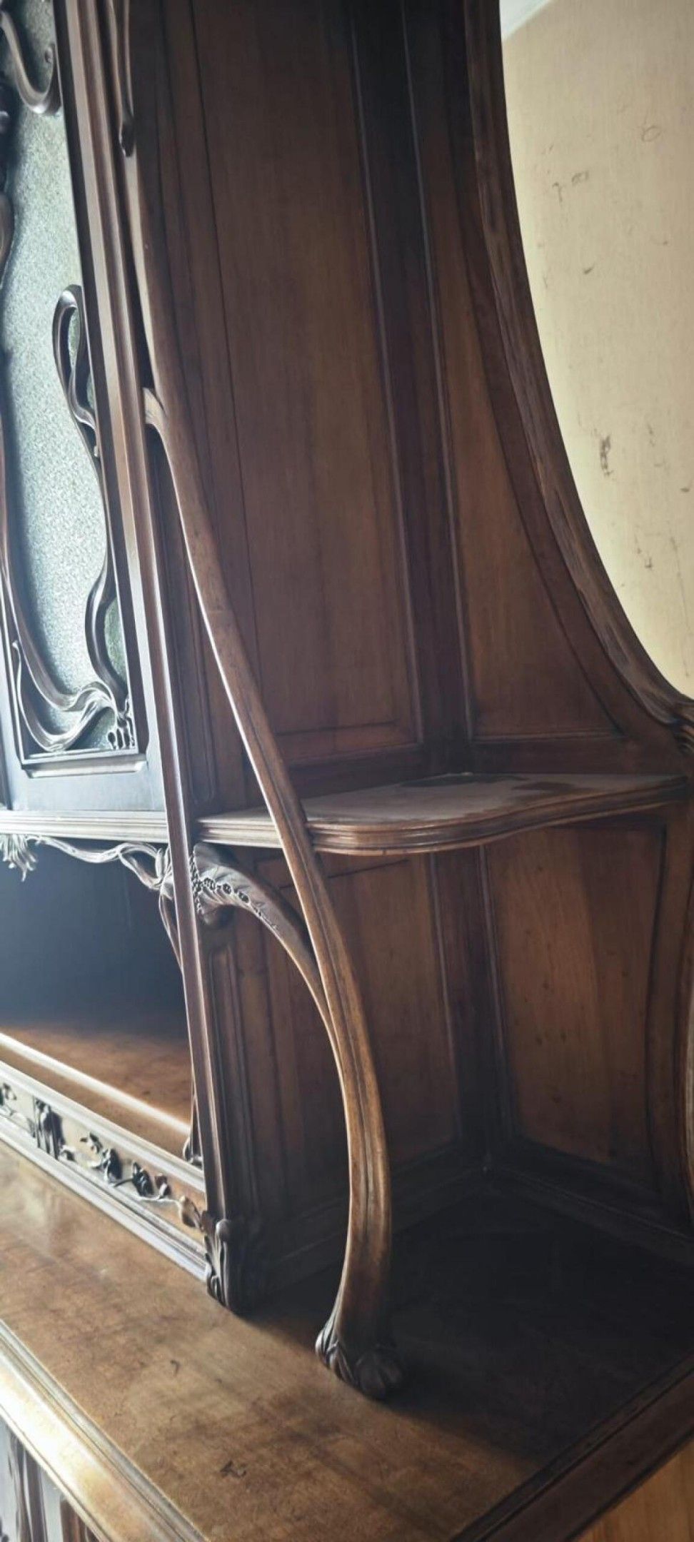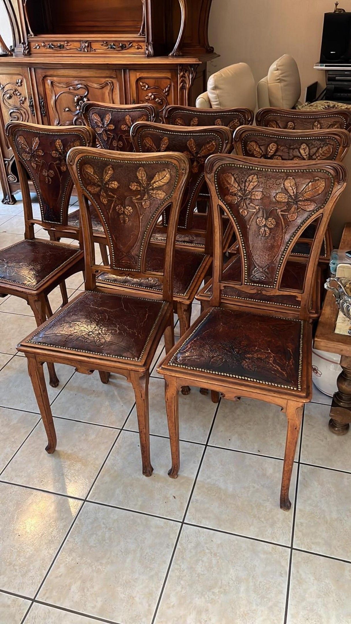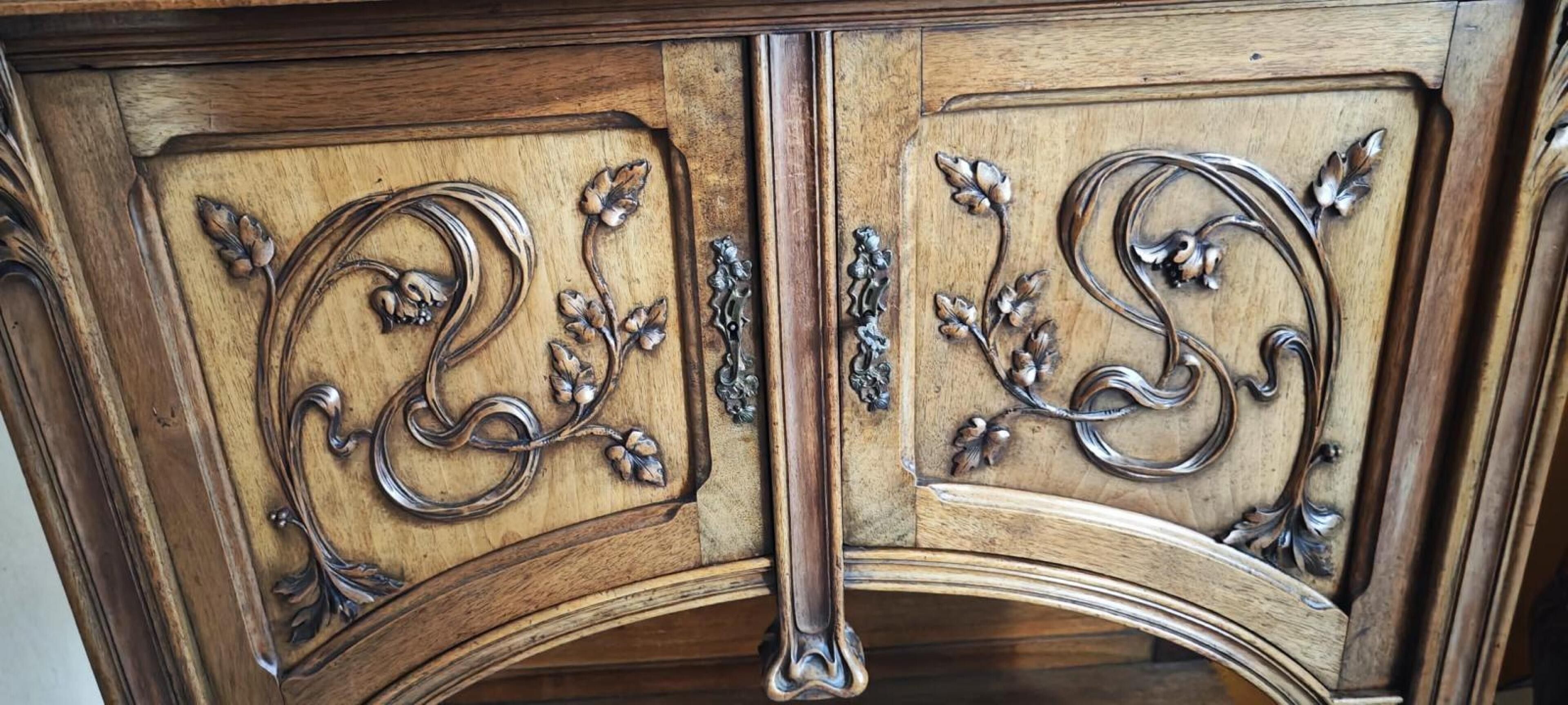 Natural wood DINING ROOM with rich carved plant decoration comprising: two-part dresser; dining room table; suite of eight chairs and small sideboard. Art Nouveau period.