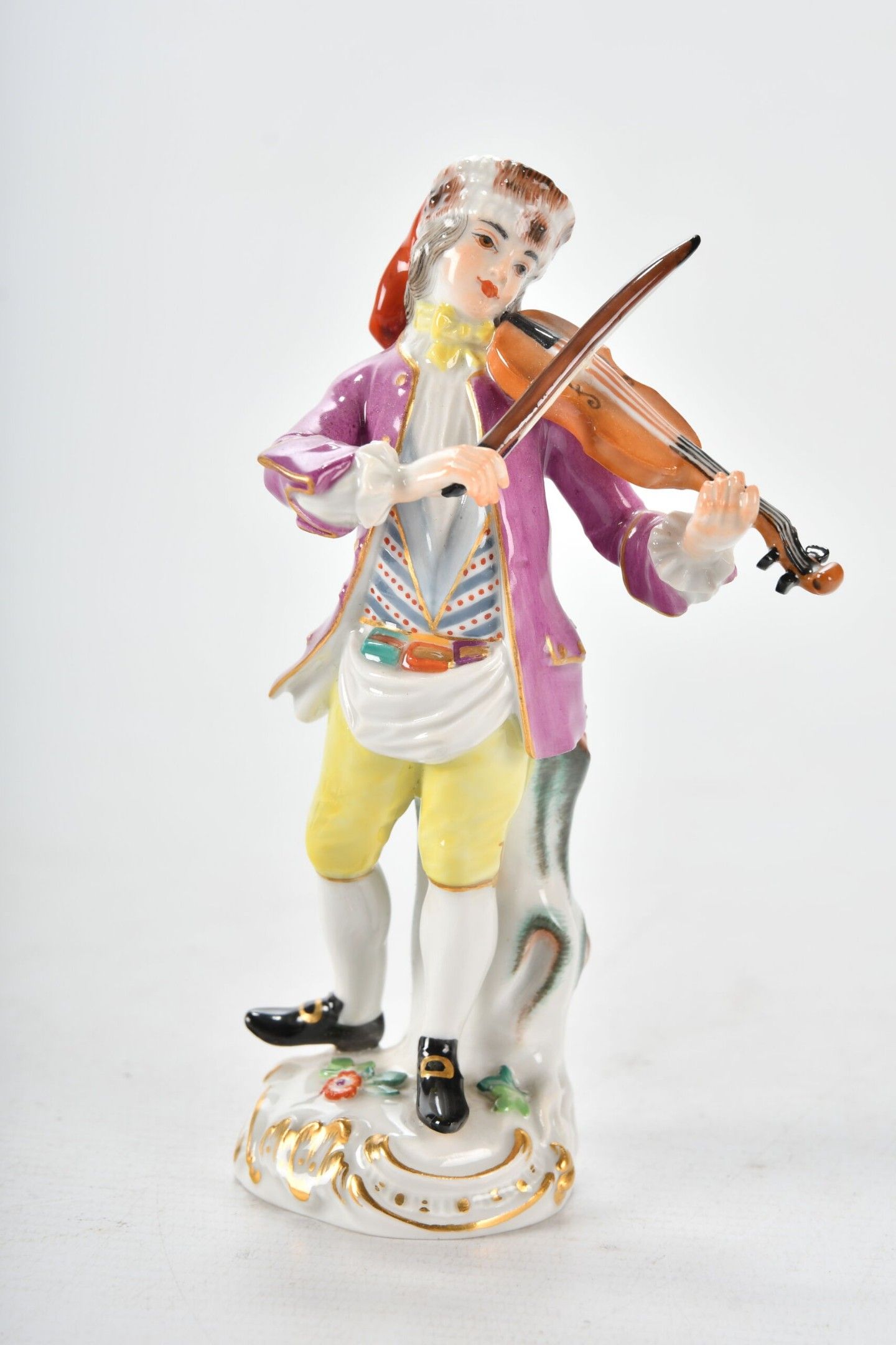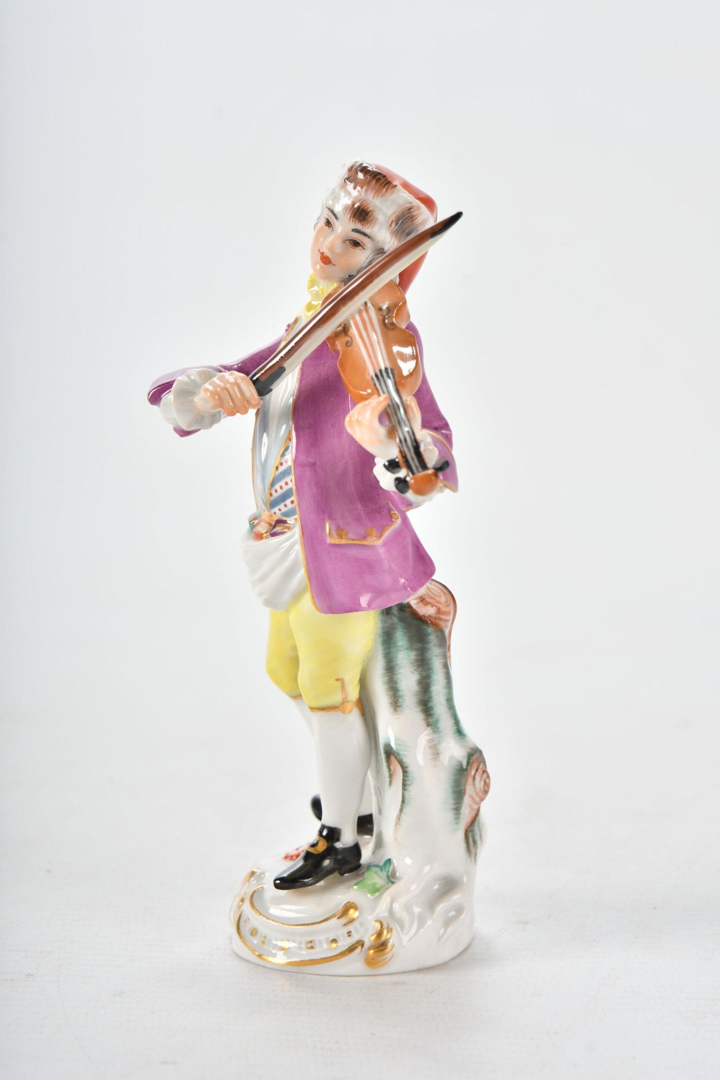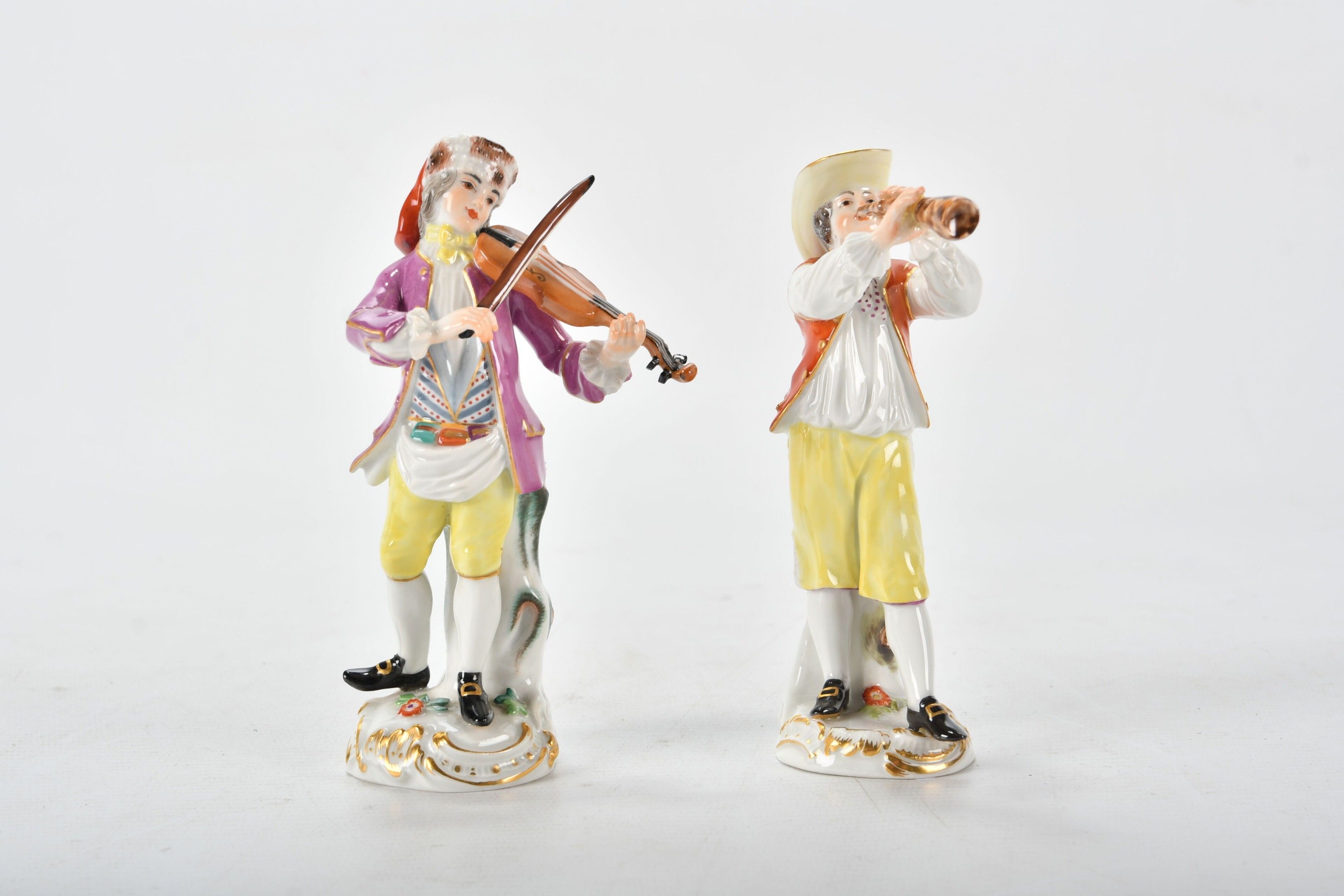 MEISSEN. Suite of two porcelain subjects with polychrome enamel depicting a flute player and a violinist. H. 14 cm. Mark with crossed swords in blue on the reverse.