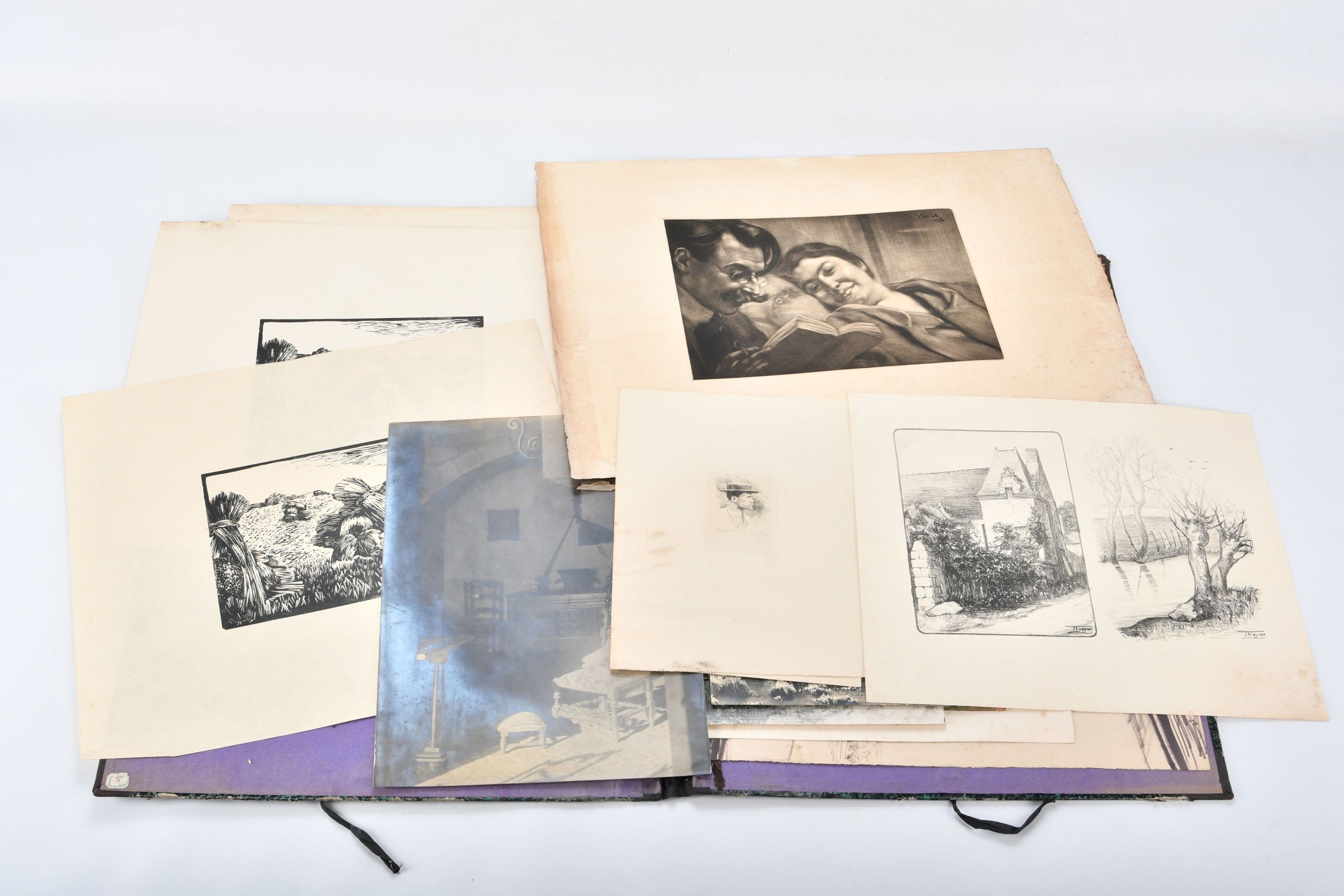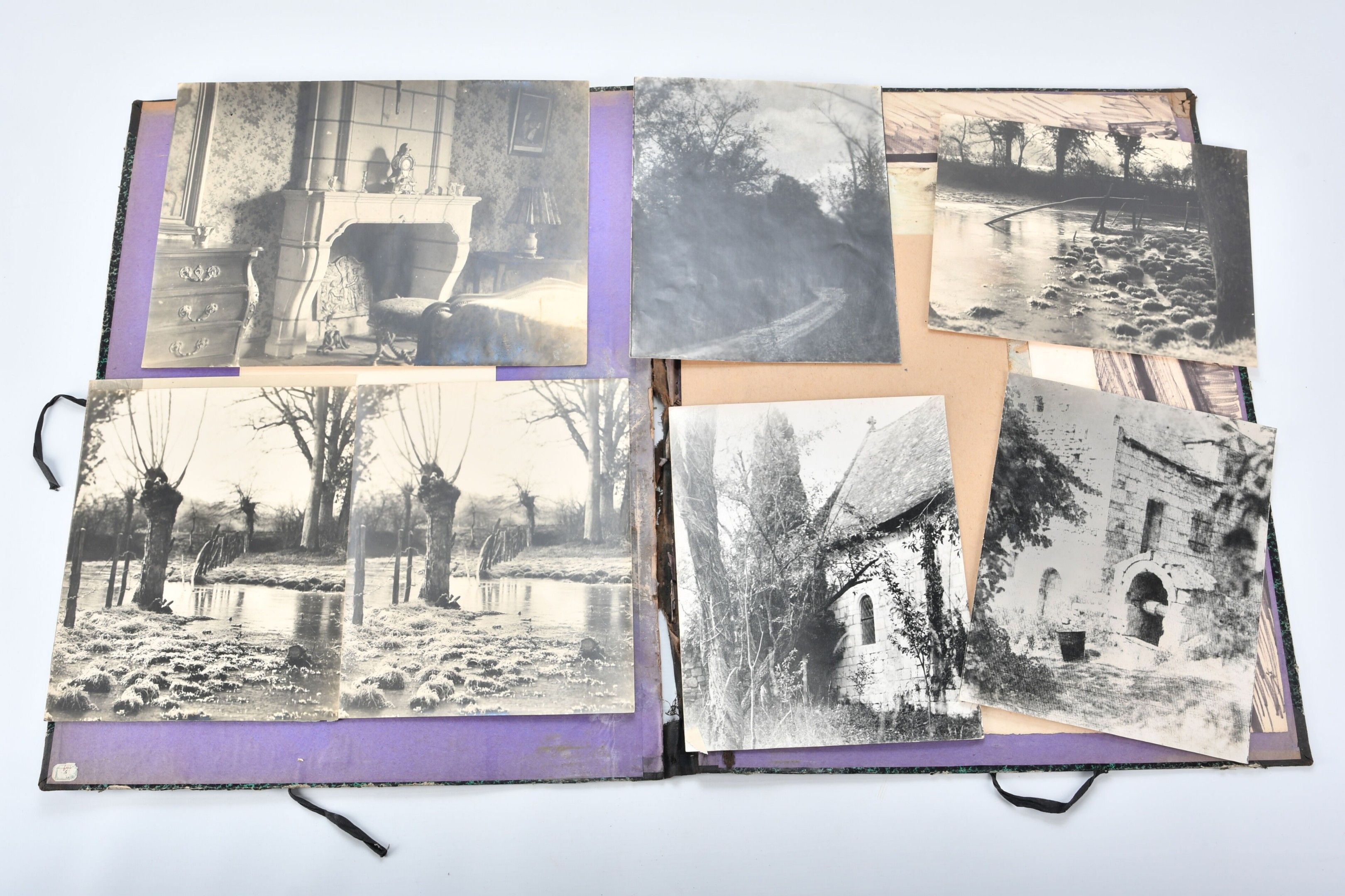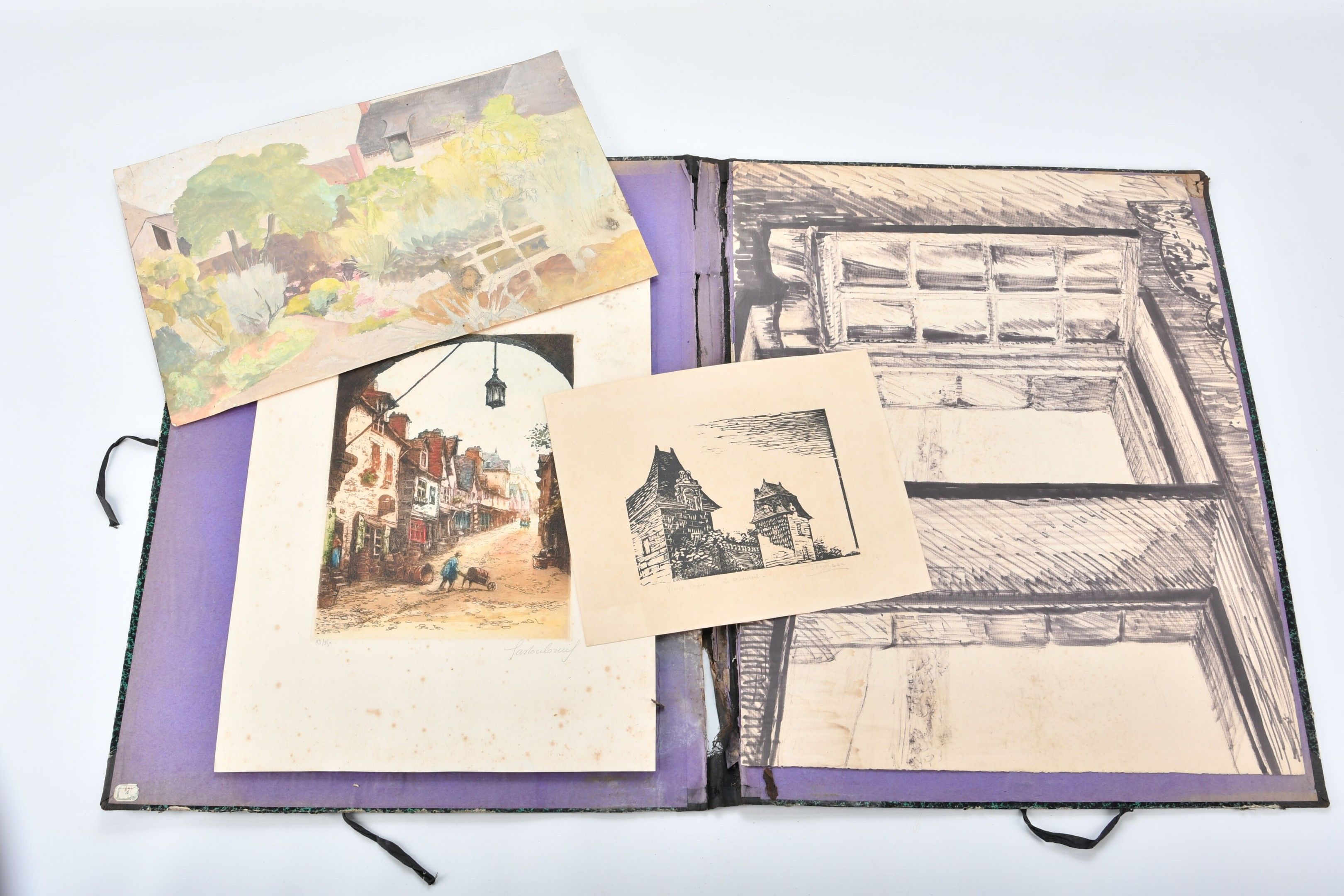 DRAWING BOARD containing prints; photographs and drawings mainly by Fraysse (20th century) including views of the Maine et Loire countryside; Le Thoureil and a manor house in the Loire valley.