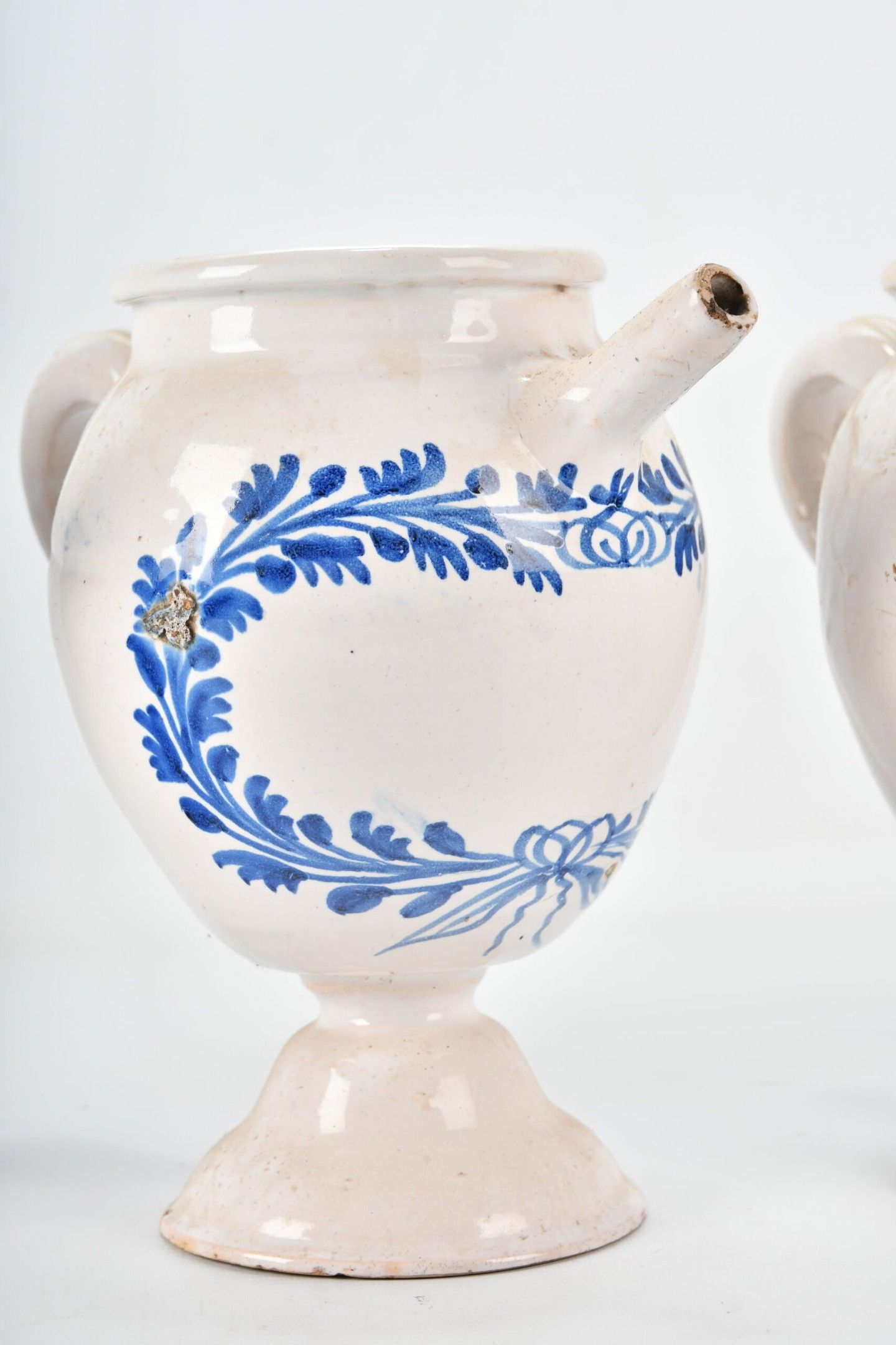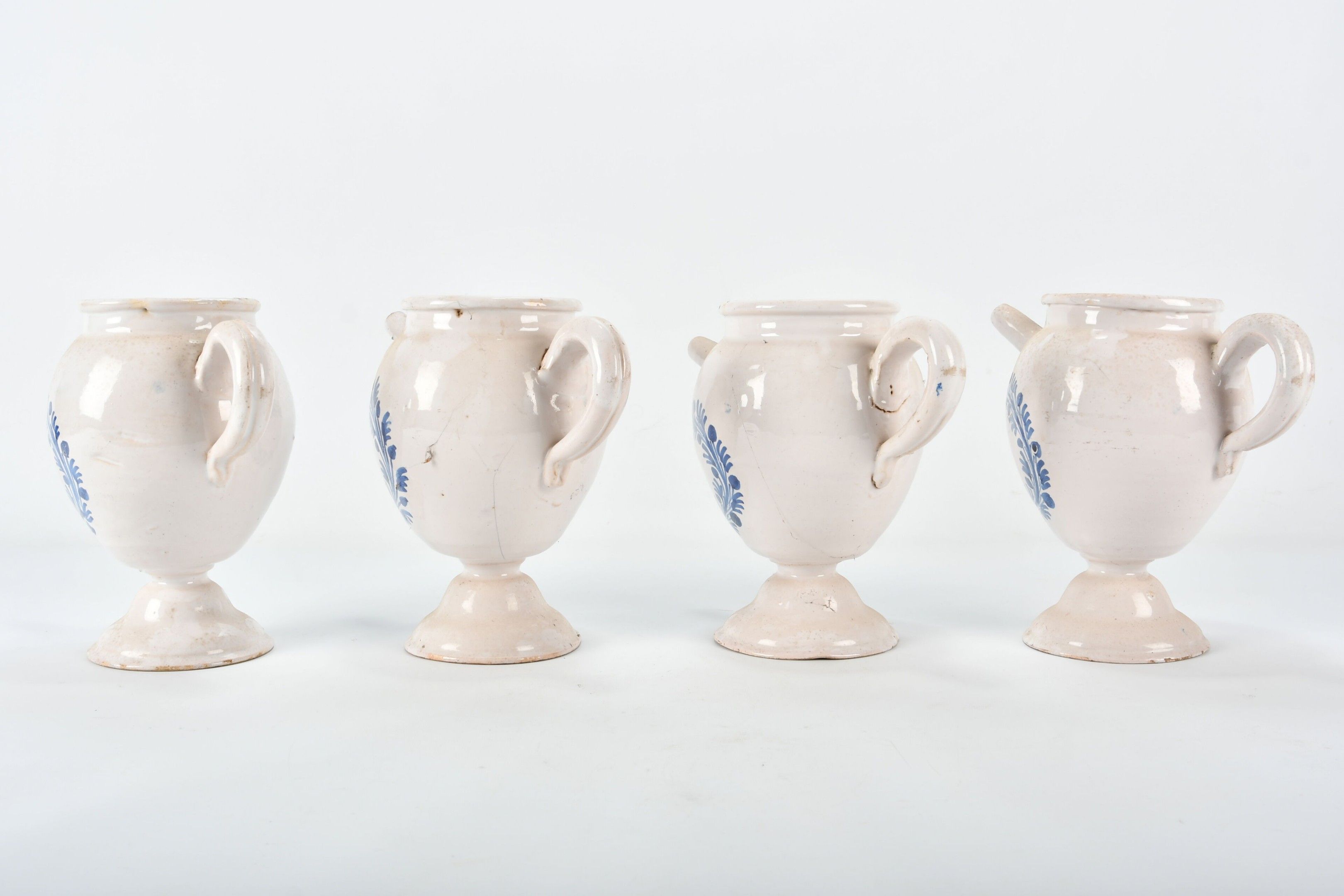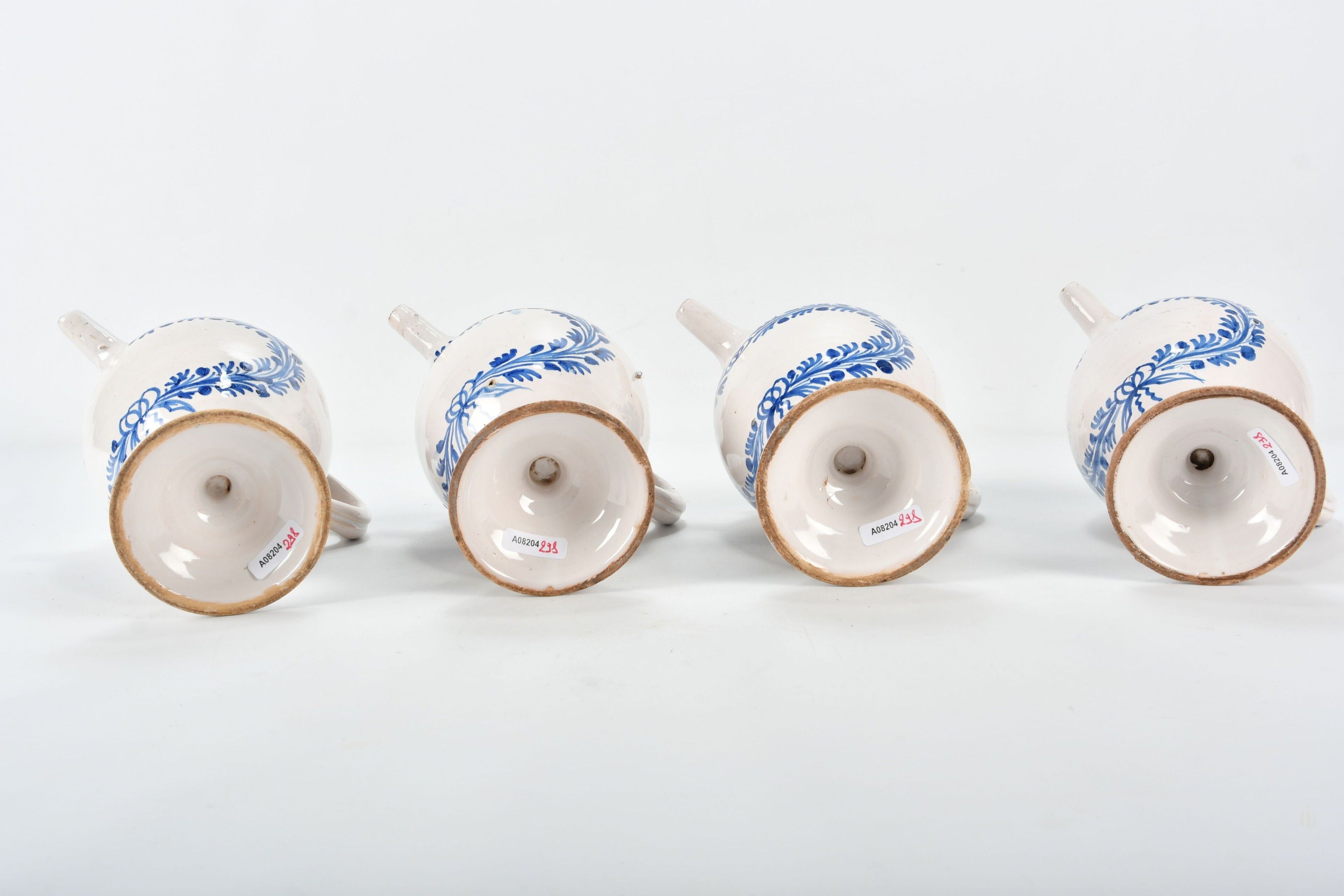 NEVERS 18th century. Suite of four glazed earthenware chevrettes with a handle and resting on a pedestal. Decorated in blue with garlands of foliage. Height 22.5 cm. Small glaze chips; firing defects and chips throughout and cracks in one.