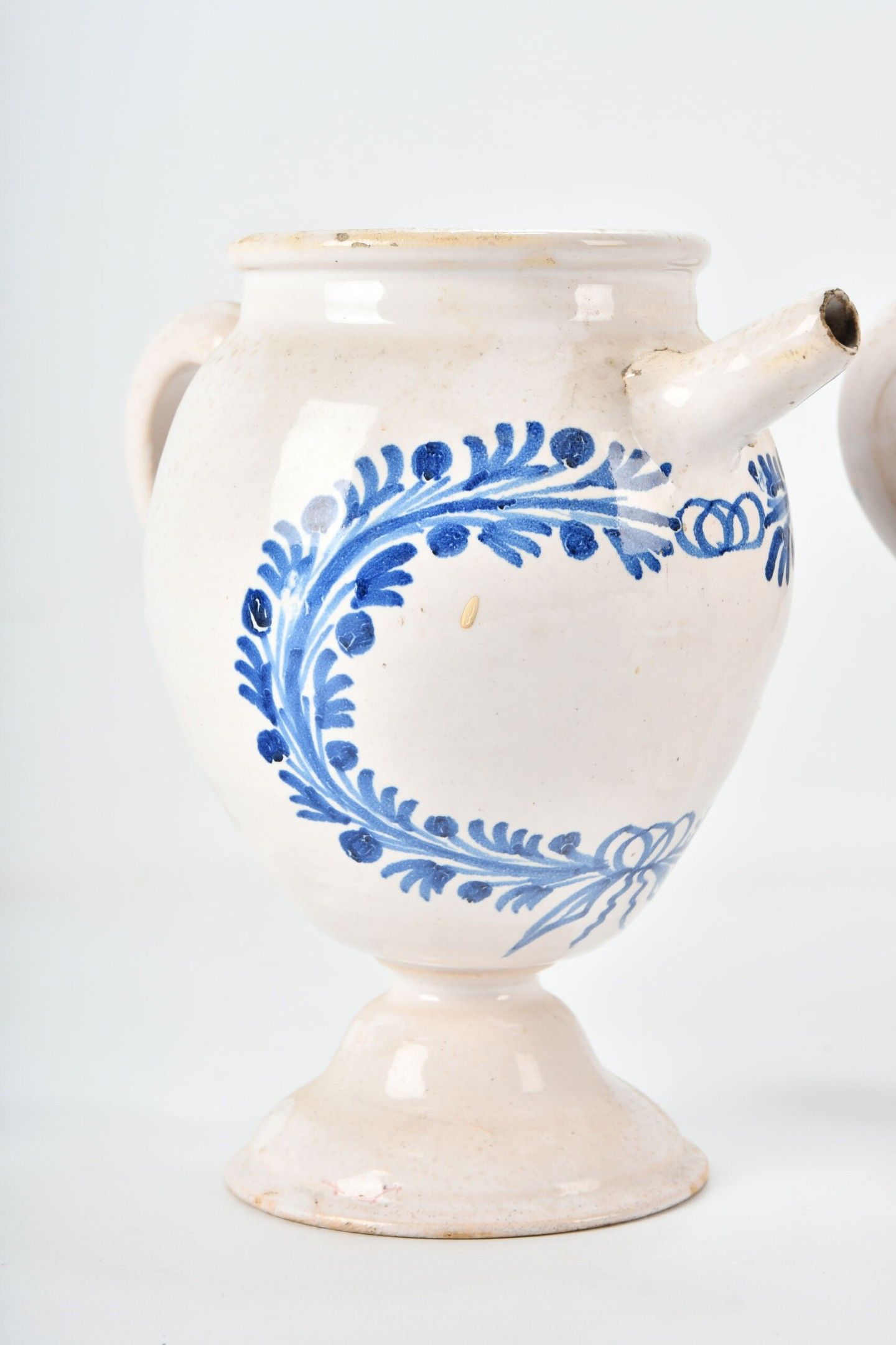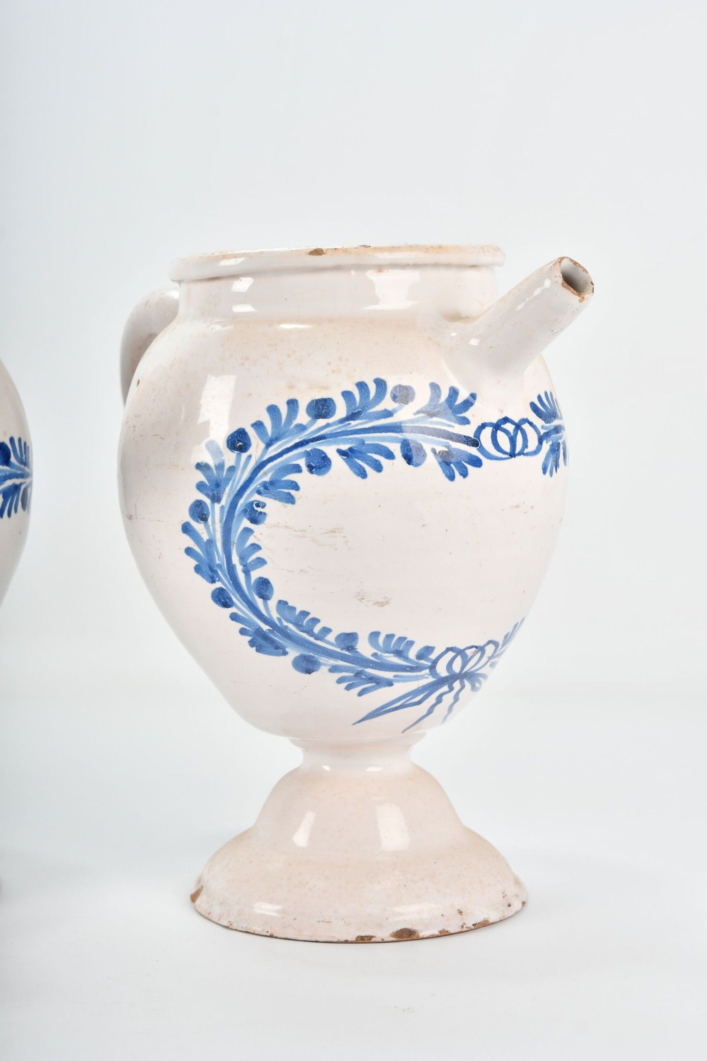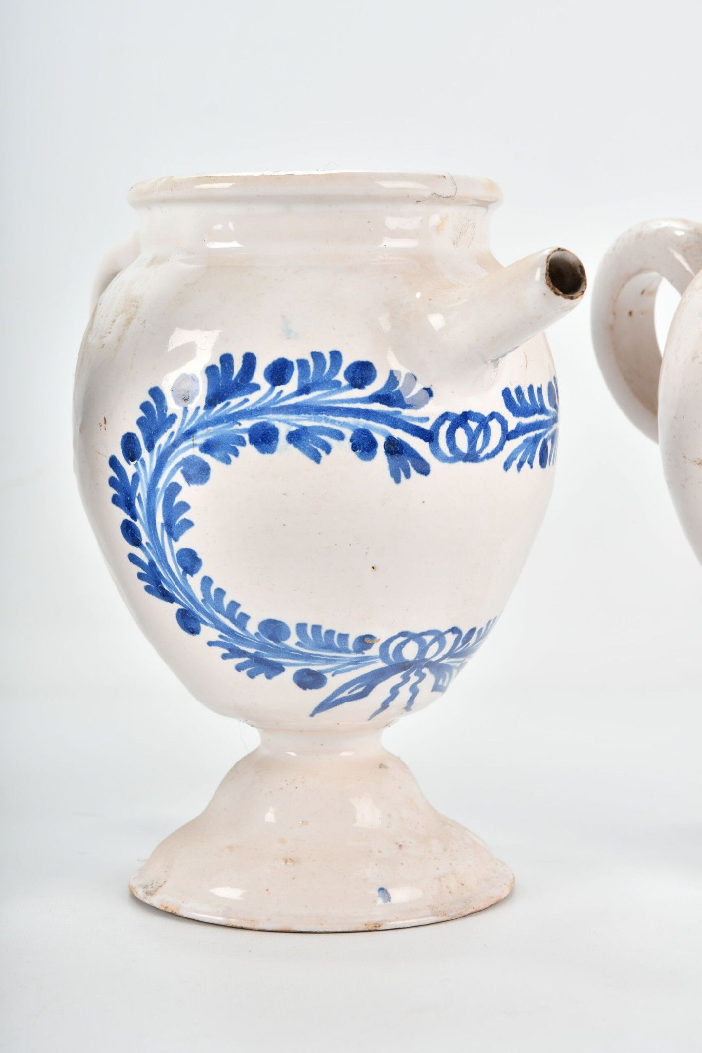 NEVERS 18th century. Suite of four glazed earthenware chevrettes with a handle and resting on a pedestal. Decorated in blue with garlands of foliage. Height 22.5 cm. Small glaze chips; firing defects and chips throughout and cracks in one.