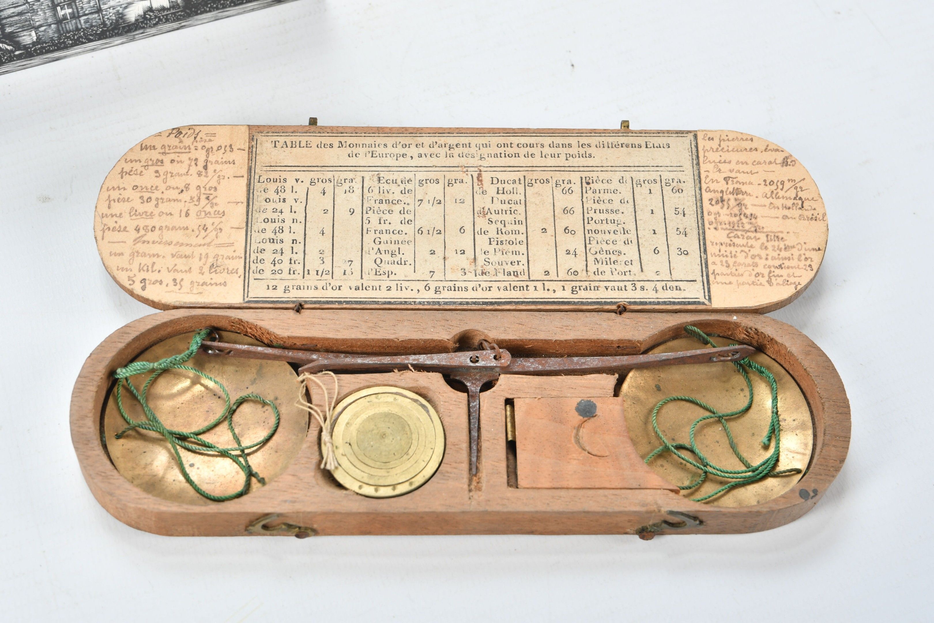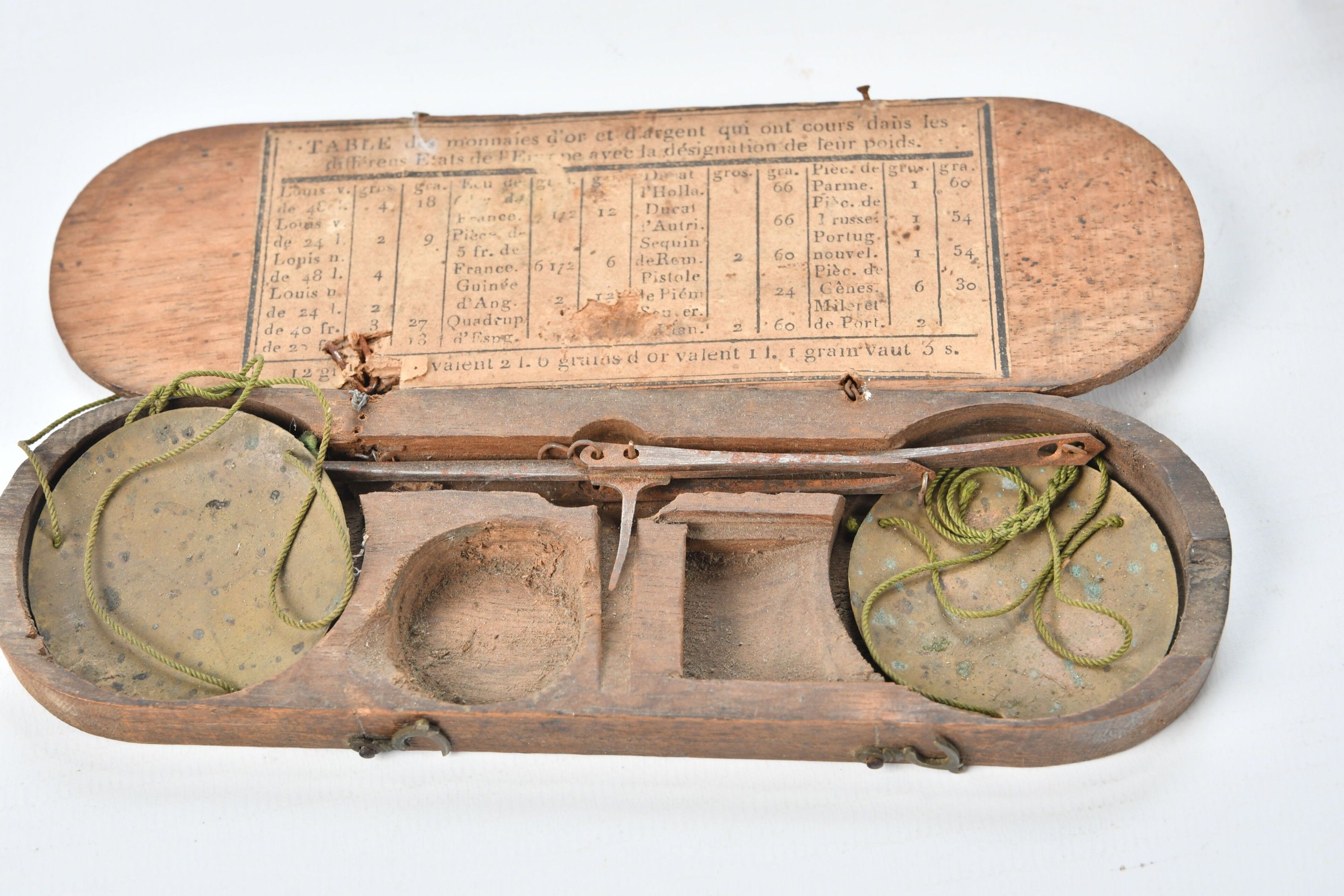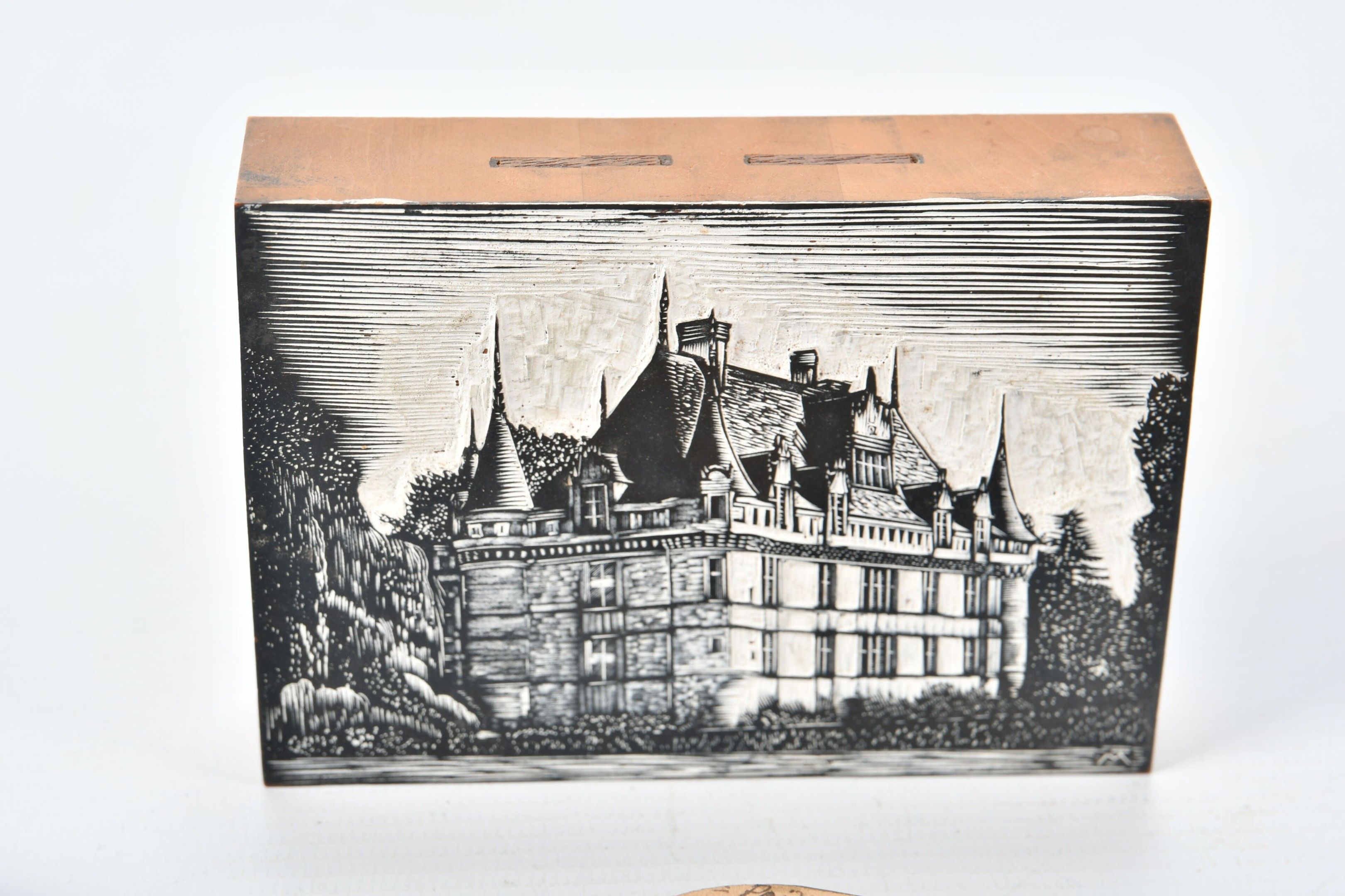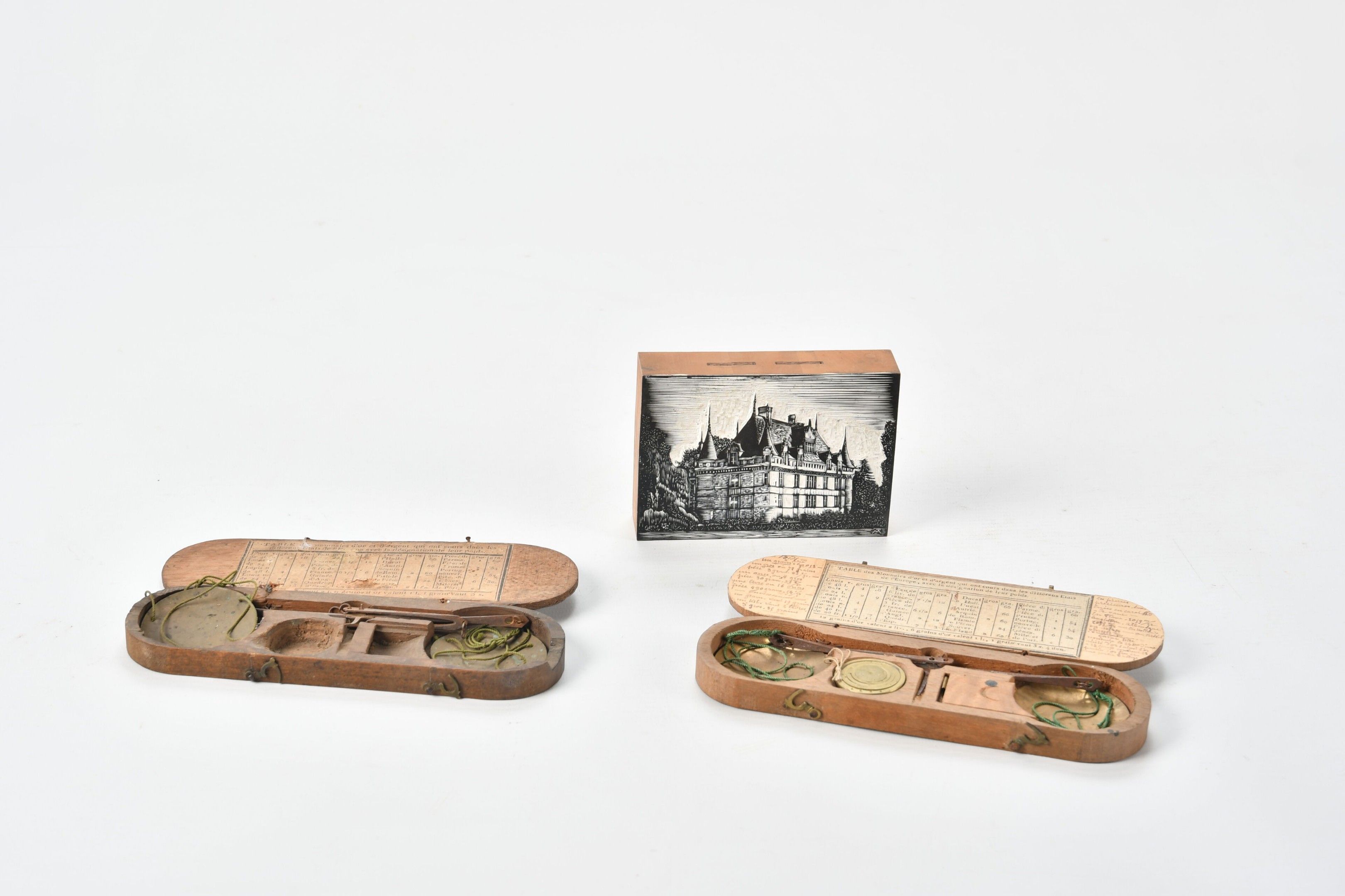 Brass and metal jeweller's or goldsmith's SCALE or TREBUCHET in its original box with table and small weights. A second incomplete scale is ATTACHED. AND INCLUDED is an engraved wooden stamp depicting the Château d'Azay-le-Rideau. 10.5 x 7.5 cm