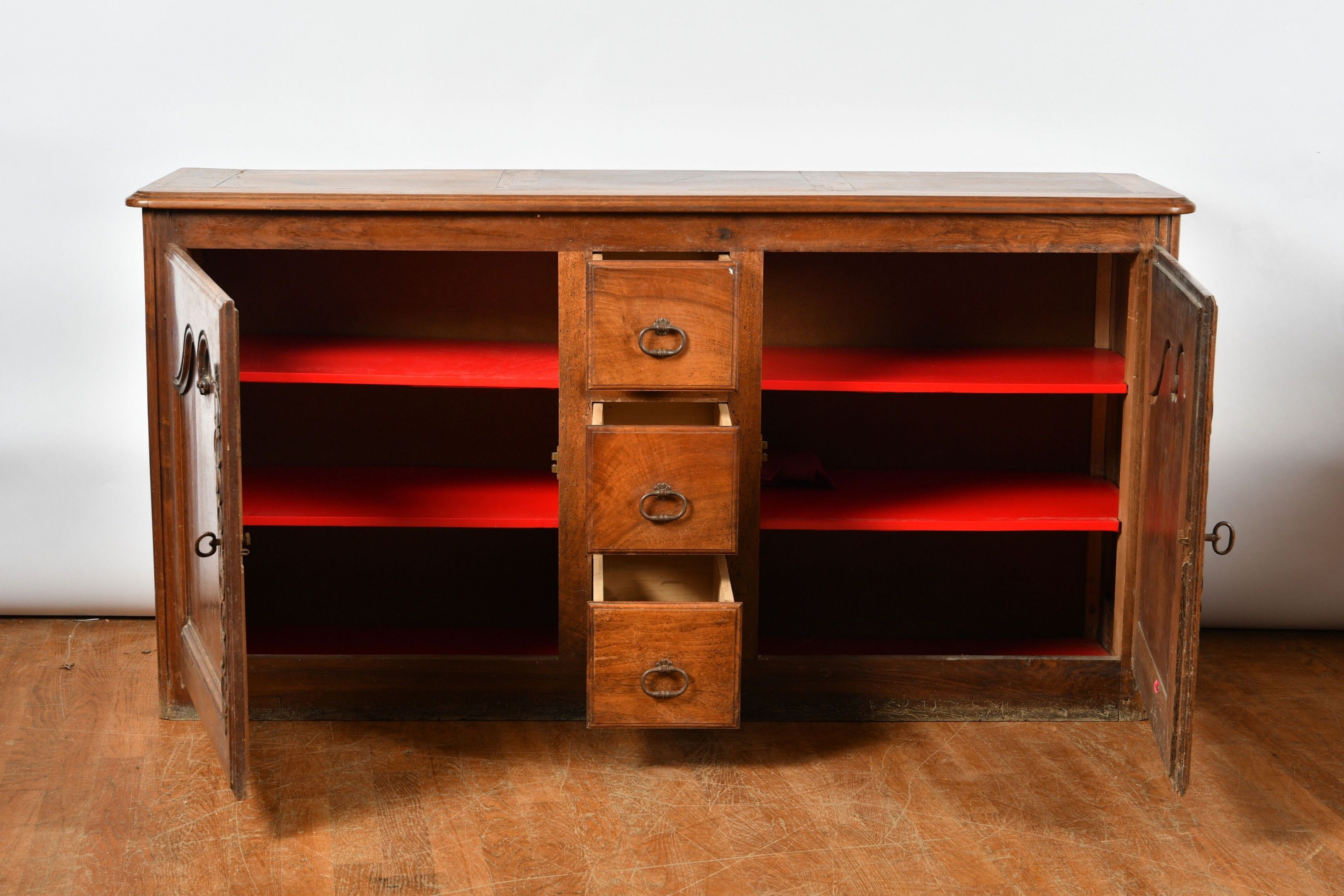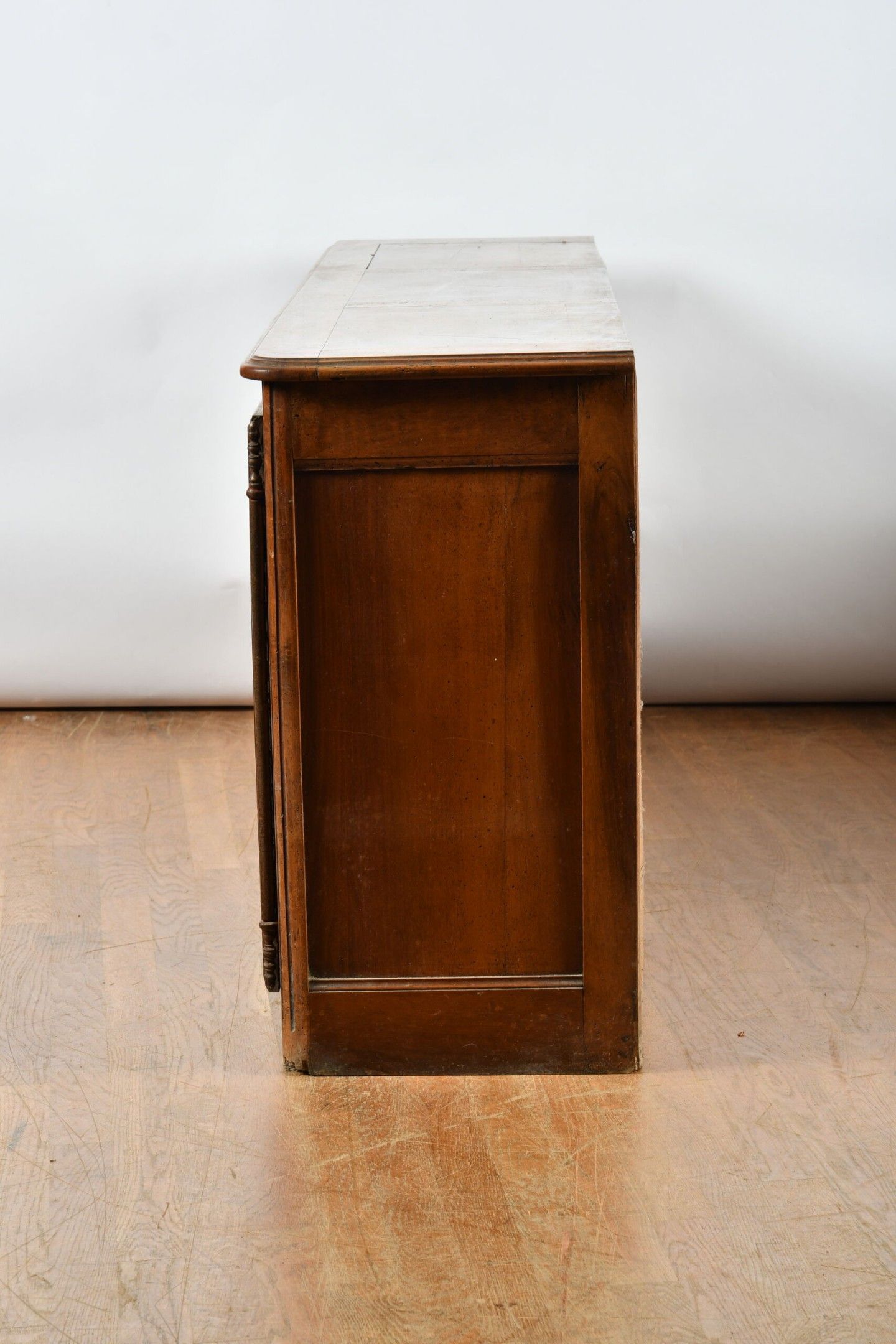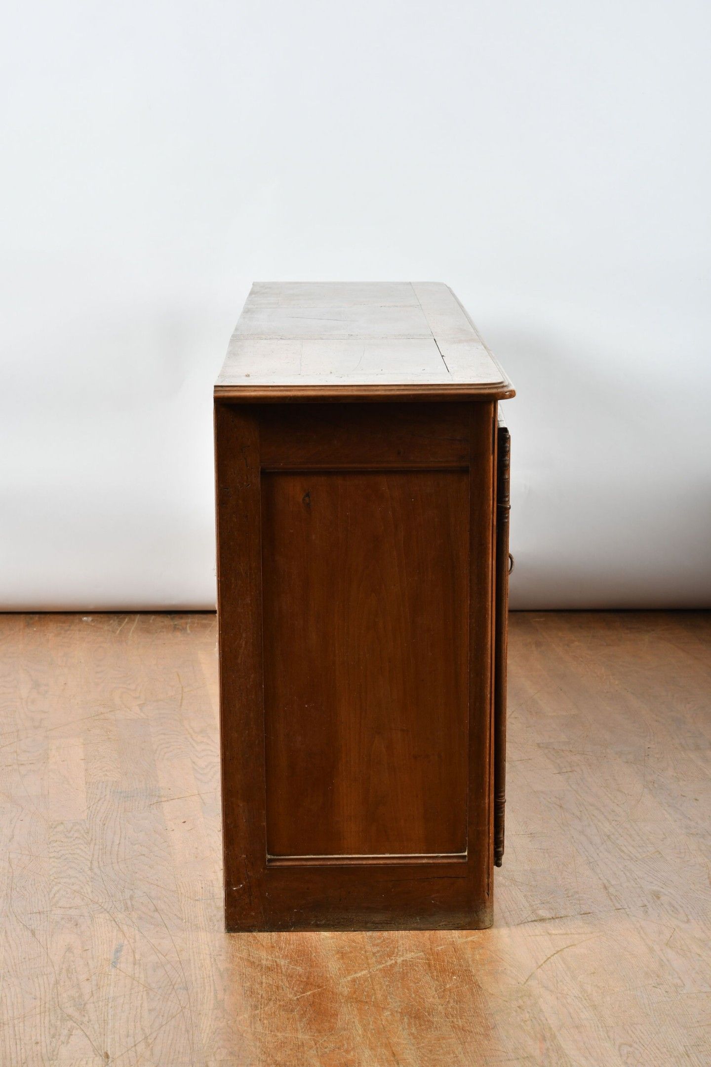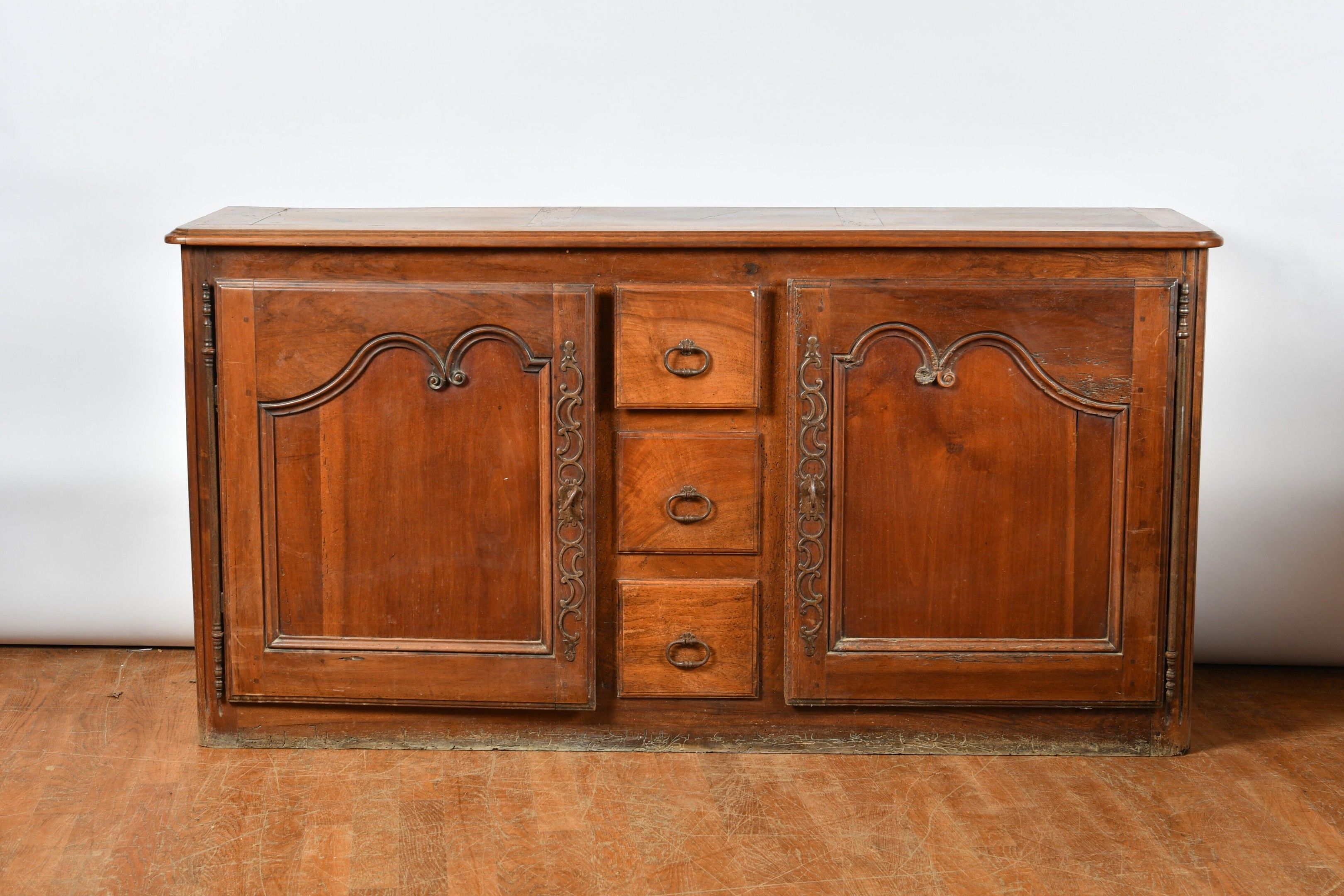 Walnut ENFILADE with moulded wooden top, opening with two doors and three vertical drawers. Decorated with mouldings and scrolls. H. 81 - W. 158 - D. 42 cm.