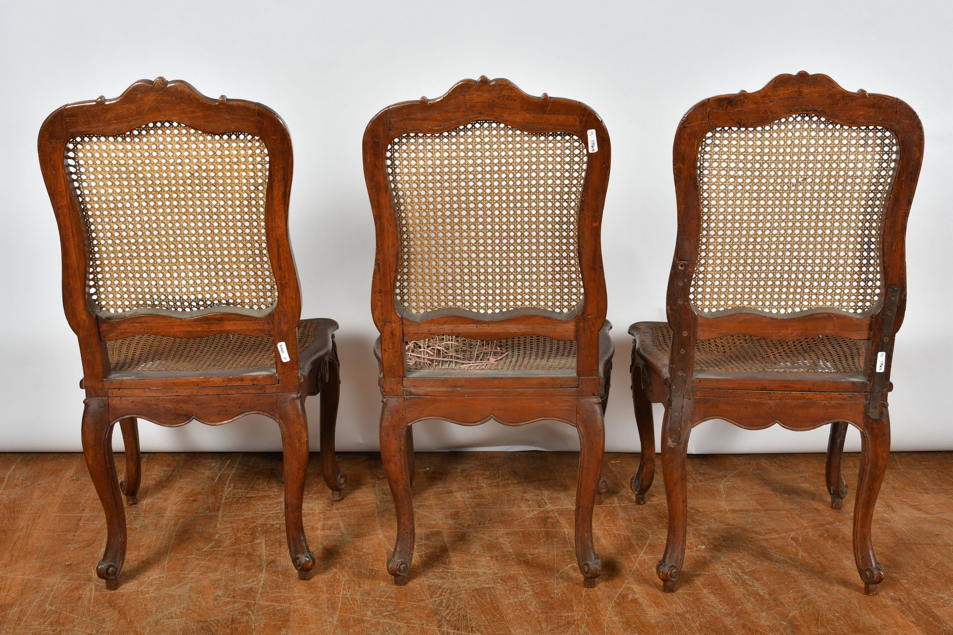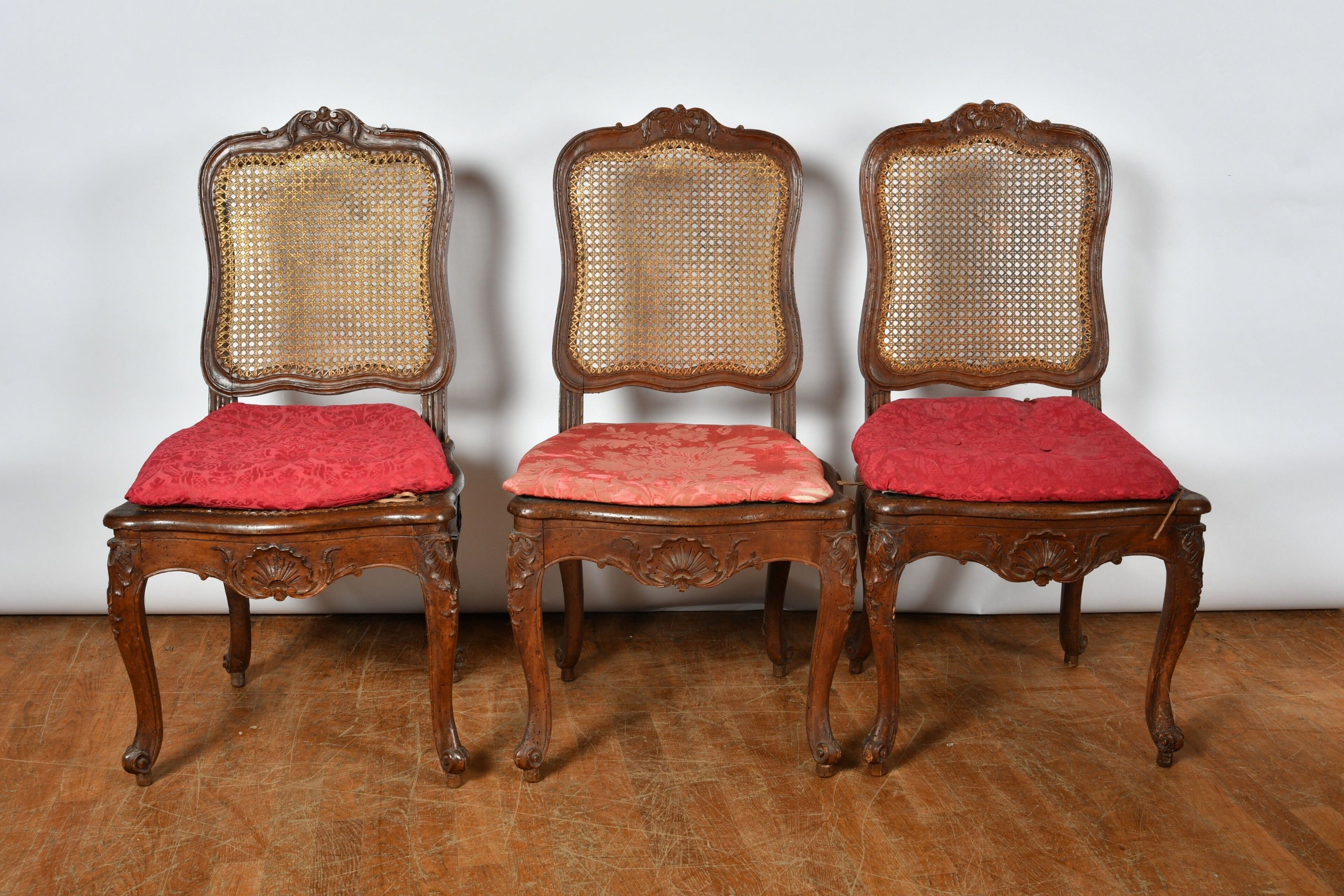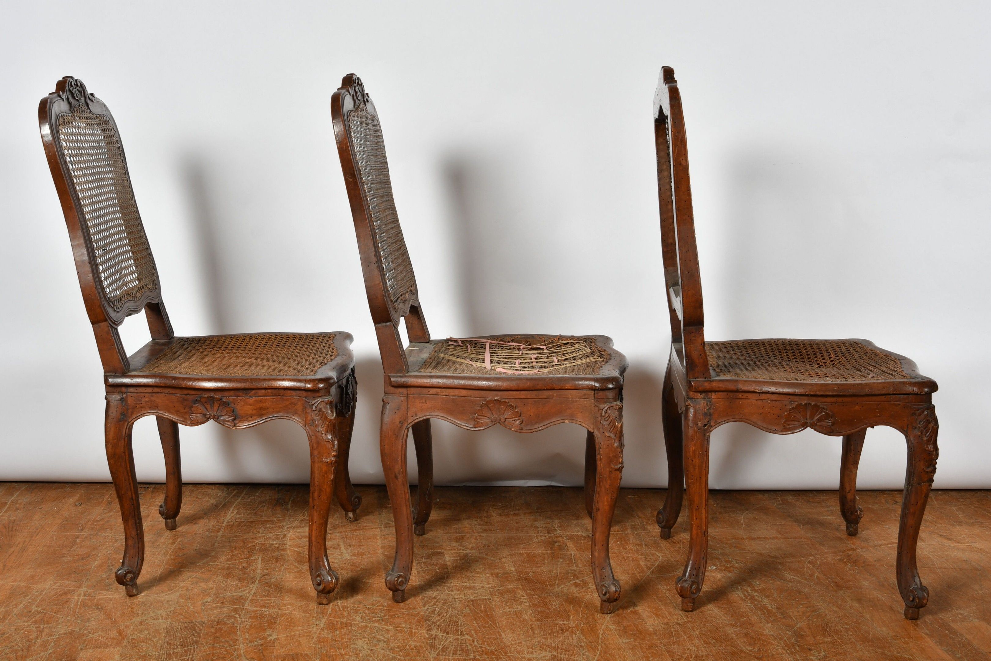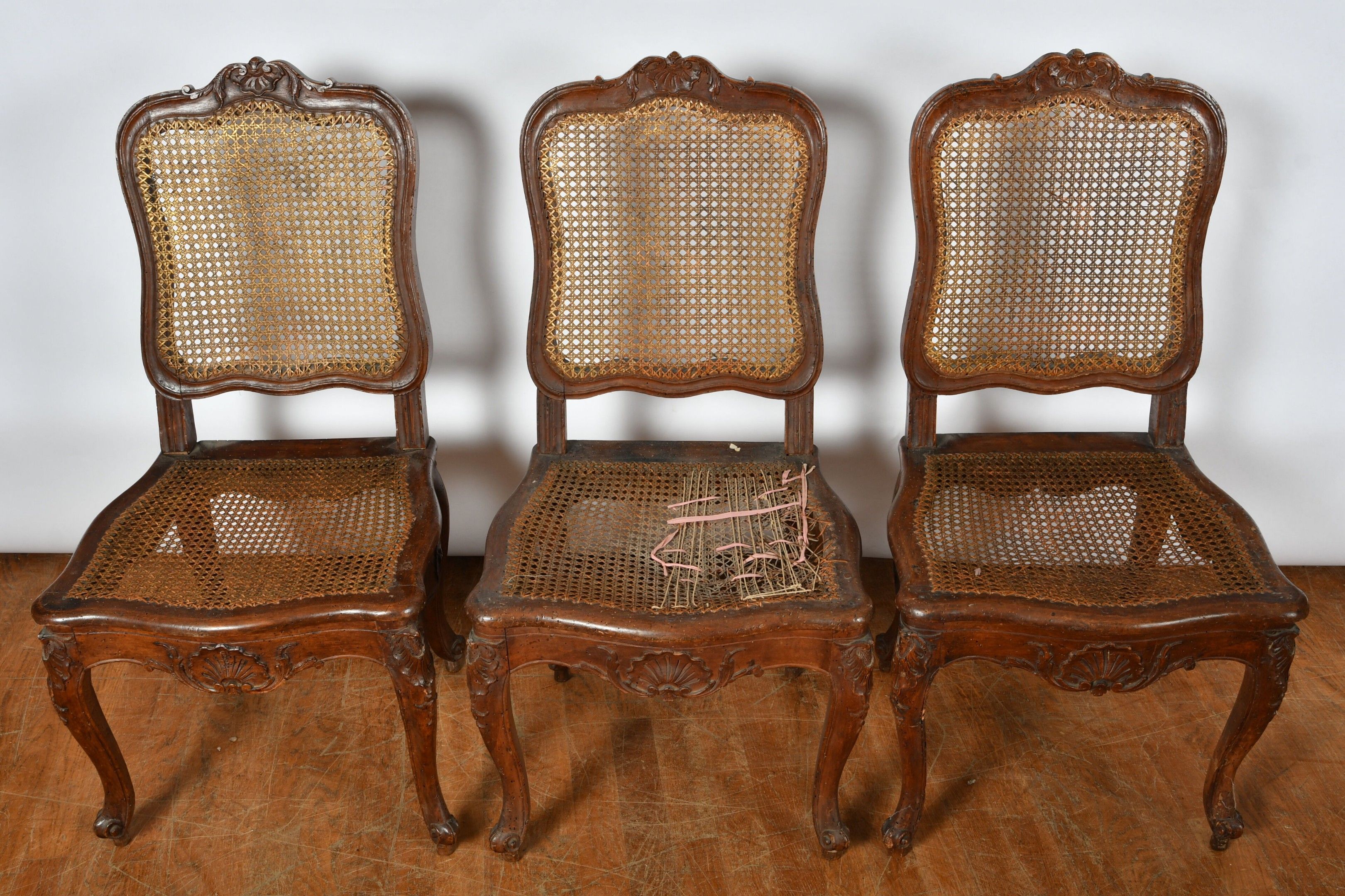 CHAIRS (suite of three) with foment filleted seat and cane back resting on cambered legs. Decorated with foliage and scrolls. Louis XV style (two with damaged seats). There is also a chair in the same style but with X braces. H. 97,5 cm (accidents, wear and restorations).