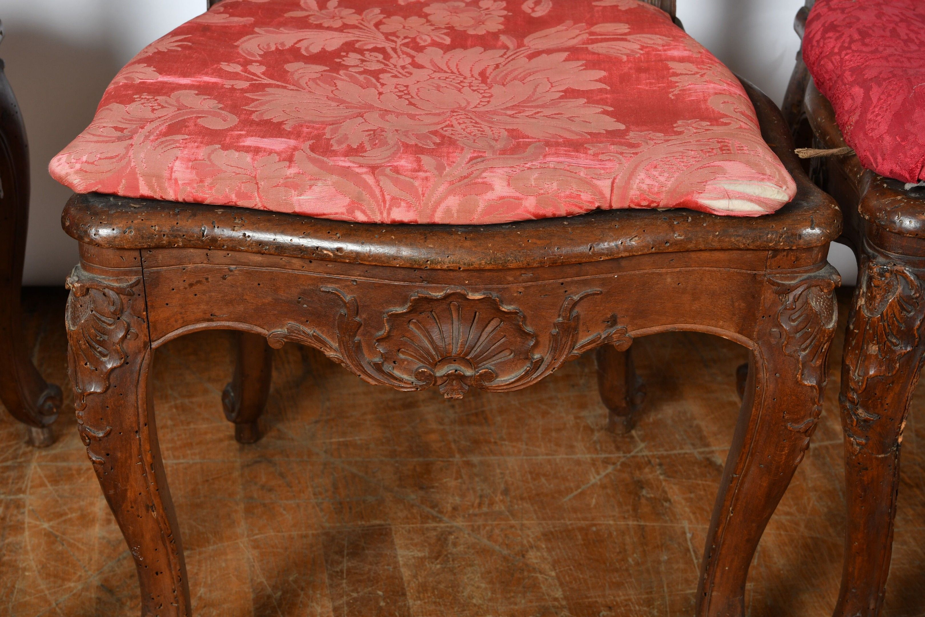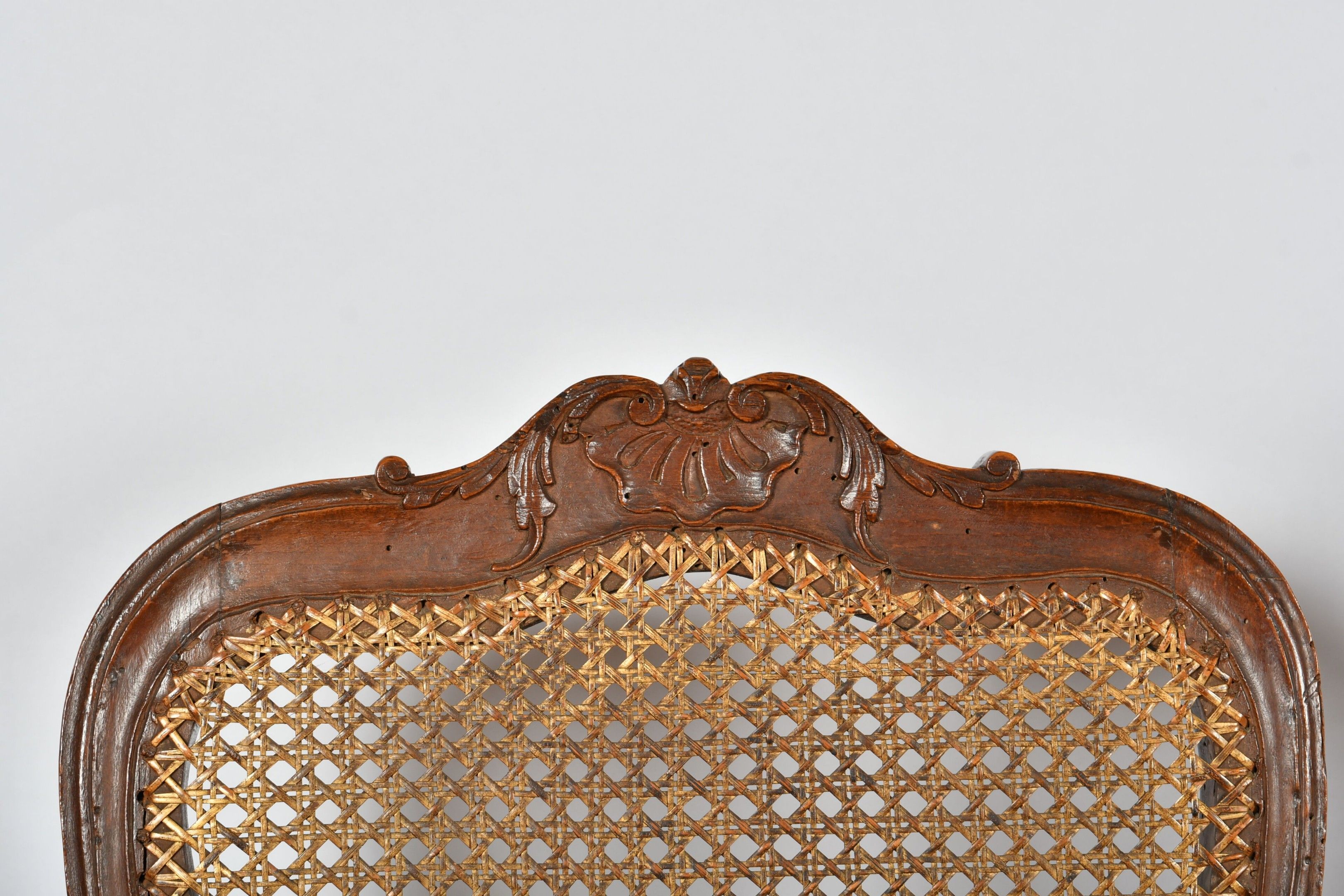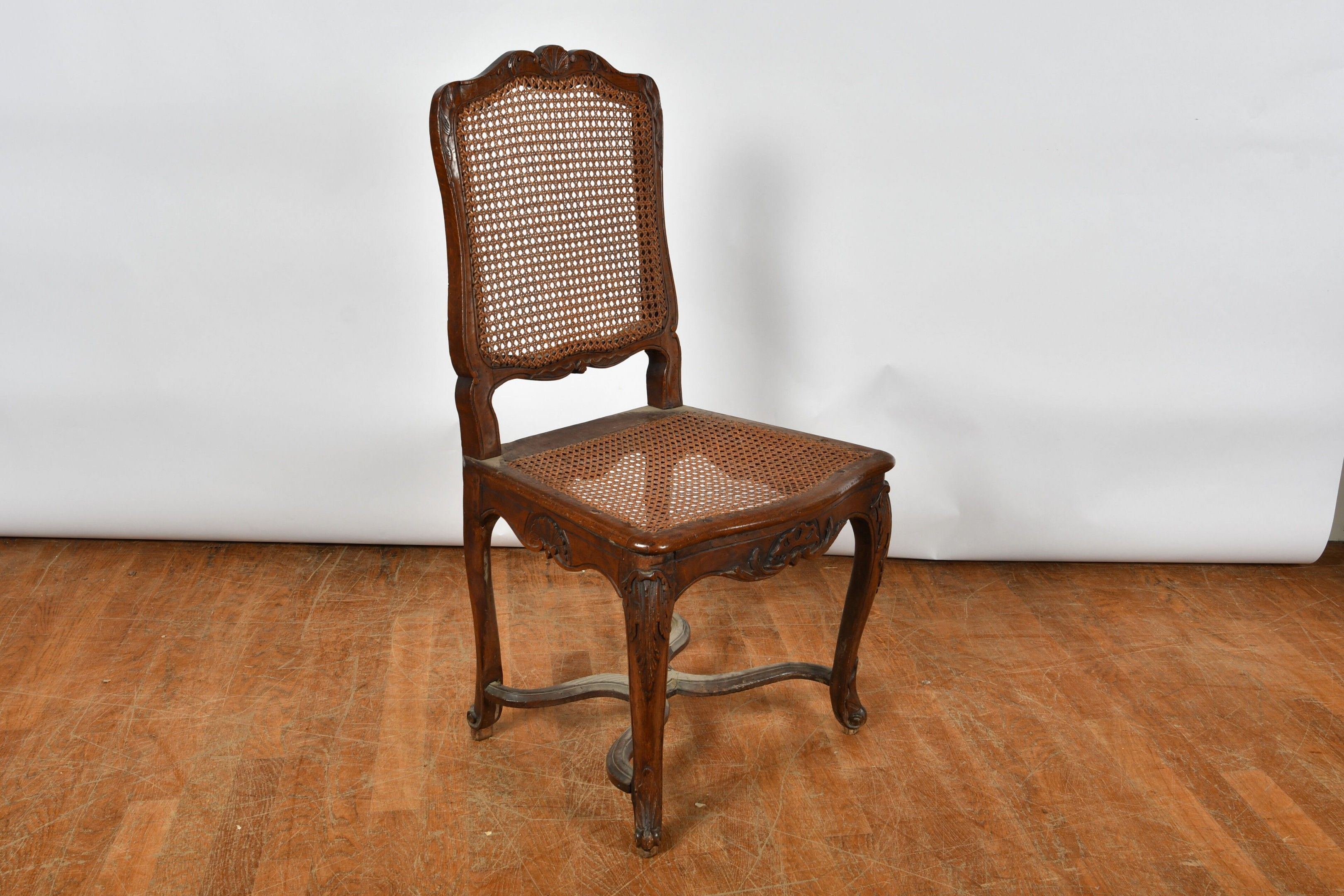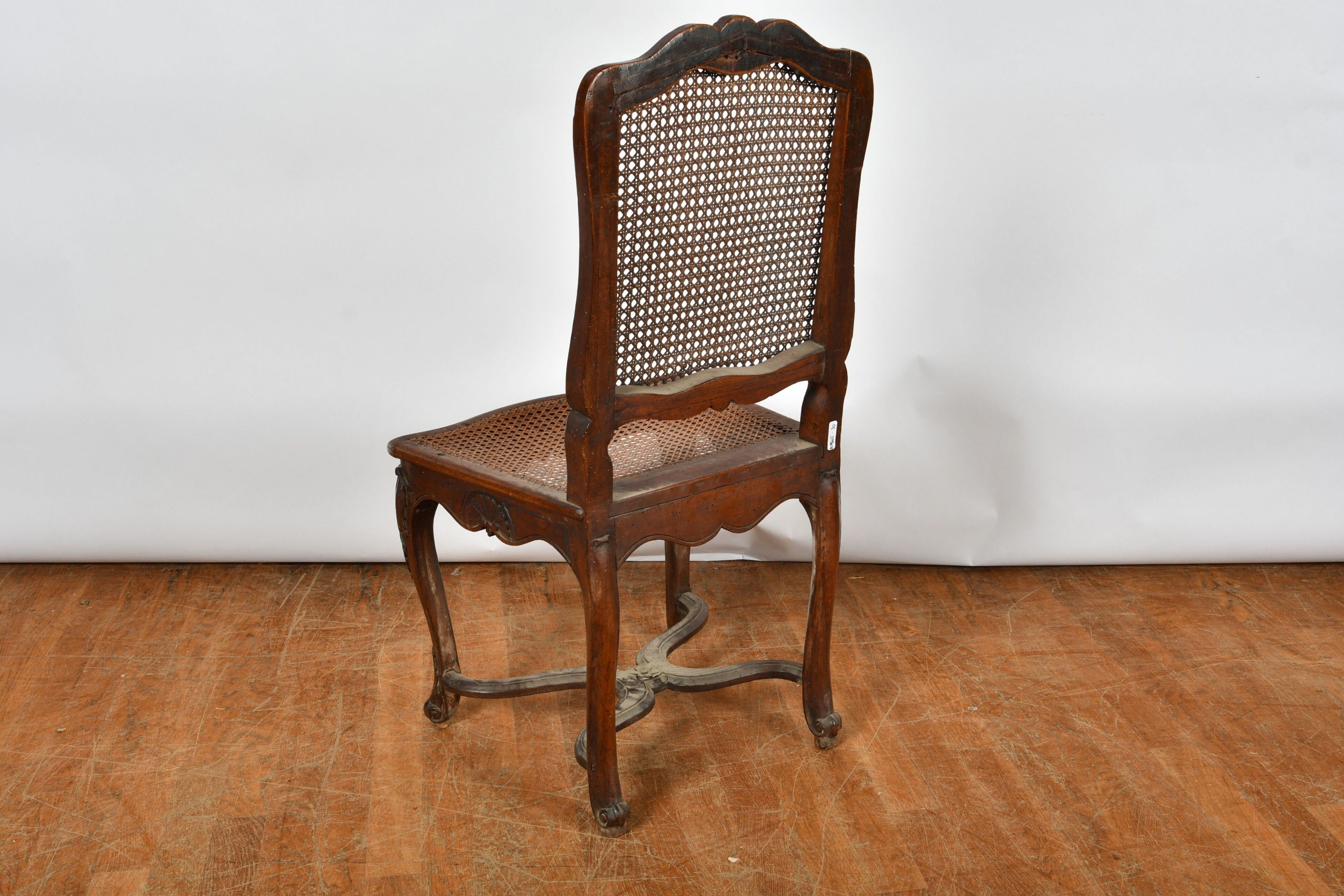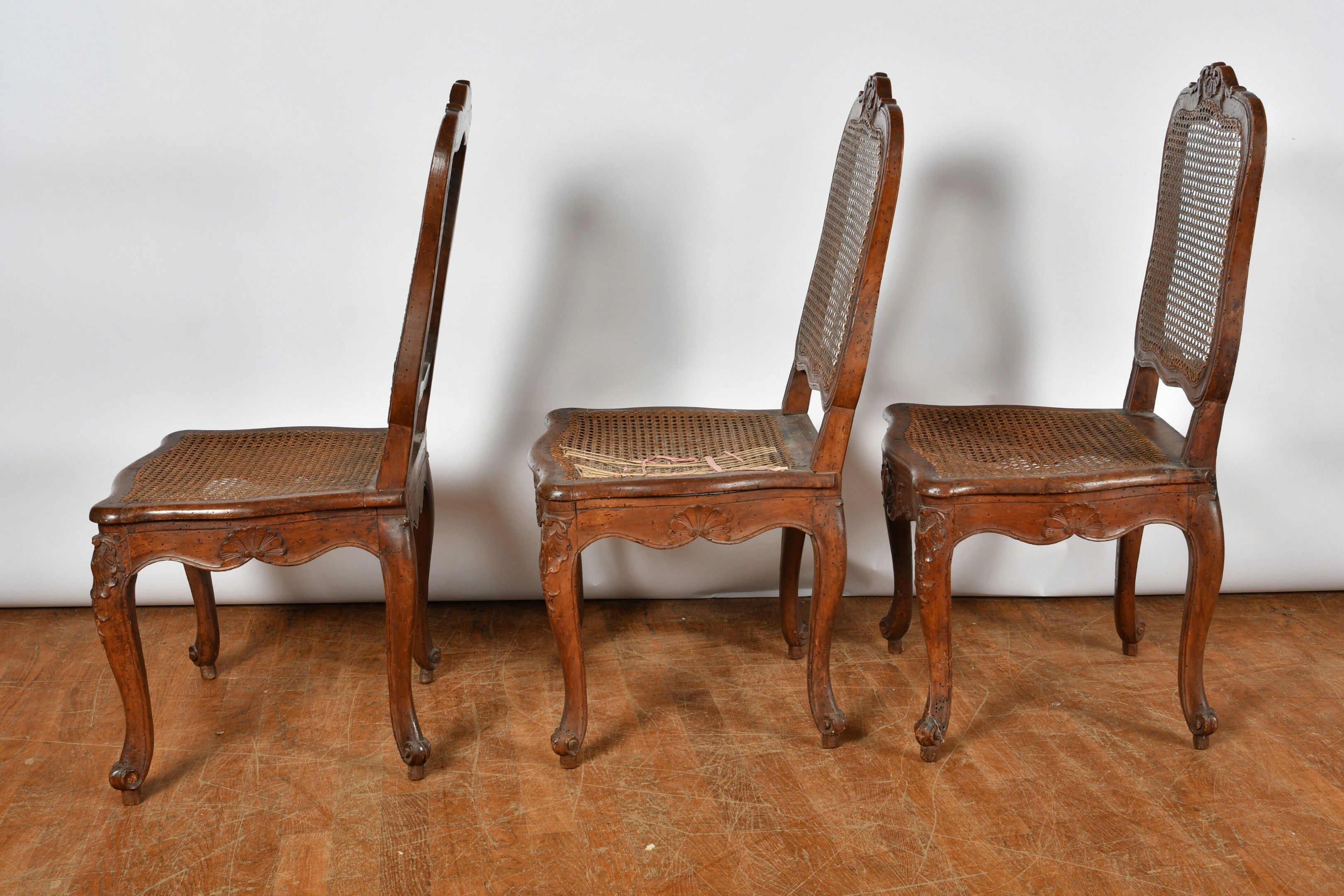 CHAIRS (suite of three) with foment filleted seat and cane back resting on cambered legs. Decorated with foliage and scrolls. Louis XV style (two with damaged seats). There is also a chair in the same style but with X braces. H. 97,5 cm (accidents, wear and restorations).