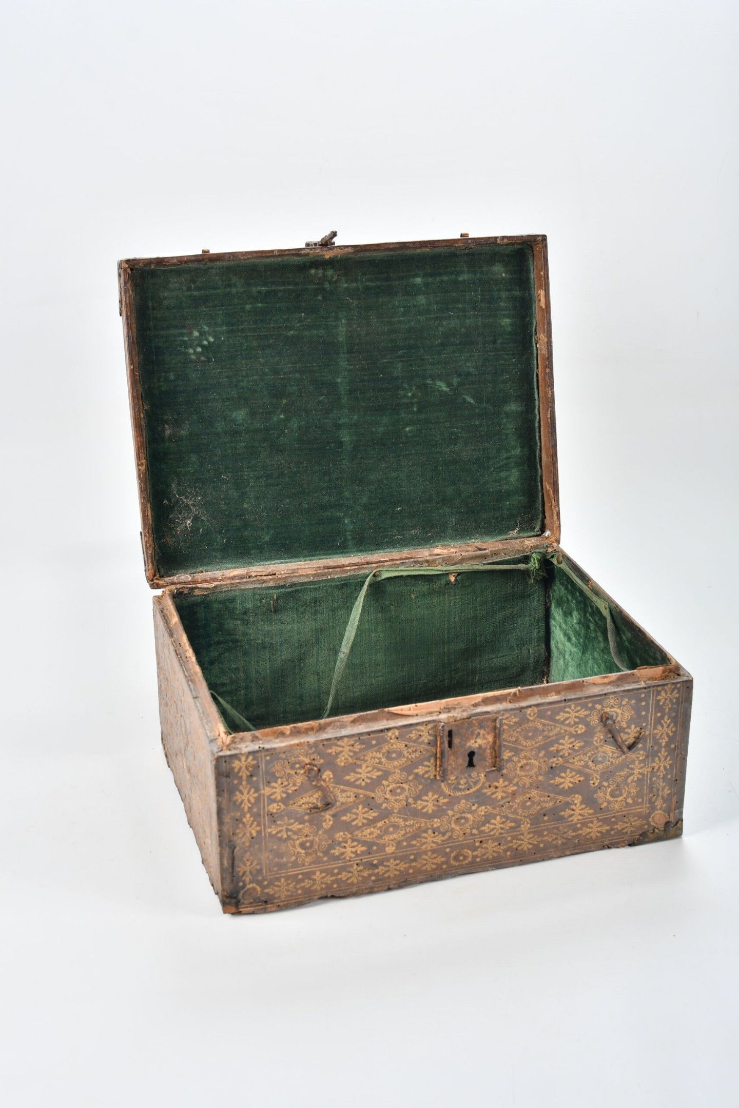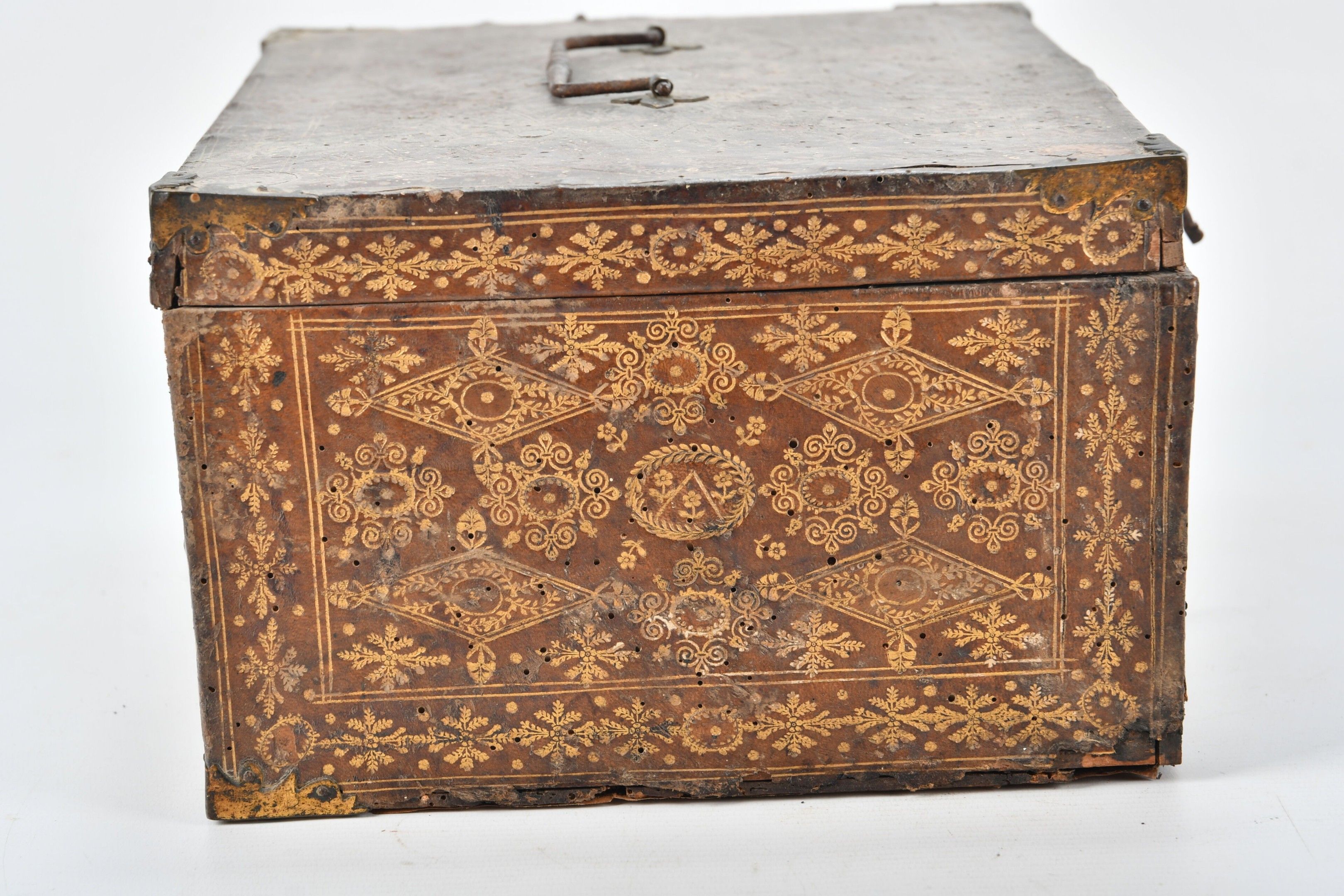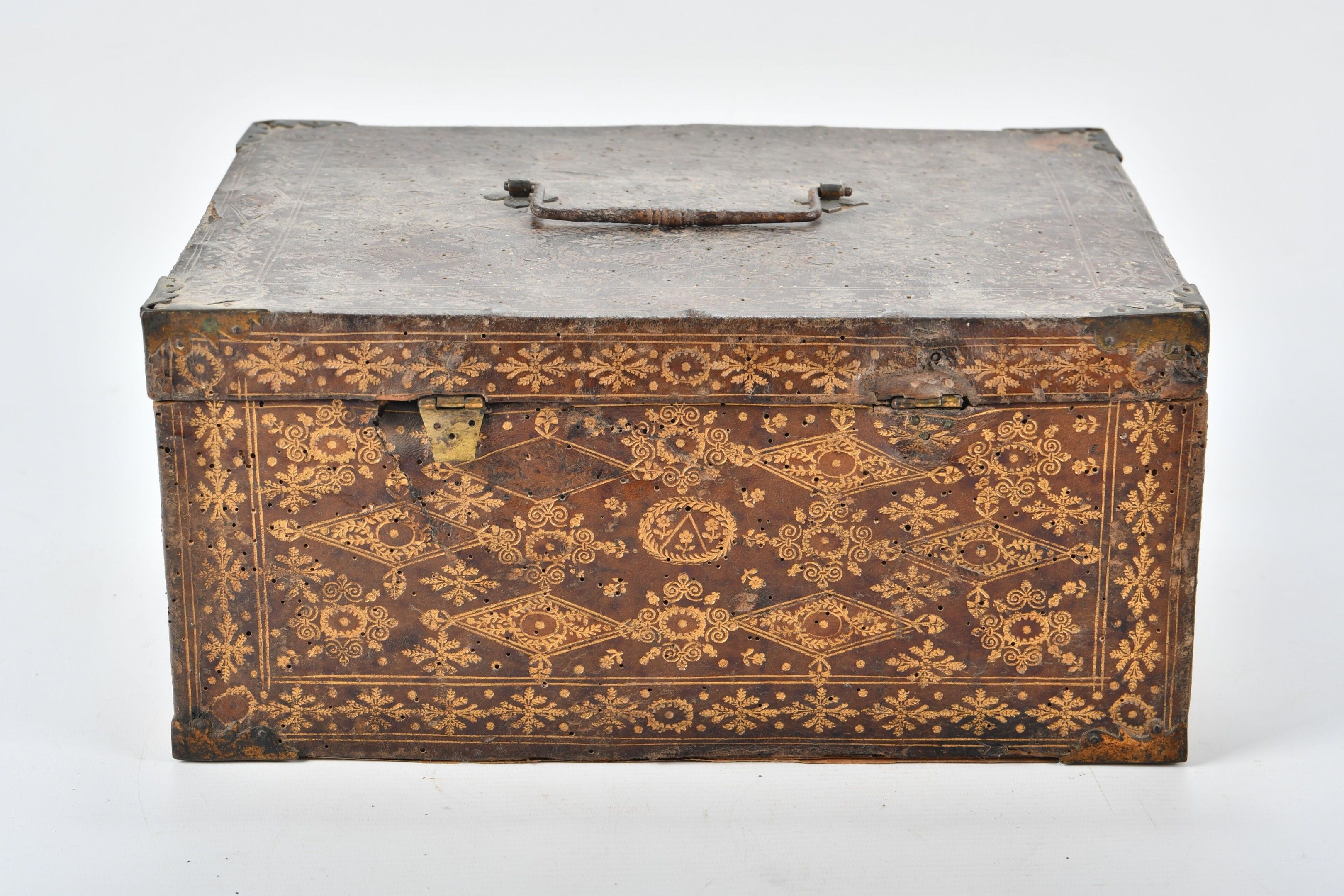 Cubic-shaped wooden case, leather-covered, with stamped and gilded decoration of rosettes and diamond-shaped motifs. Handholds, lock and hooks in wrought iron. Louis XIV period; late 17th century. H. 15.5 - W. 32.5 - D. 25 cm. Wear and tear; hinges attached.