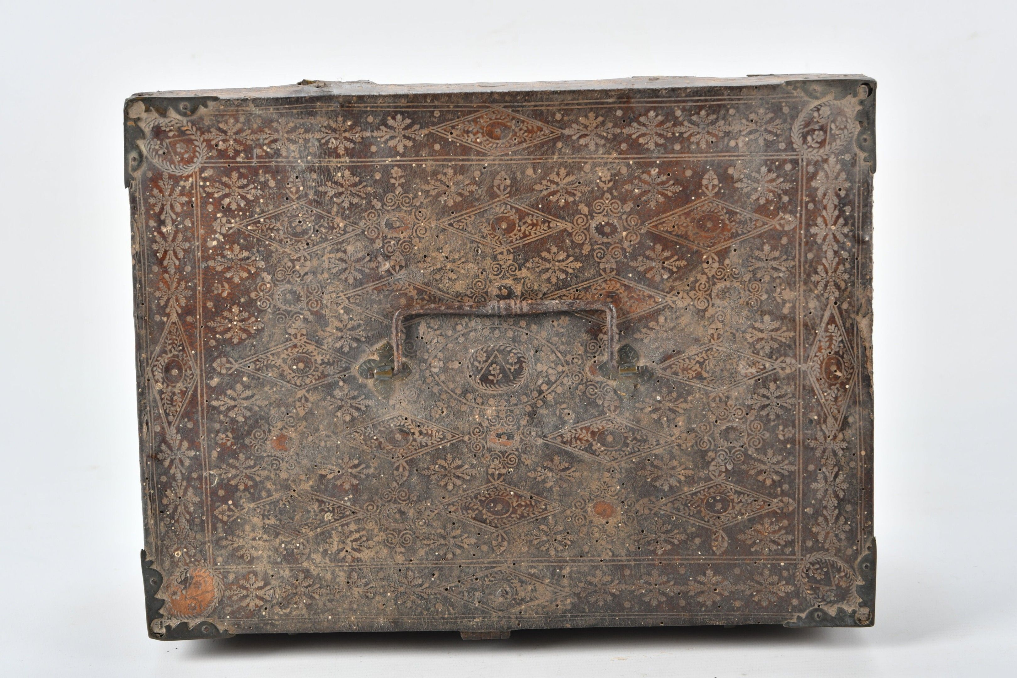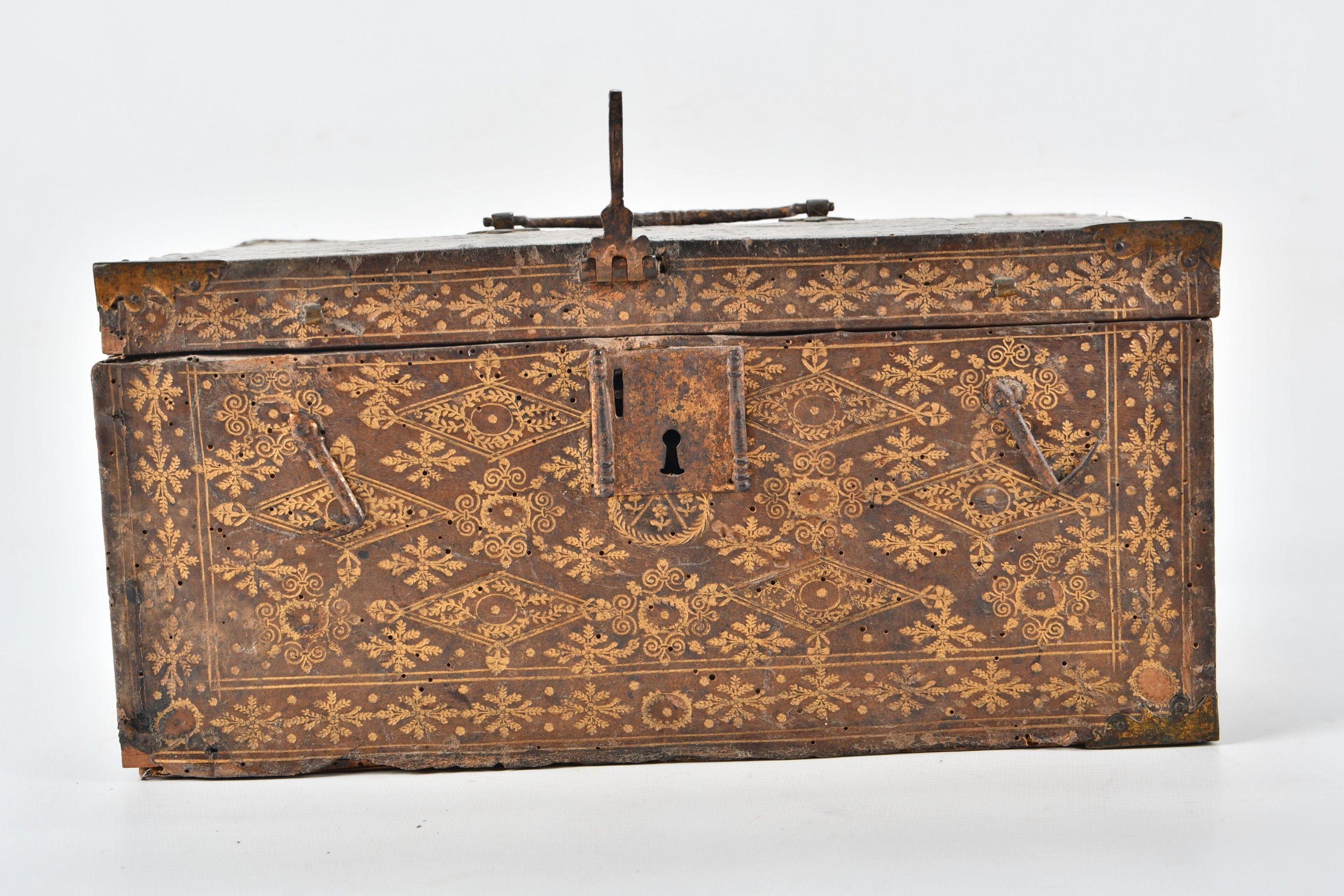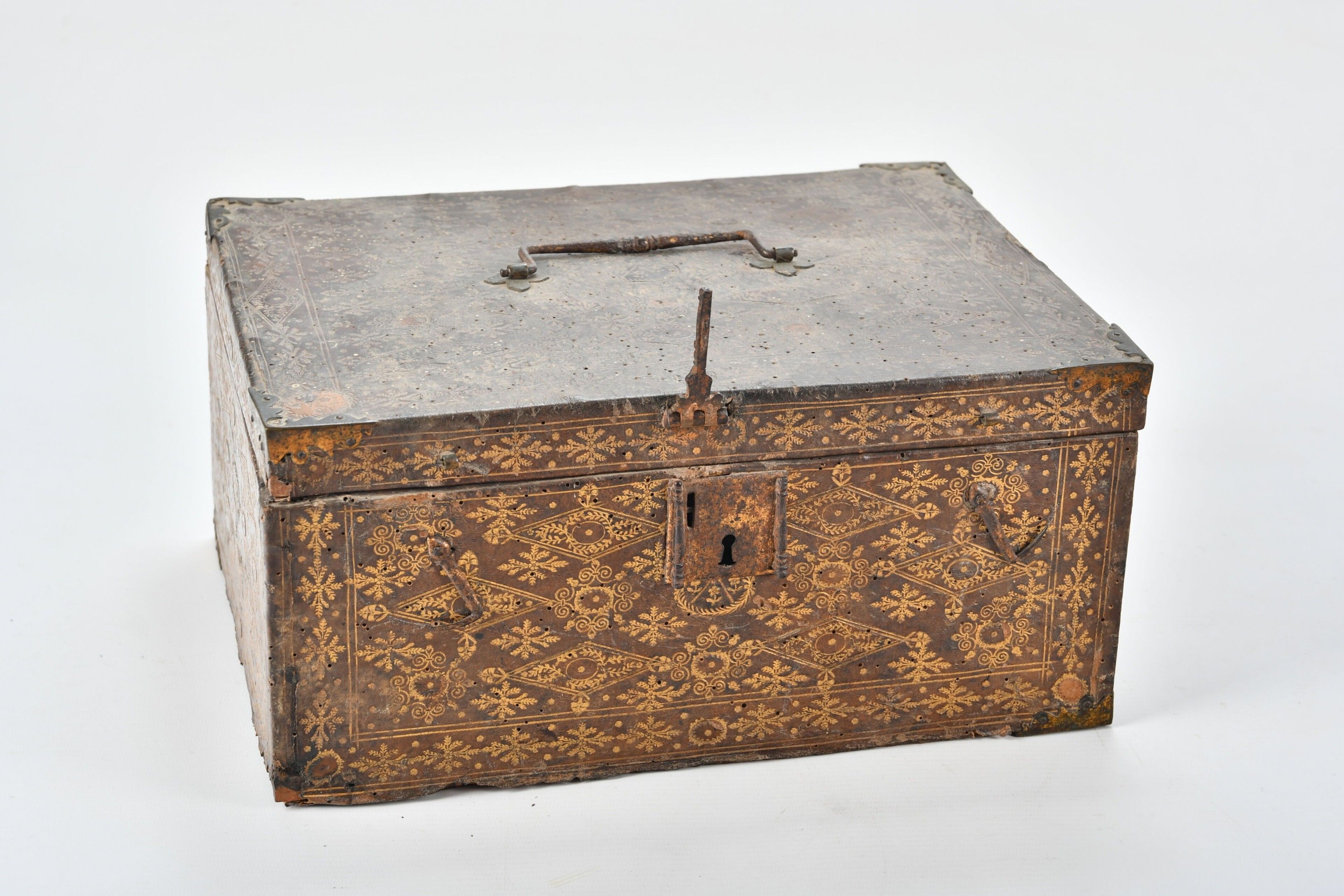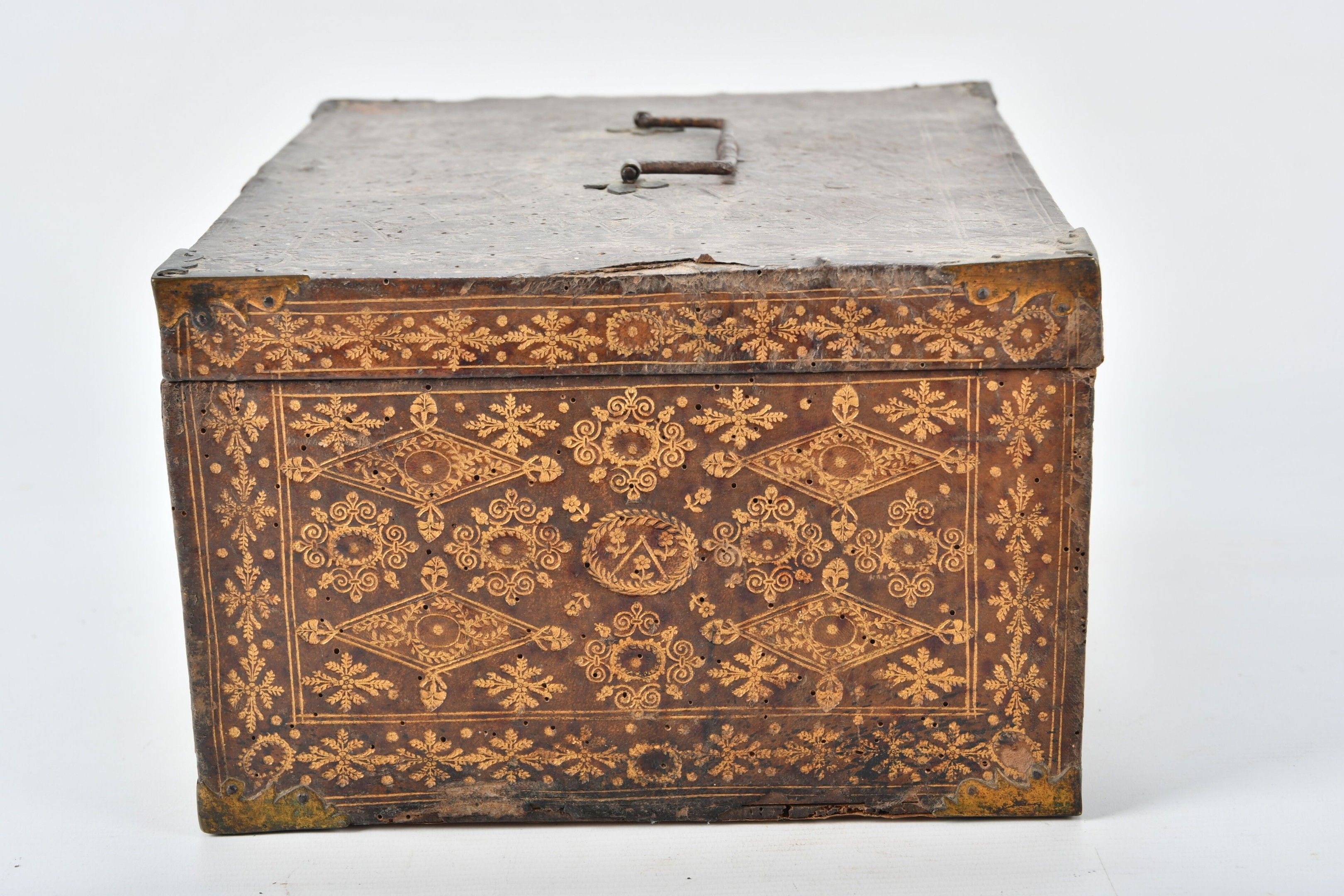 Cubic-shaped wooden case, leather-covered, with stamped and gilded decoration of rosettes and diamond-shaped motifs. Handholds, lock and hooks in wrought iron. Louis XIV period; late 17th century. H. 15.5 - W. 32.5 - D. 25 cm. Wear and tear; hinges attached.