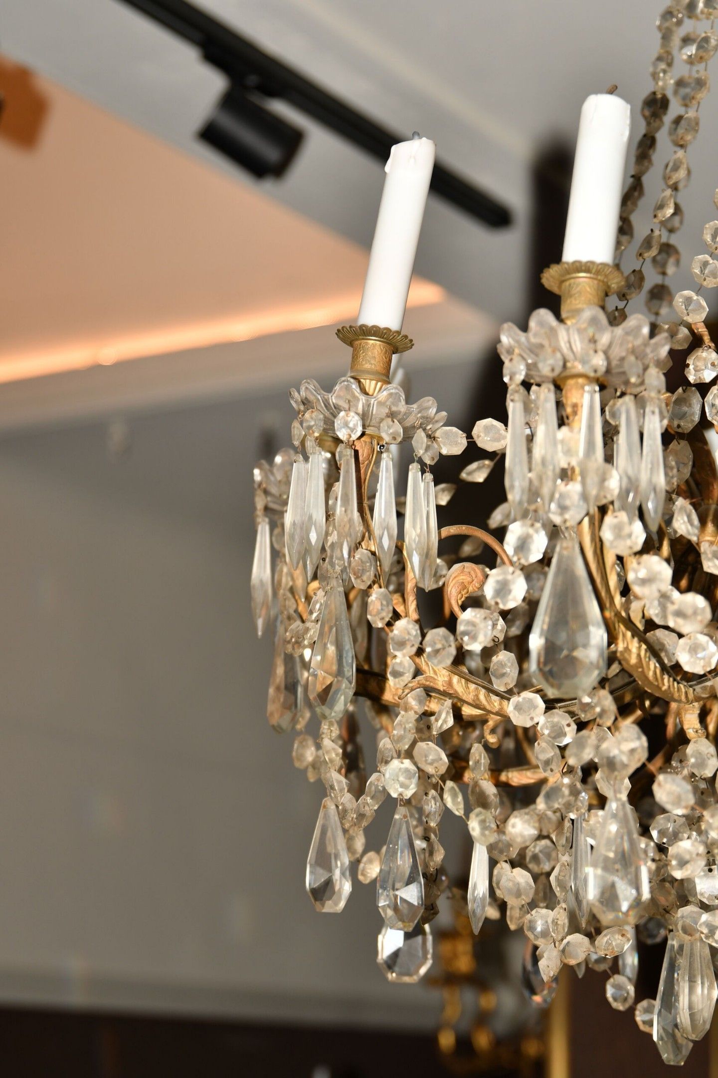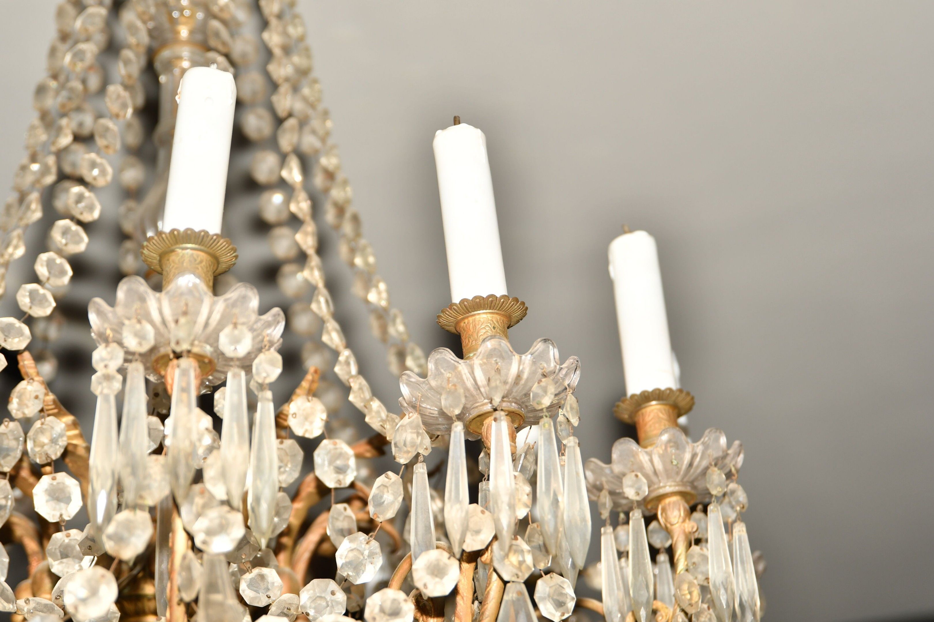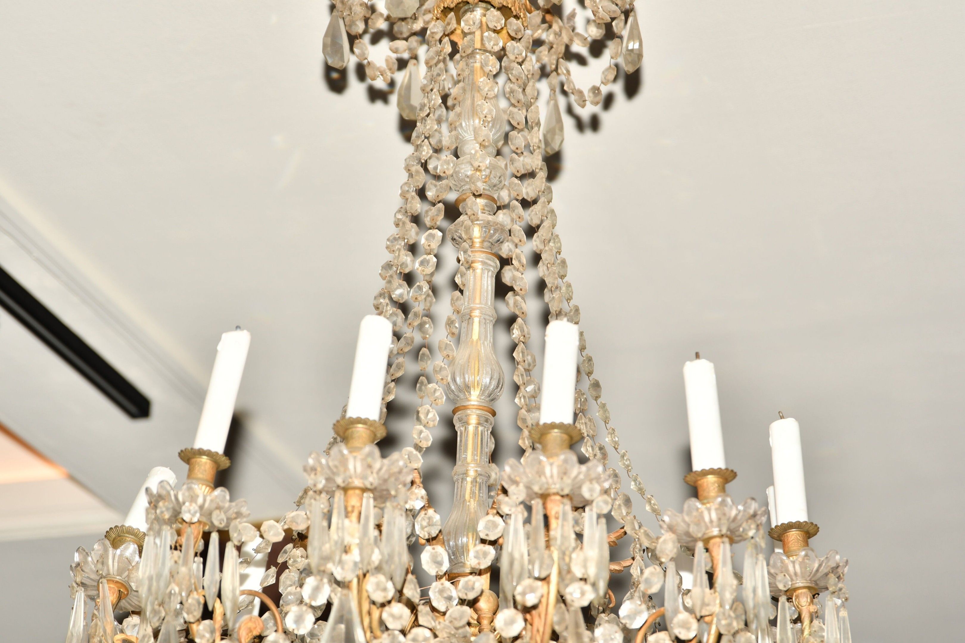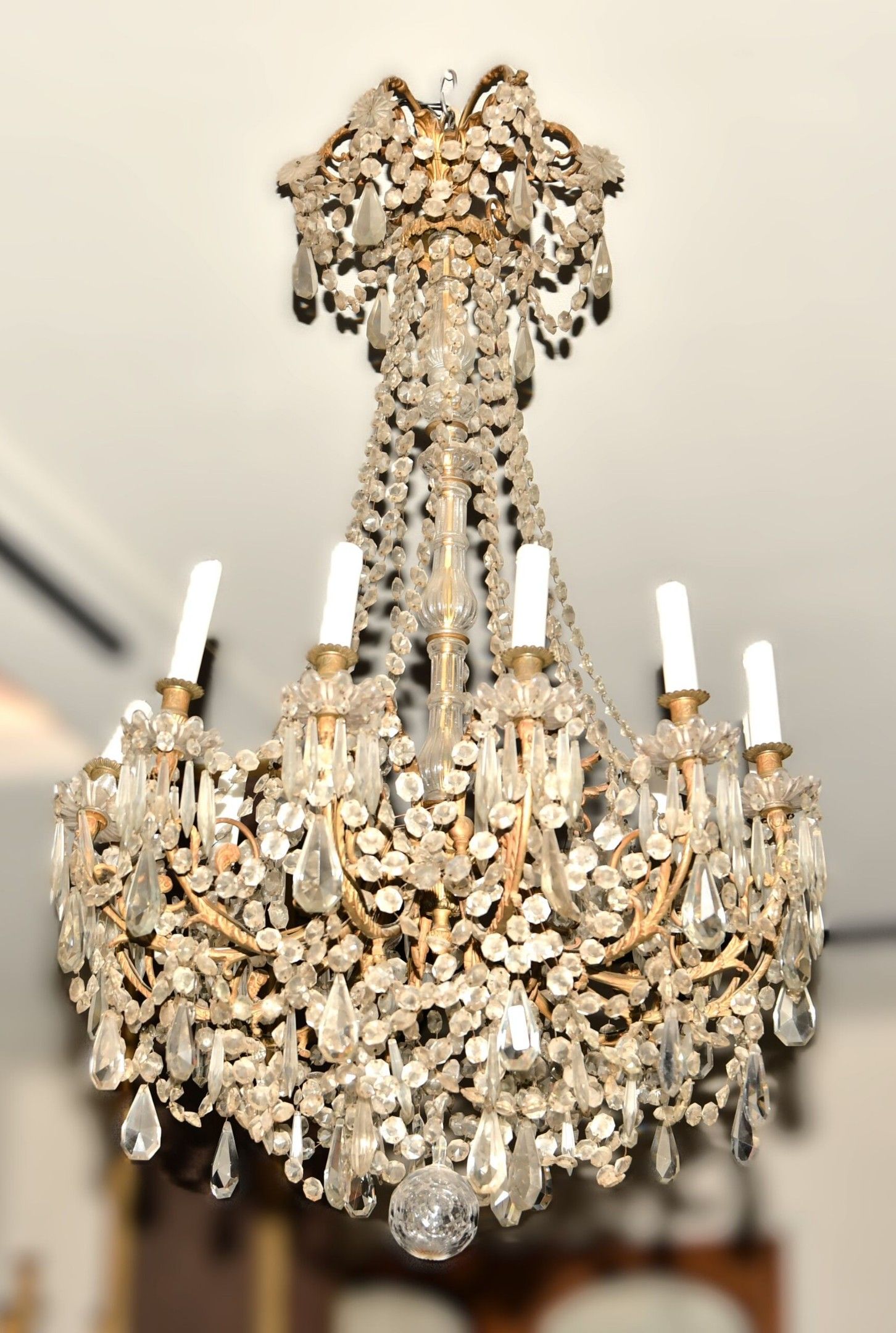 A large bronze, brass, glass and crustal chandelier decorated with pendants, pearl drops, rosettes and daggers. Illuminated by 12 bronze arms decorated with foliate scrolls. H. 135 - Diam. 80 cm