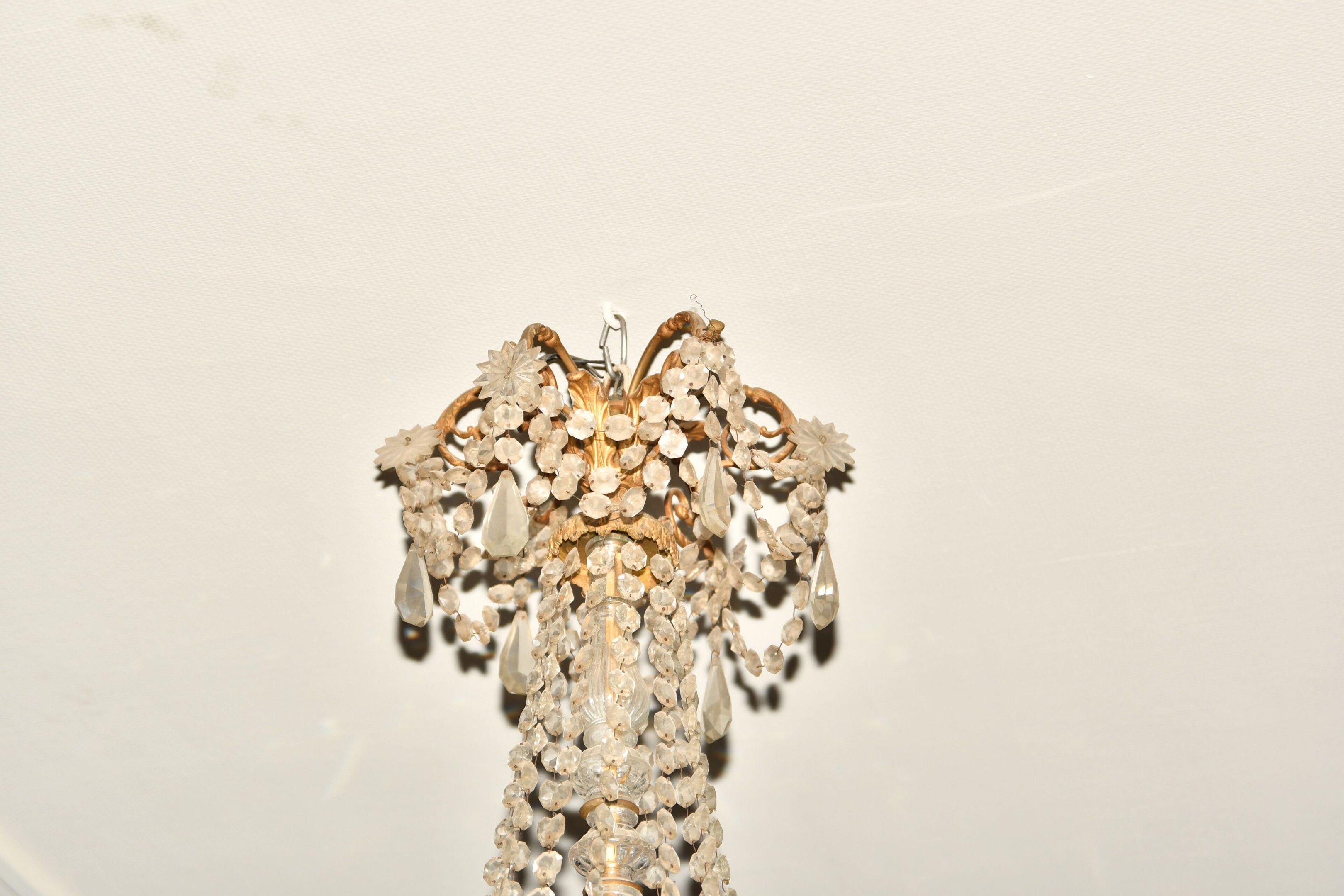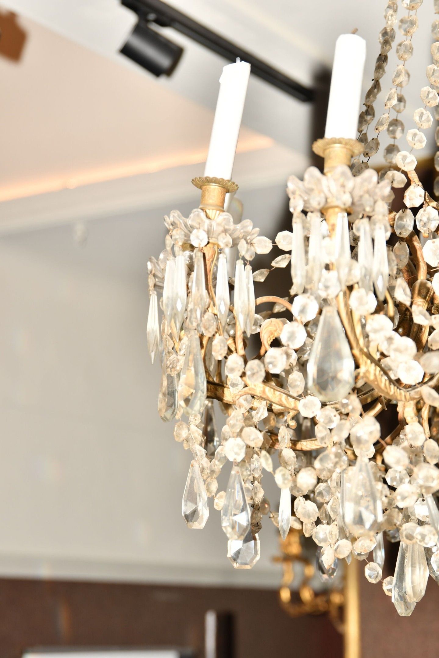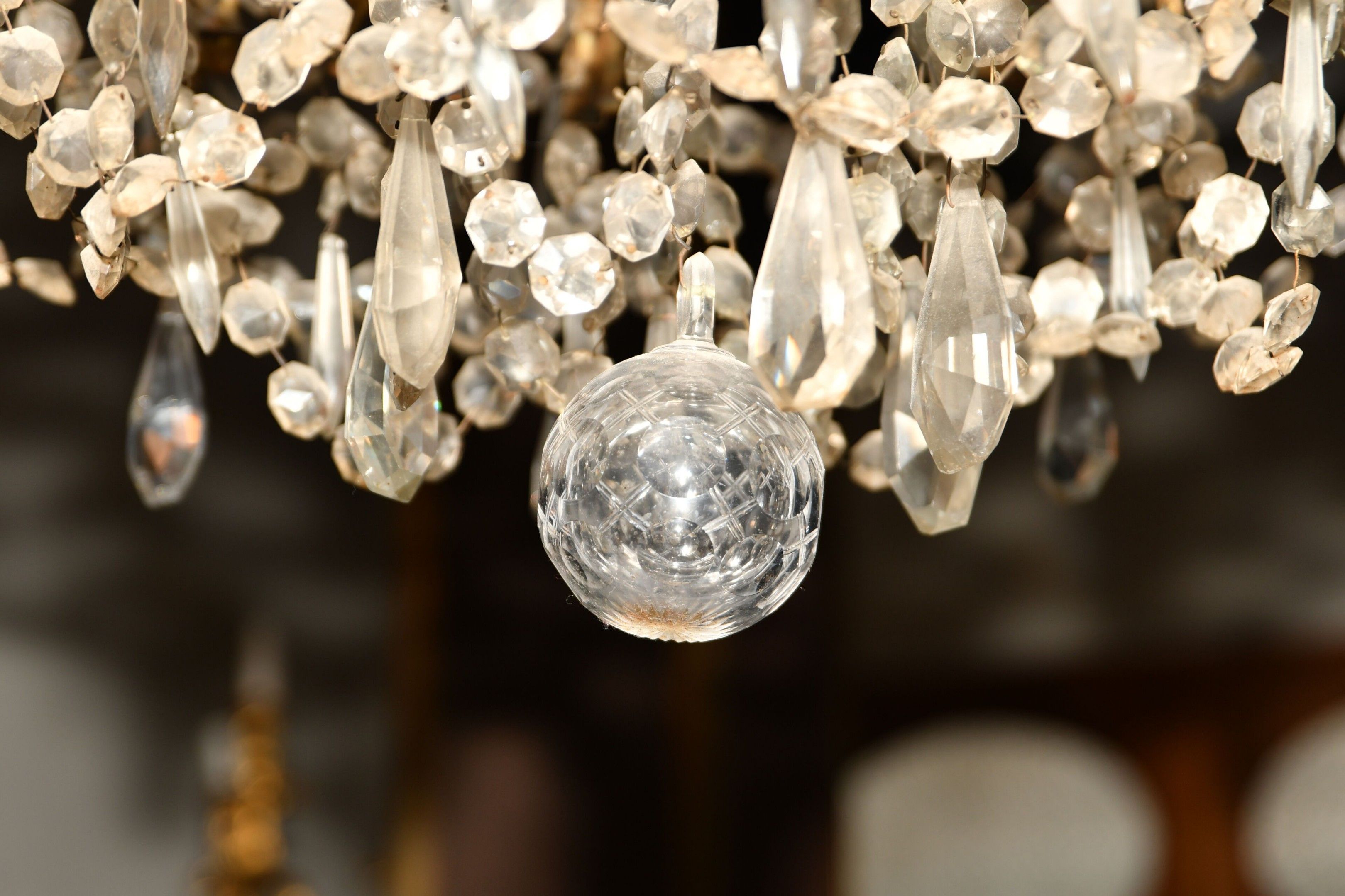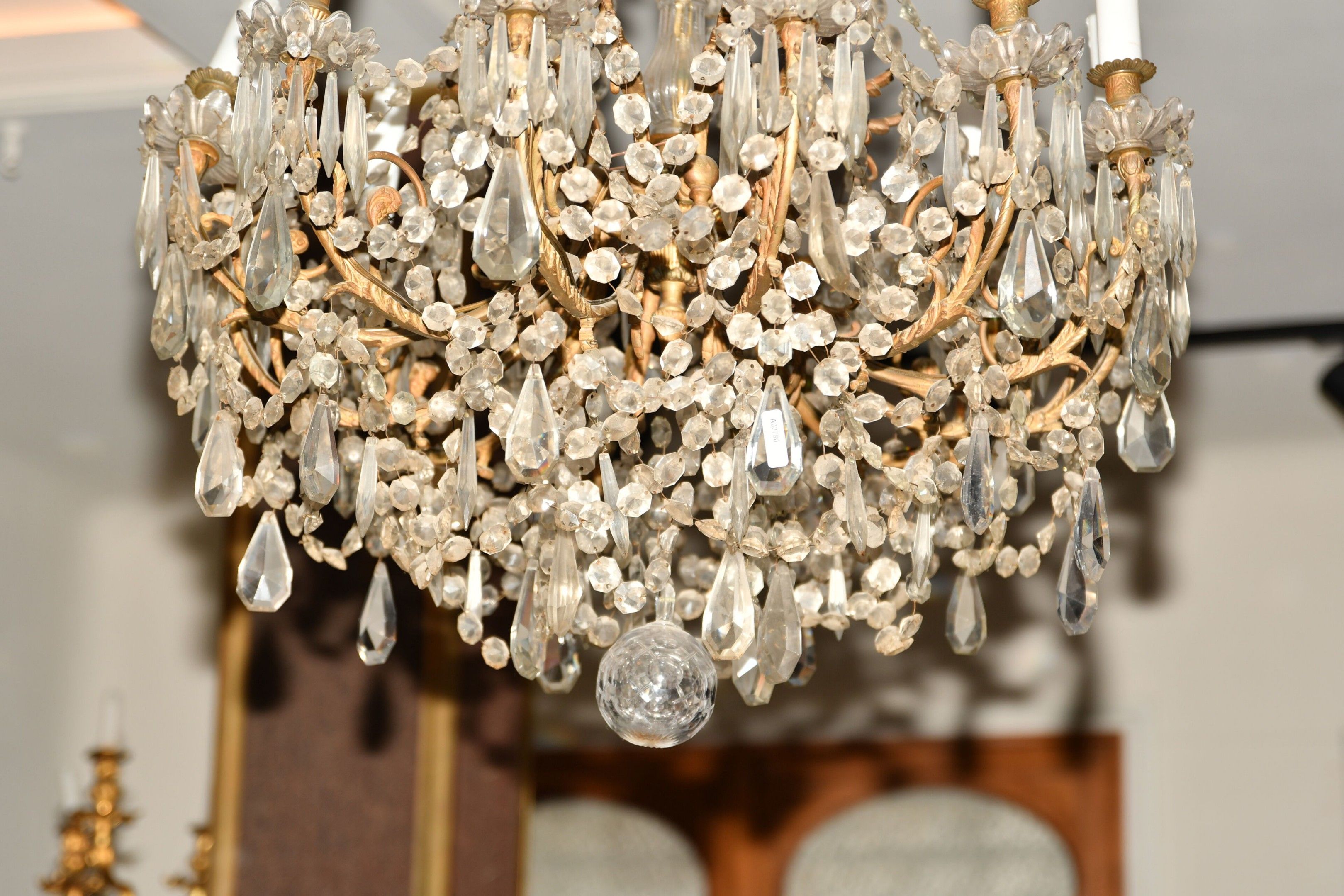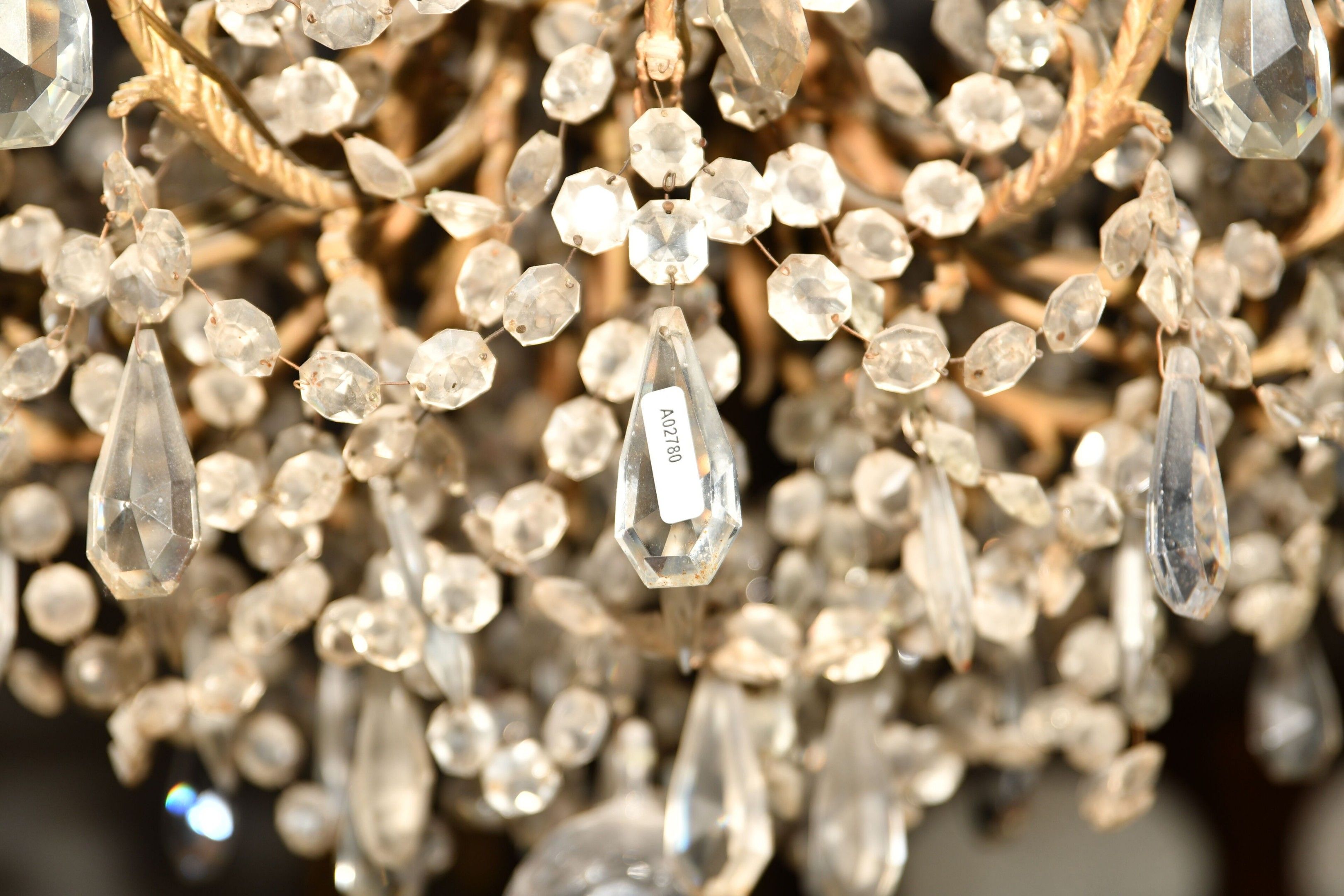 A large bronze, brass, glass and crustal chandelier decorated with pendants, pearl drops, rosettes and daggers. Illuminated by 12 bronze arms decorated with foliate scrolls. H. 135 - Diam. 80 cm