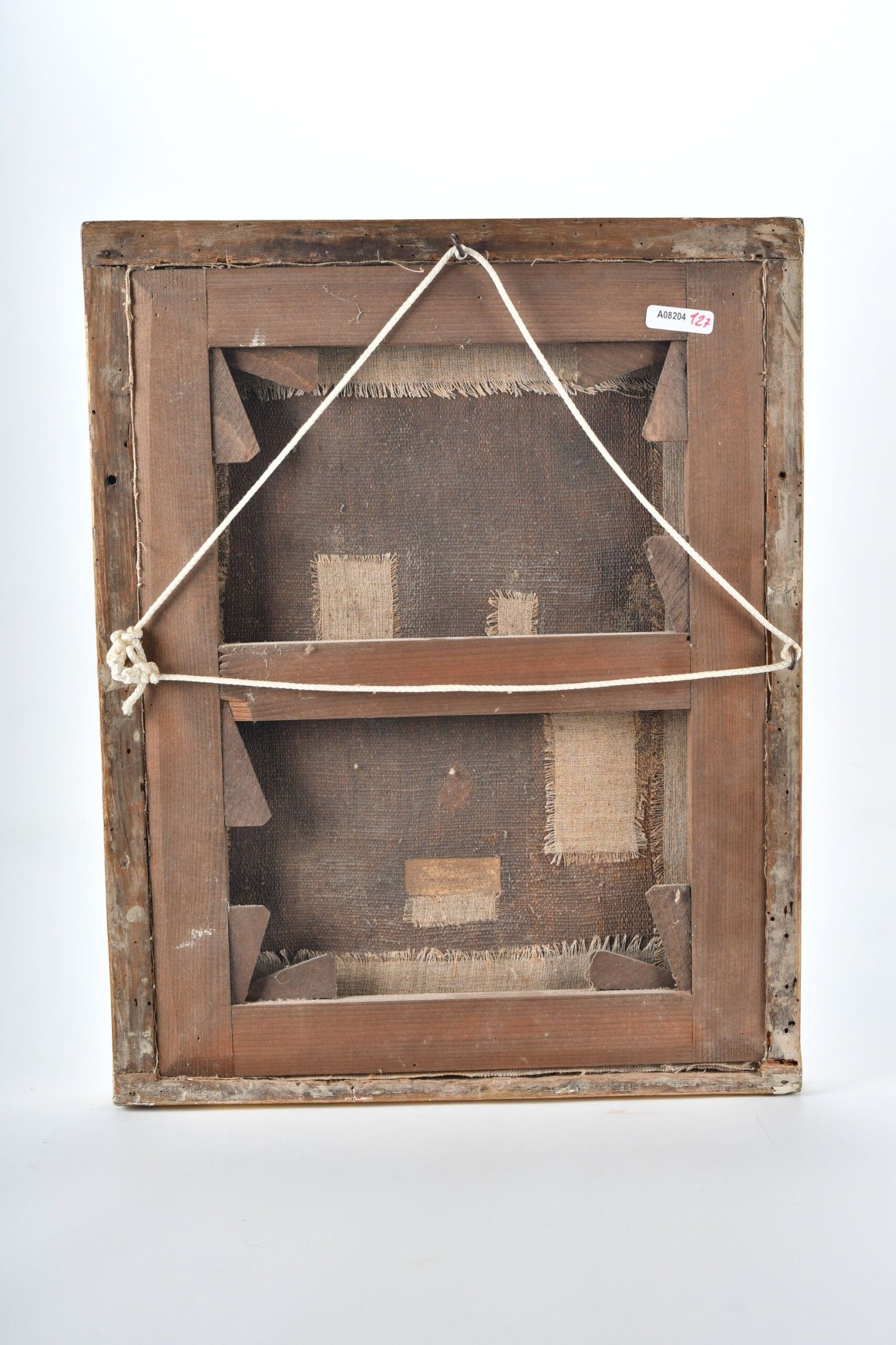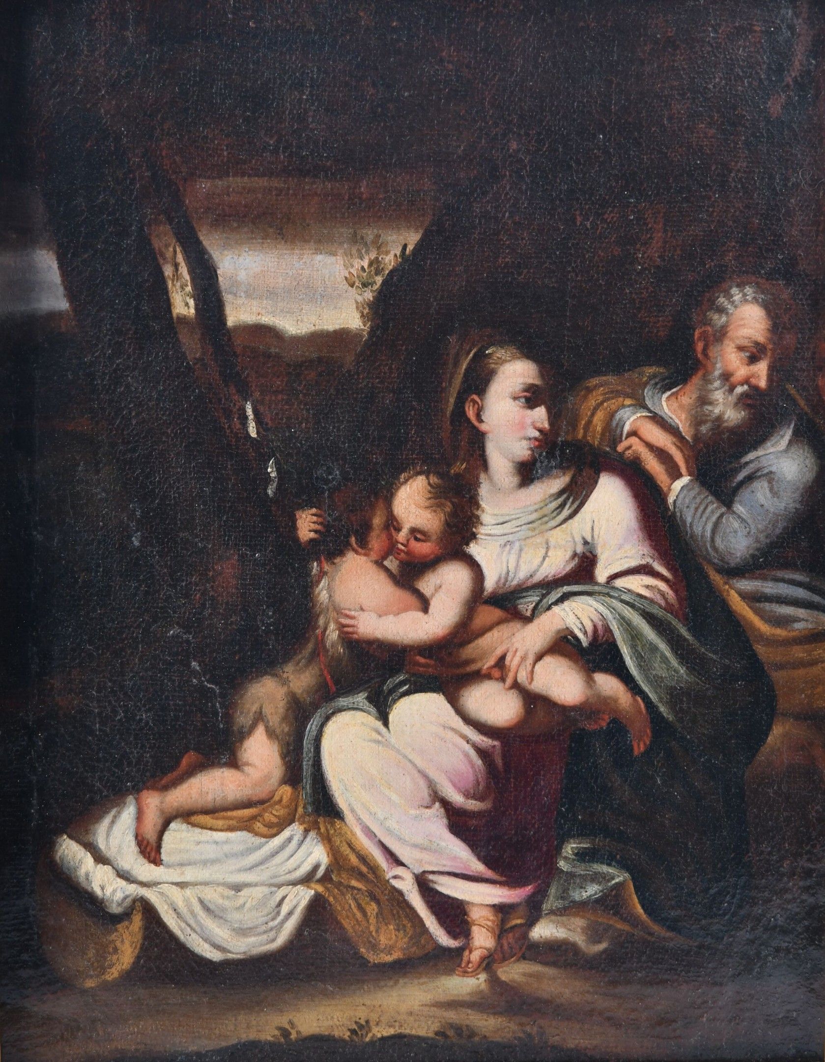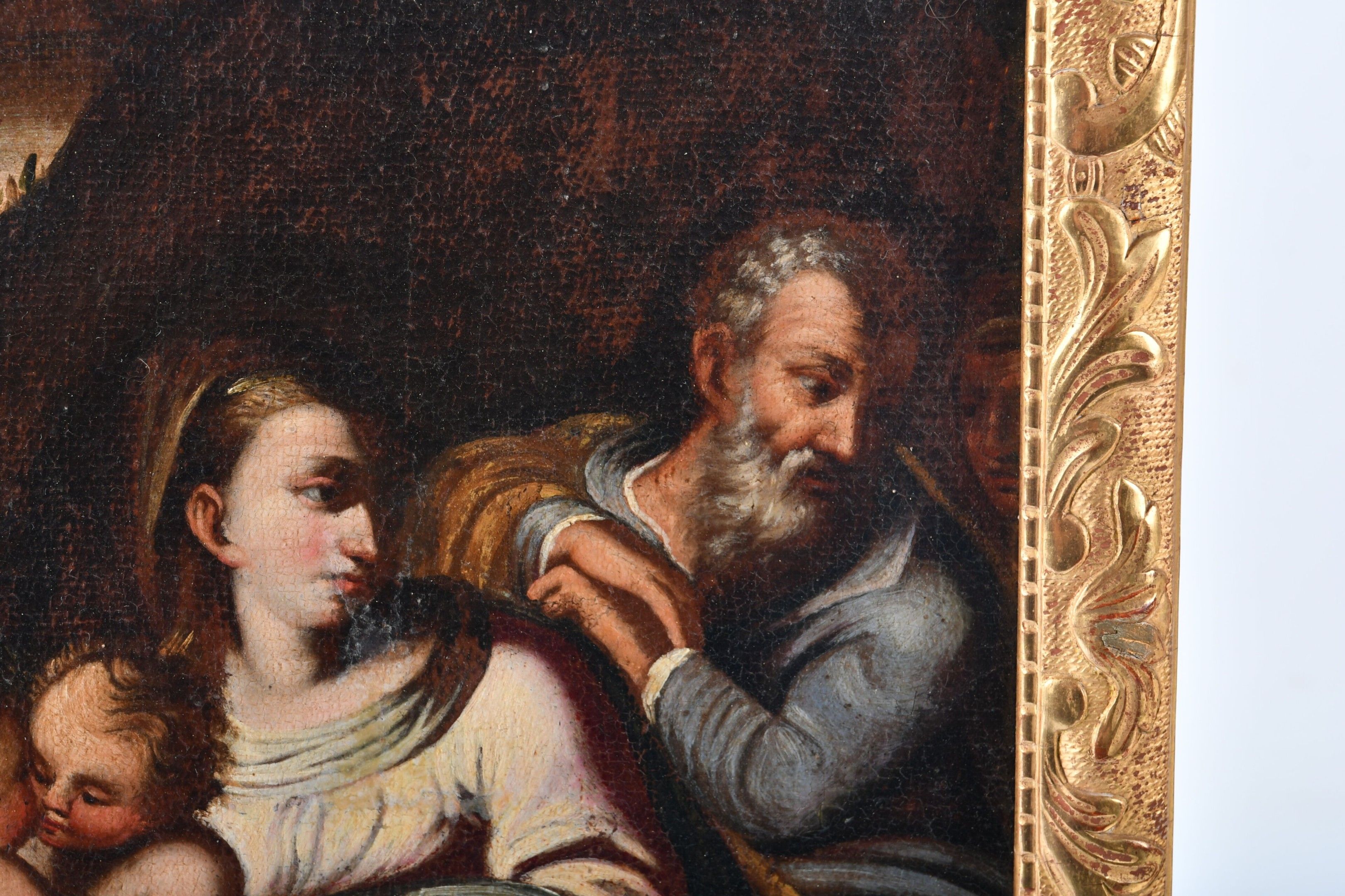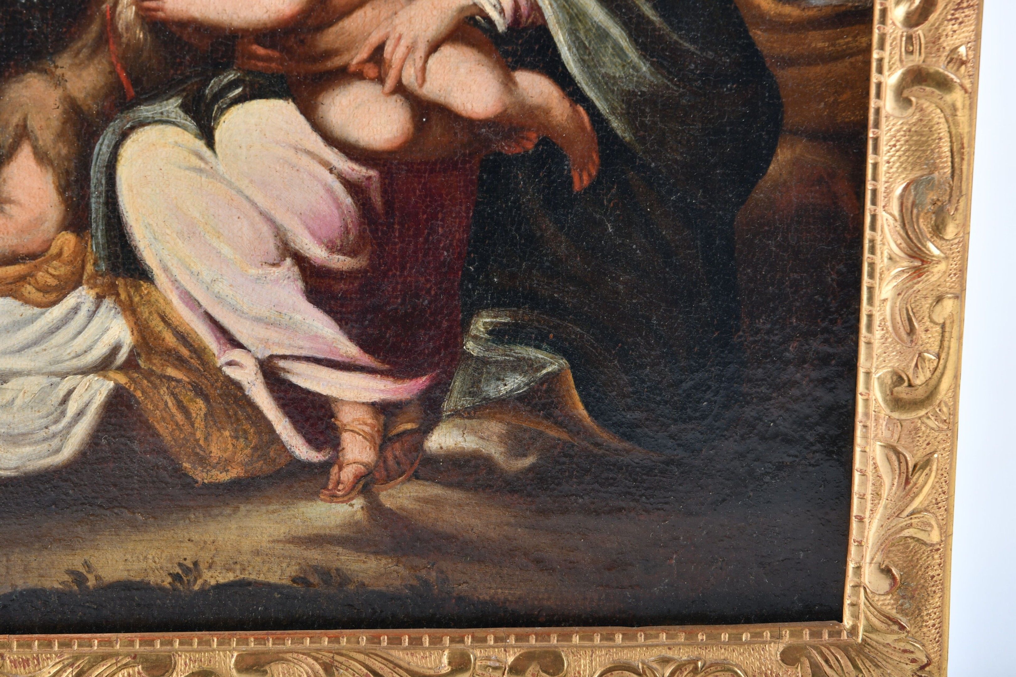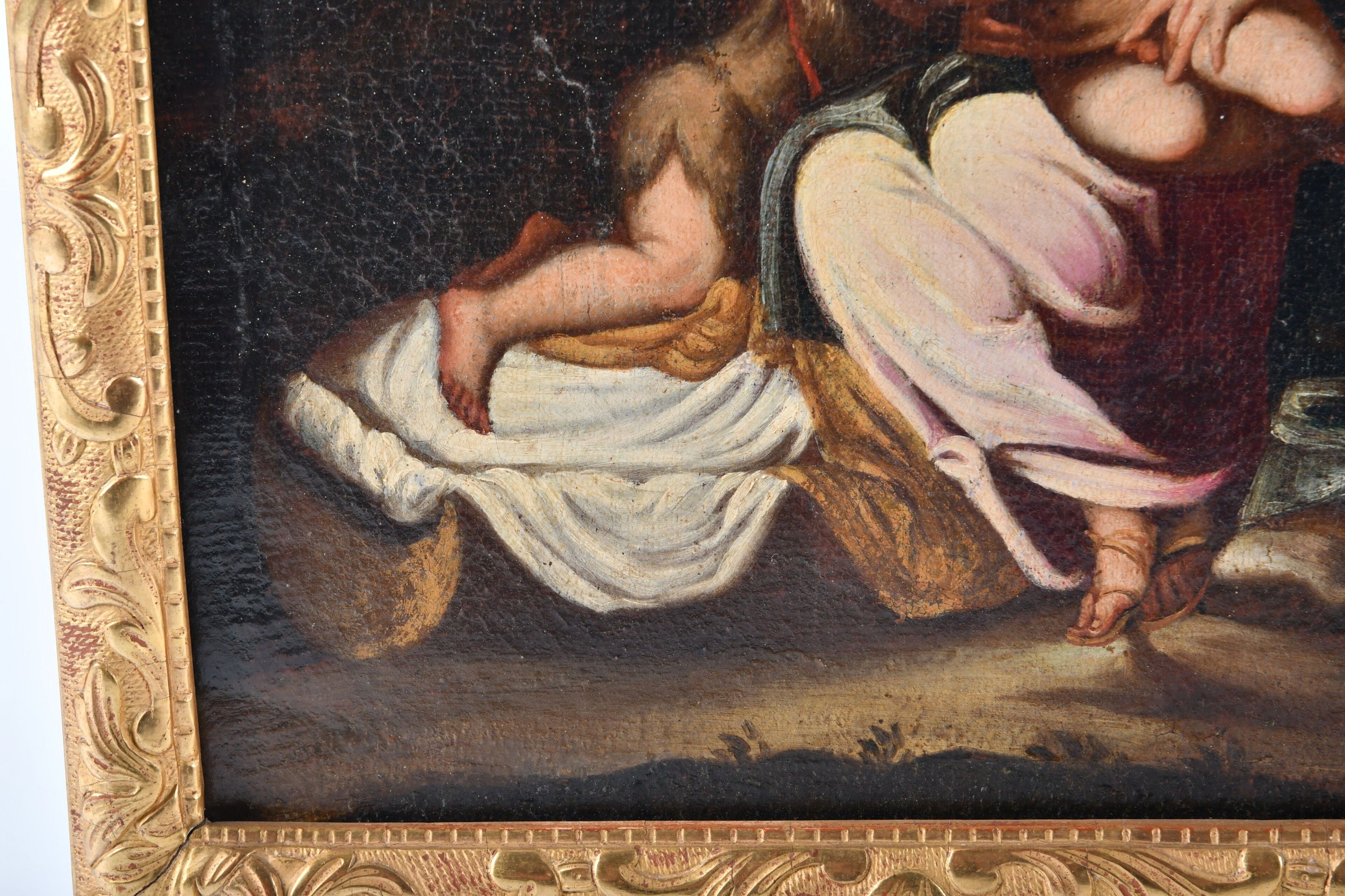 18th century FRENCH SCHOOL. "Sainte famille et St Jean Baptiste", oil on canvas. Bearing a label on the reverse "Sebastien Bourdon". 46,5 x 36 cm. Restorations. Carved and gilded wood frame.