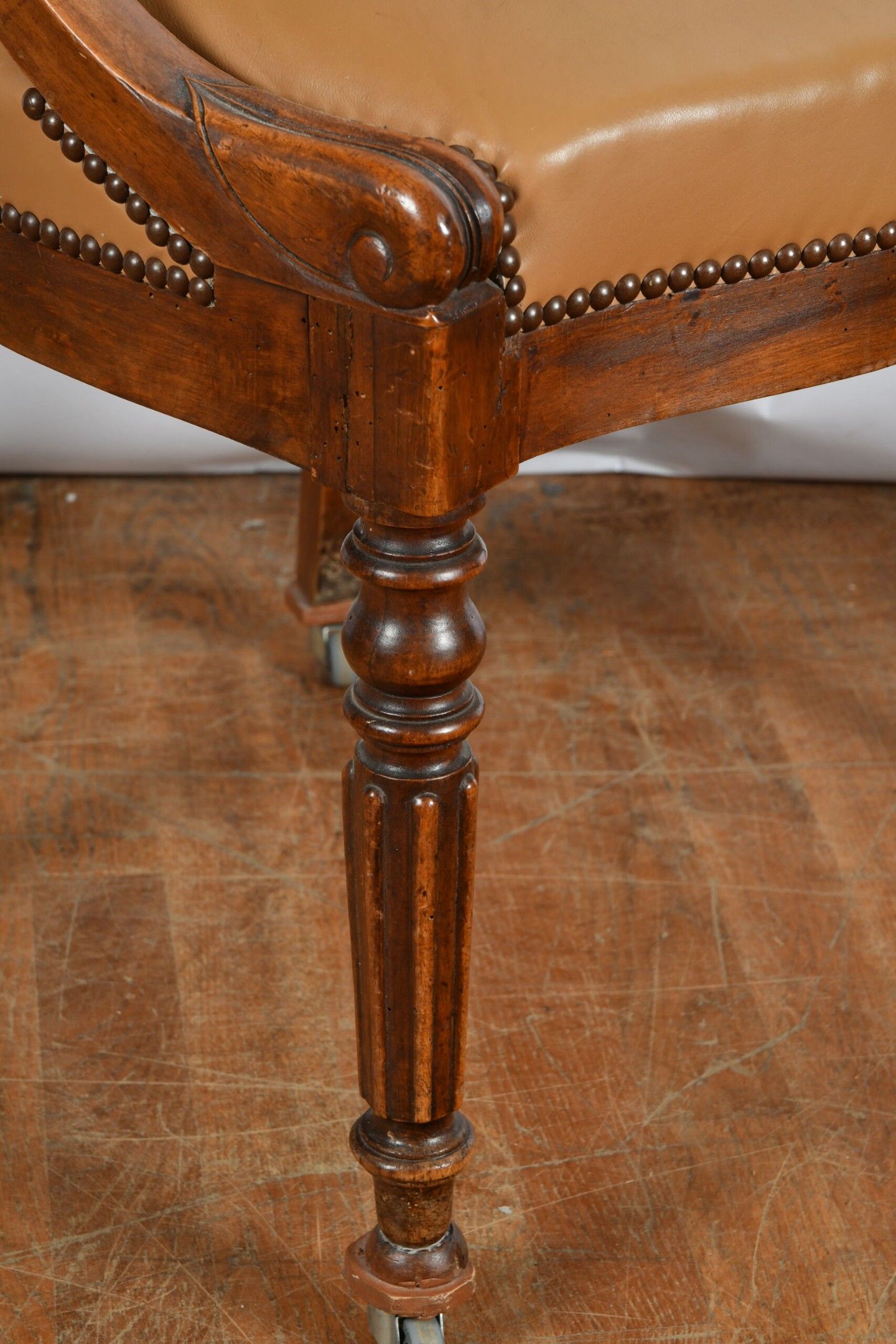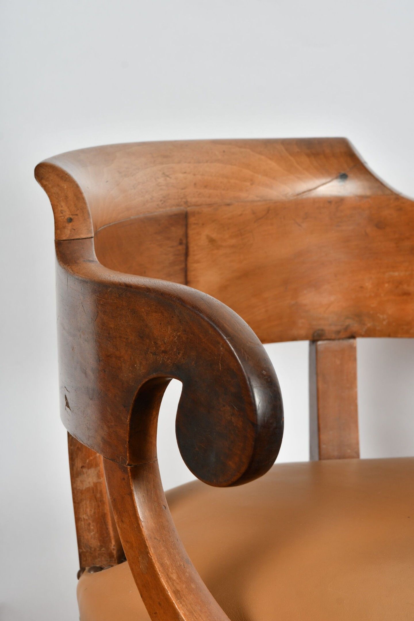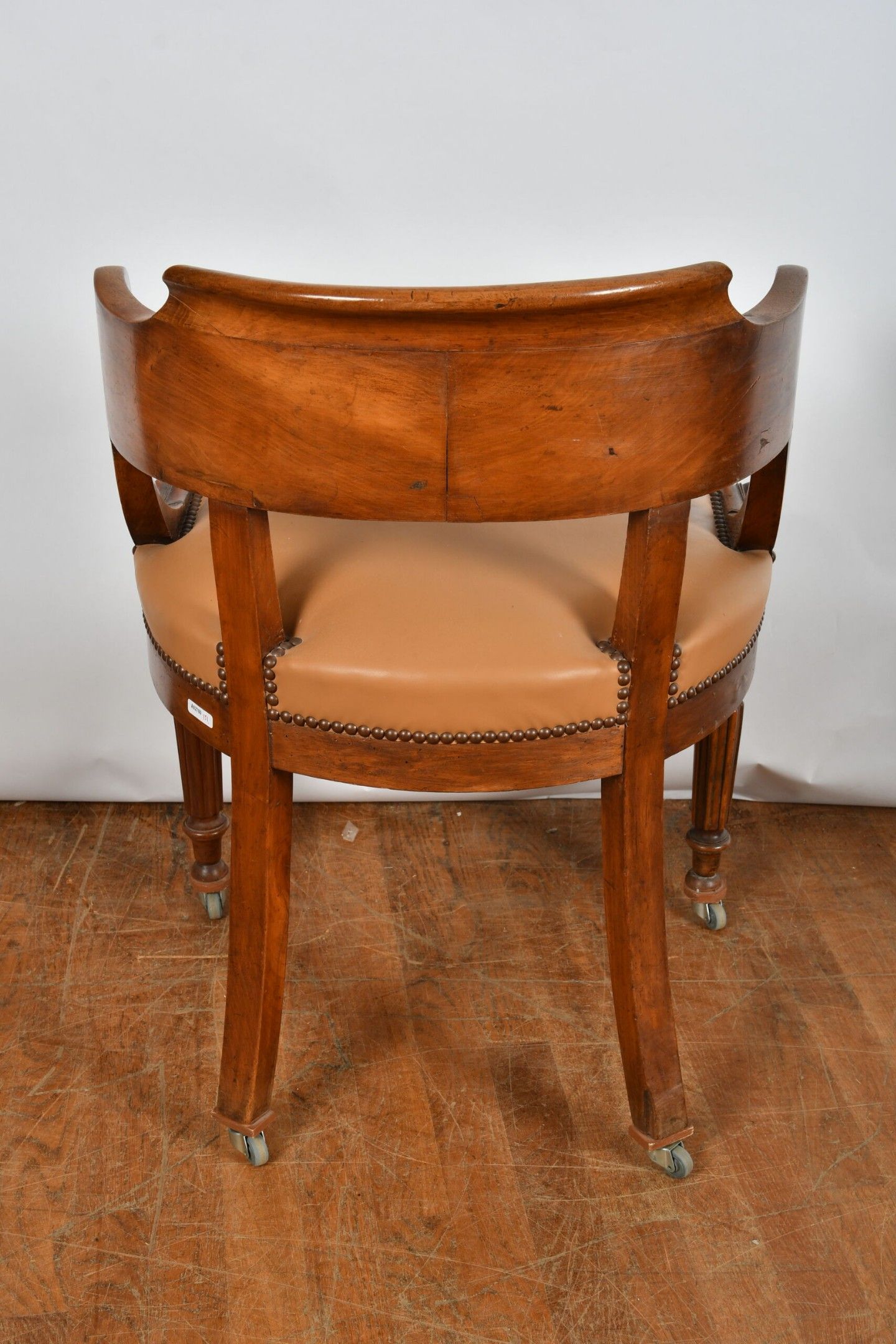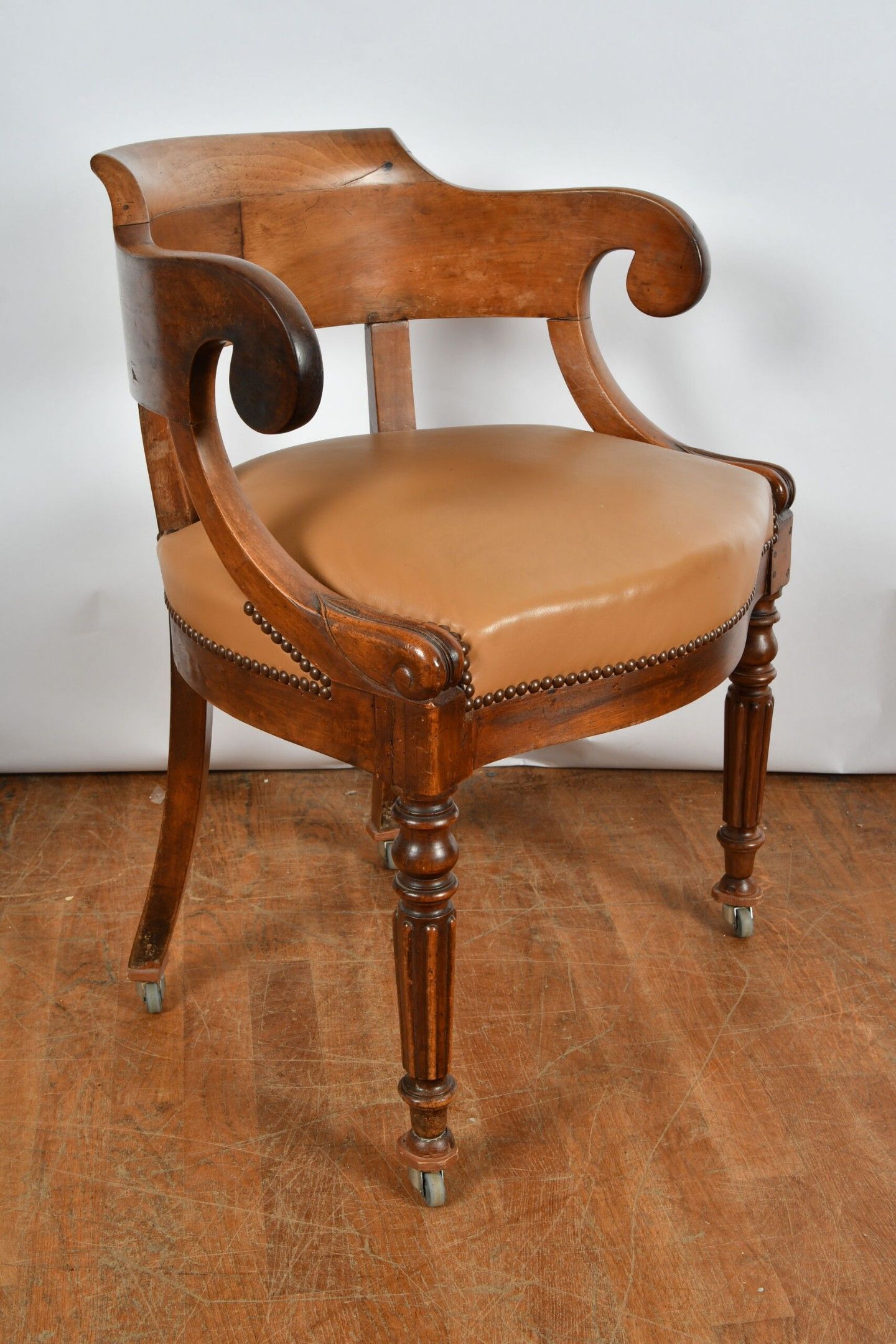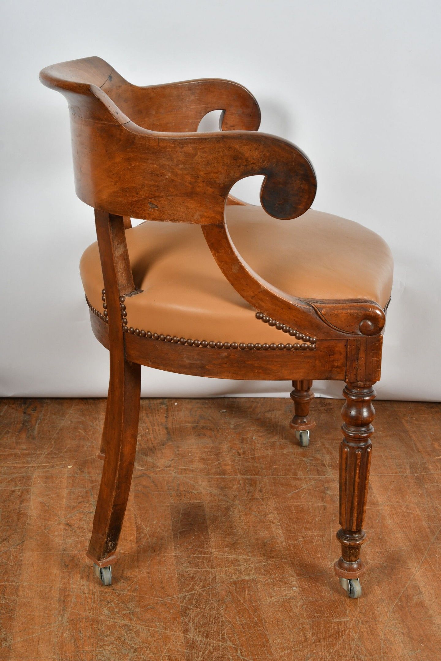 A mahogany and veneered OFFICE CHAIR with a banded back and scrolled armrests. Louis Philippe period. H. 81 - W. 61 cm (later castors)