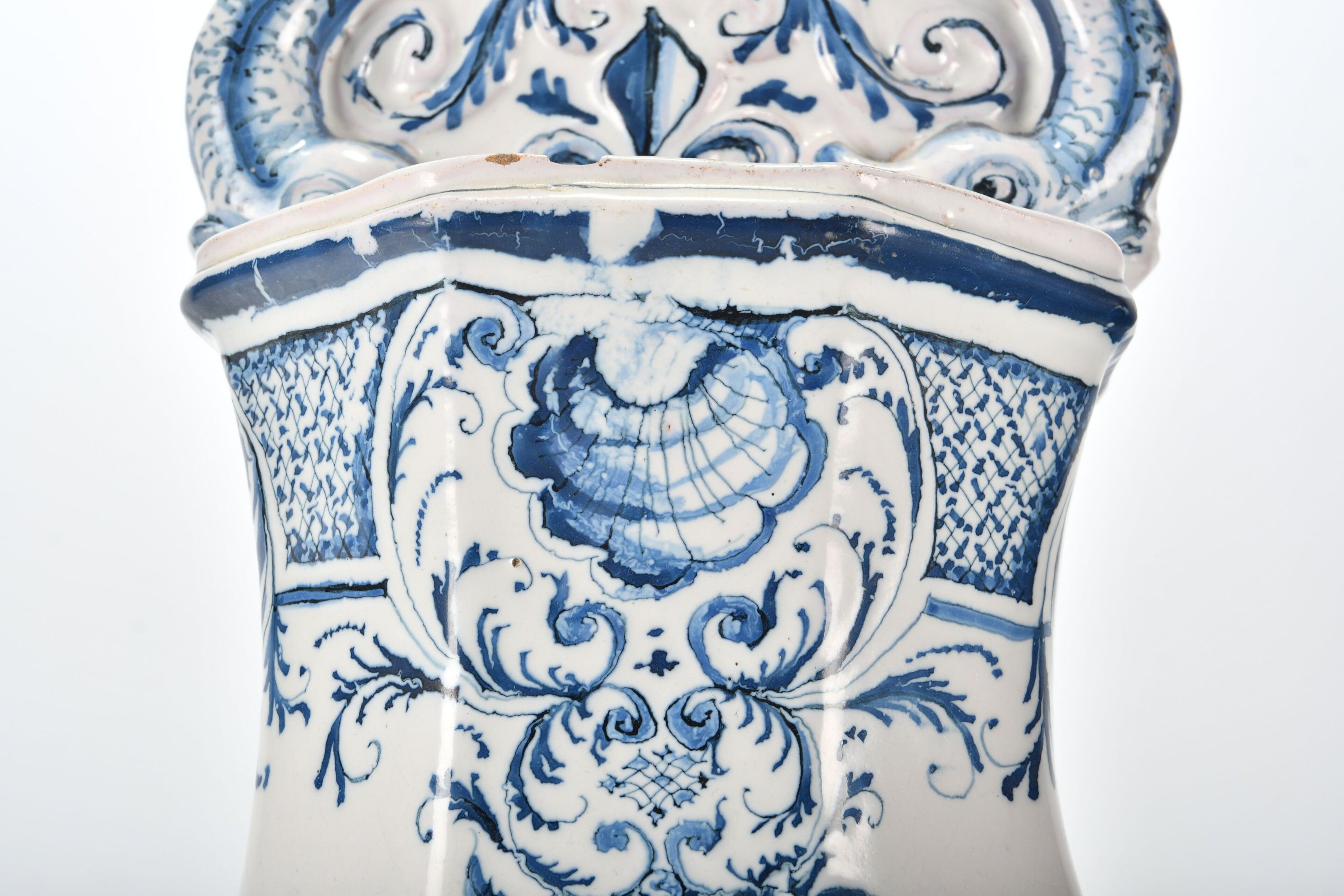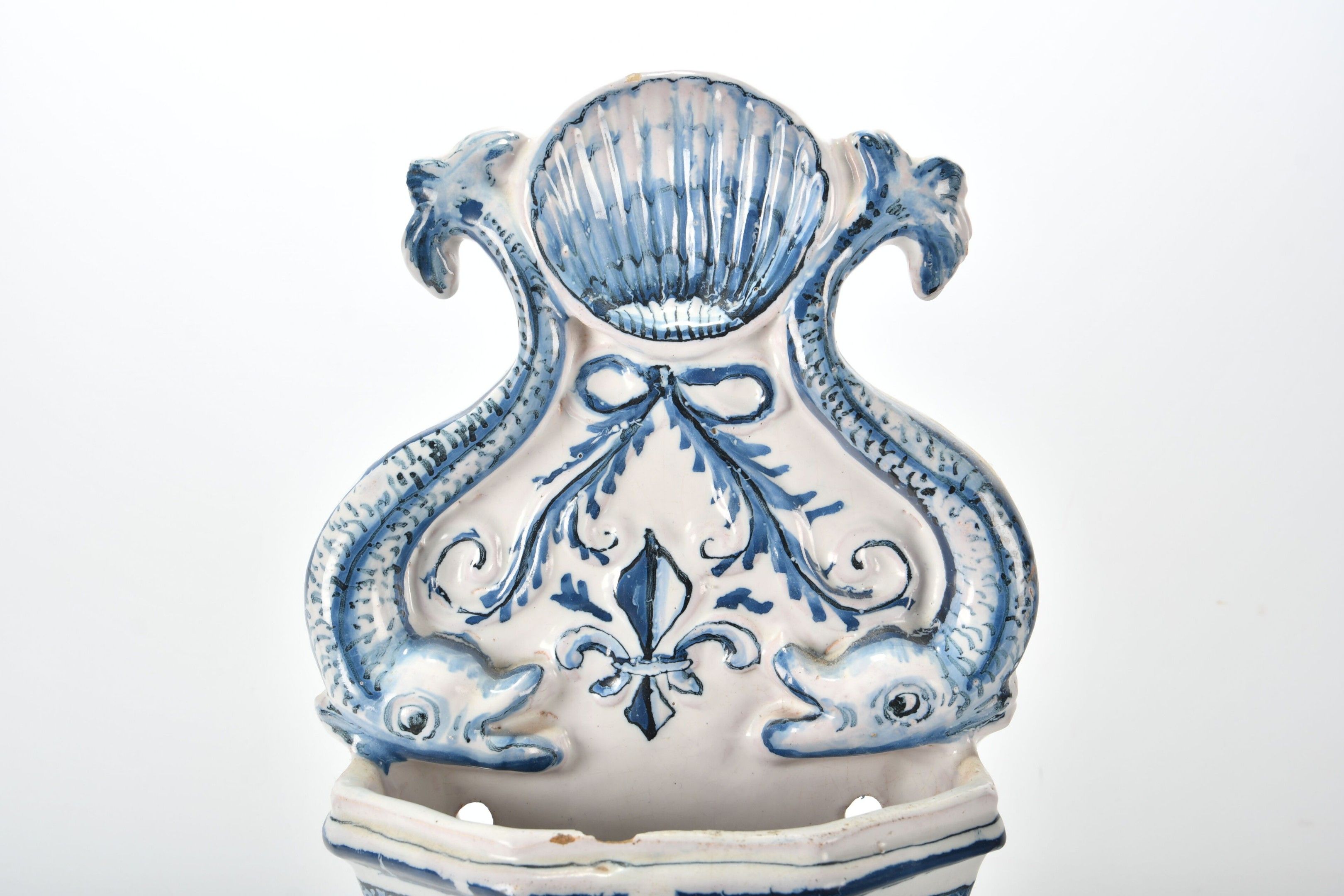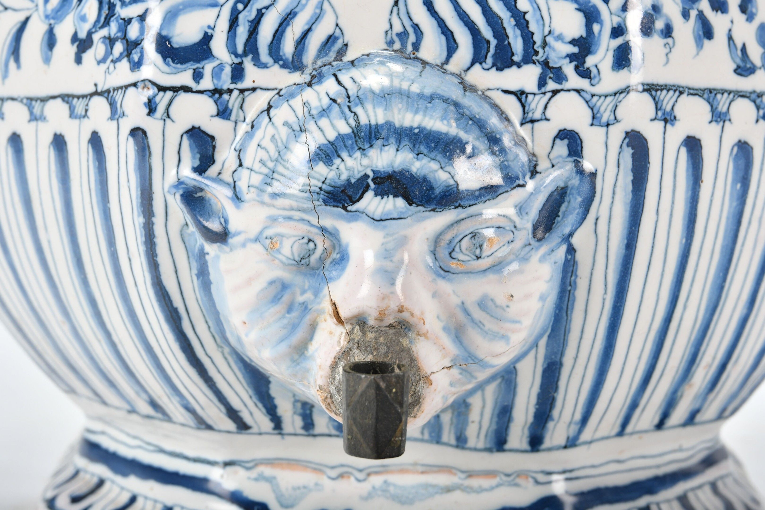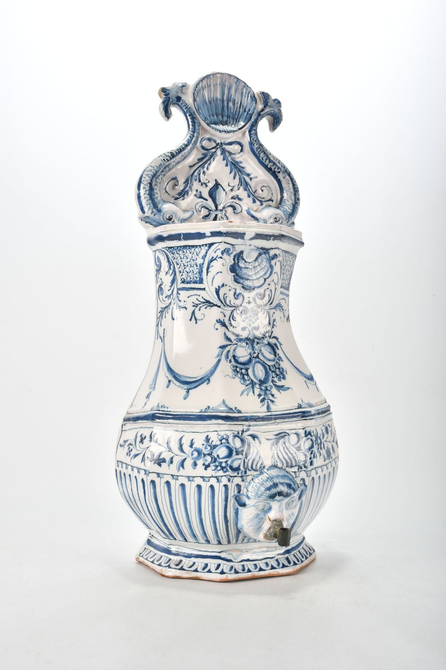 A baluster-shaped earthenware wall fountain decorated in blue monochrome with fruit, shells and fluting, animal head and cap decorated with a fleur-de-lys framed by two dolphins. 18th century. Height 63 cm. Minor accidents, missing pieces of mail and a crack in the lower part of the body and the mascaron.