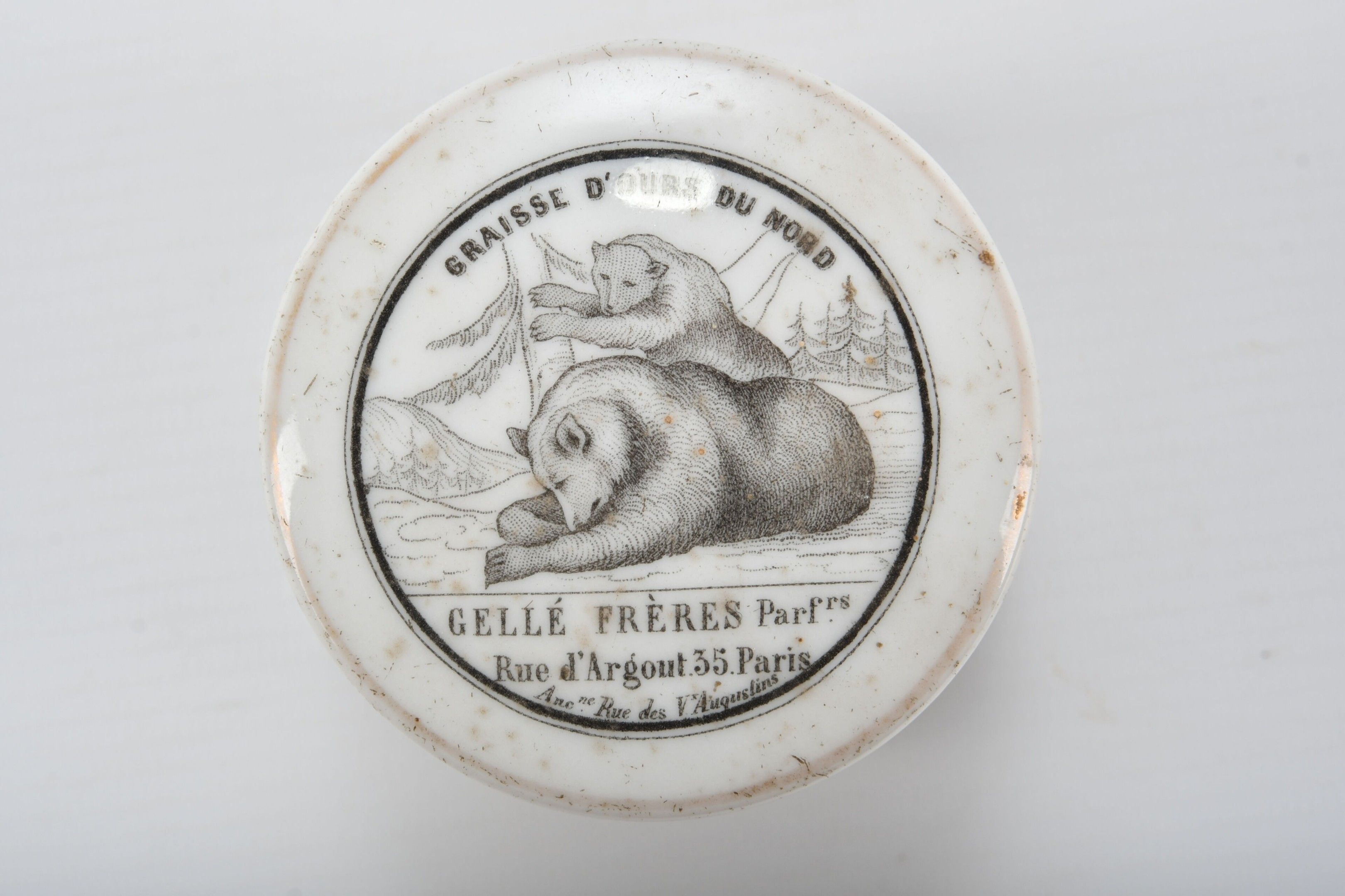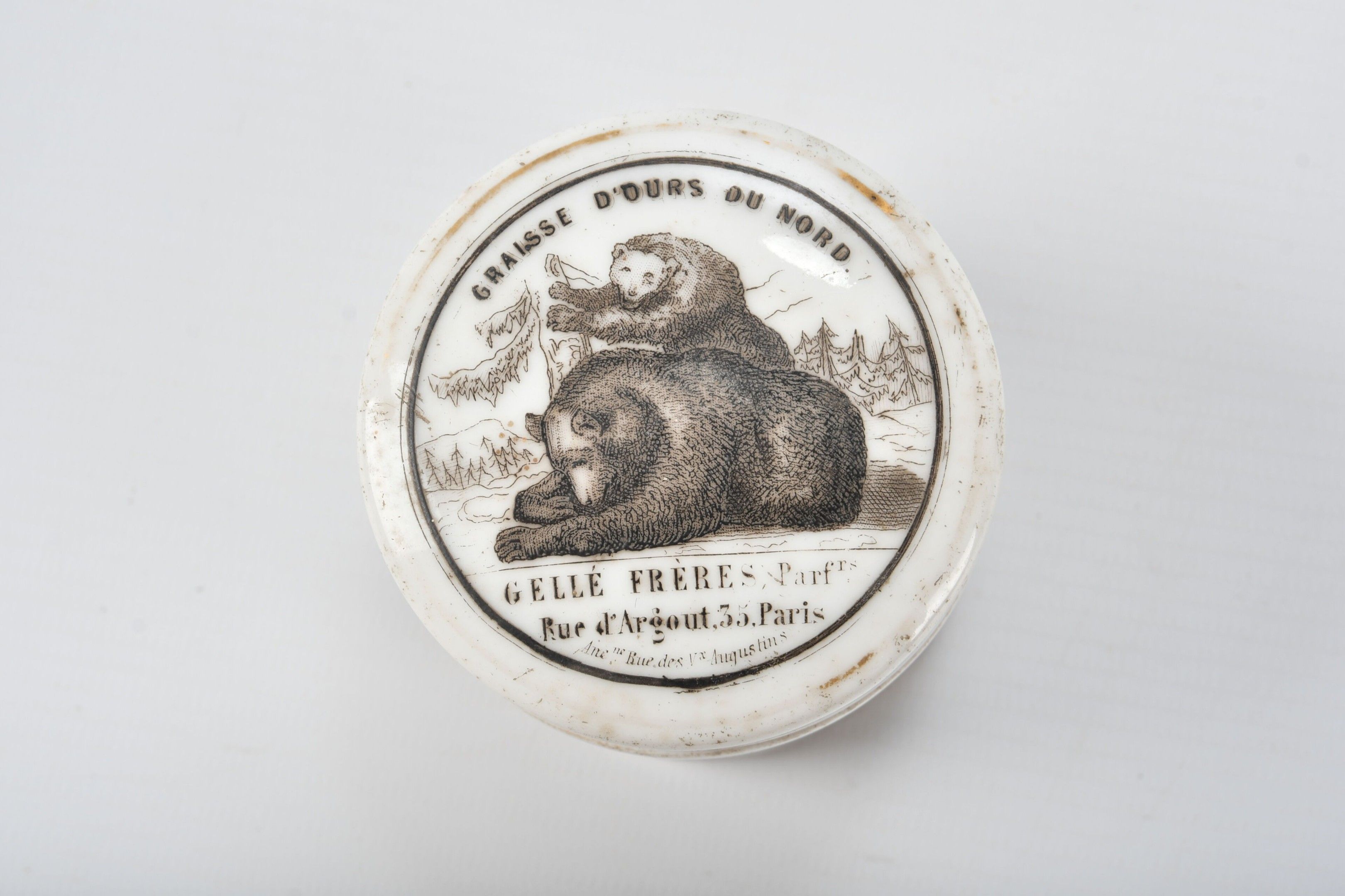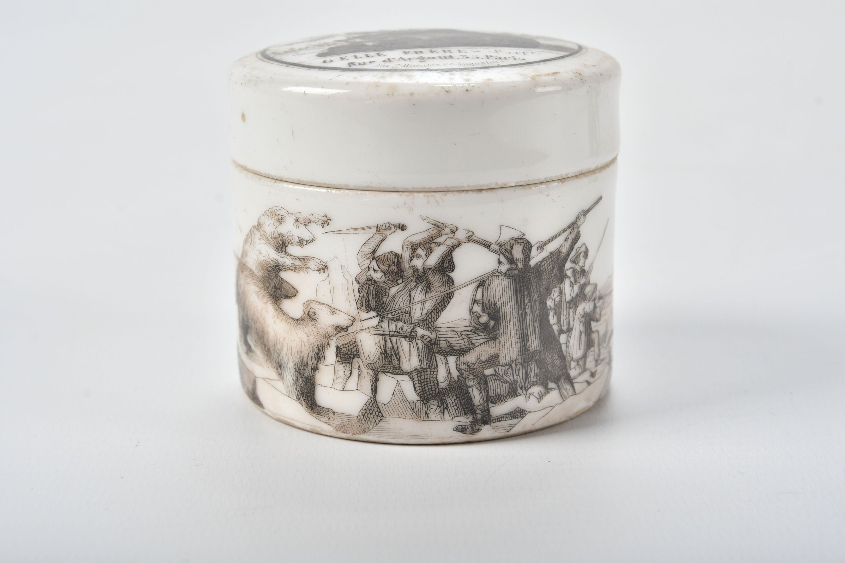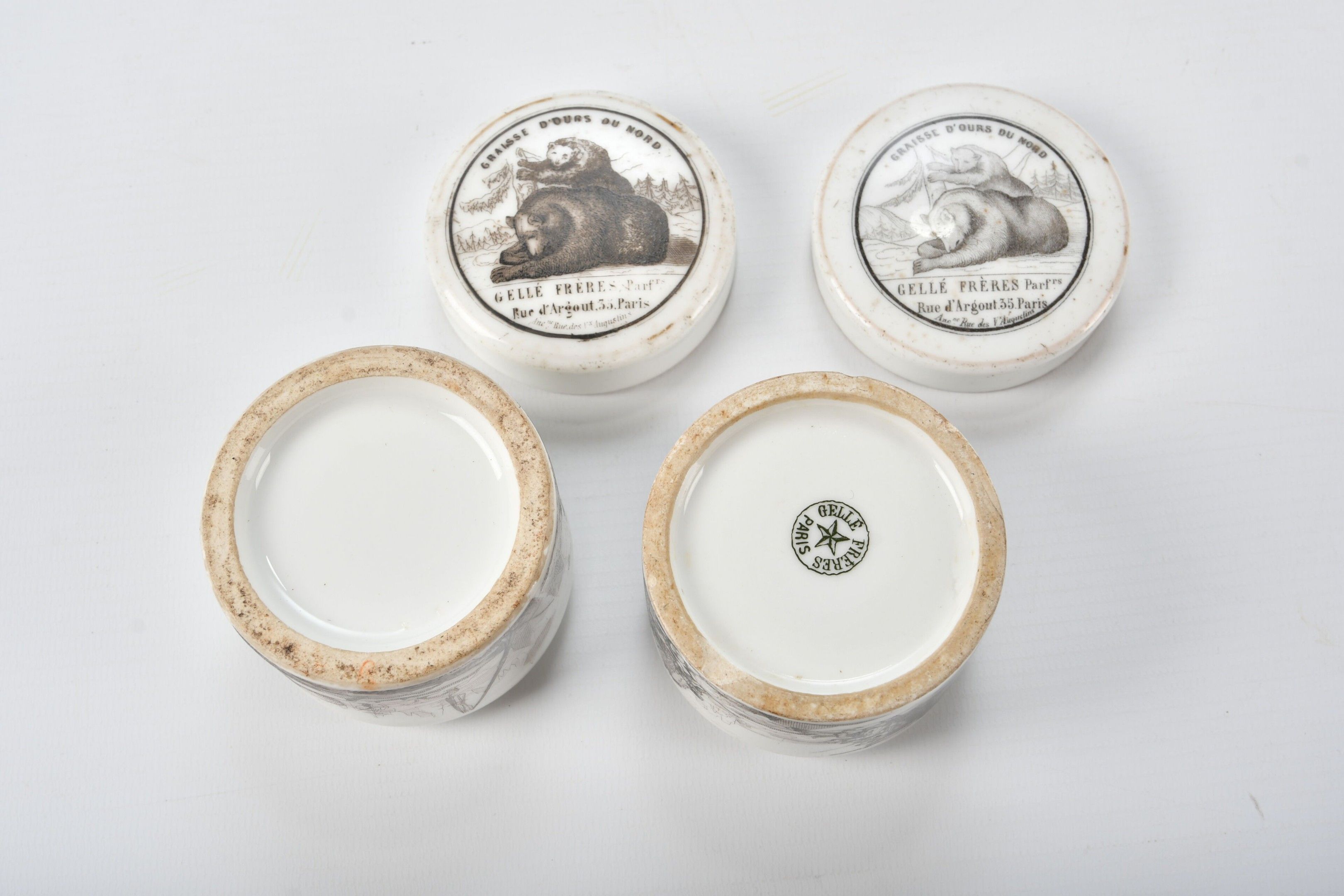 POTS PUBLICITAIRES (pair of) circular in NORTHERN BEAR FAT porcelain sold by Gellé Frères Parfumeurs in Paris. Grisaille decoration of bear hunting scenes. 19th century