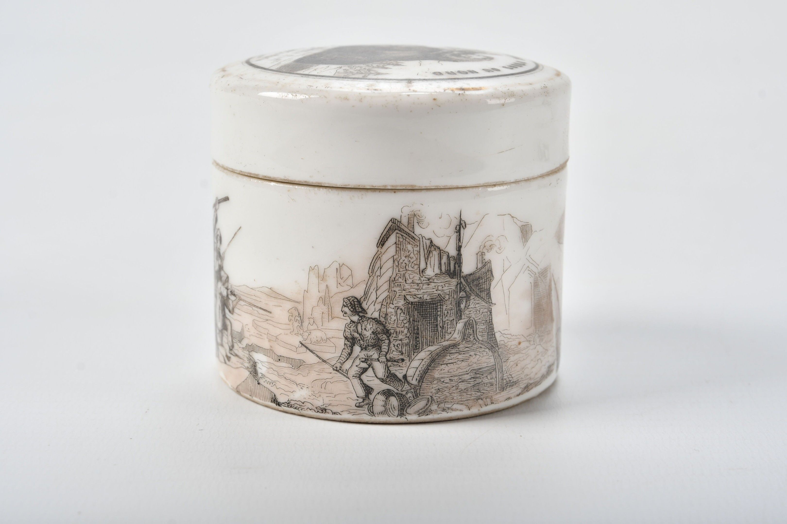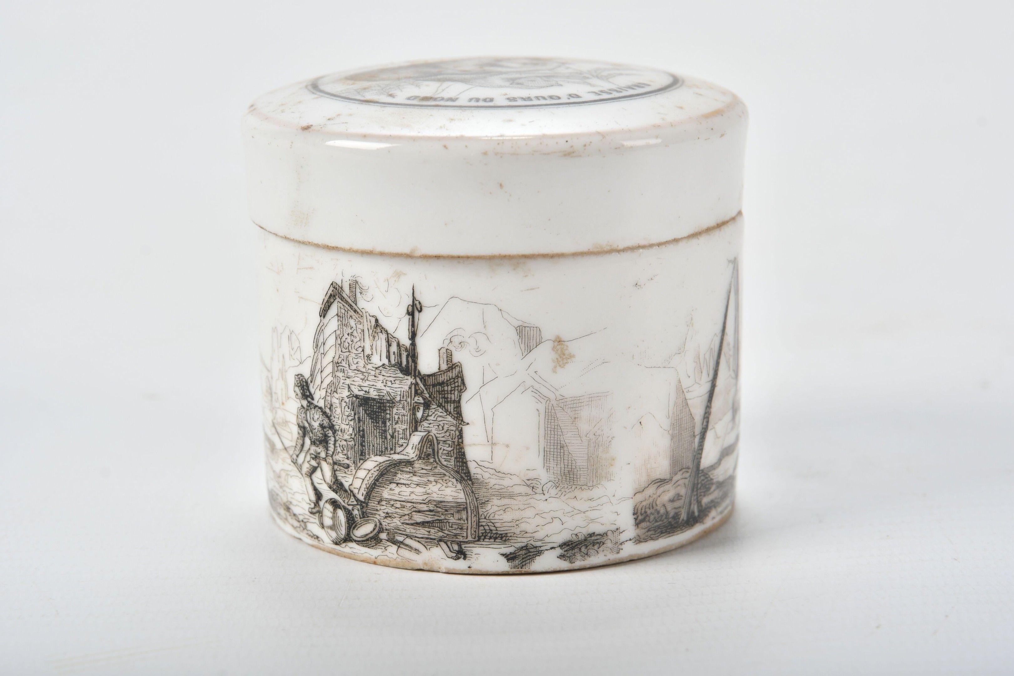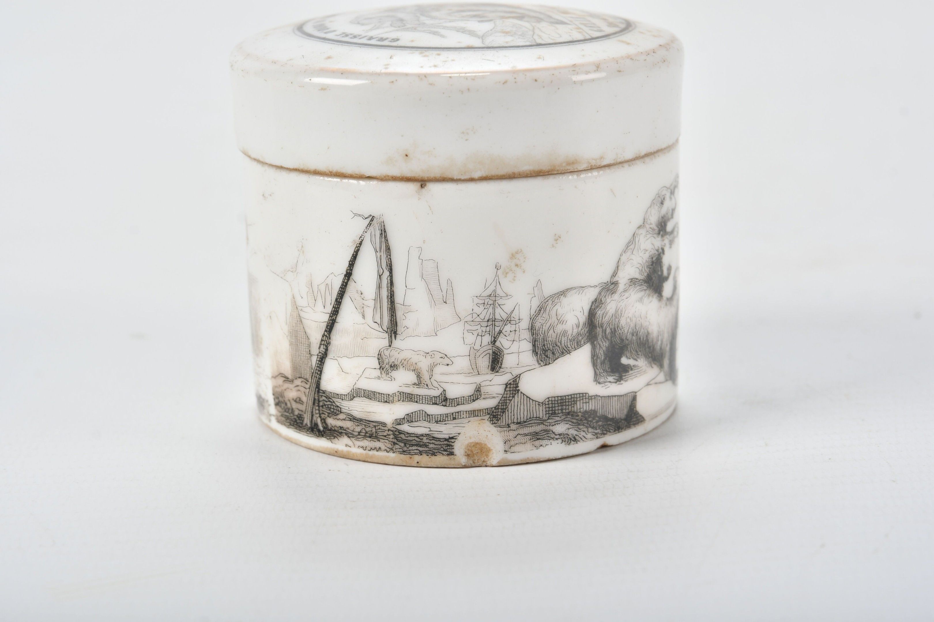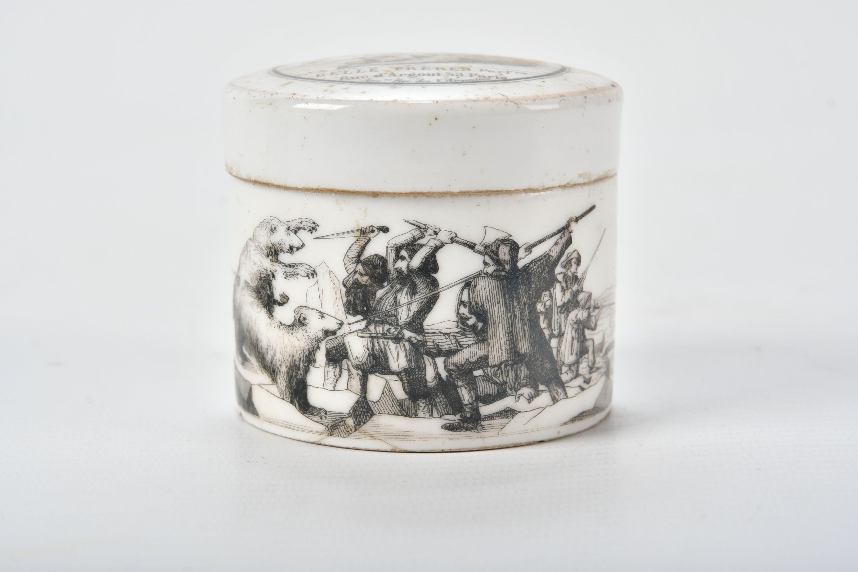 POTS PUBLICITAIRES (pair of) circular in NORTHERN BEAR FAT porcelain sold by Gellé Frères Parfumeurs in Paris. Grisaille decoration of bear hunting scenes. 19th century