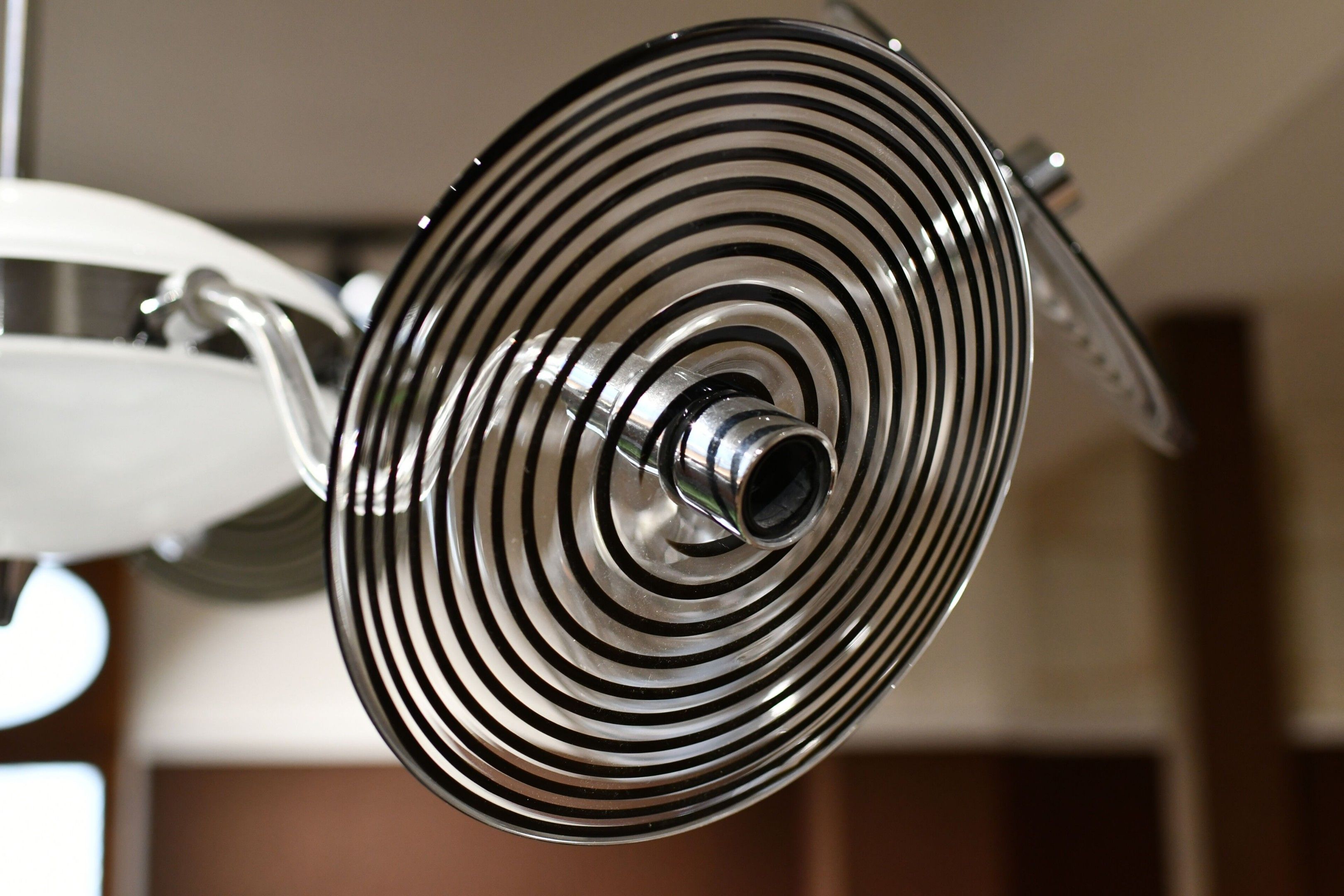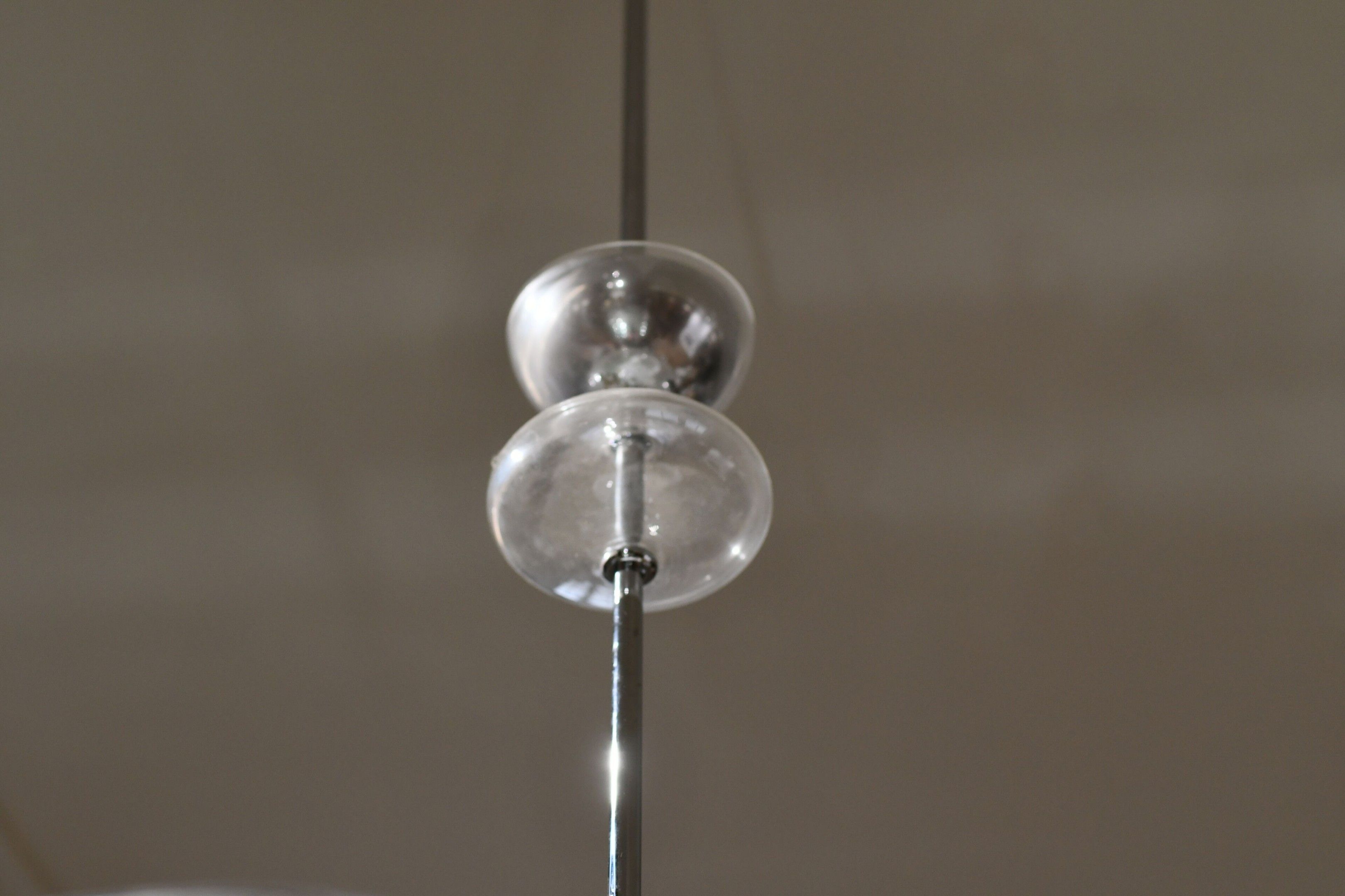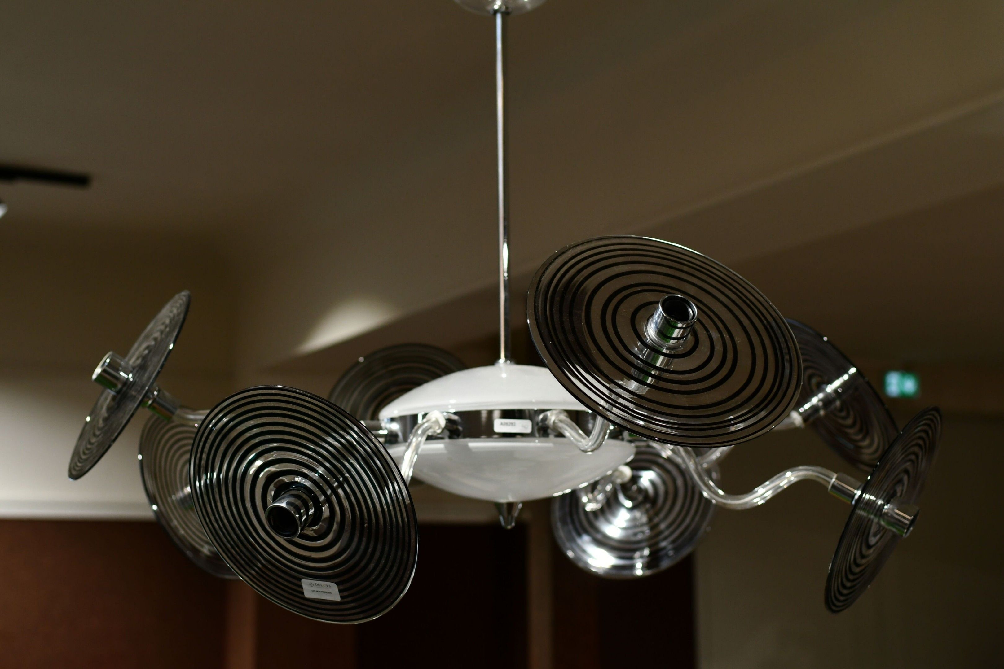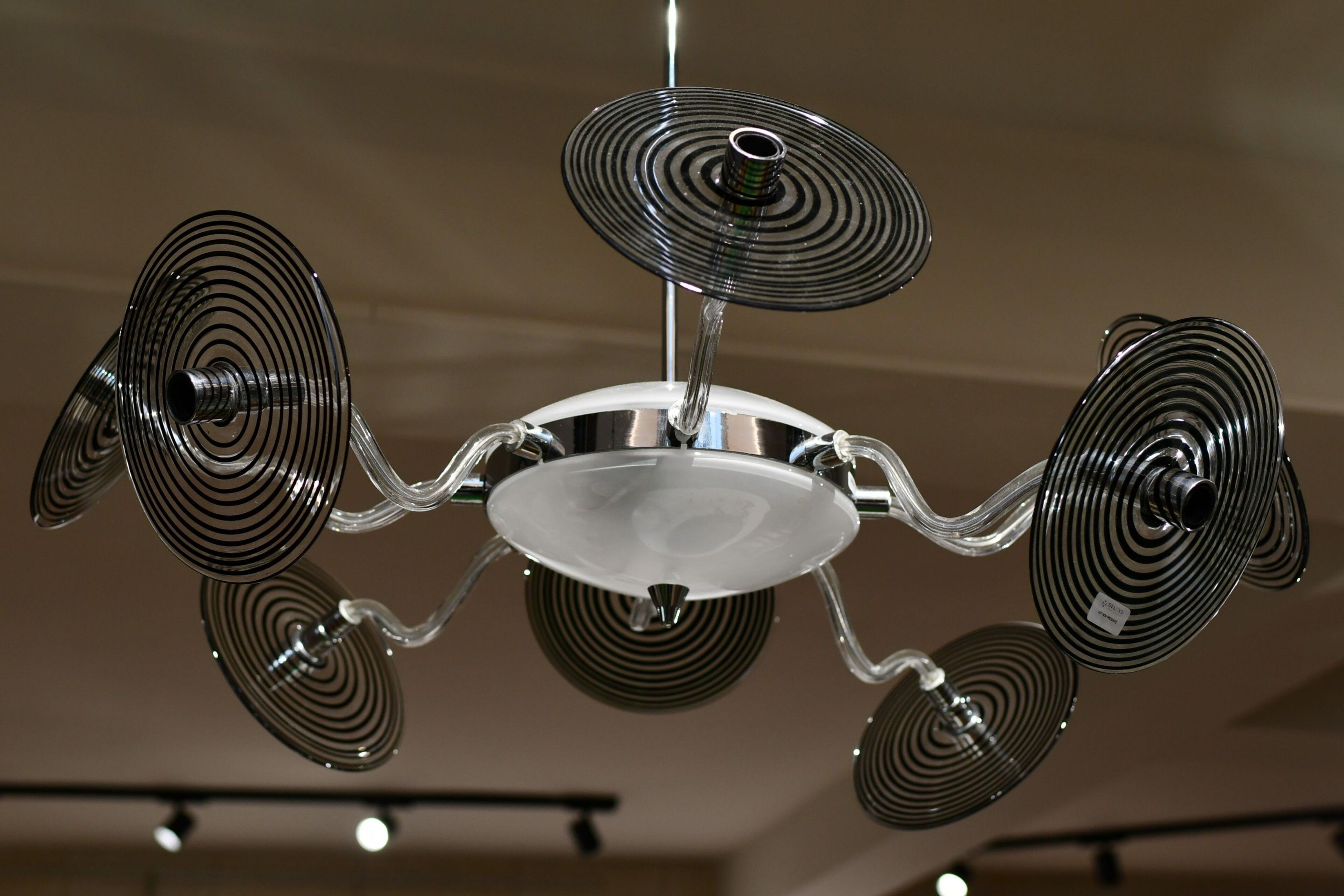Maria Grazia Rosin (born 1958) "Venussiano K8" chandelier. For De MAJO publishing house. In glass, opaline, chromed metal and metal. Illuminated with 8 light arms forming discs gravitating around a central saucer. Contemporary designer work. Diam. 100 - H. 130 cm.
