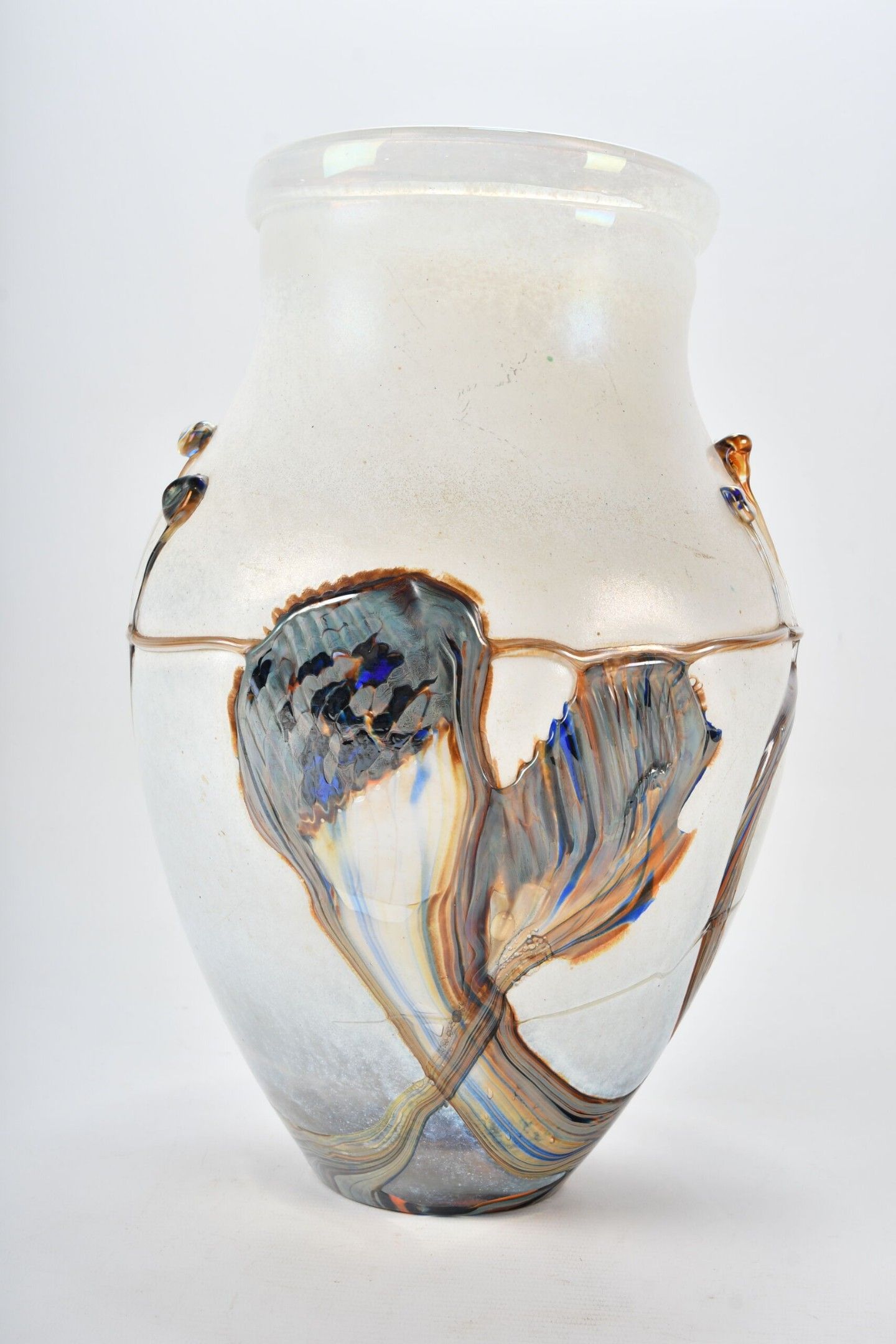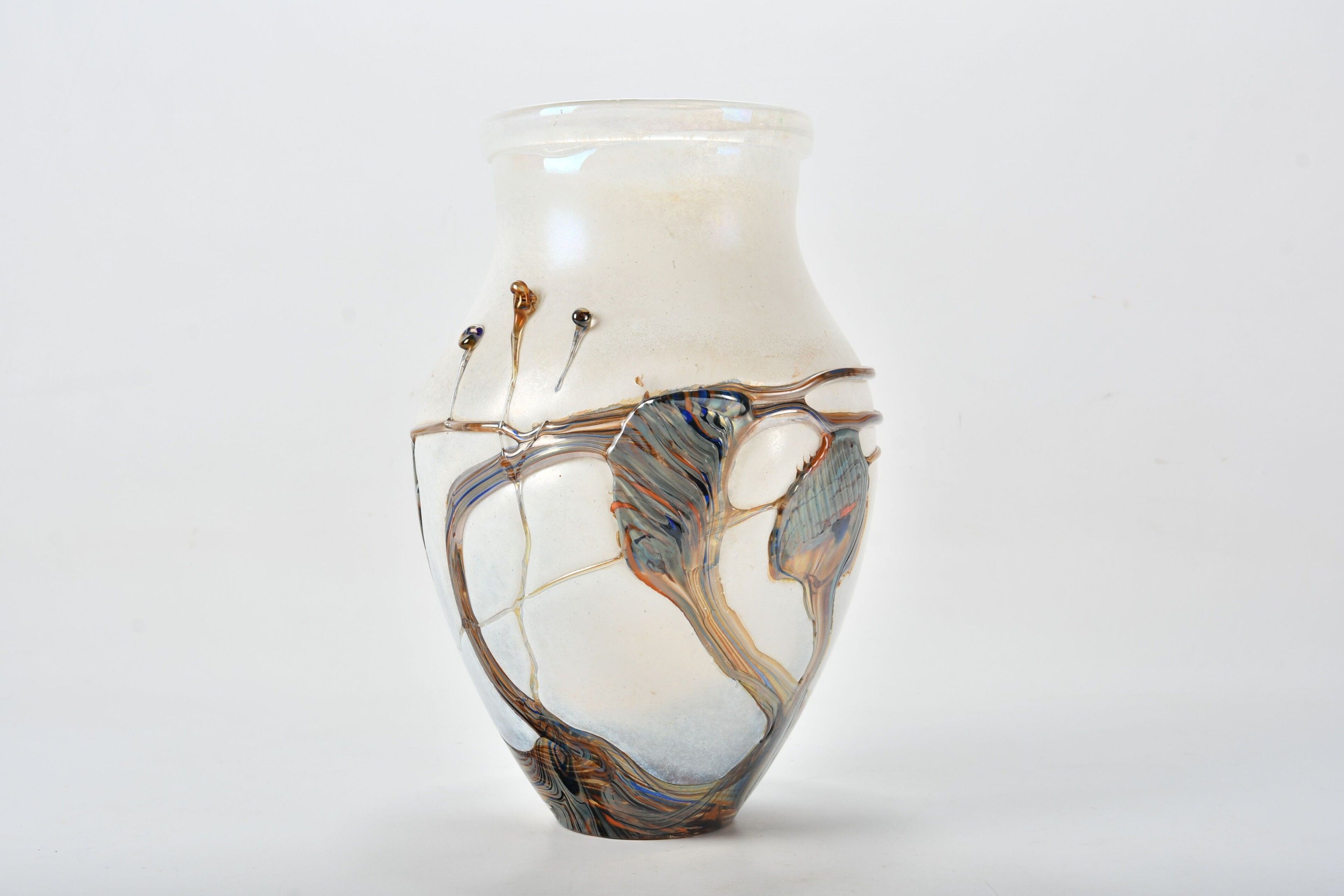 Jean-Claude NOVARO (1943-2015). White multi-layered glass baluster vase with multicoloured glass applique decoration. Signed on the reverse and dated 1991. Height 35 cm