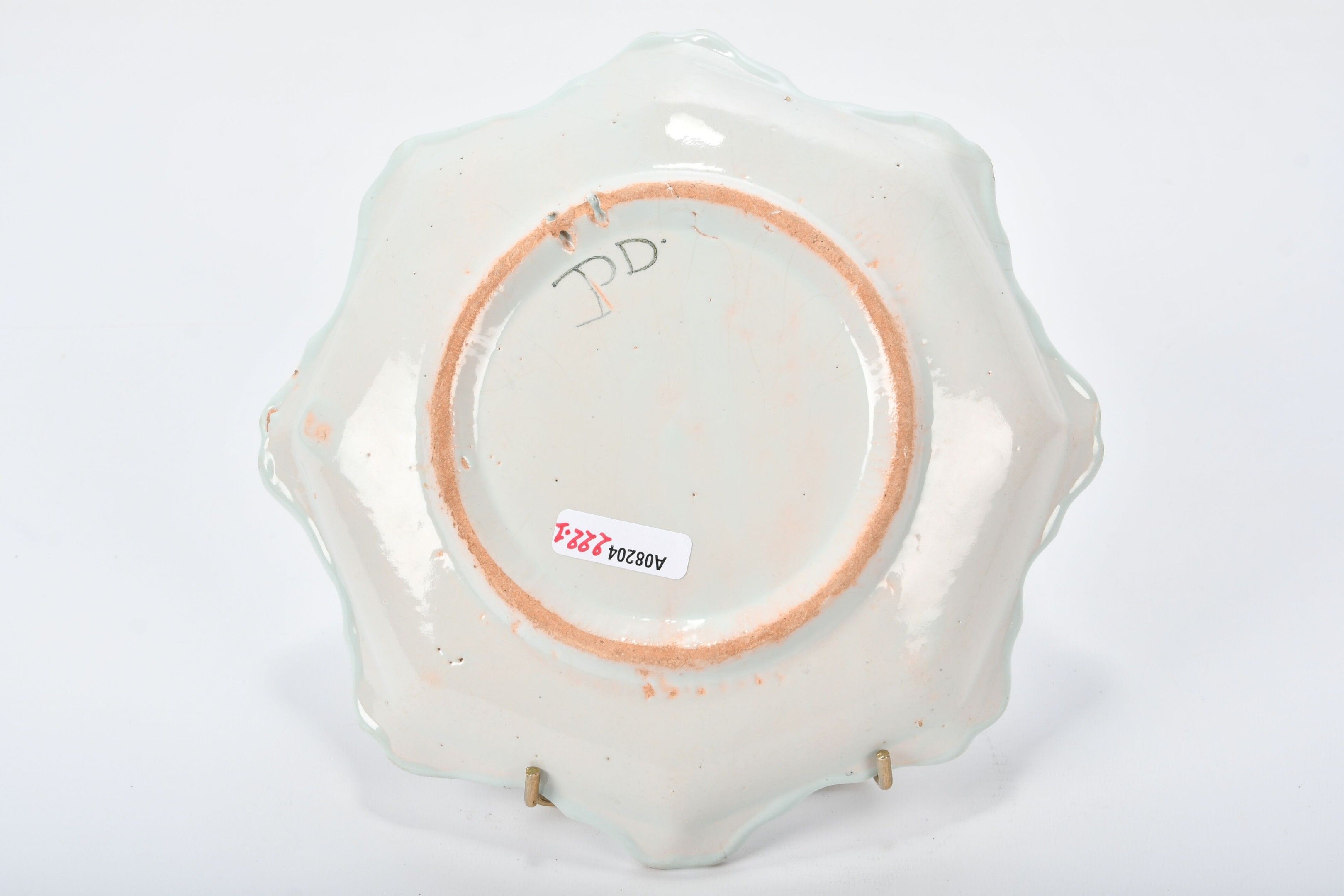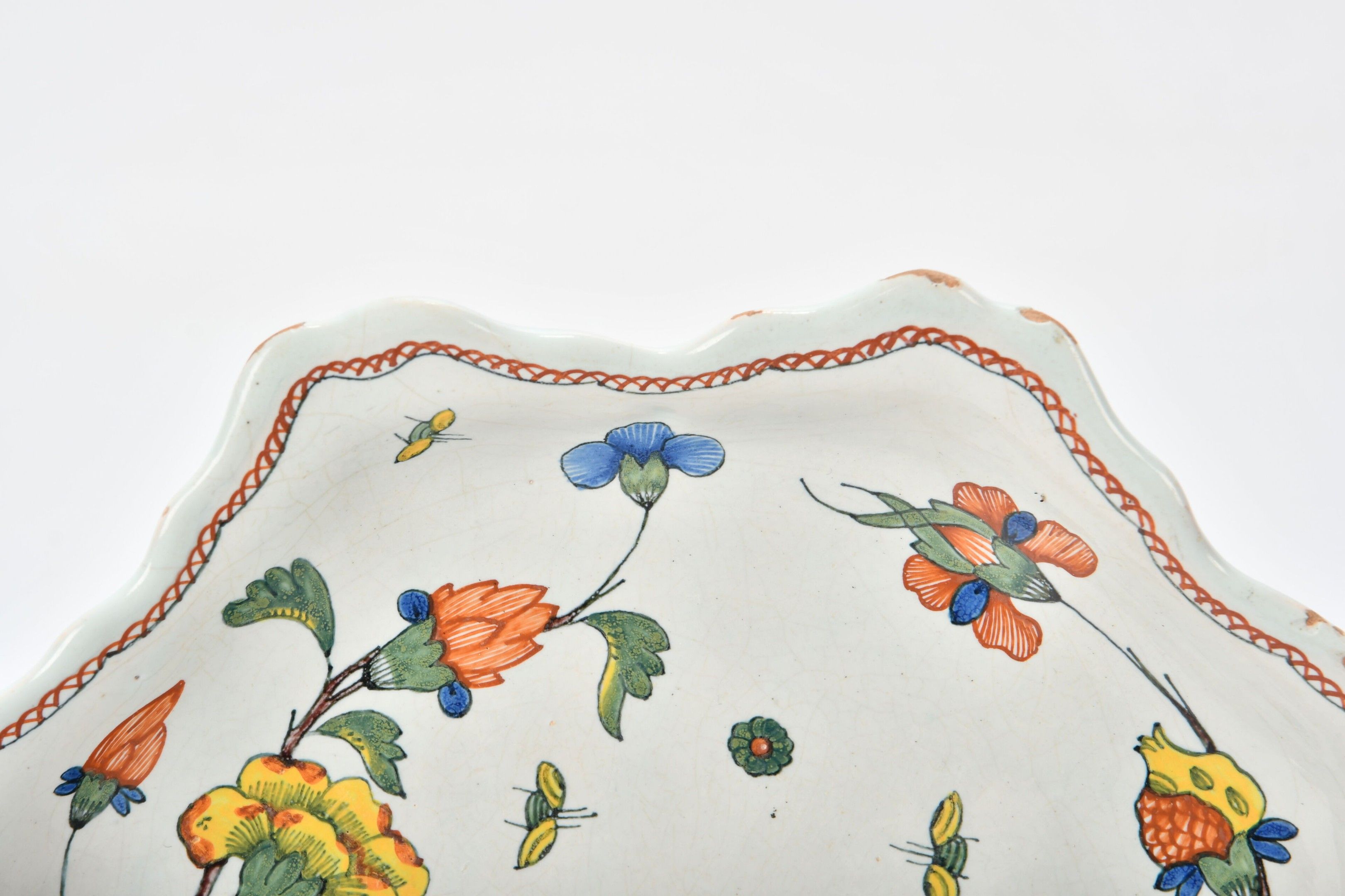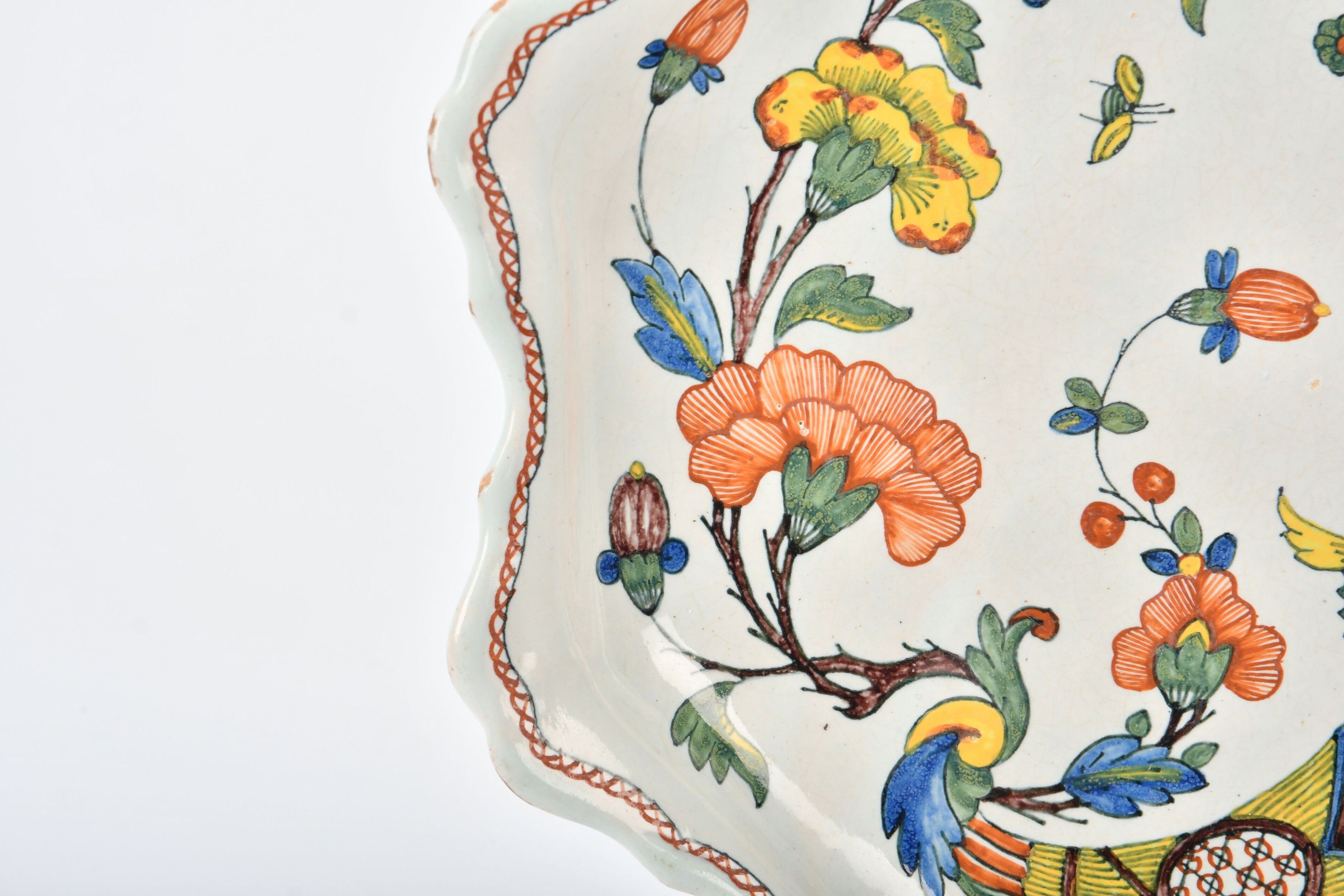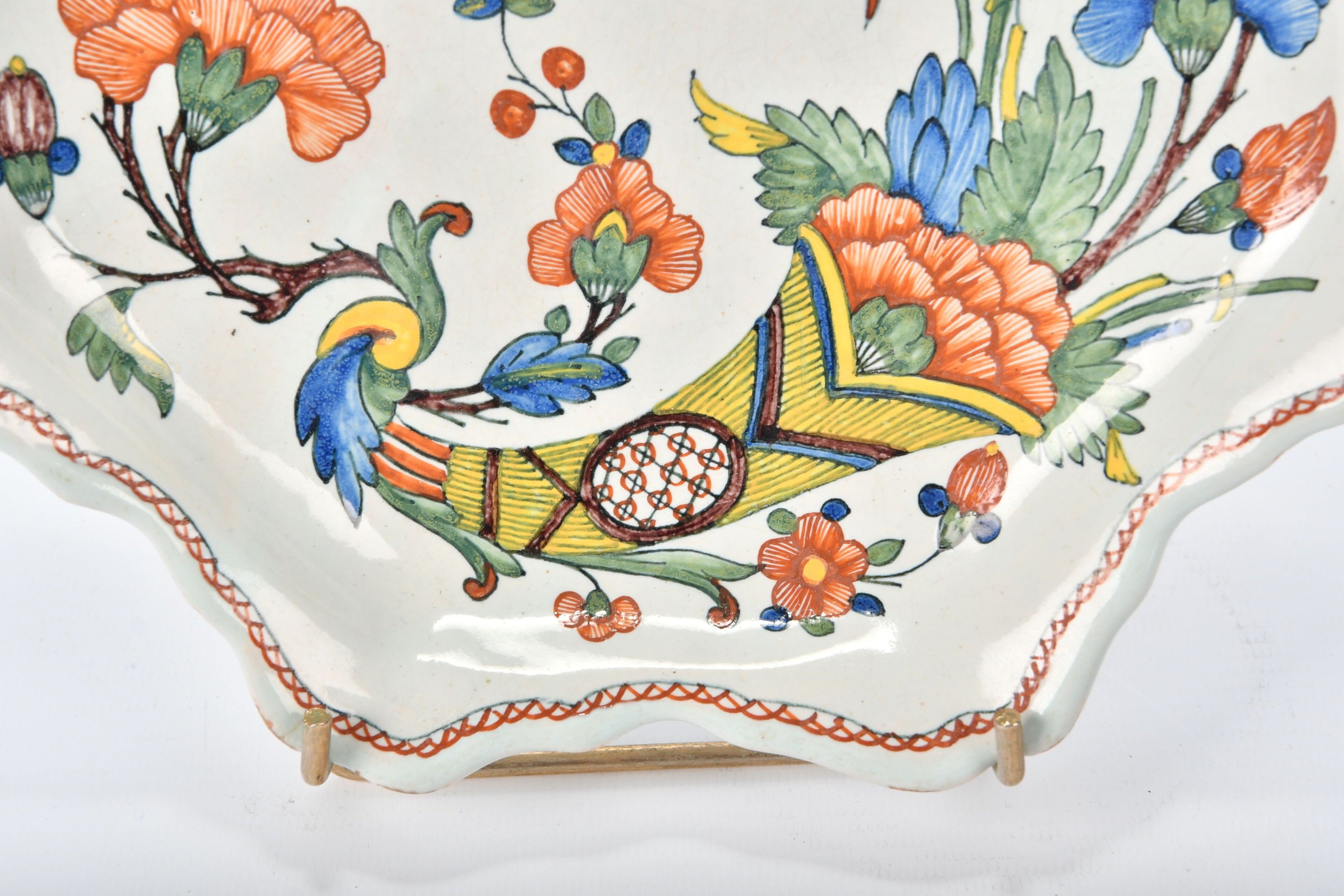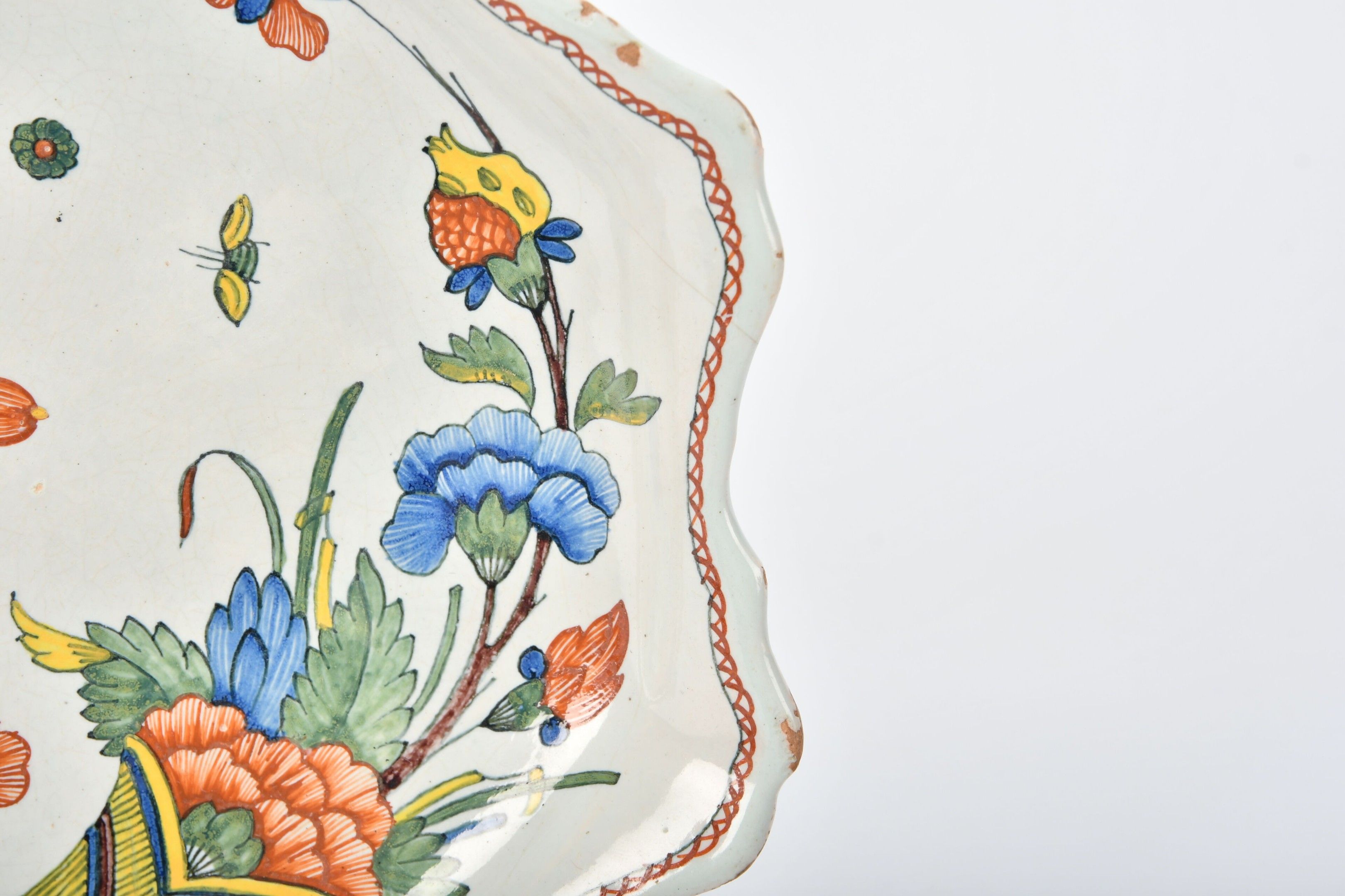 ROUEN 18th century. An earthenware plate with a strongly curved contour forming a poly-lobed wing, with polychrome decoration of cornucopia and insects. Monogrammed PD on the reverse. Diam. 25 m. Minor glaze cracks and chips, a small crack on the wing.
