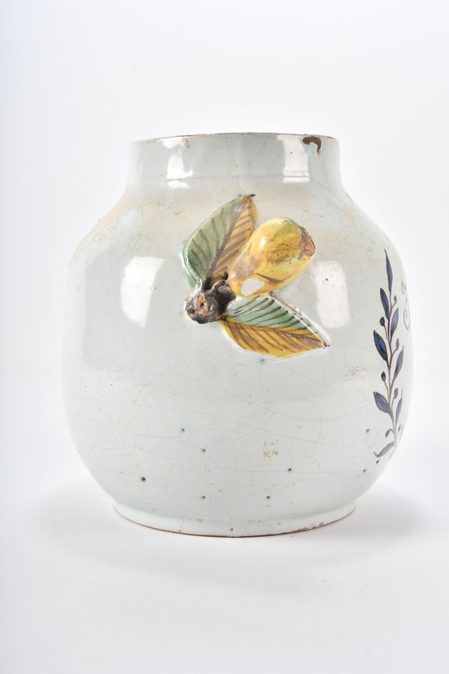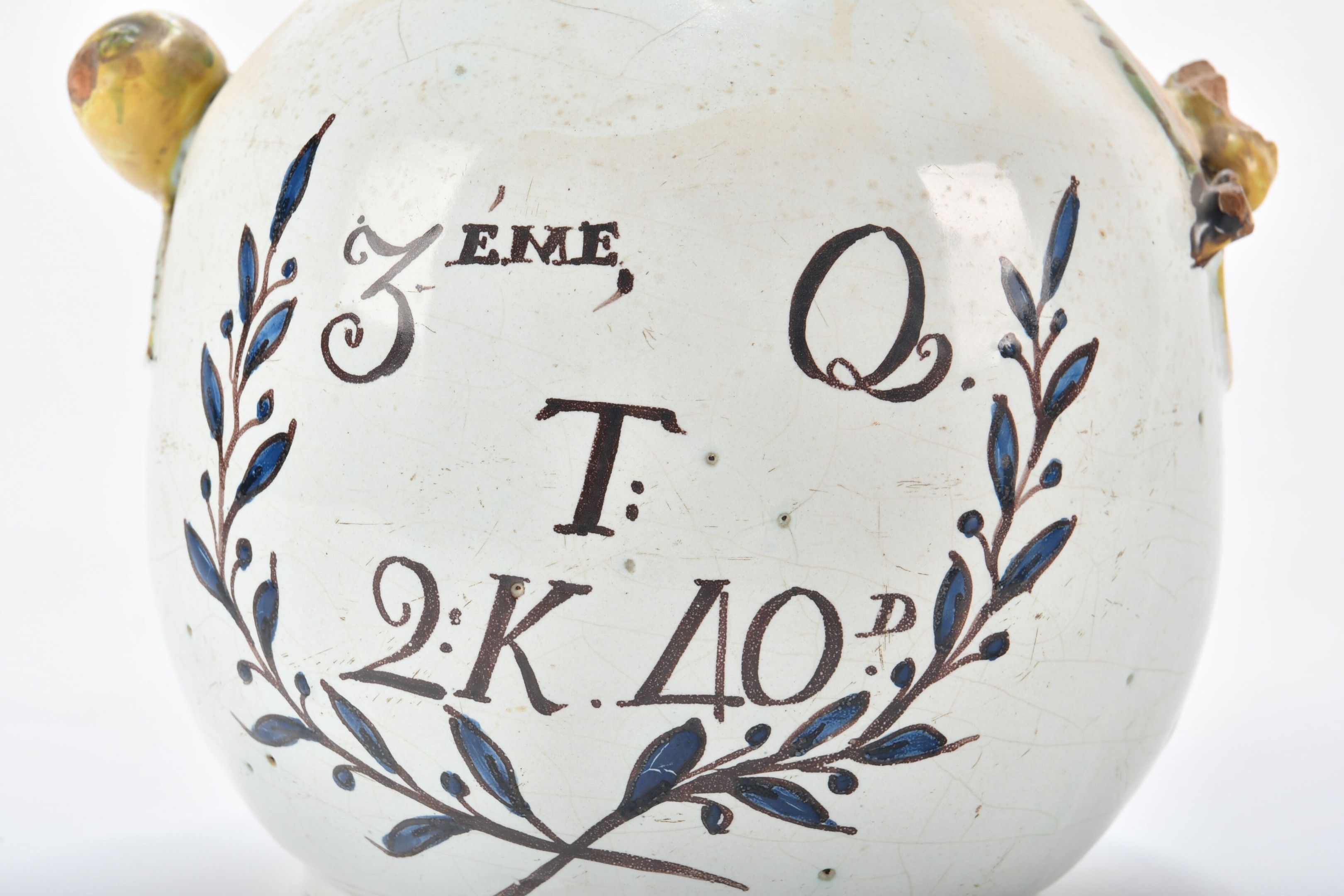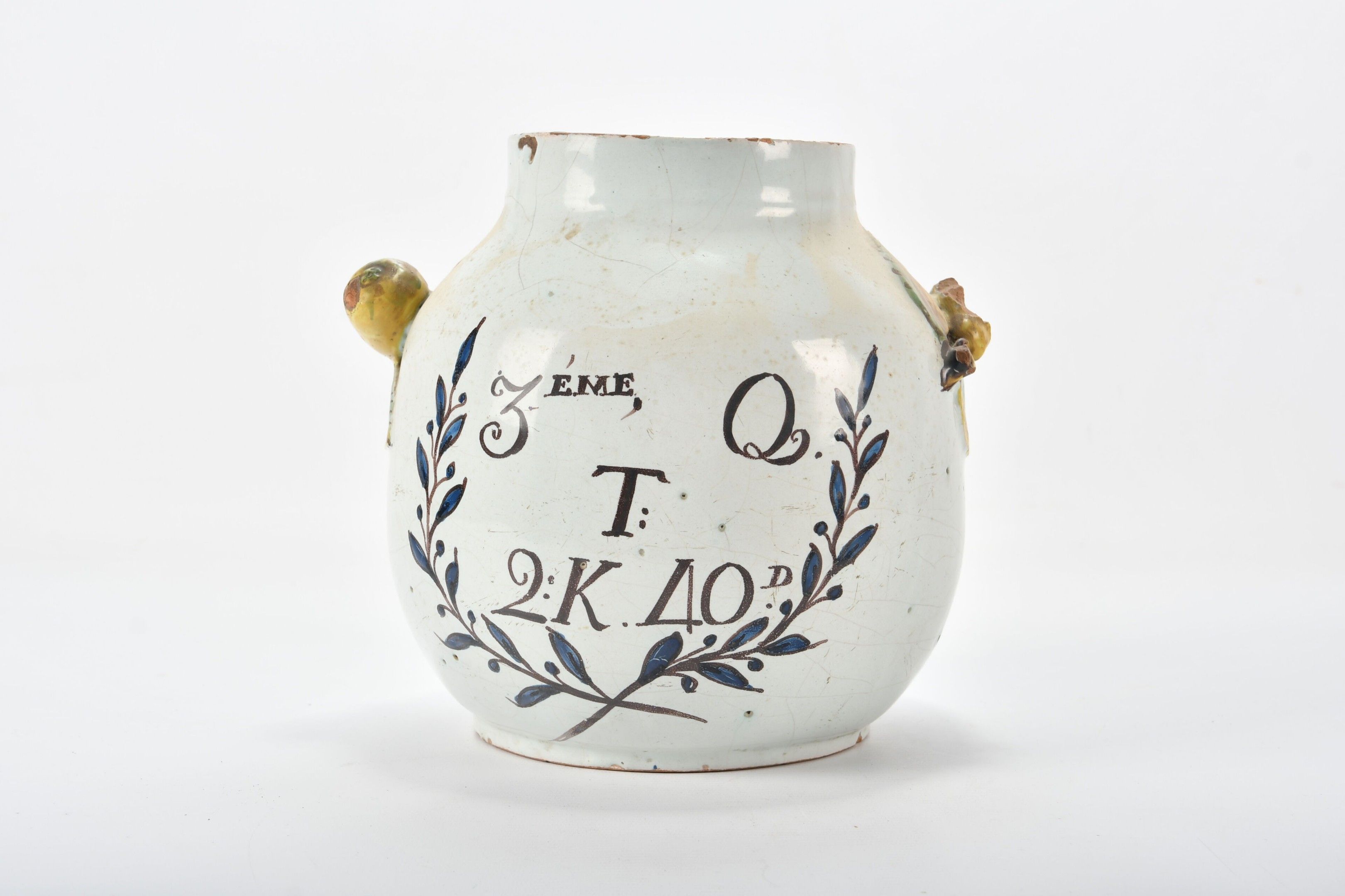 QUIMPER 18th century. Large earthenware tobacco pot with polychrome decoration of a laurel wreath inscribed: "3ème Q t: 2:K.40d". The handles are decorated with polychrome fruits (one damaged). 23 cm high