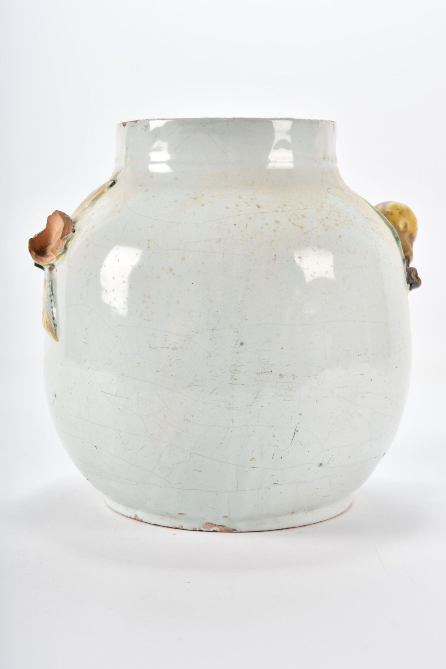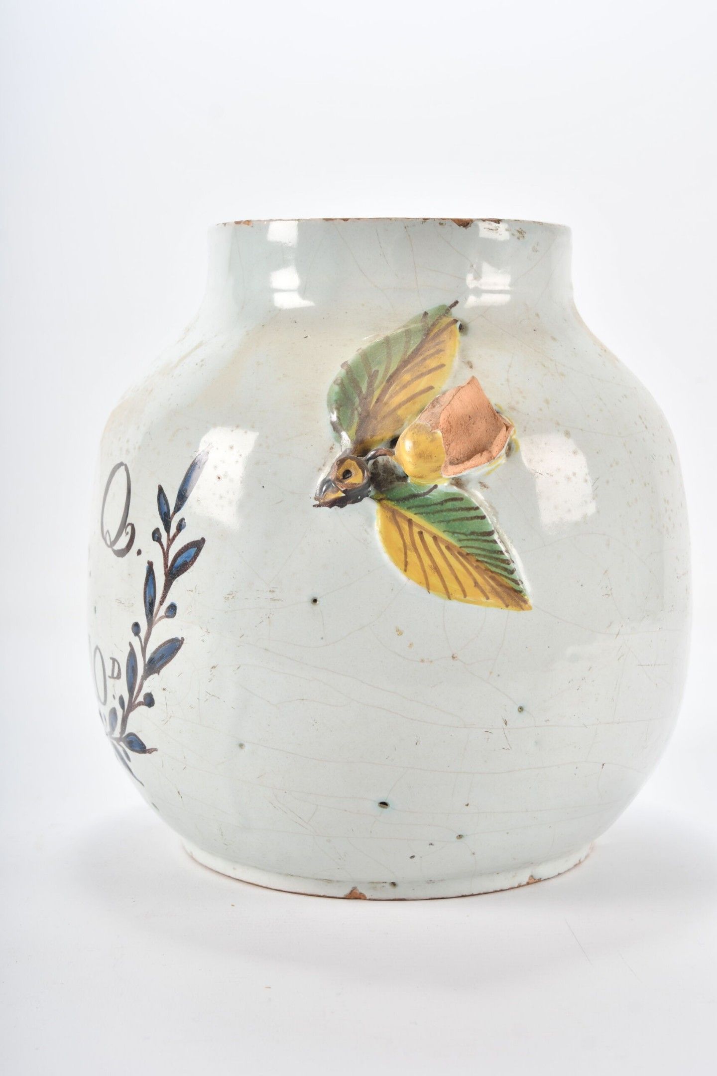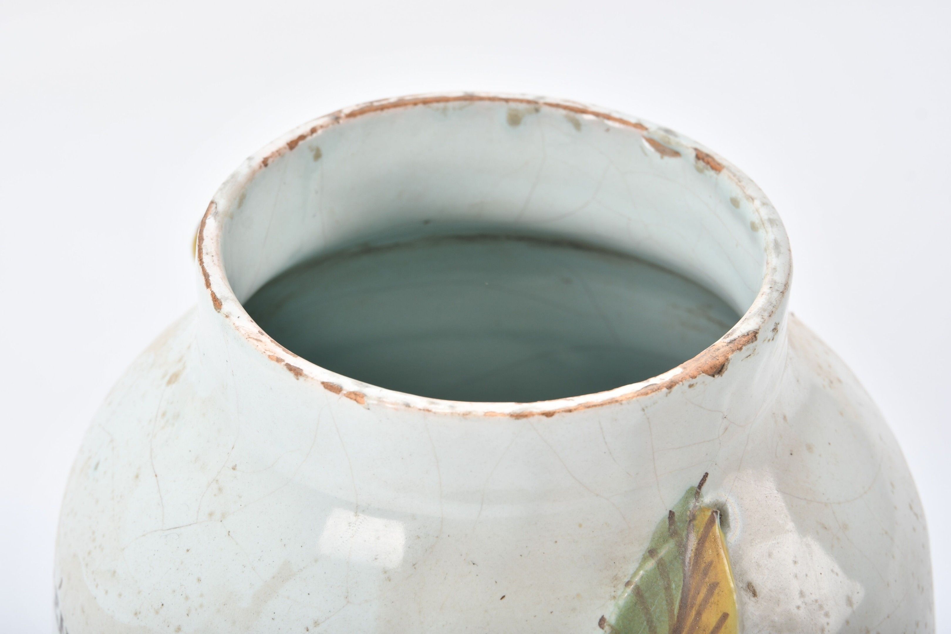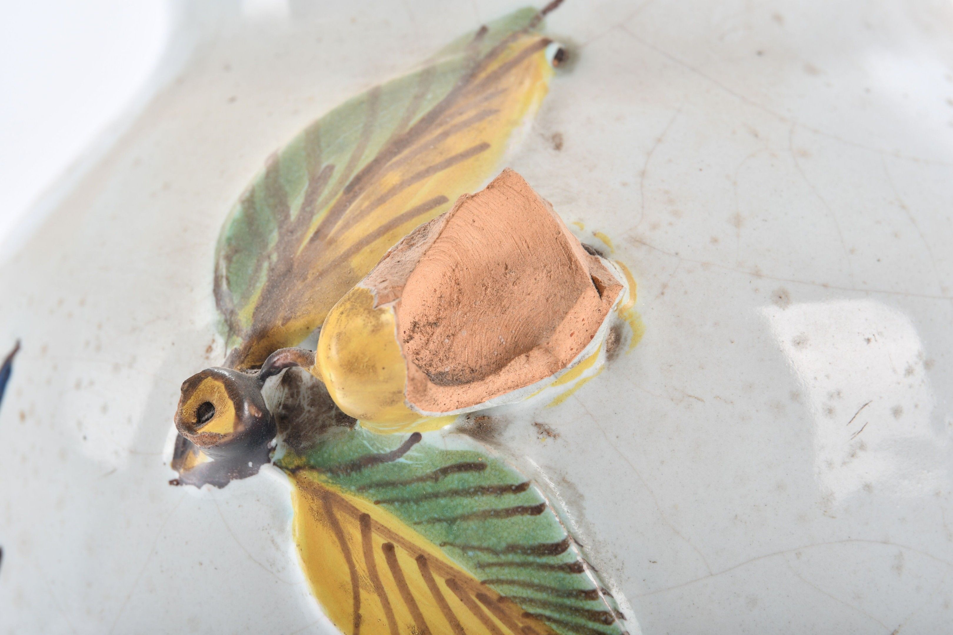 QUIMPER 18th century. Large earthenware tobacco pot with polychrome decoration of a laurel wreath inscribed: "3ème Q t: 2:K.40d". The handles are decorated with polychrome fruits (one damaged). 23 cm high