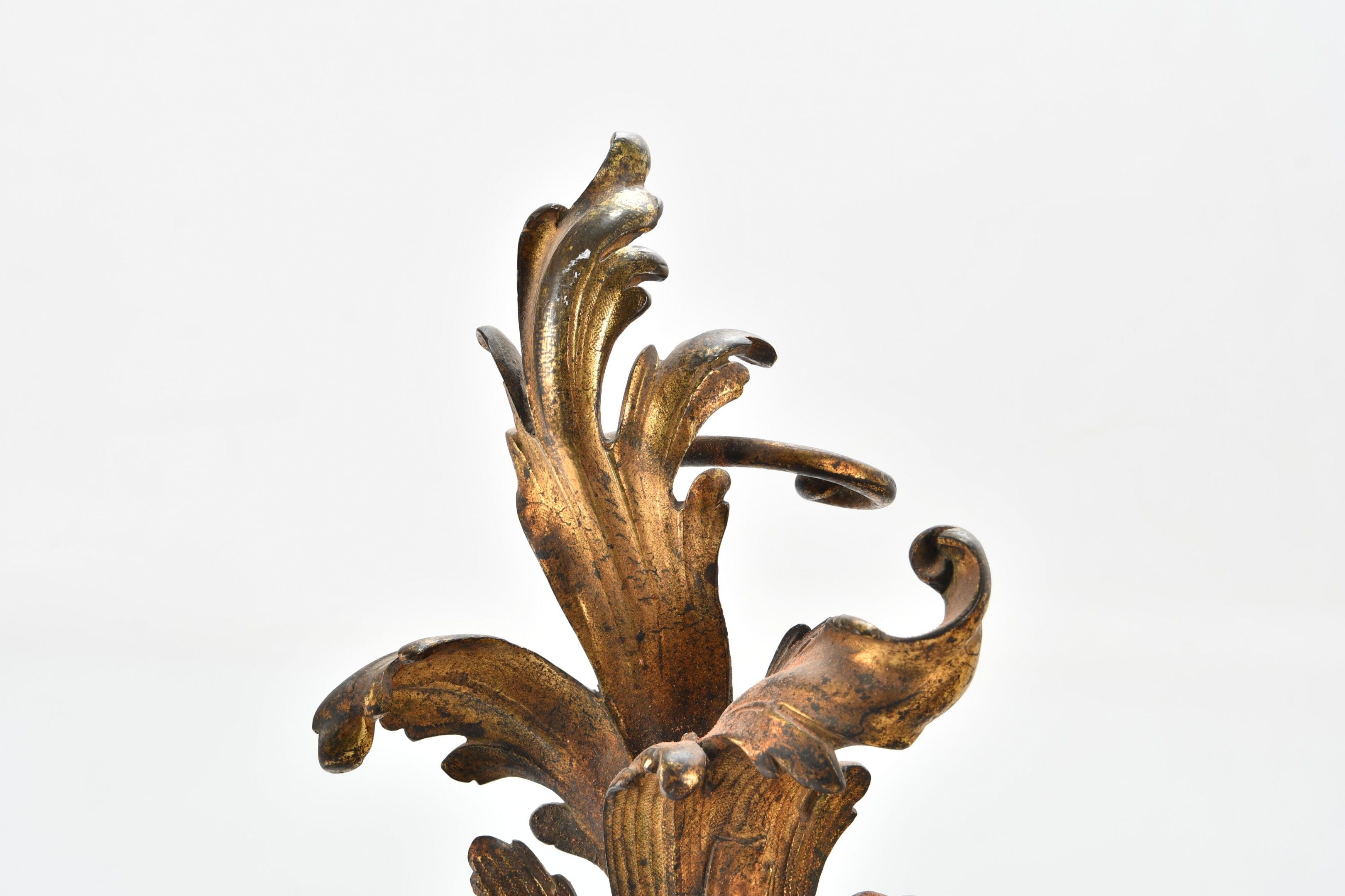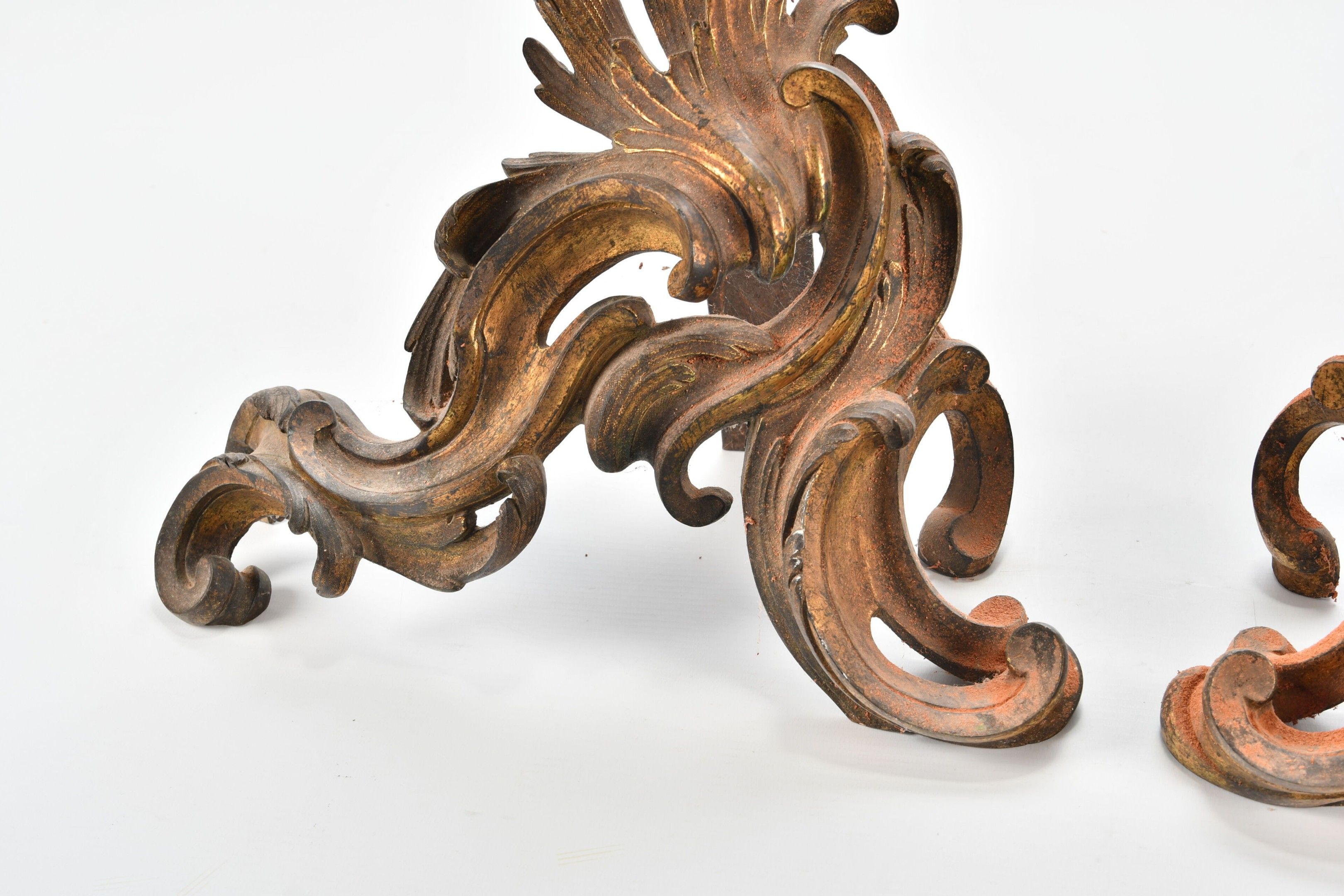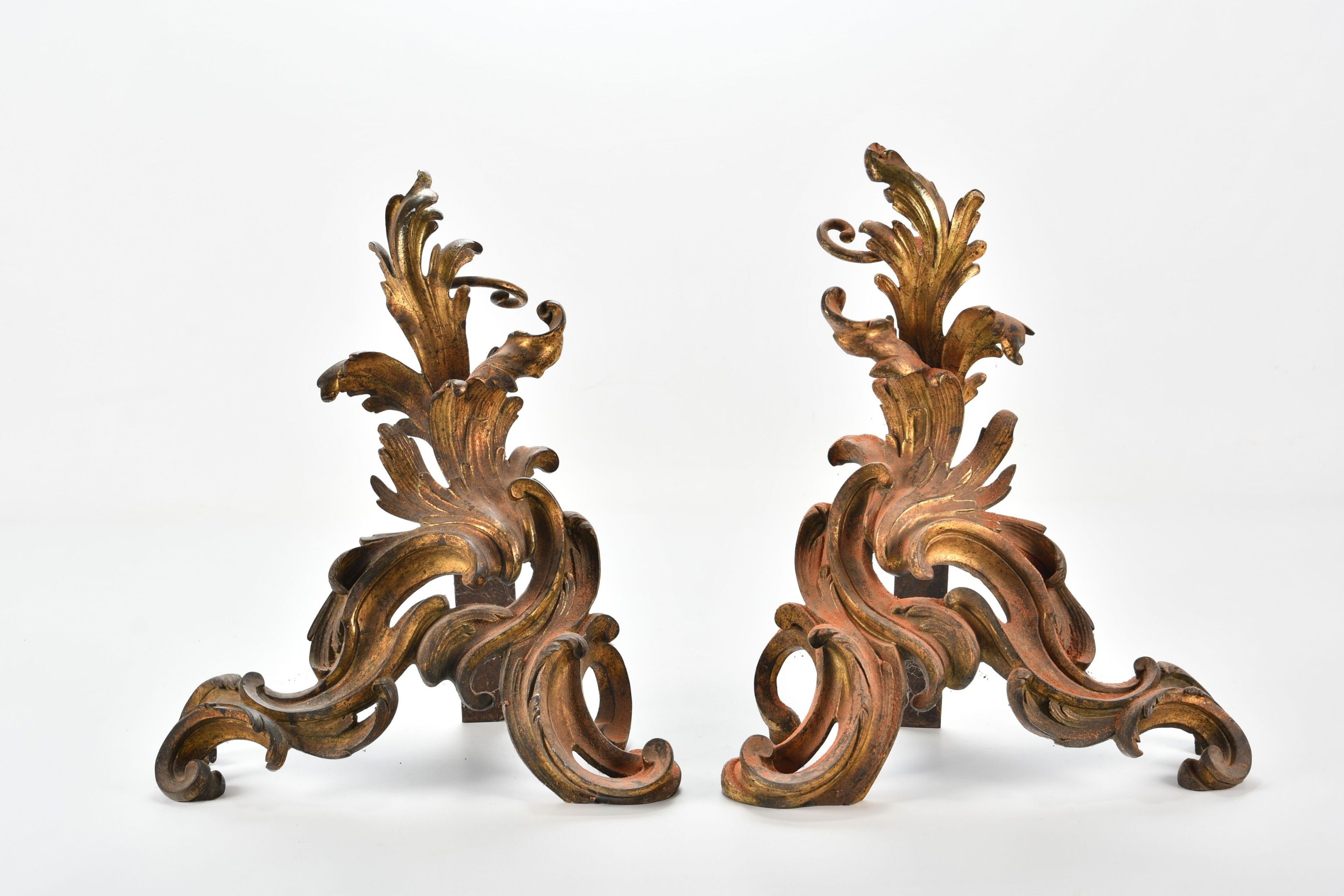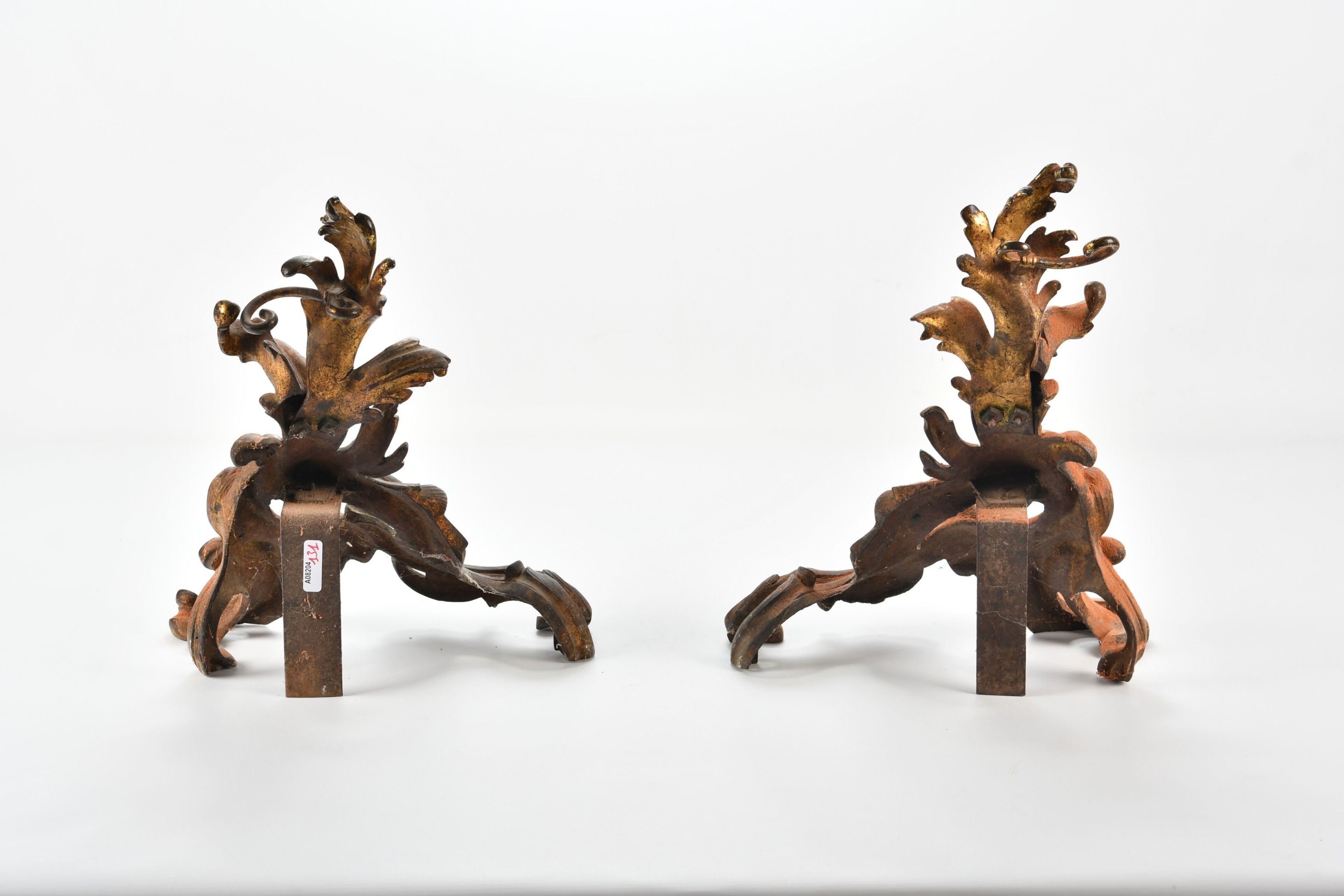 Gilt bronze andirons decorated with foliage. Louis XV style, 19th century. H. 40 - W. 32 cm. Worn and missing gilding.