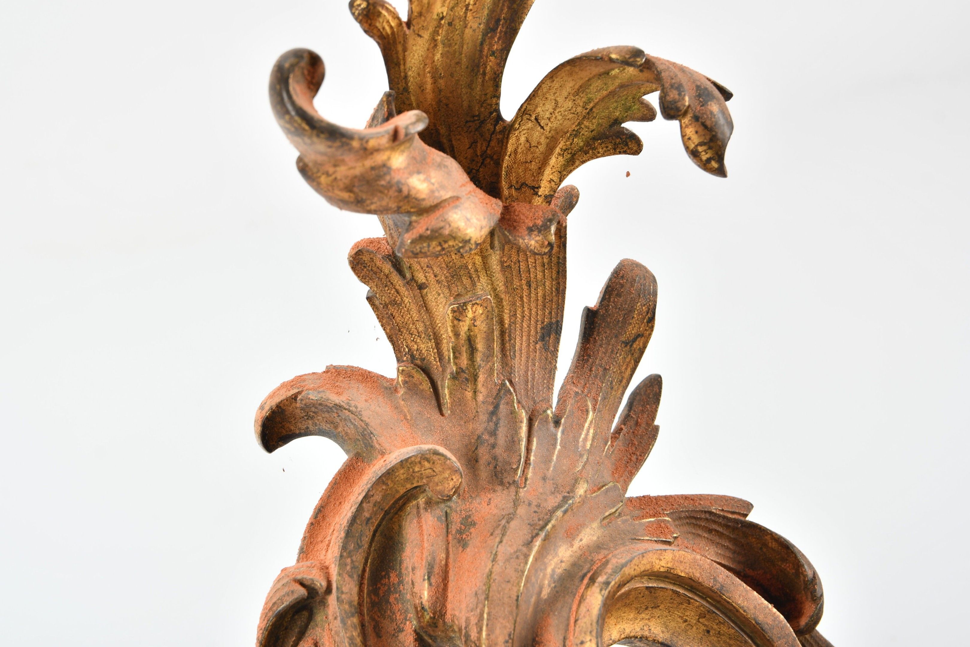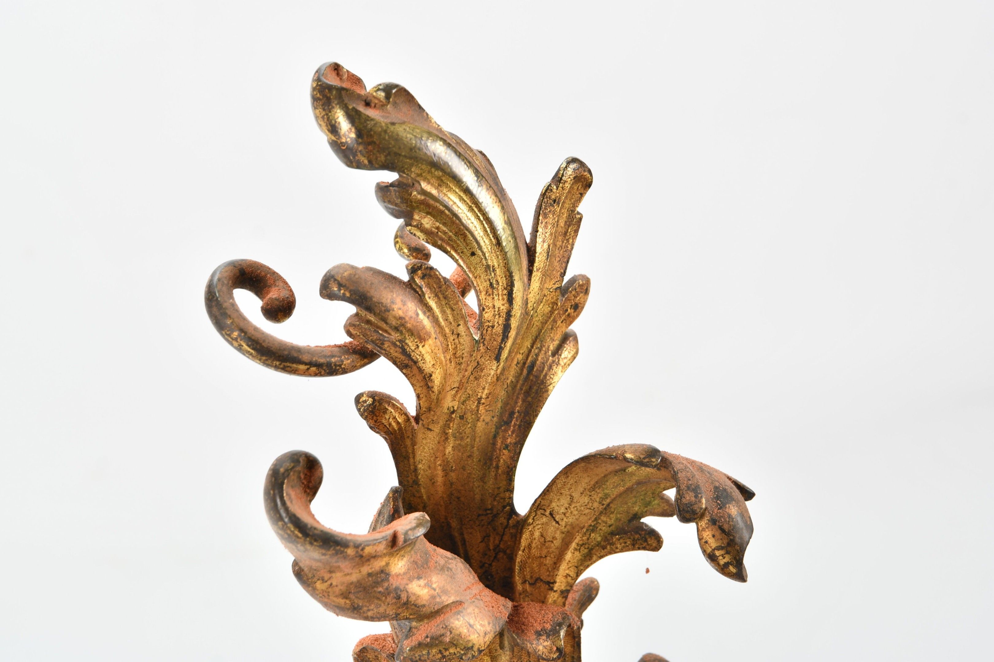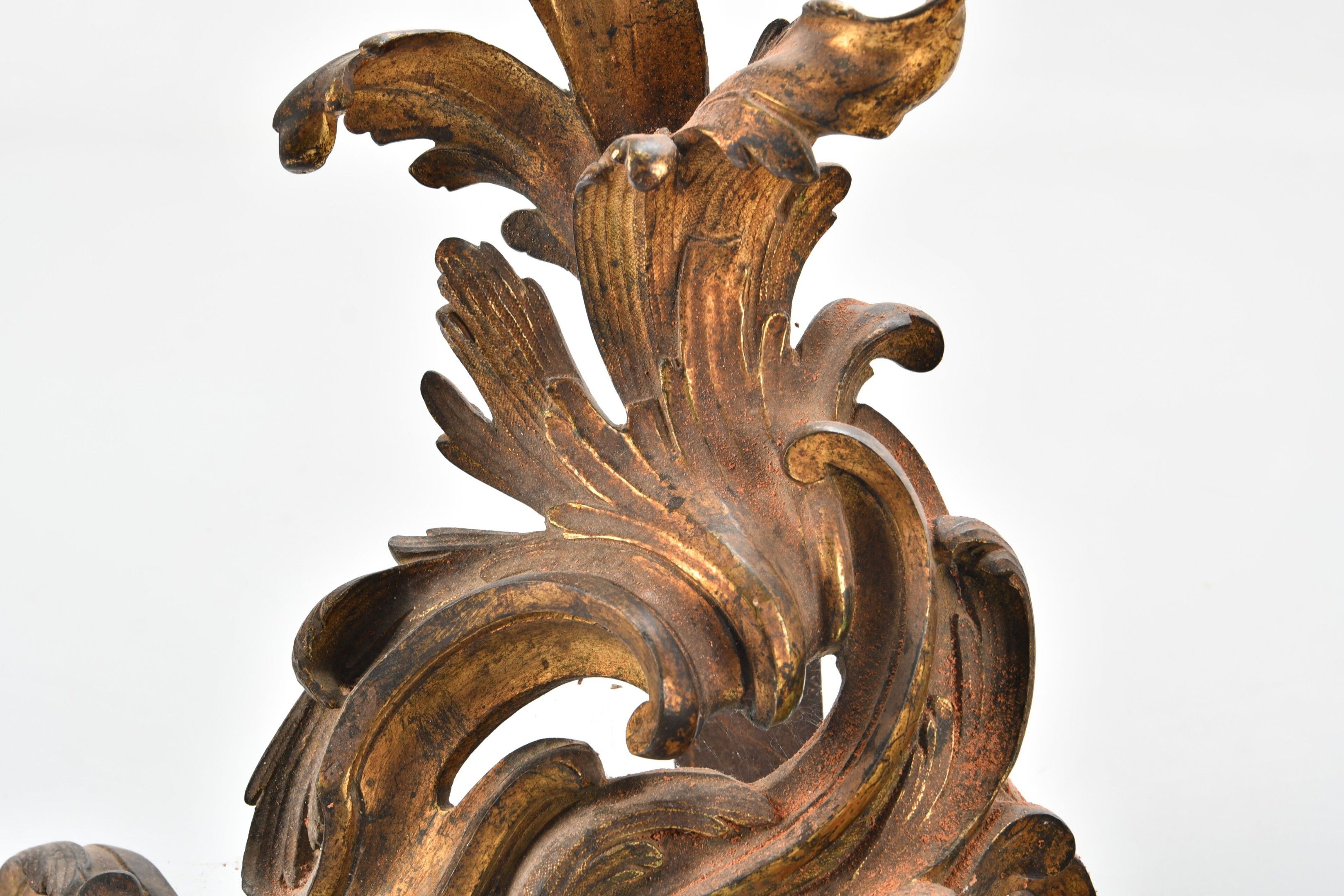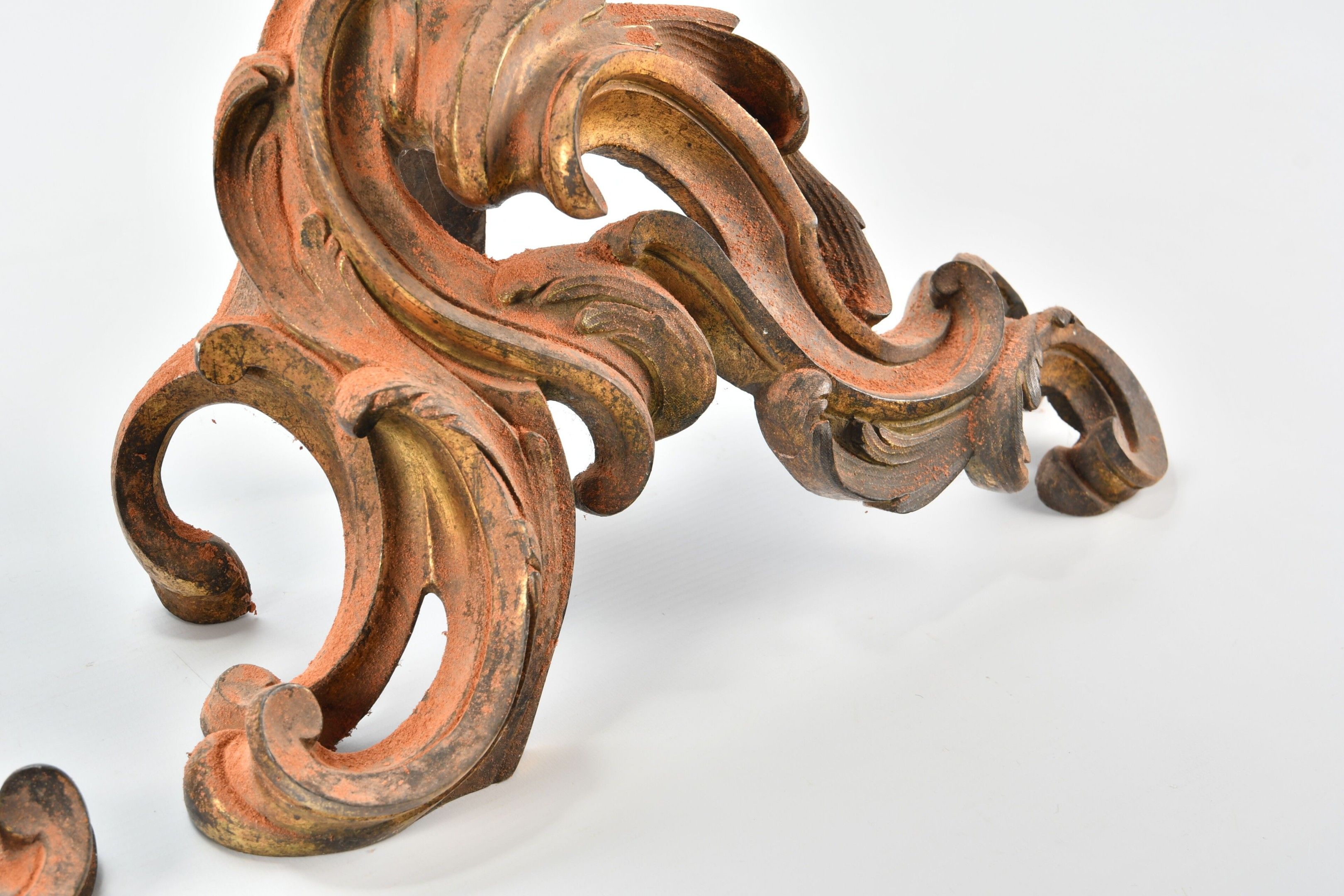 Gilt bronze andirons decorated with foliage. Louis XV style, 19th century. H. 40 - W. 32 cm. Worn and missing gilding.