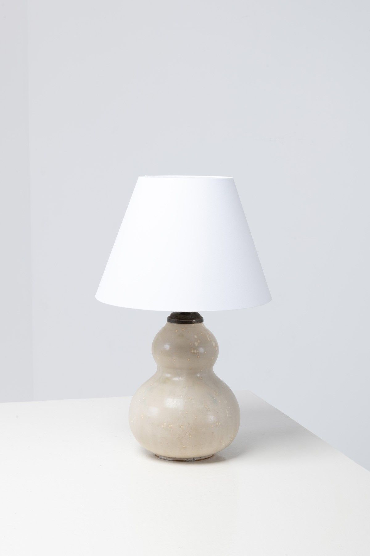 Axel Salto (1889-1961) Lamp model n°3524 Glazed ceramic and textile Royal Copenhagen edition Incised signature 'SALTO', factory monogram 'Royal Copenhagen Denmark' and numbered '3524 Created circa 1930 H 27ר 19cm (with shade: H 52ר 32cm) Bibliography: 'Axel Salto, Master of stoneware', S. Bruhn and P. Wirnfeldt, CLAY Museum of Ceramic Art Denmark, 2017, similar shape p.186