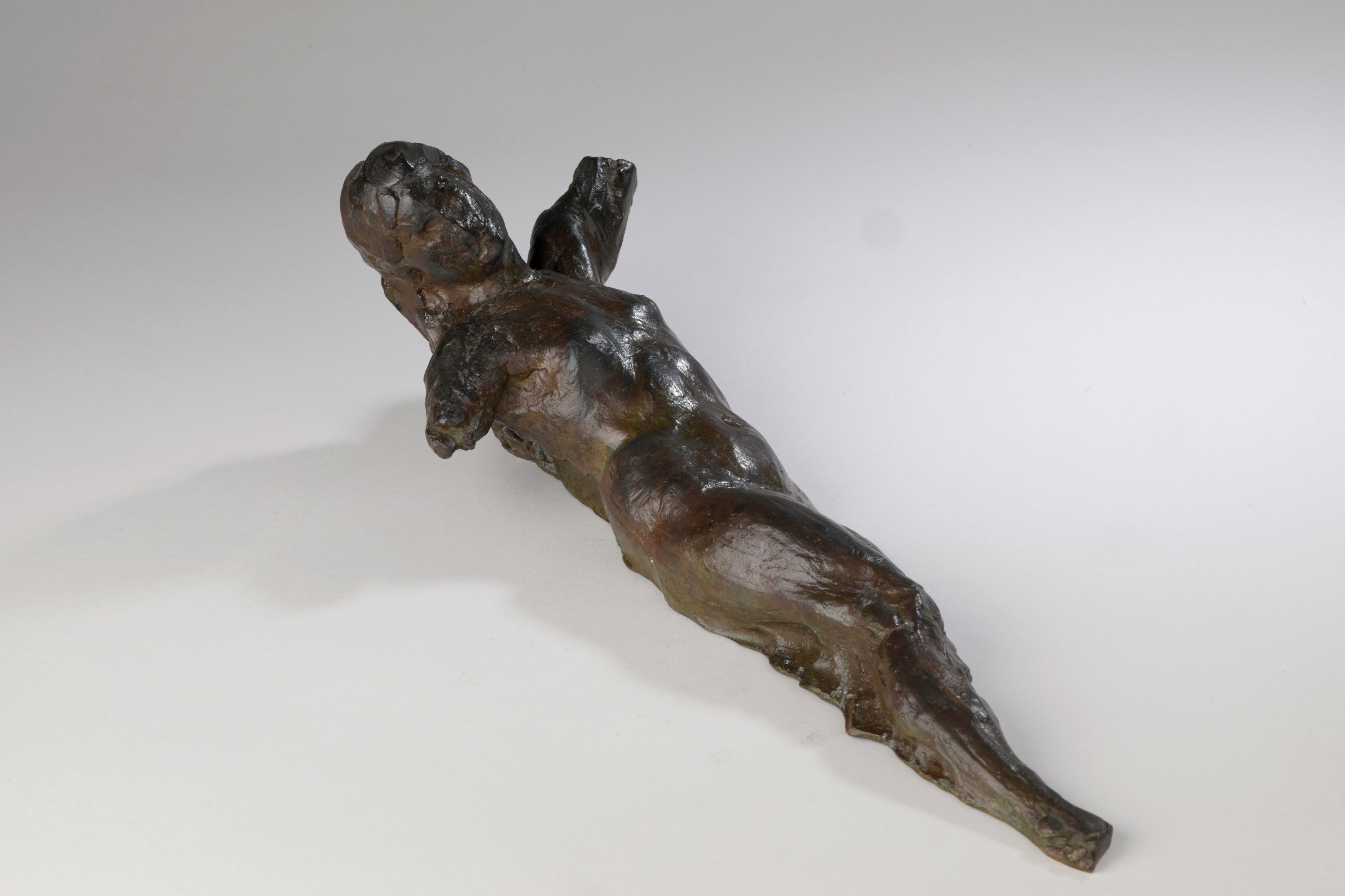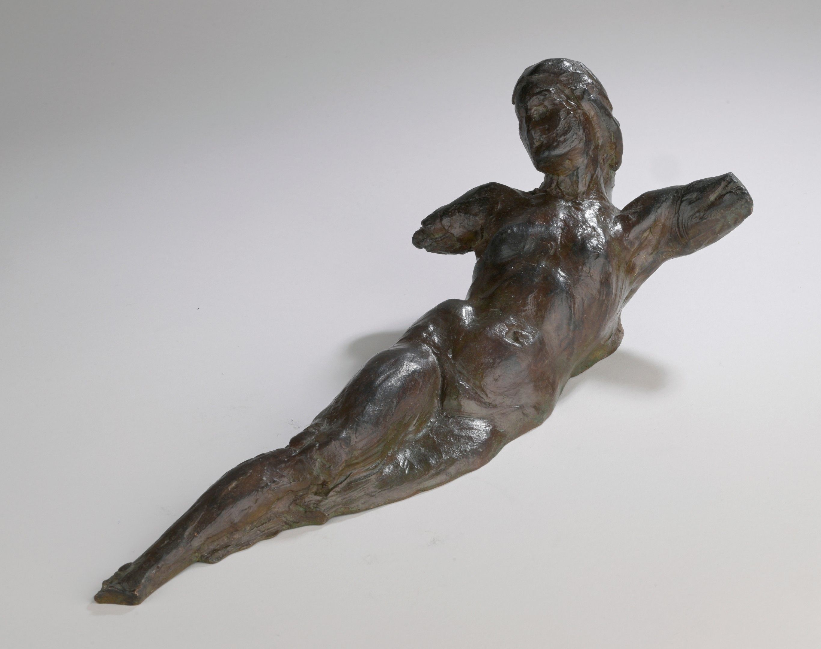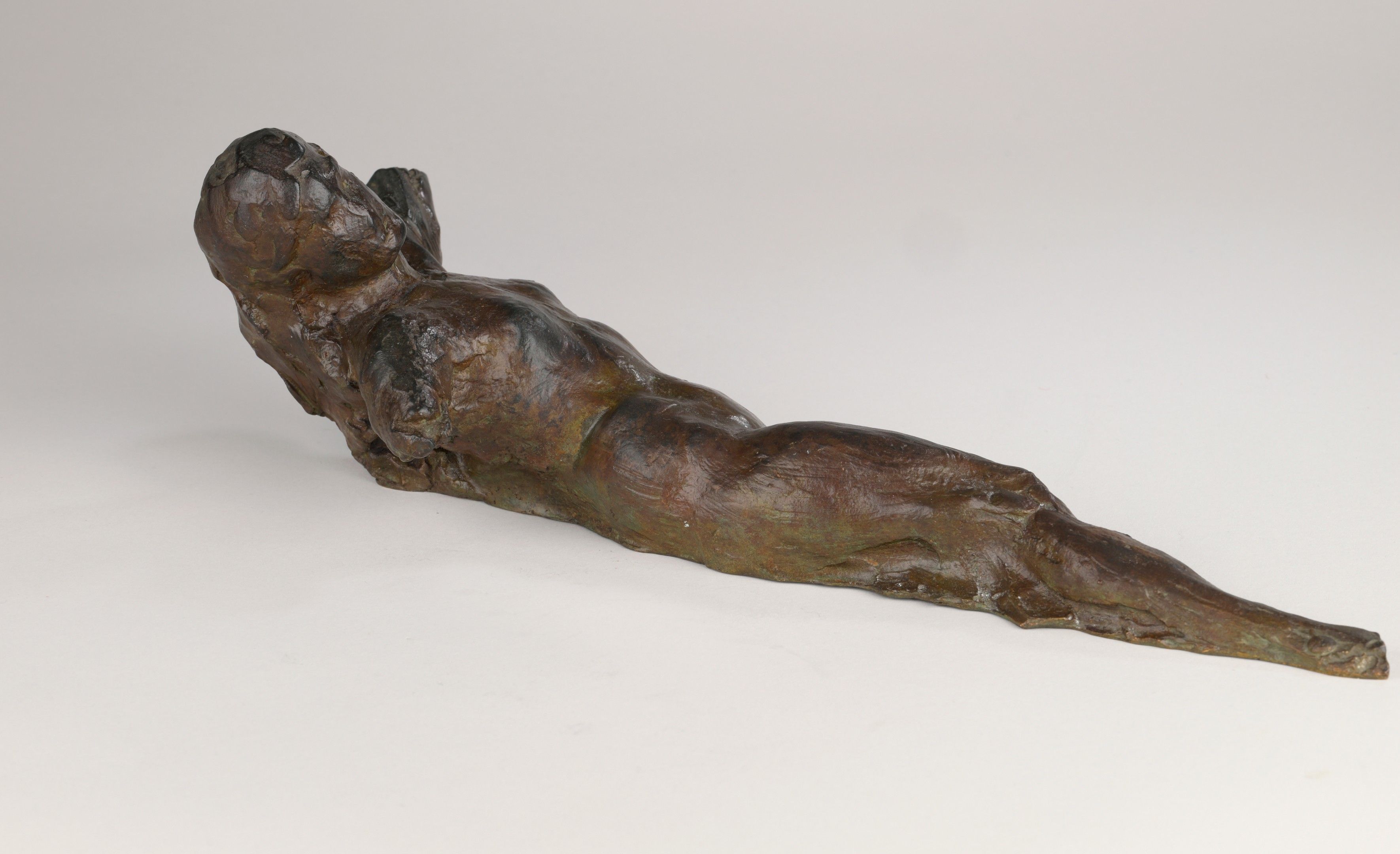 Bronze with red-brown patina shaded with green