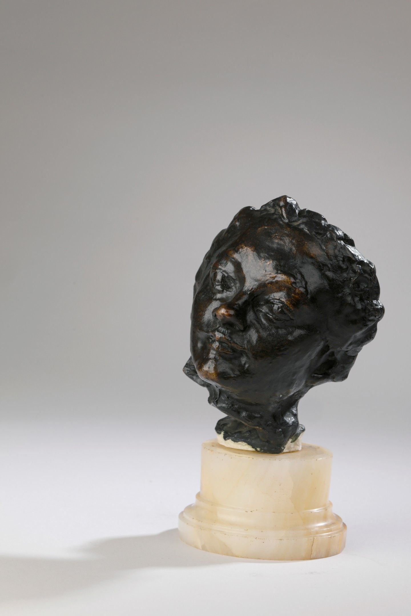 -Auguste Rodin, Petite tête au nez retroussé, ou Minna Schrader de Nyzot?, circa 1880-1890, cast before 1916, bronze, sand casting, signed "A. Rodin" under the left ear, bears the founder's mark "A. RUDIER FONDEUR / PARIS" on the back of the base, H. 18.5 x W. 10.5 x D. 9 cm, Paris, Musée Rodin, n°inv. S.00631