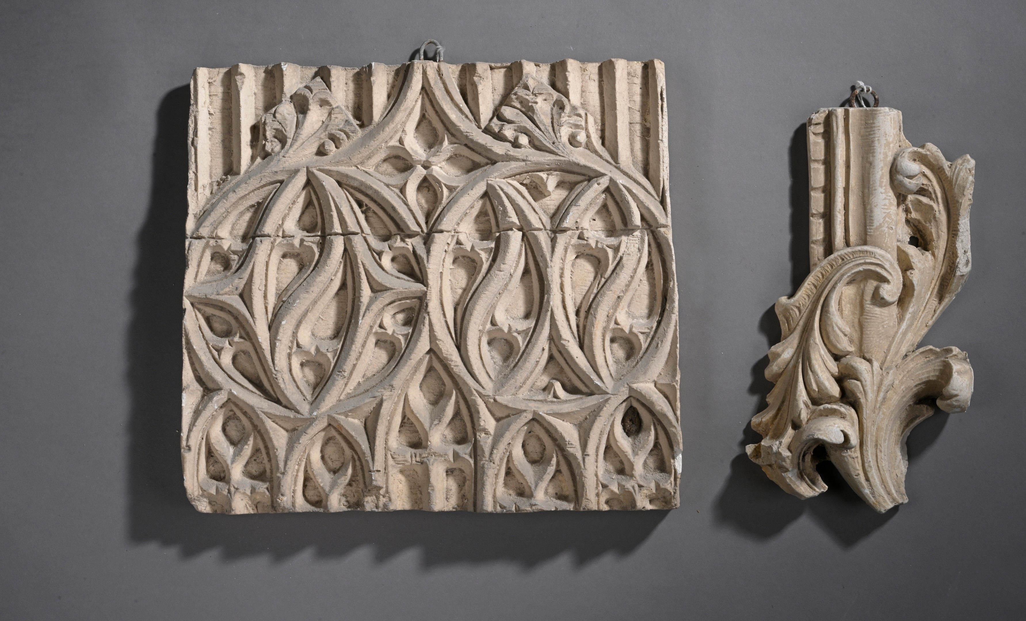 Fragment of a flamboyant Gothic panel and fragment of a frieze with scrolled leaves
