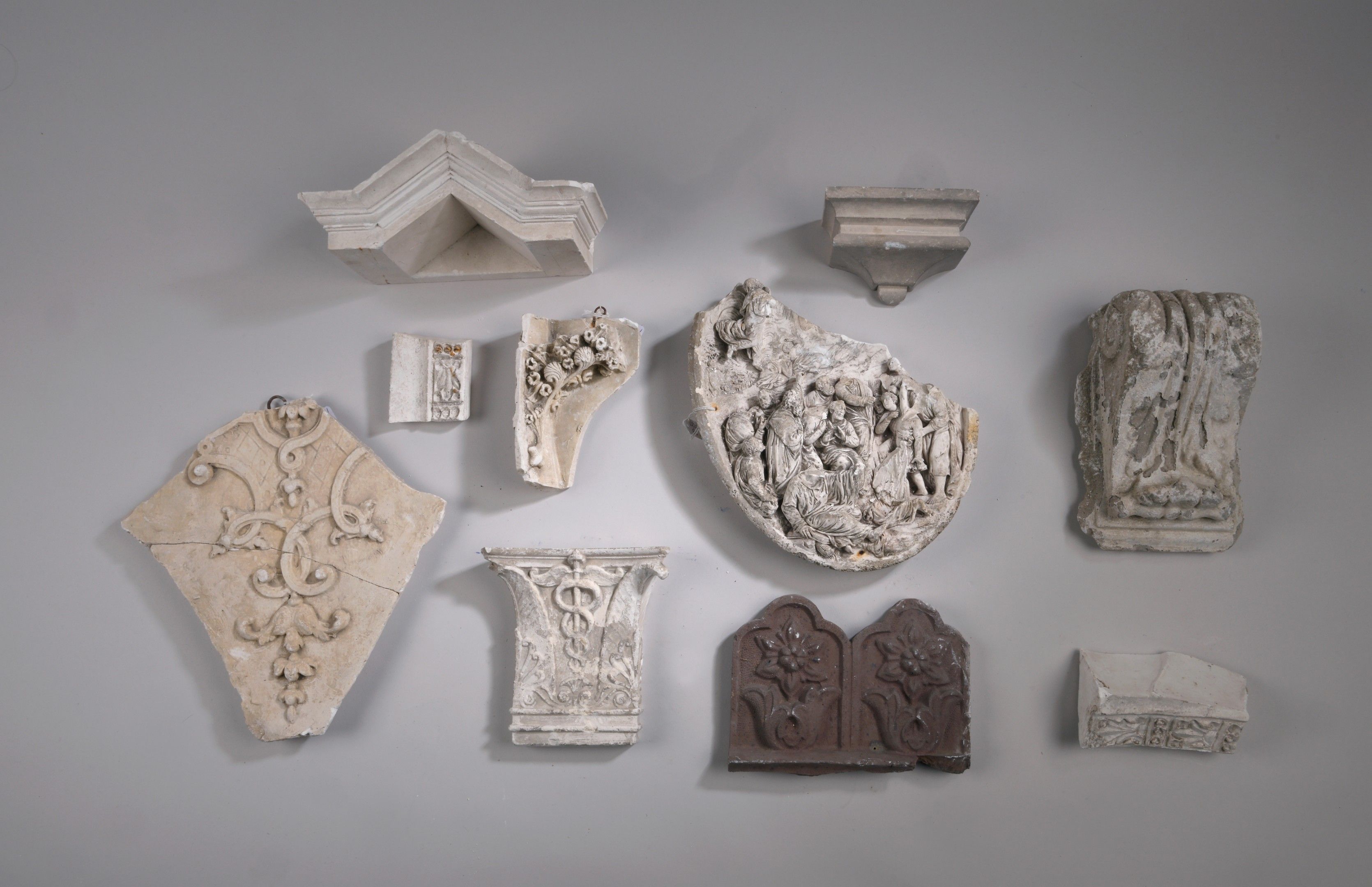Set of ten plaster casts including mould fragments, a fragment after Raphael representing the Ascension of Christ, architectural elements and decorative motifs