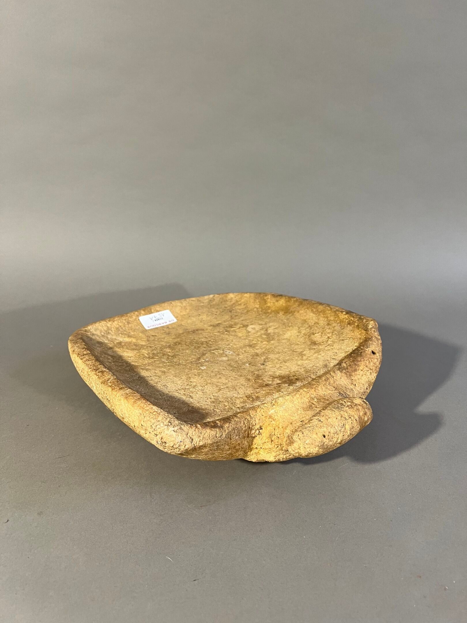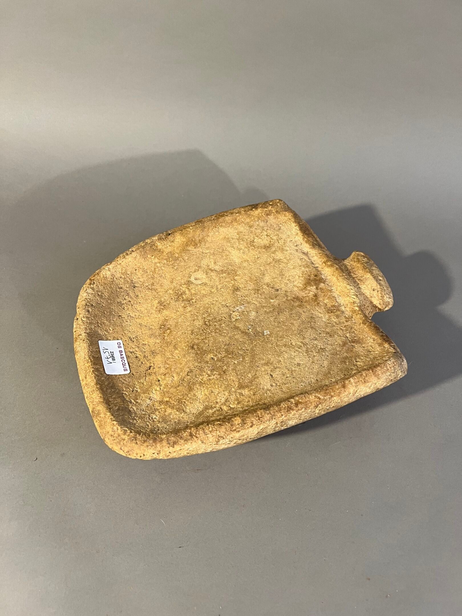 Rectangular in shape, hollowed out in the centre by use, possibly evoking a stylised figure (vertical). Socket at one end.