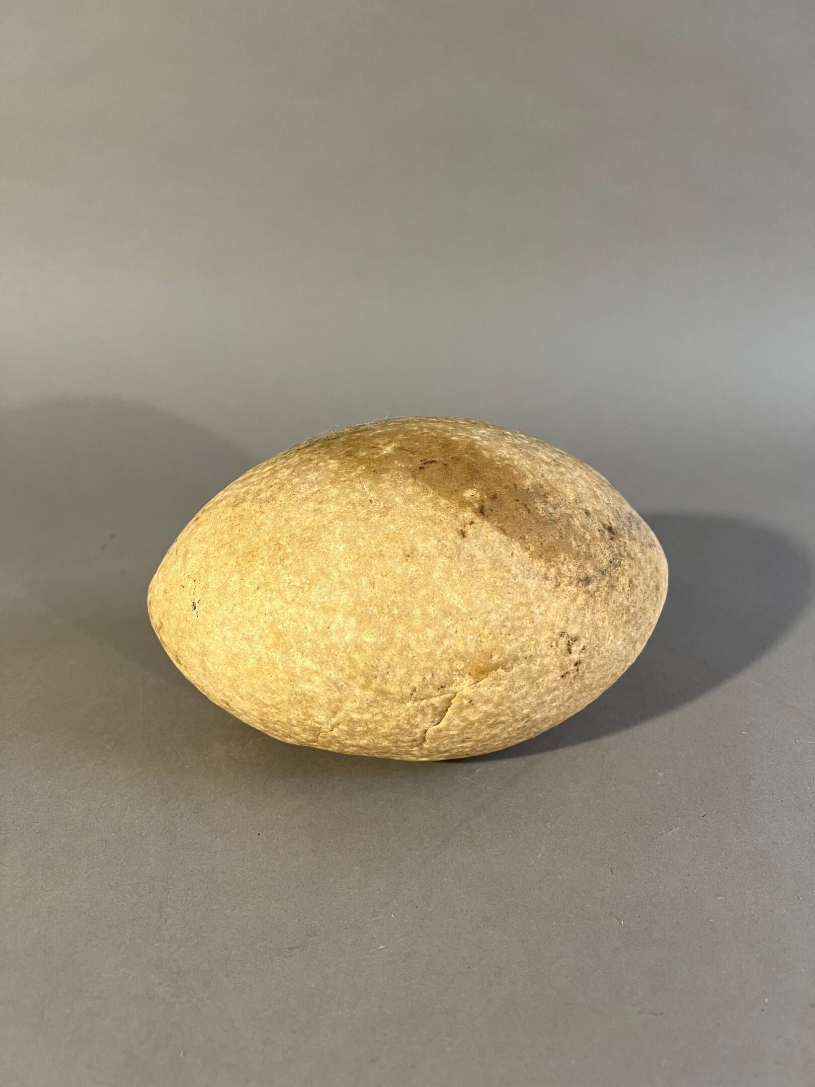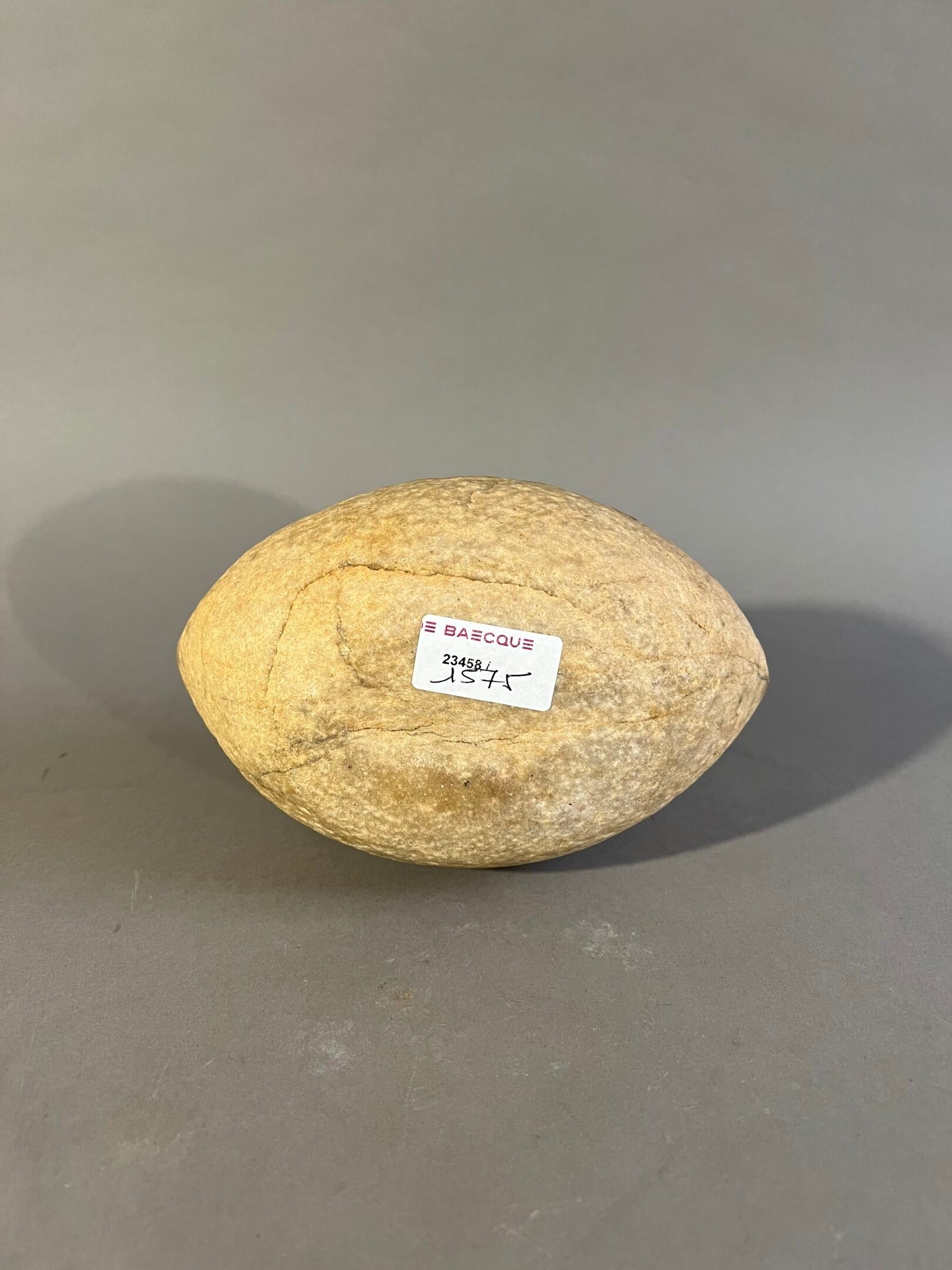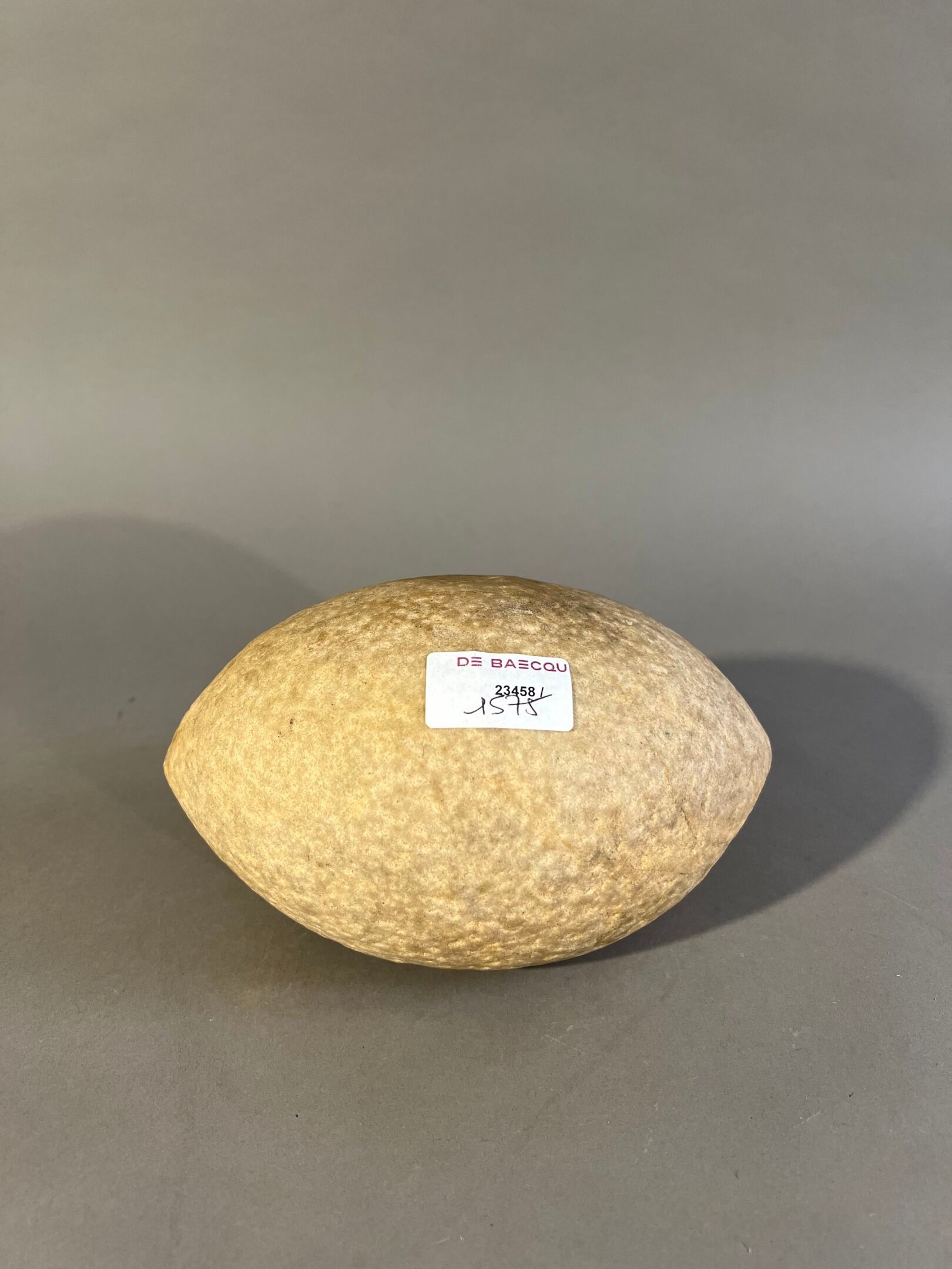 Egg-shaped ("rugby ball"), with a grained appearance.