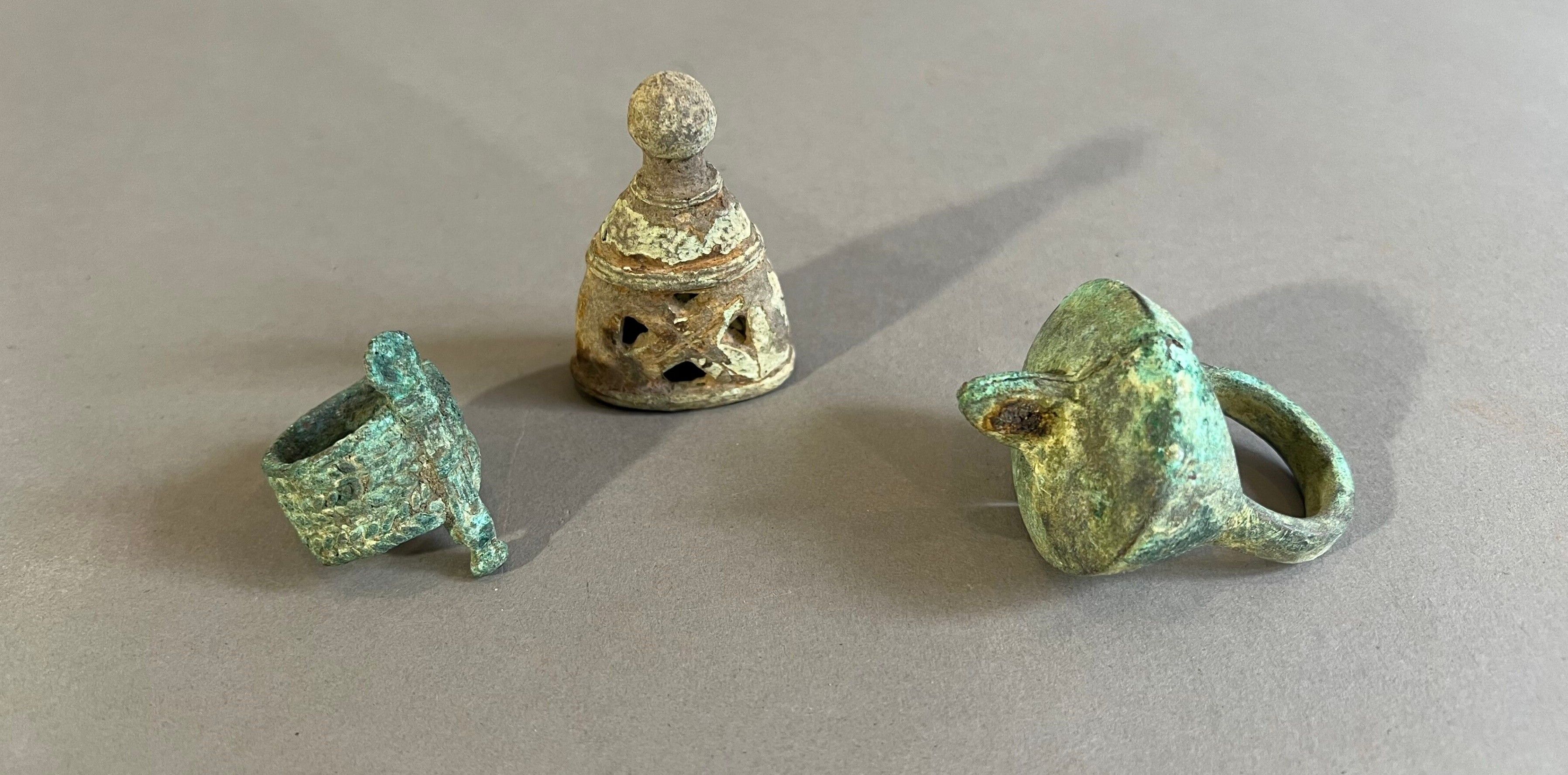 -3. Ceremonial bell in the form of a swollen triangle with openwork geometric decoration.