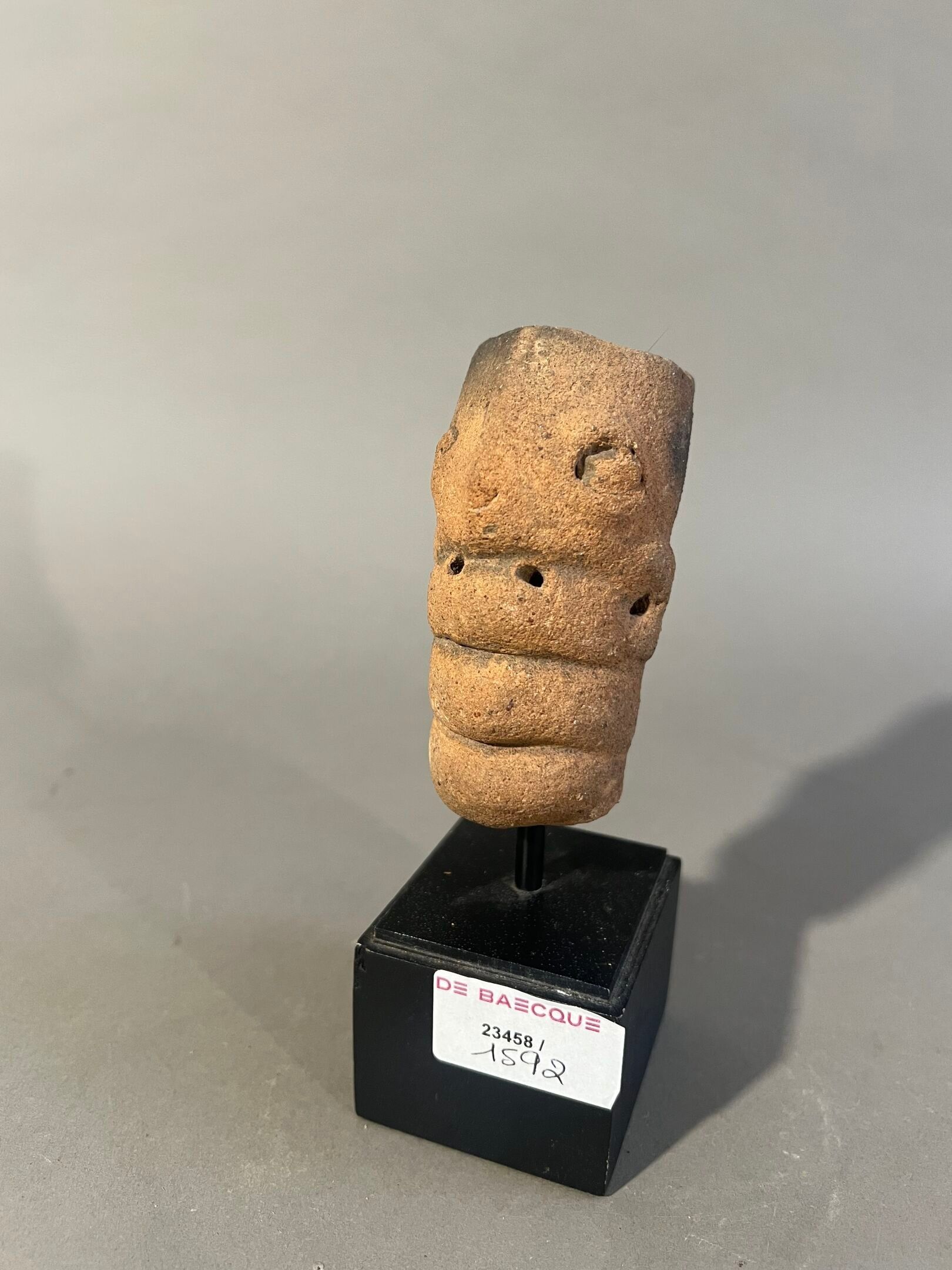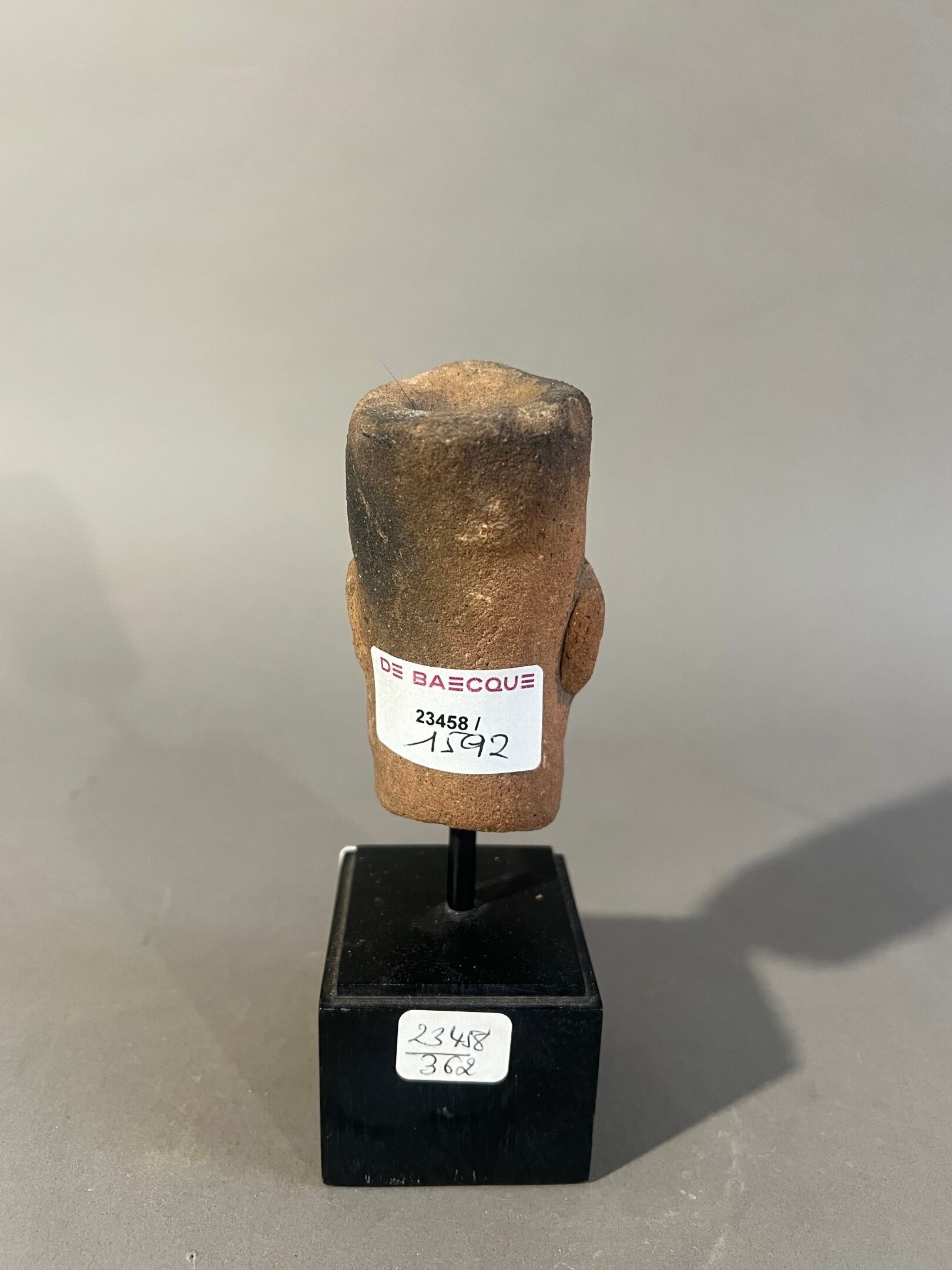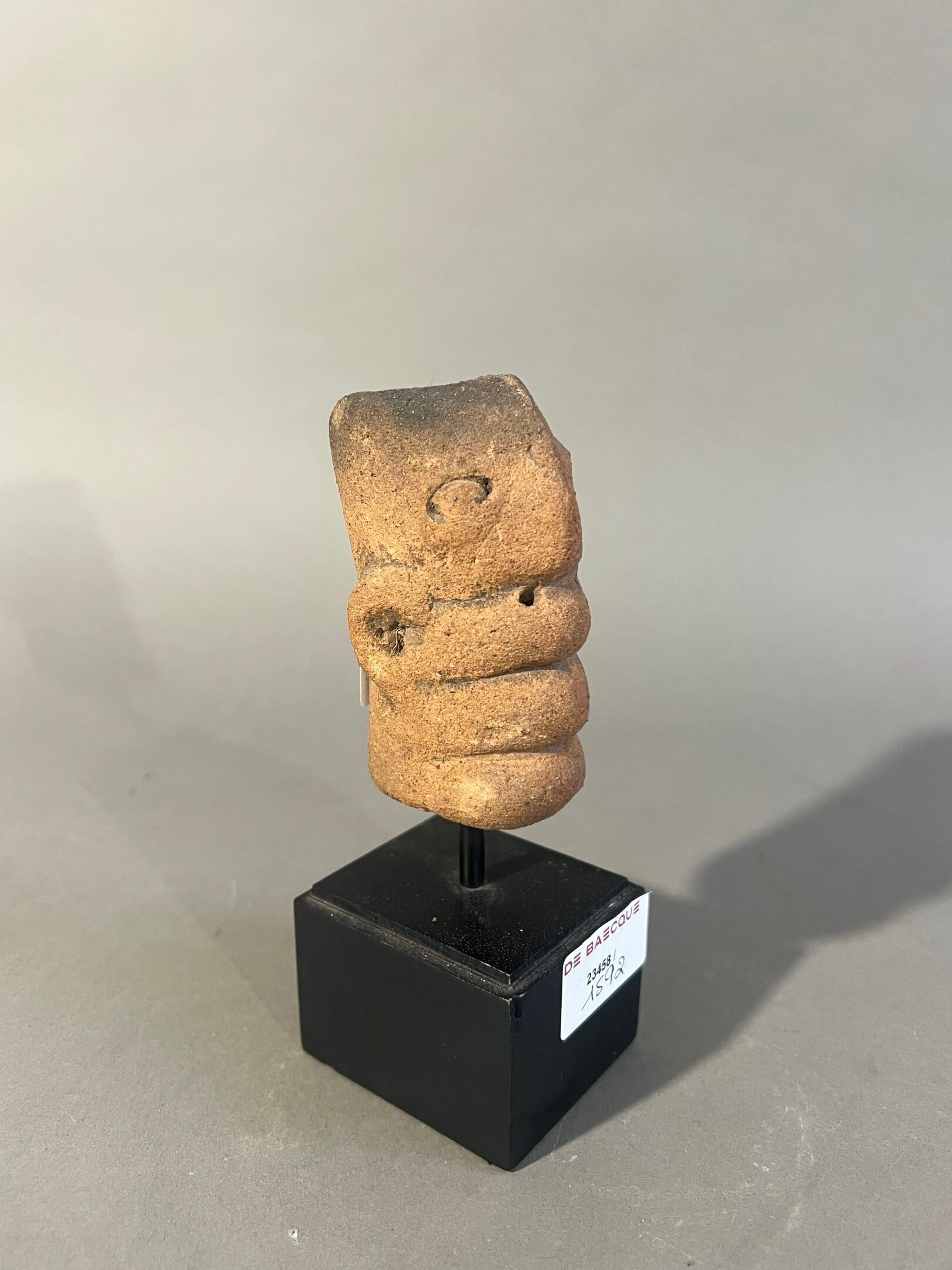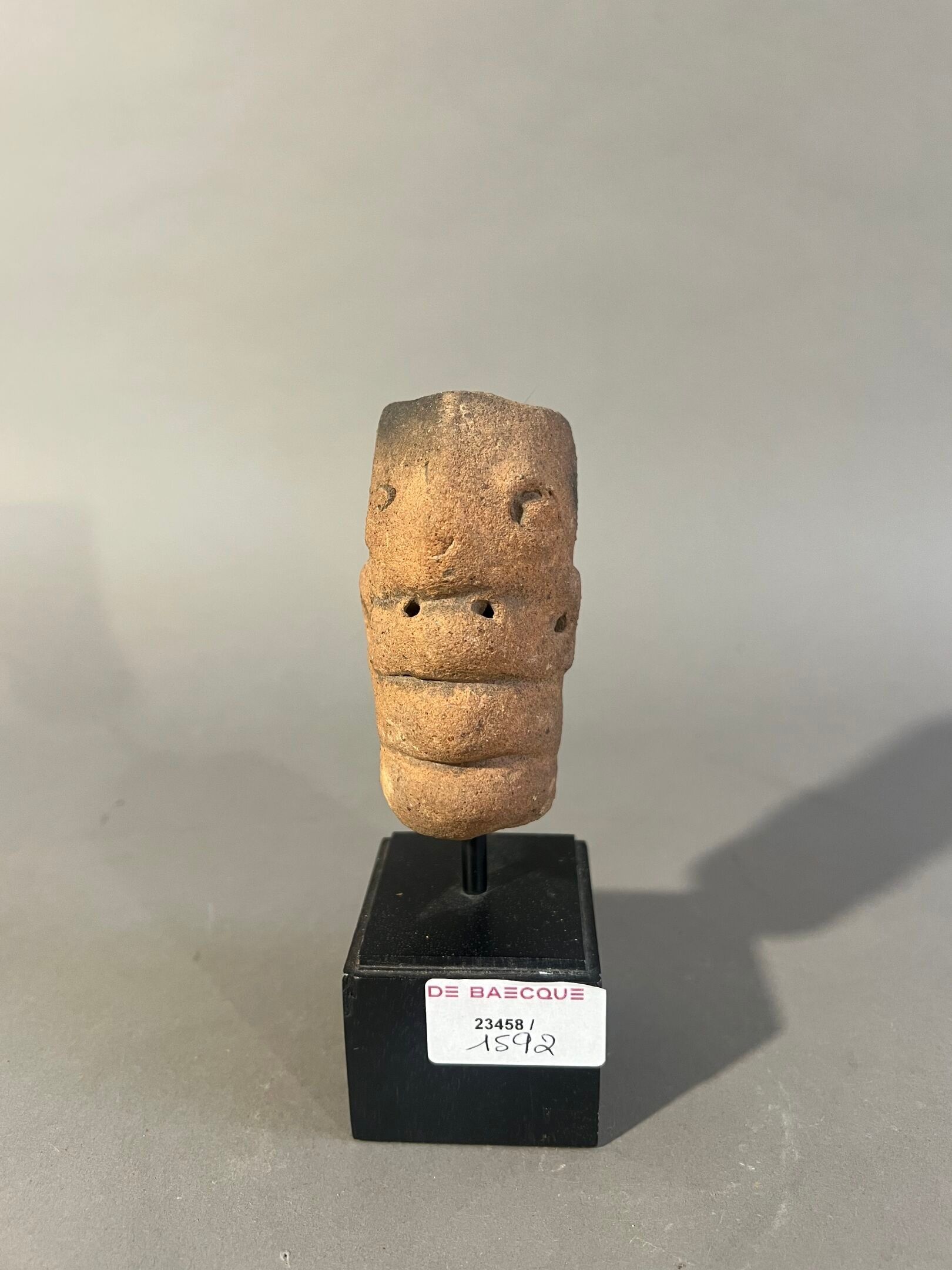 Head with schematised caricatured features; probably reliquary cavity at the top of the head.