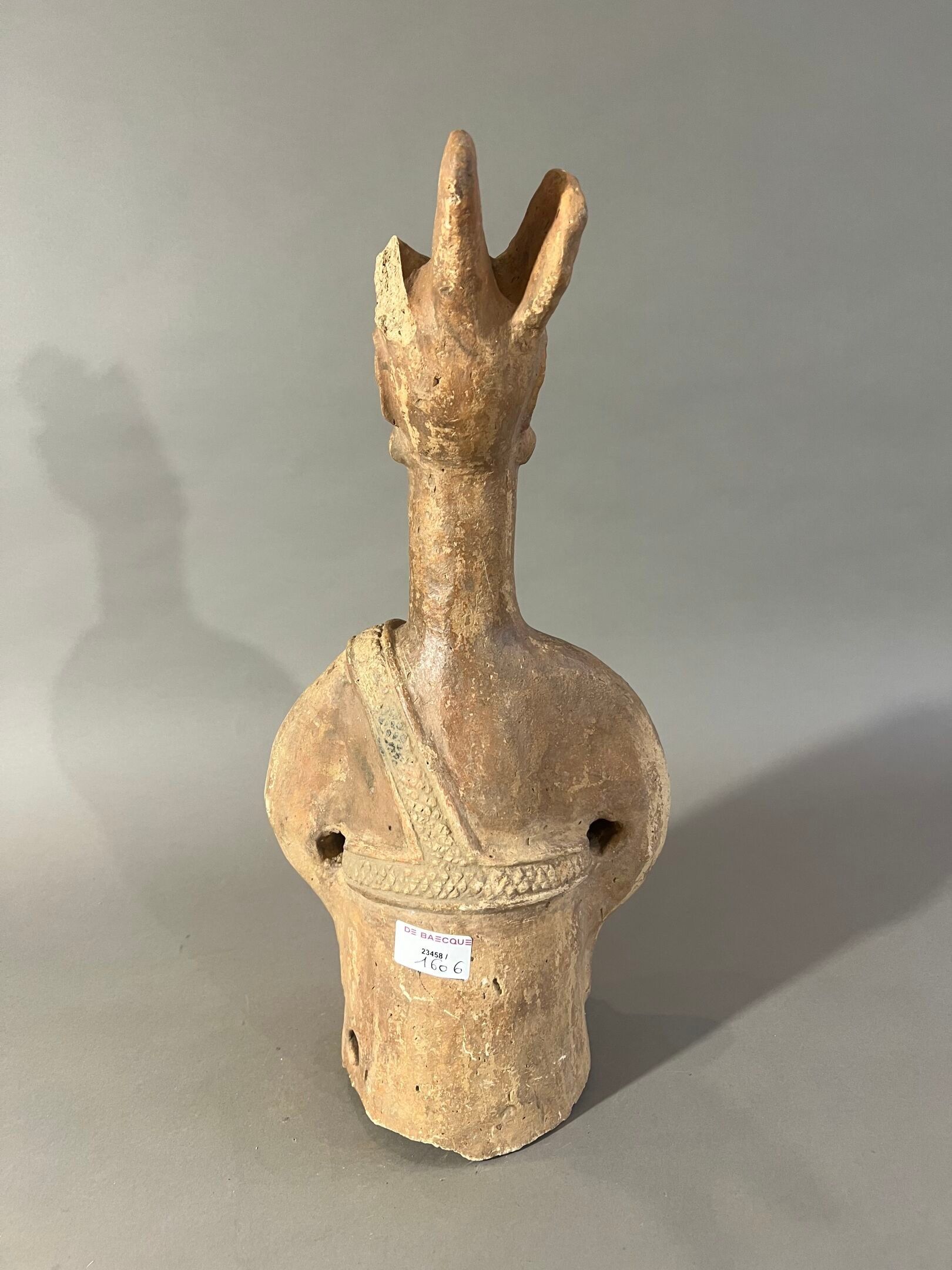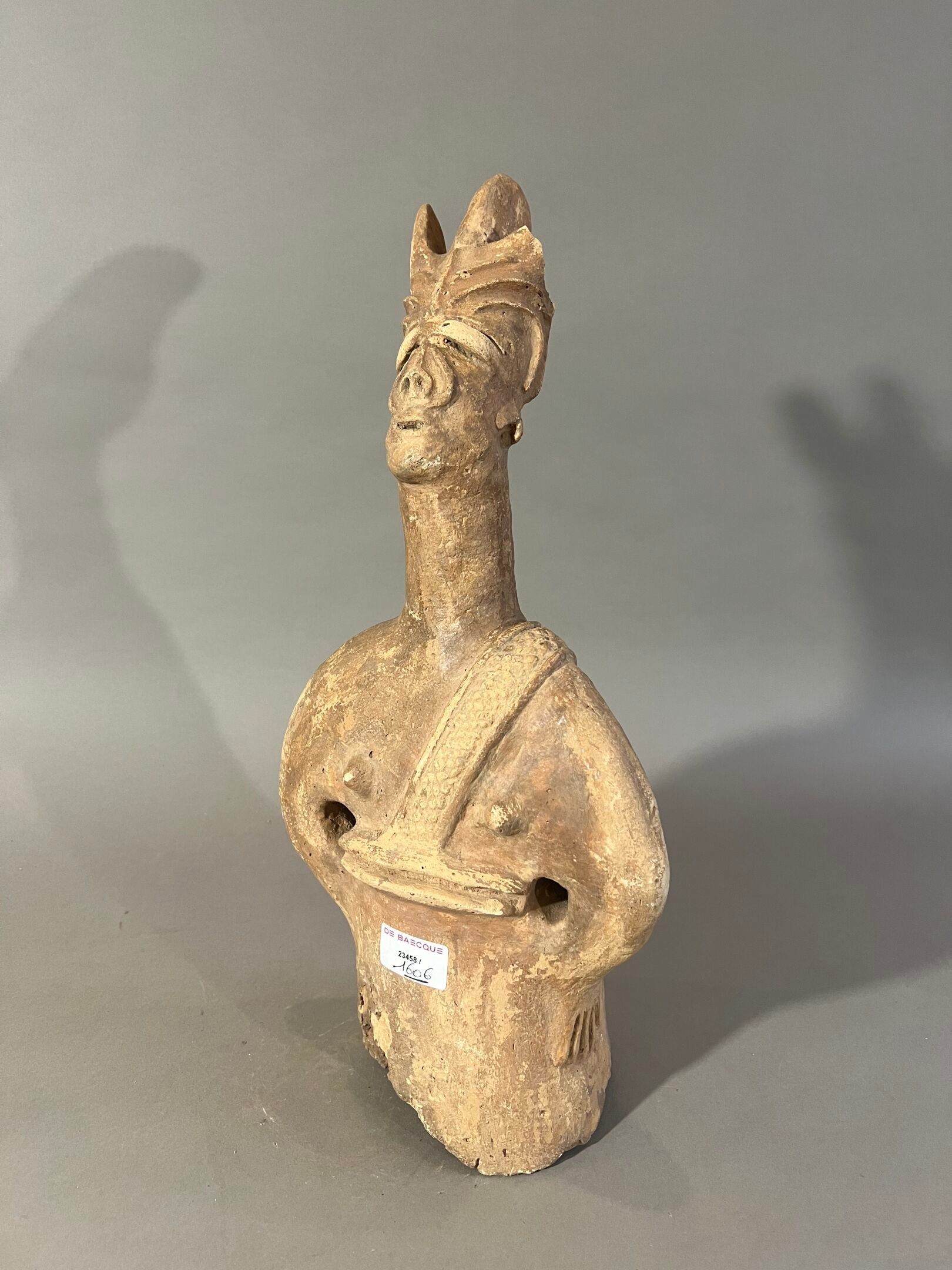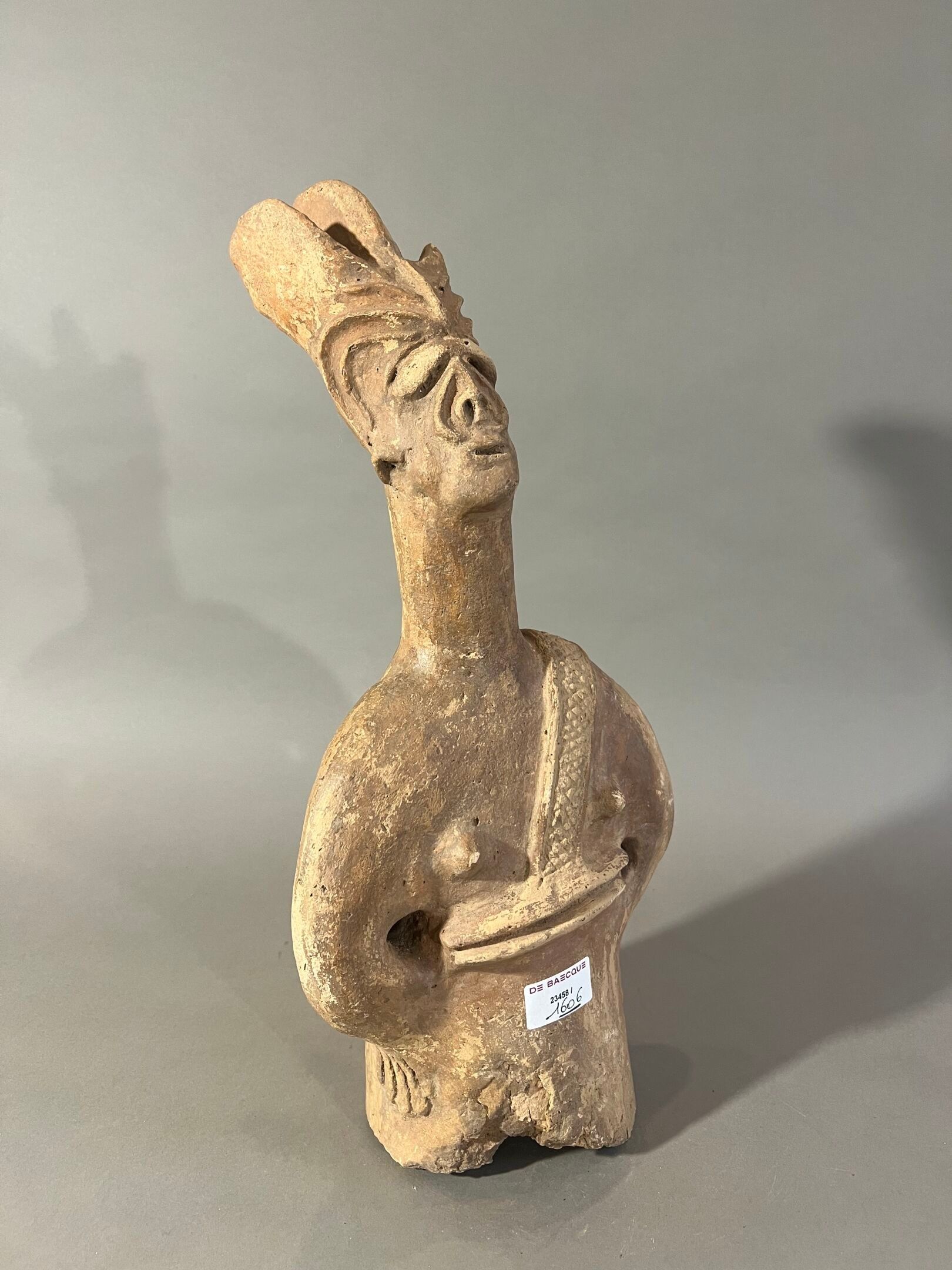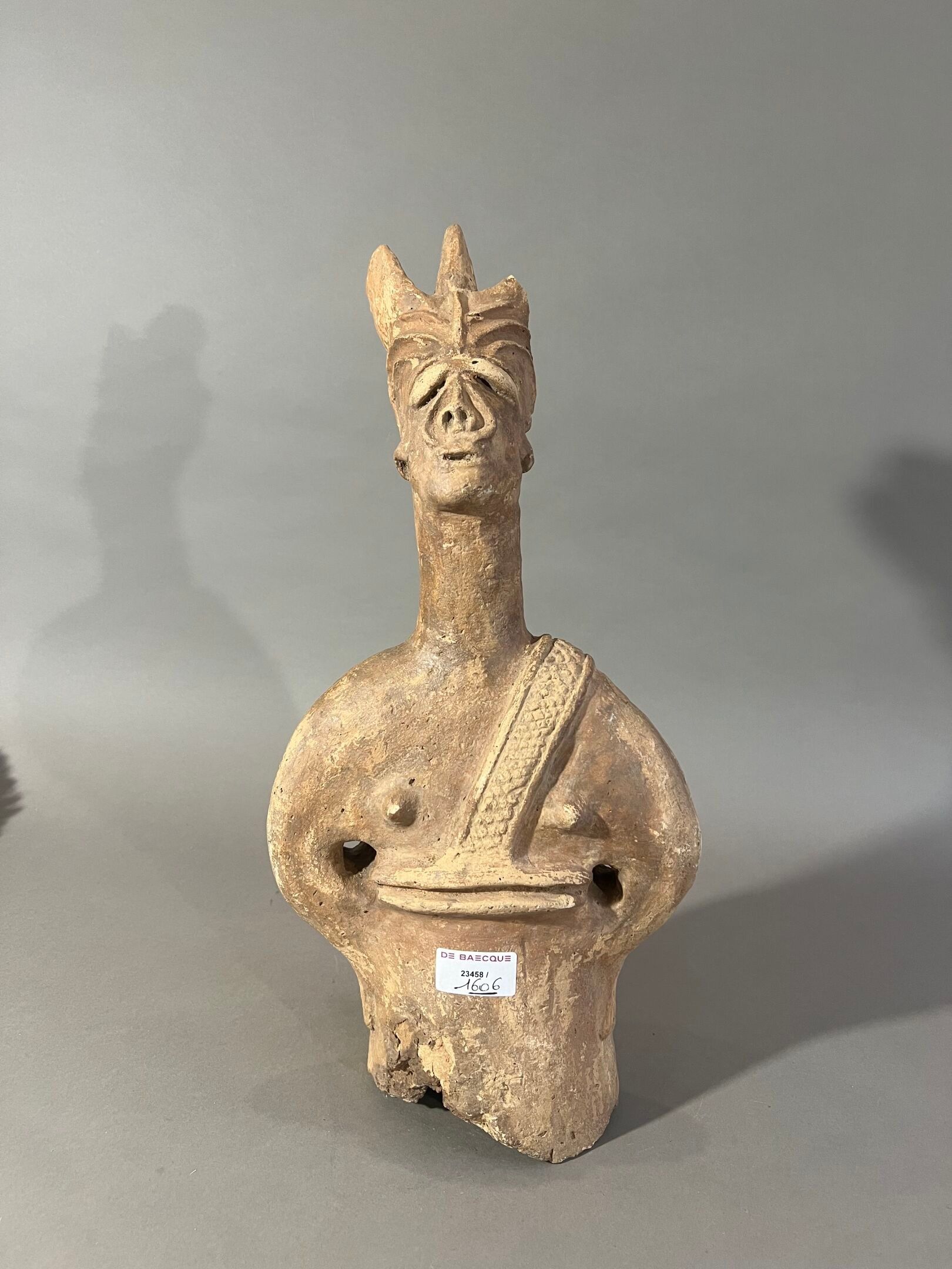 Adorned with a harness, the arms are set in the mass, the hands are figured. The face is geometric, topped with a three-lobed headdress (one lobe damaged), the eyes in relief.