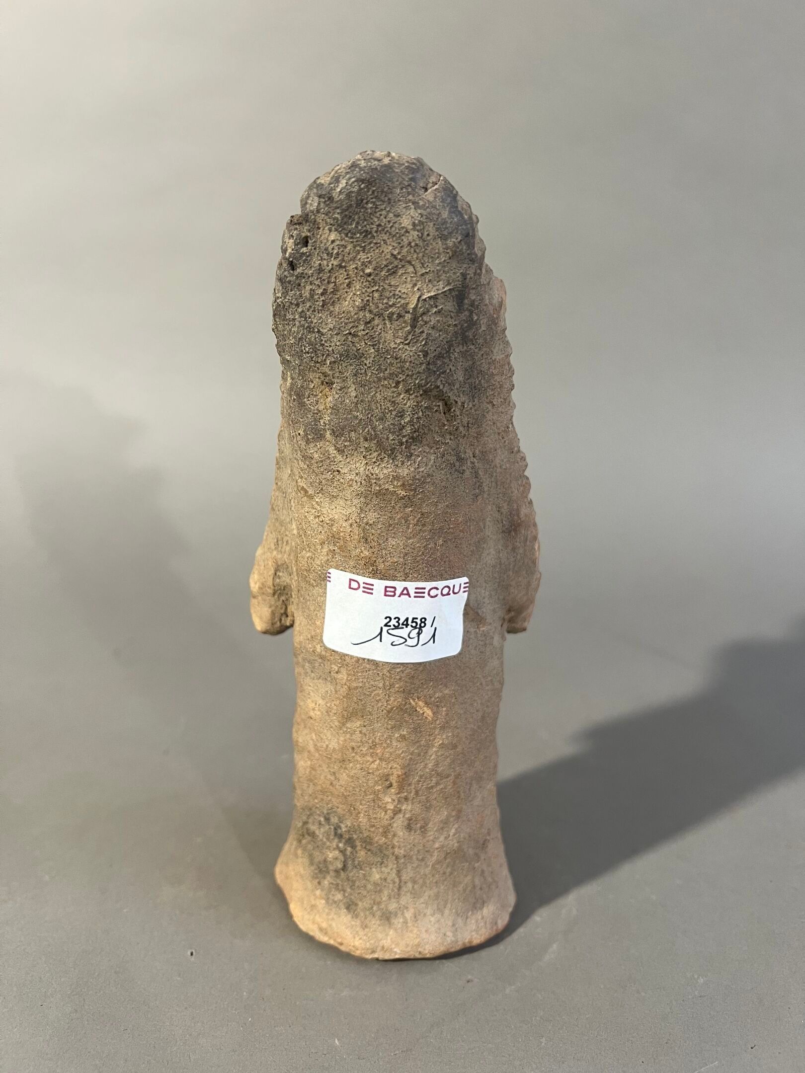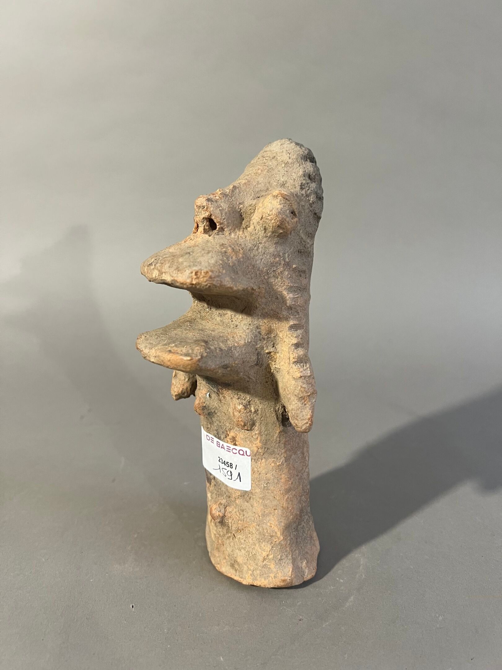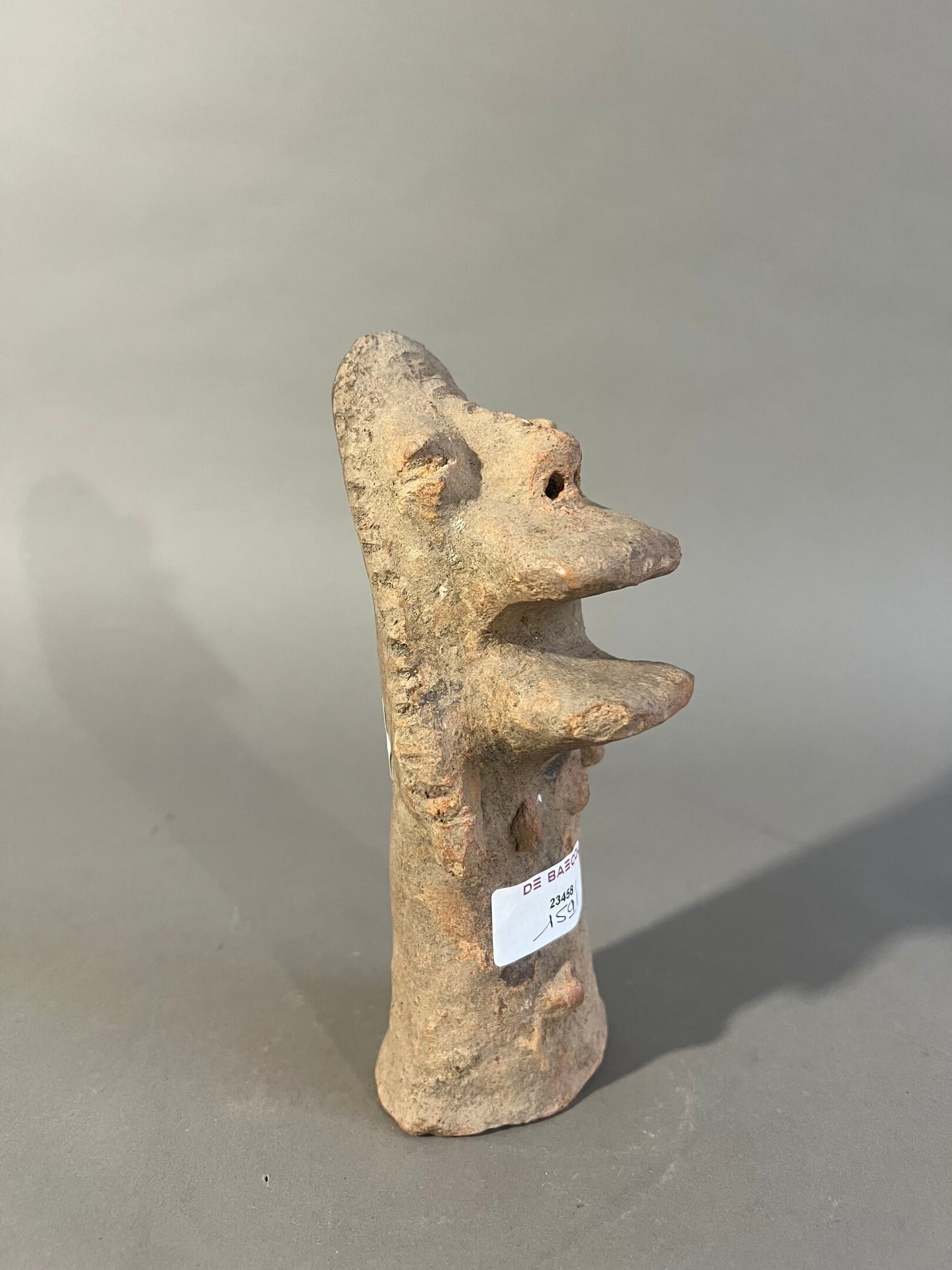 A rare figure with outstretched arms and a half-open mouth with very pronounced lips in relief. The features are extremely exaggerated, typical of the Sao culture.