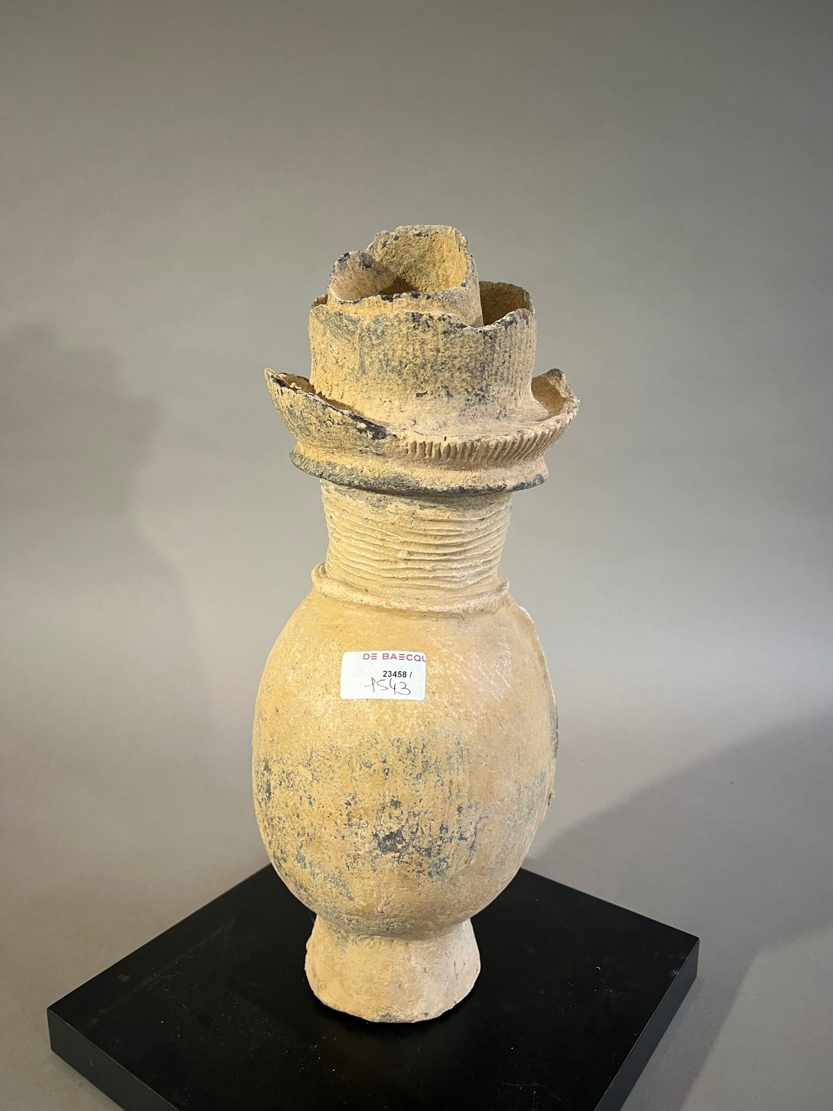 The head is represented by three striated rows, the neck is decorated with a spiral motif, and the body with vertical lines in relief.