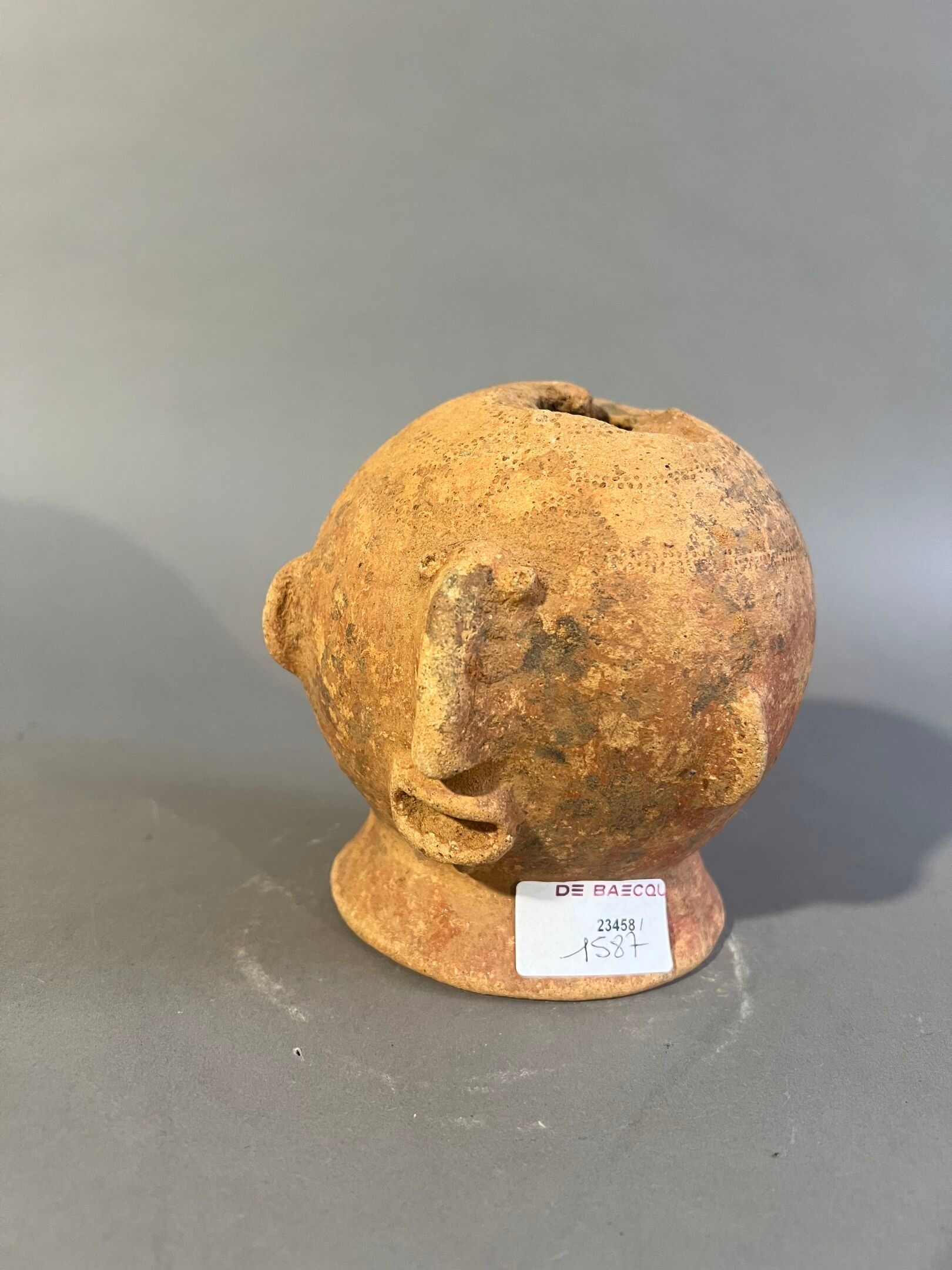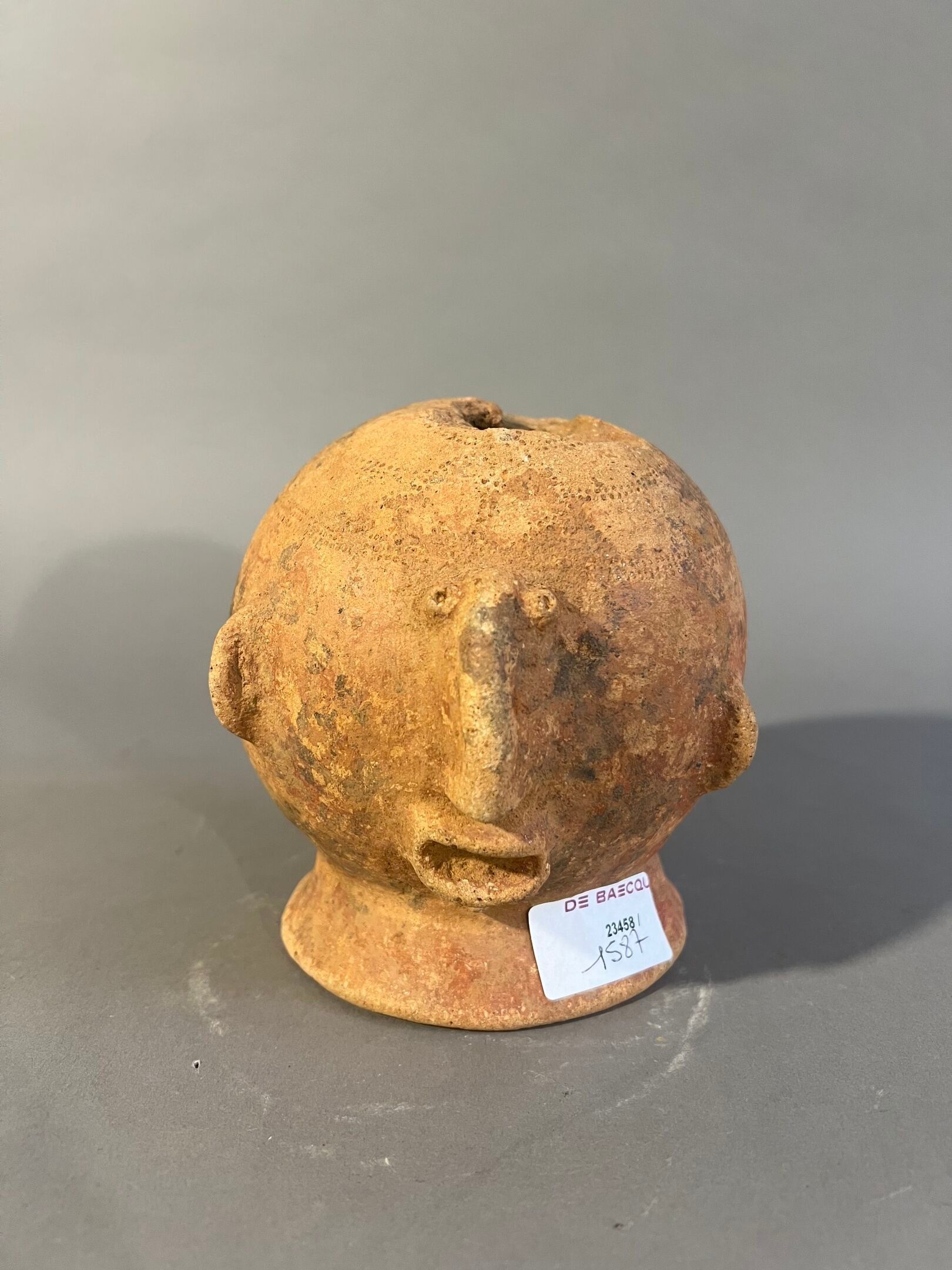 The body of the upside-down vessel shows a face with prominent features in relief.