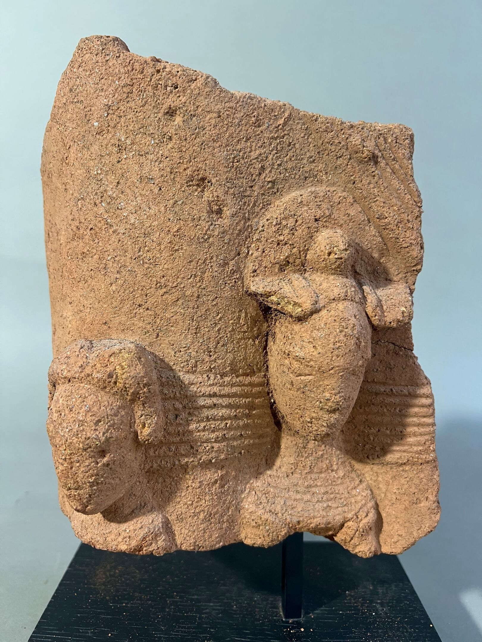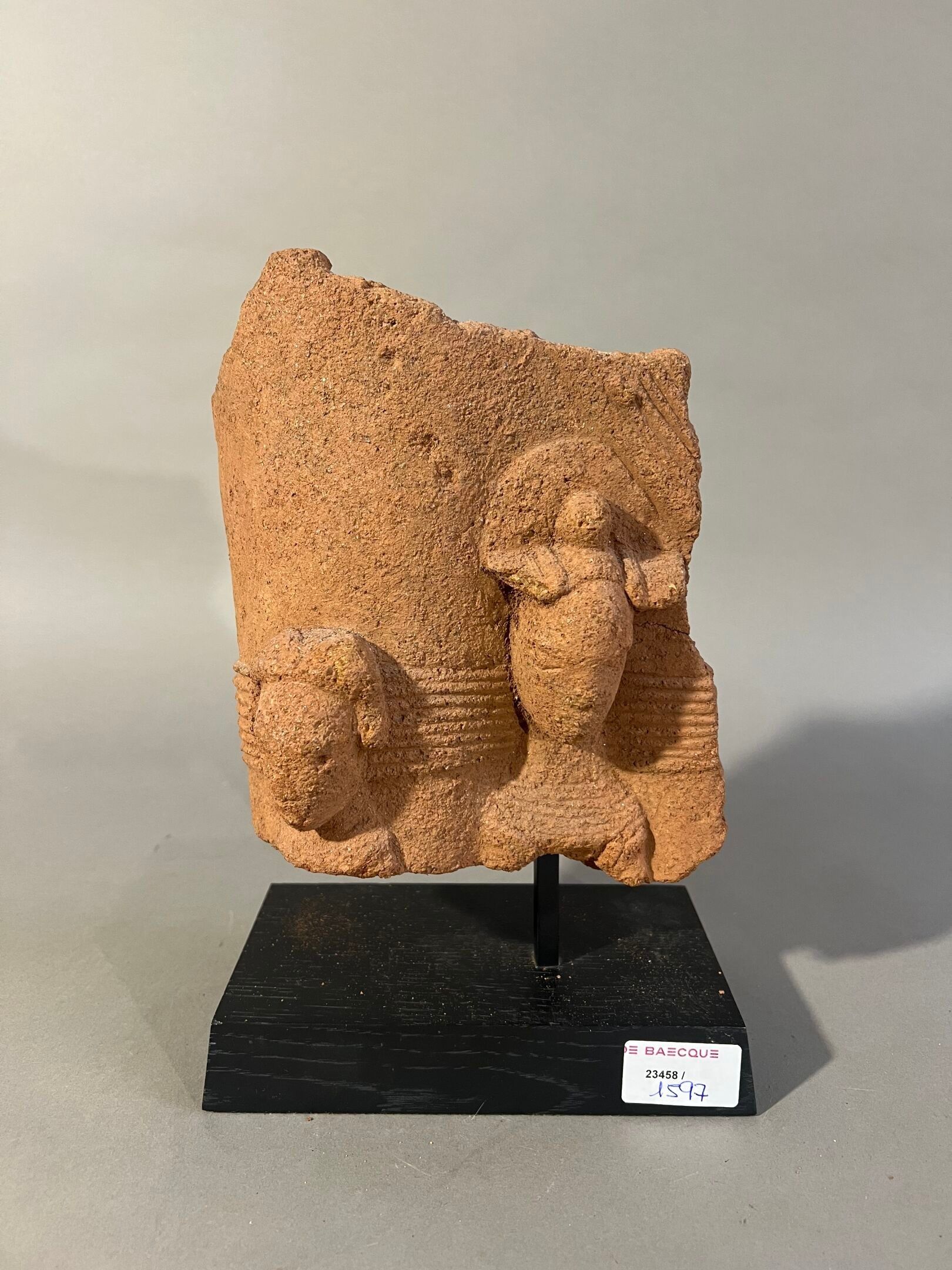 Beautiful fragment depicting a scene with two faces in the round; incised linear motifs.