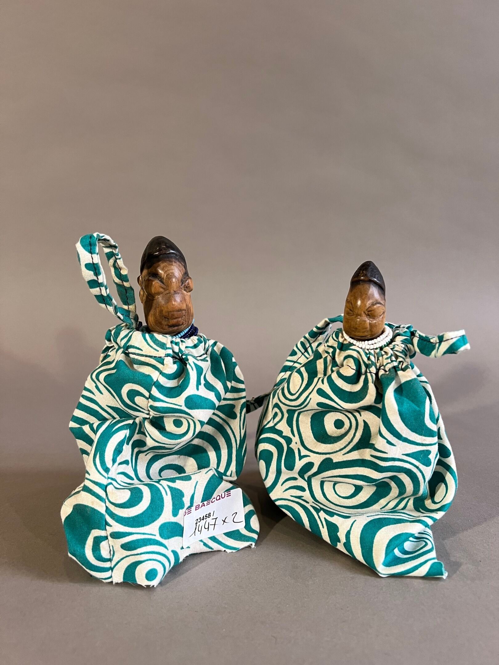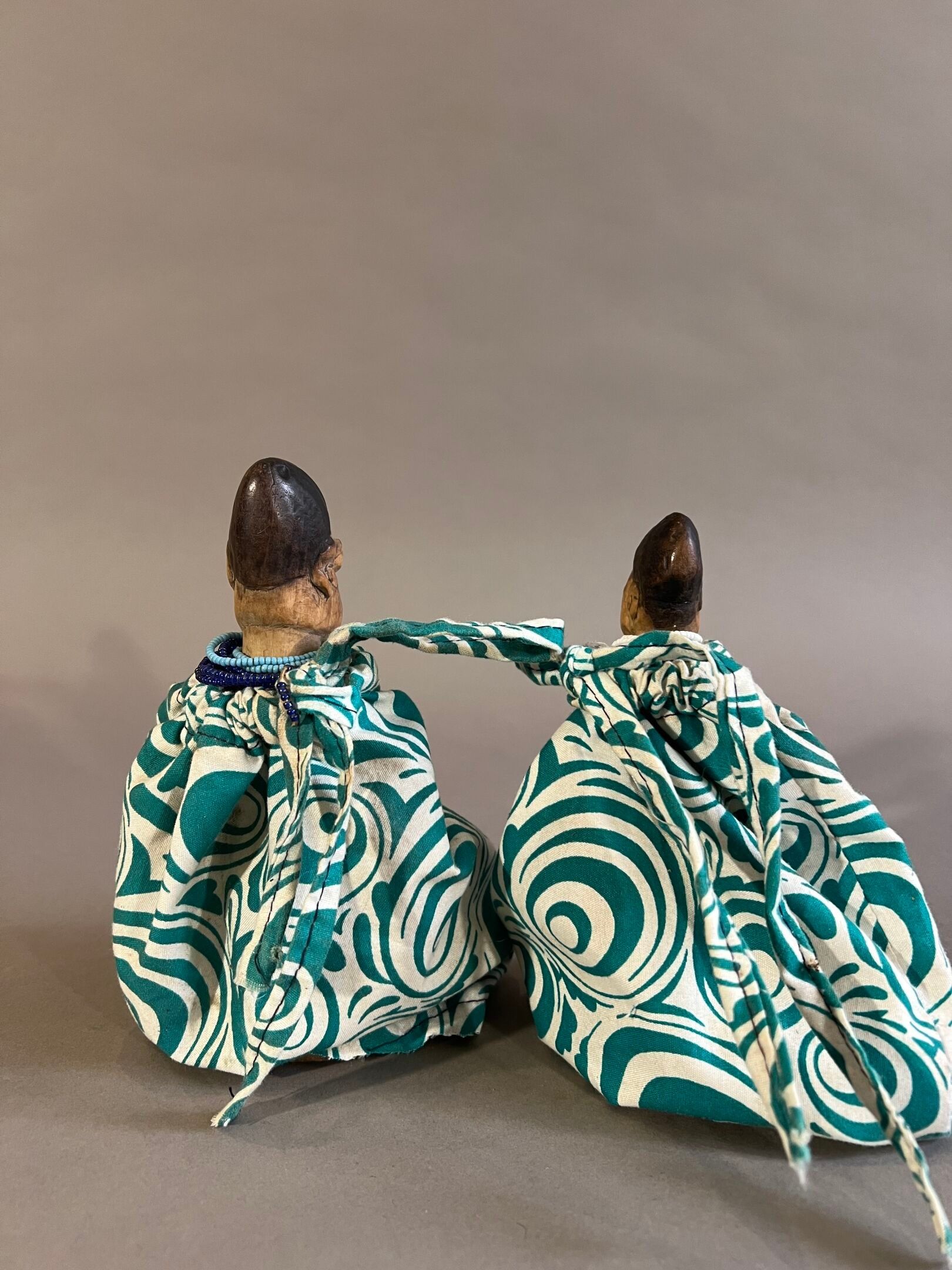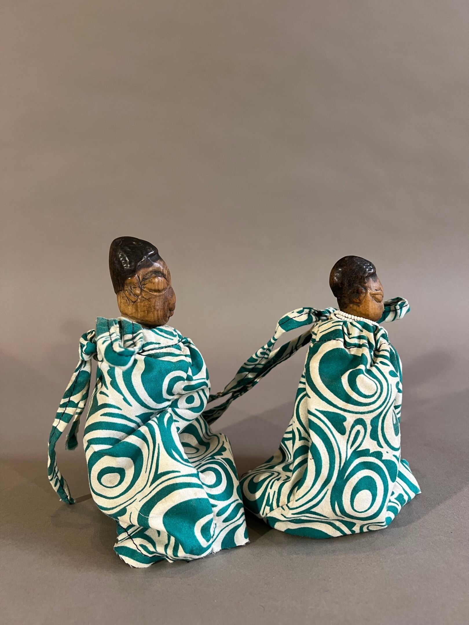 The faces are faded from use, the headdresses black; they are dressed in coloured loincloths, predominantly turquoise green.