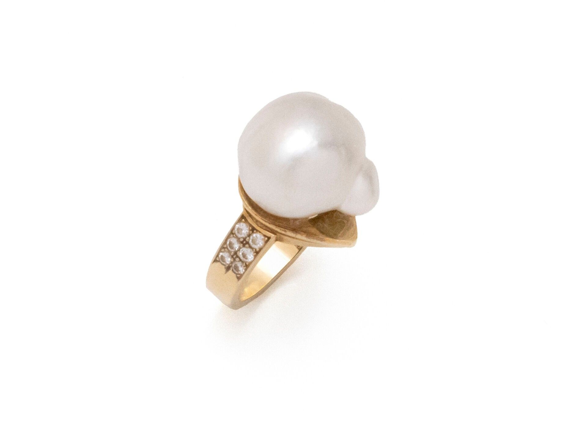 Ring in 750 thousandths gold, set with a baroque cultured pearl on a pear-shaped bezel, the shoulder highlighted with pavé-cut diamonds. Mounting signed BOUCHERON, Boucheron workshop hallmark.