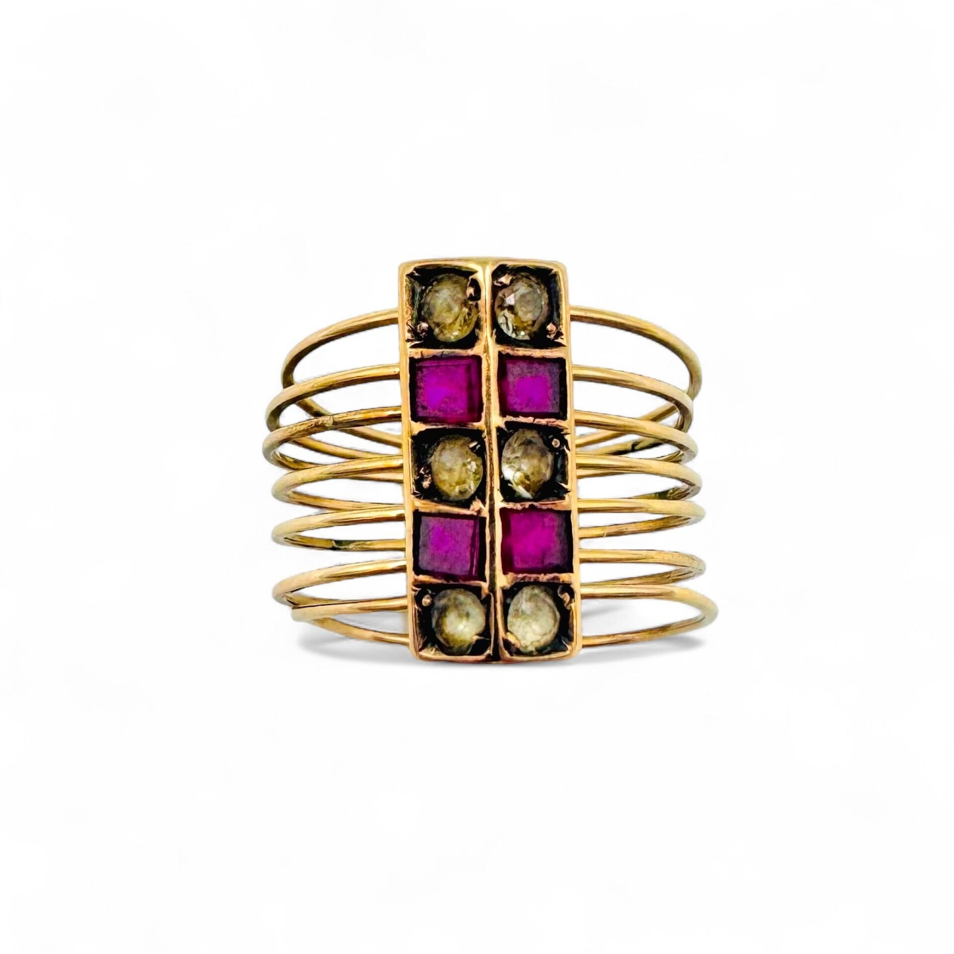 Harem ring in yellow gold (375) set with small white stones and rubies.