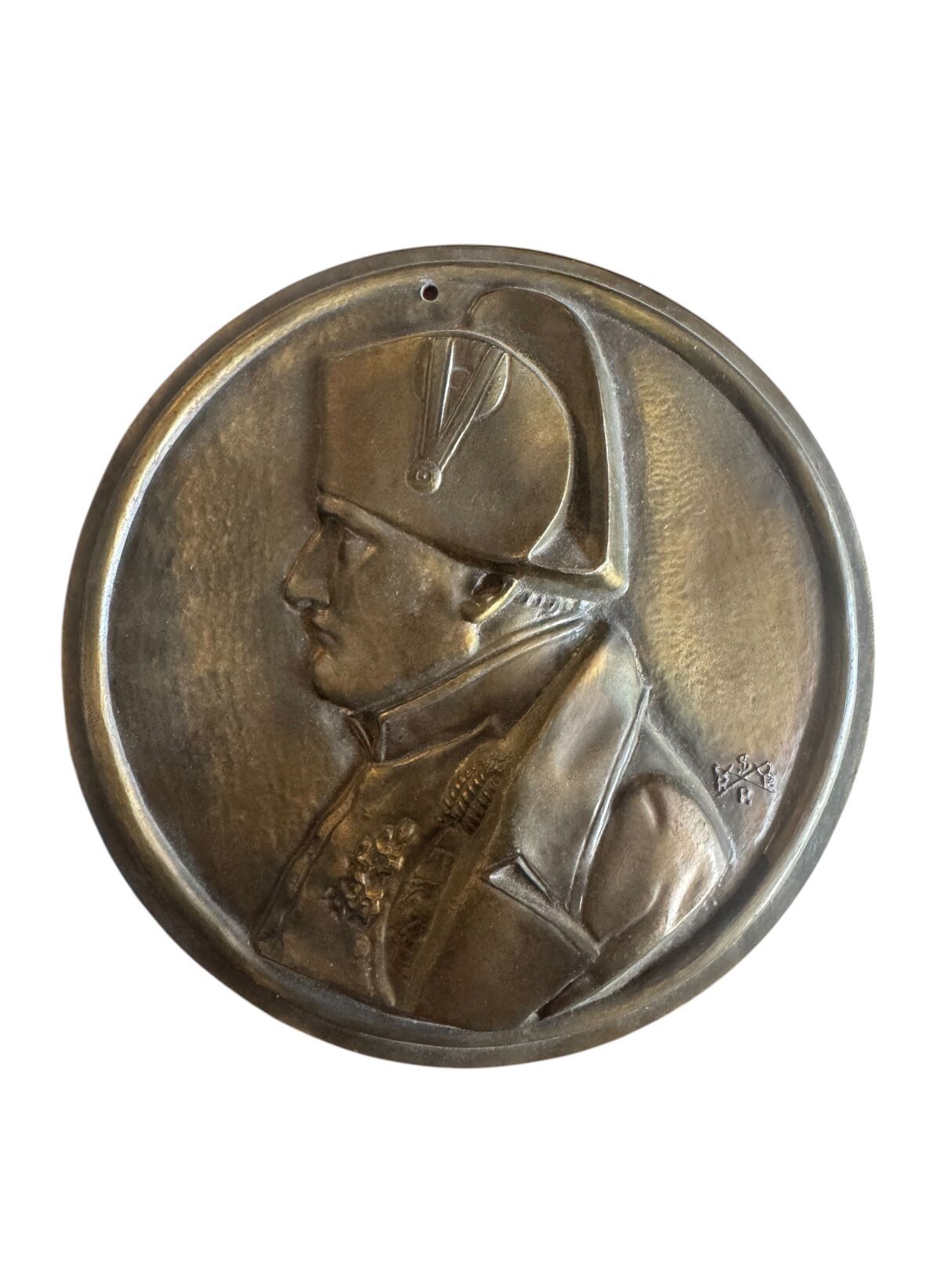 Circular metal medallion representing the portrait of Napoleon Bonaparte.